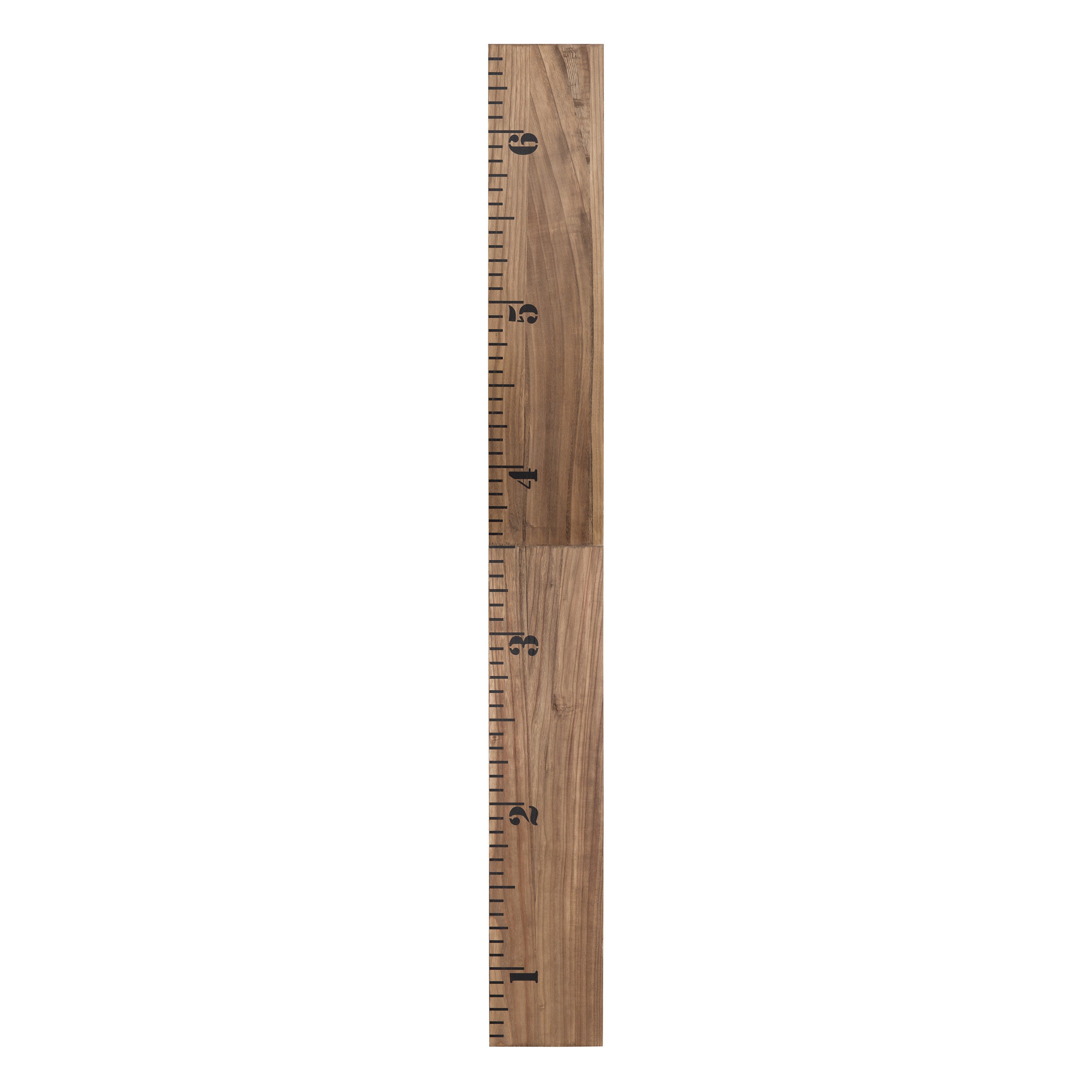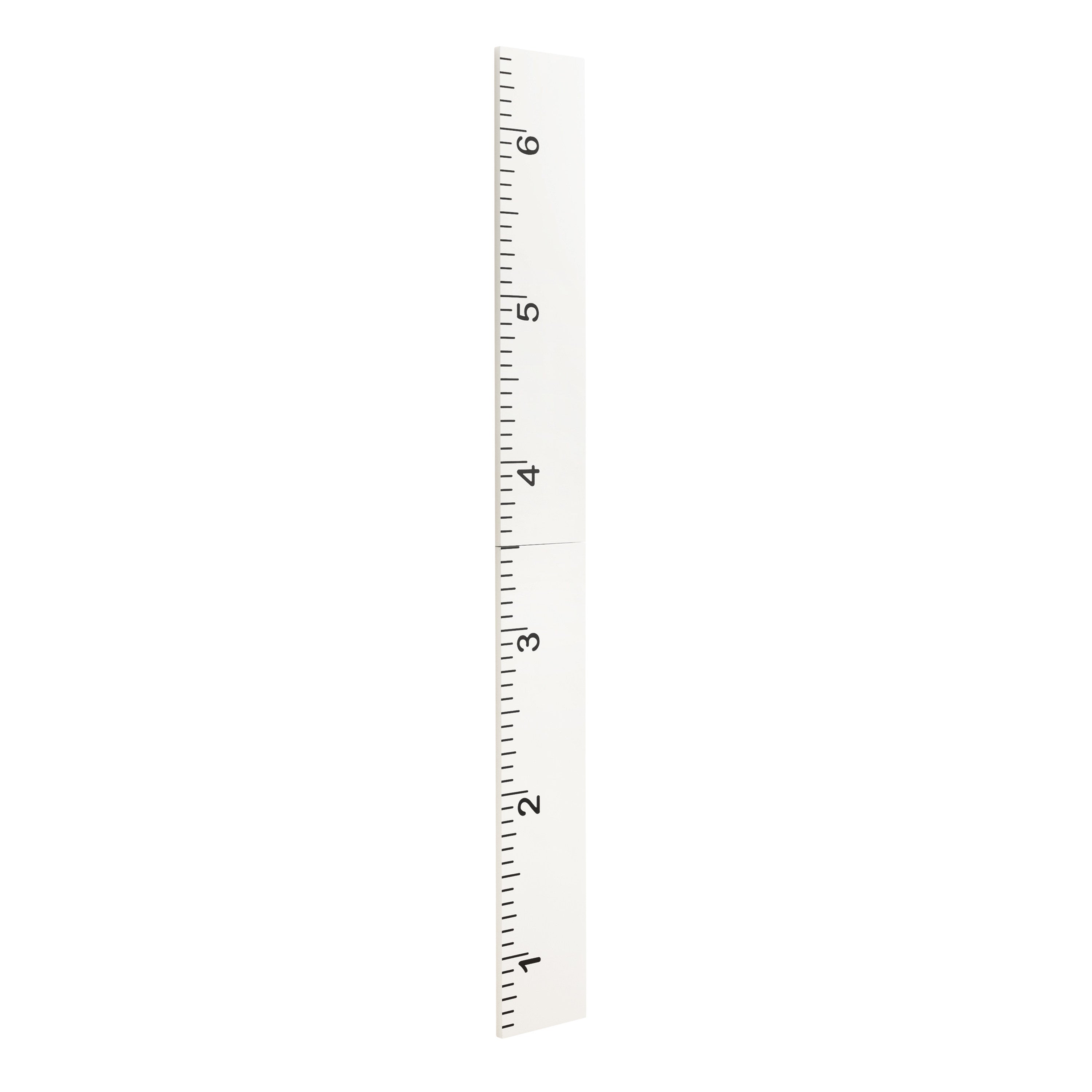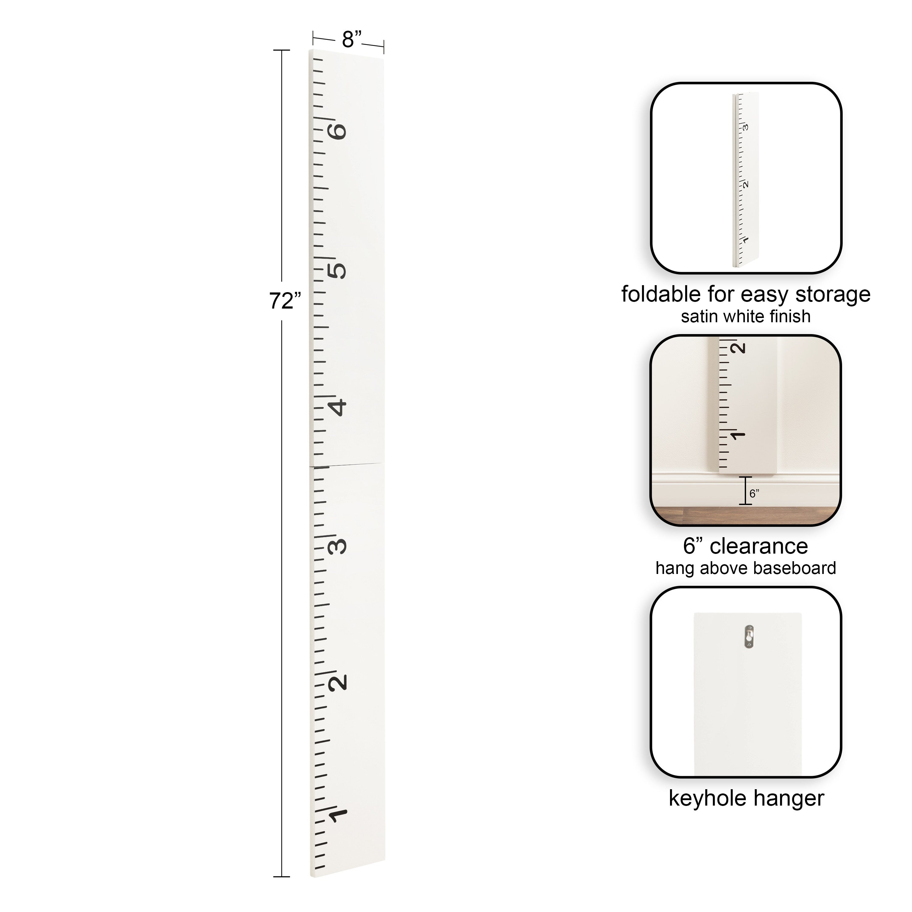 You and your child will love to celebrate growth in charming style with this wall ruler growth chart. To ensure accurate measurements, this growth chart is intended to be mounted to the wall six inches off the ground. That will allow you to measure up to 6.5 feet as the ruler itself is six feet tall. This allows you to hang it on walls that have baseboards with no issue. The overall dimensions are 8 inches wide, 0.75 inches deep, and 72 inches high. The ruler ships fully assembled, simply unfold the hinge and hang the ruler on your wall to start measuring. Hang this ruler in a kitchen, entryway, or child's bedroom and have fun measuring your child's growth in style! Attached to the back of this growth chart is a metal keyhole hanger, making wall mounting both simple and secure.
