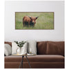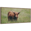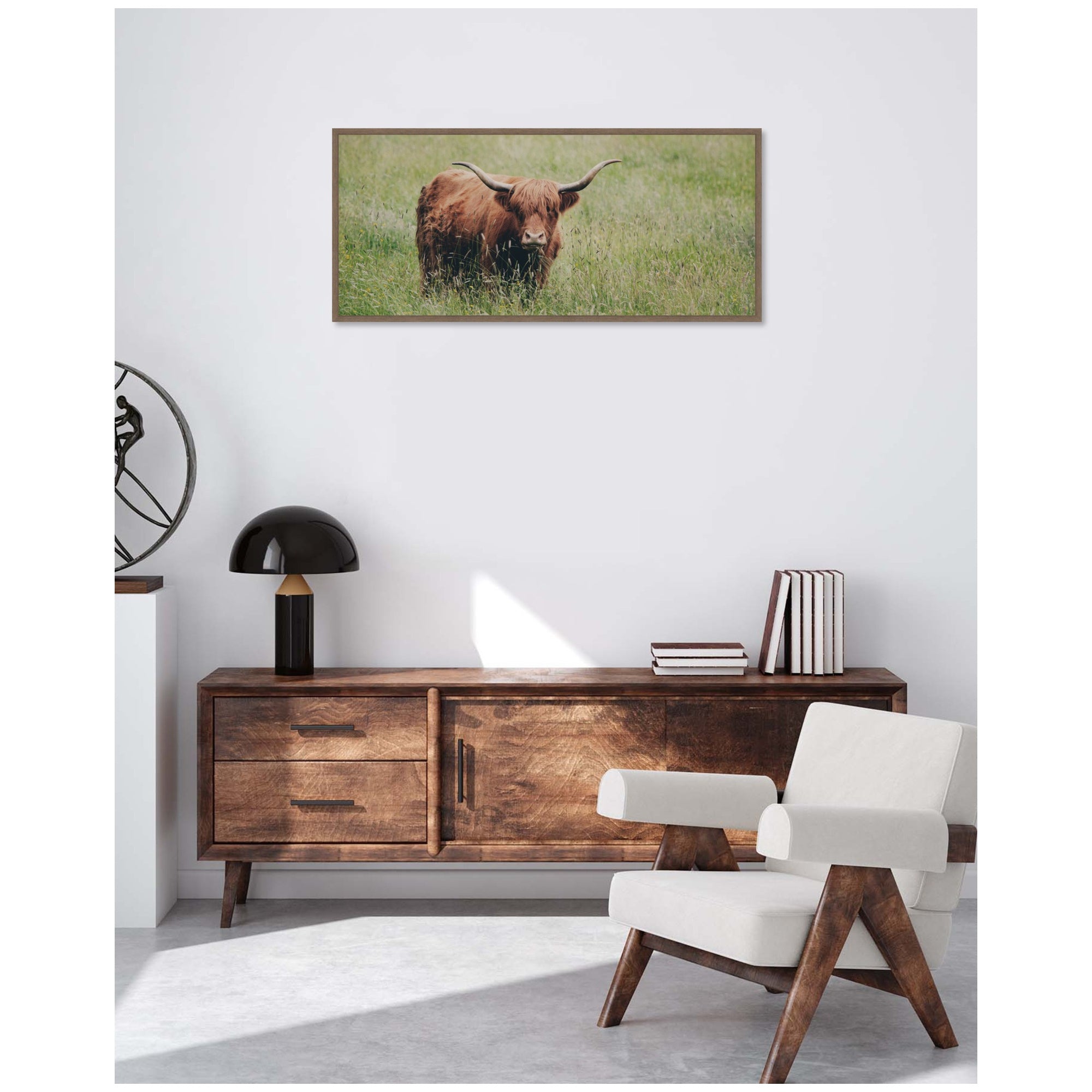 - Gallery Quality Art: Measuring 40 x 18 inches, this is beautifully presented in Sylvie Walnut frame - a modern, float frame with walnut woodgrain coloring and dramatic depth.. Expressive Wall Art Story:A Highland cow stands in a lush green field, showcasing its distinctive long horns and shaggy coat. The serene setting highlights the natural beauty and ruggedness of the animal. It's a peaceful scene capturing the essence of rural life and the majesty of wildlife.