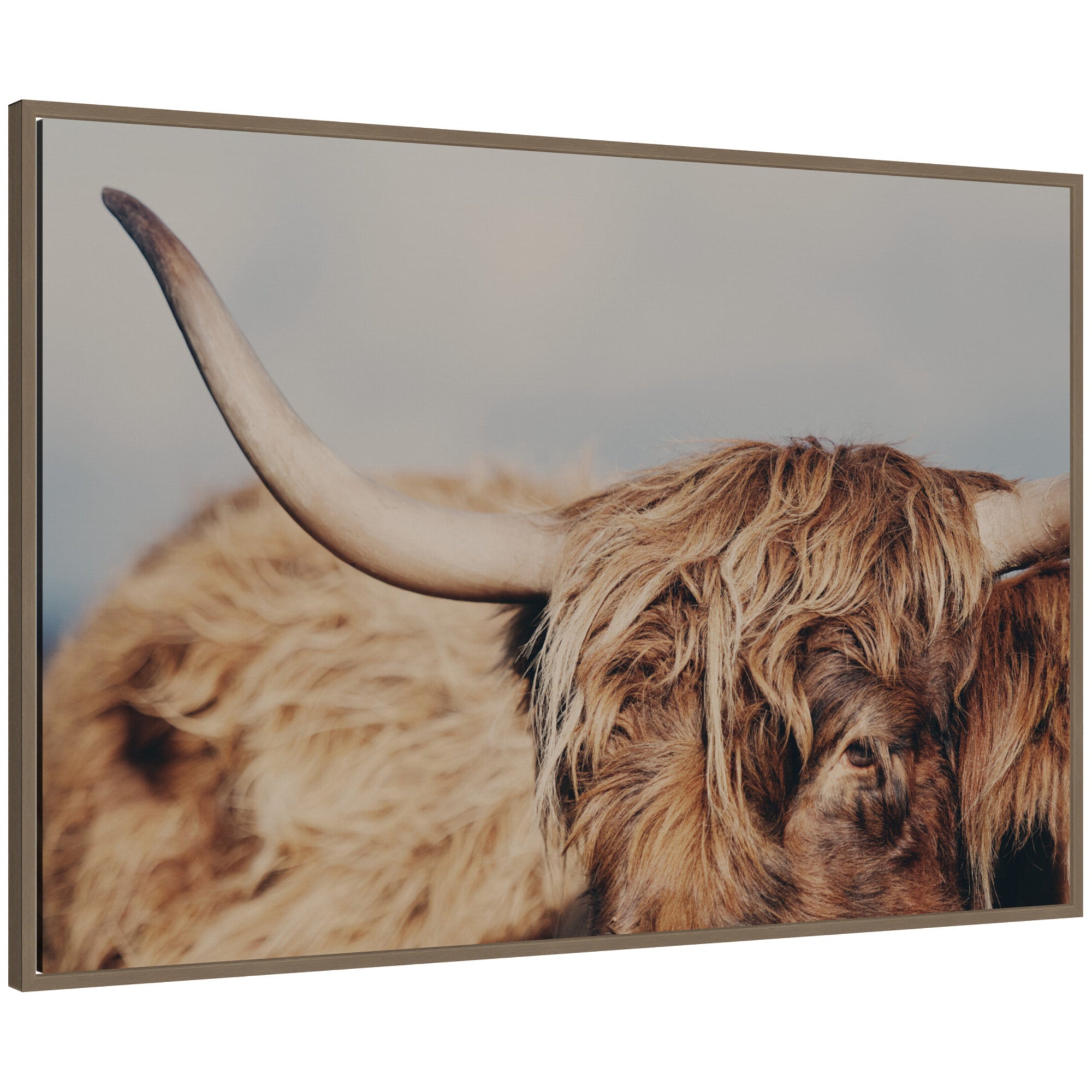 • Gallery Quality Art: Measuring 41 x 28 inches, this is beautifully presented in Sylvie Dark Gold frame - a modern, float frame with dark gold coloring, fine lines and dramatic depth.. Expressive Wall Art Story:The image captures a close-up of a Highland cow, highlighting its distinctive long, shaggy fur and prominent curved horns. The warm, earthy tones of the cow's coat are contrasted against a soft, muted background. The portrait exudes a sense of calm and connection to the natural countryside setting.