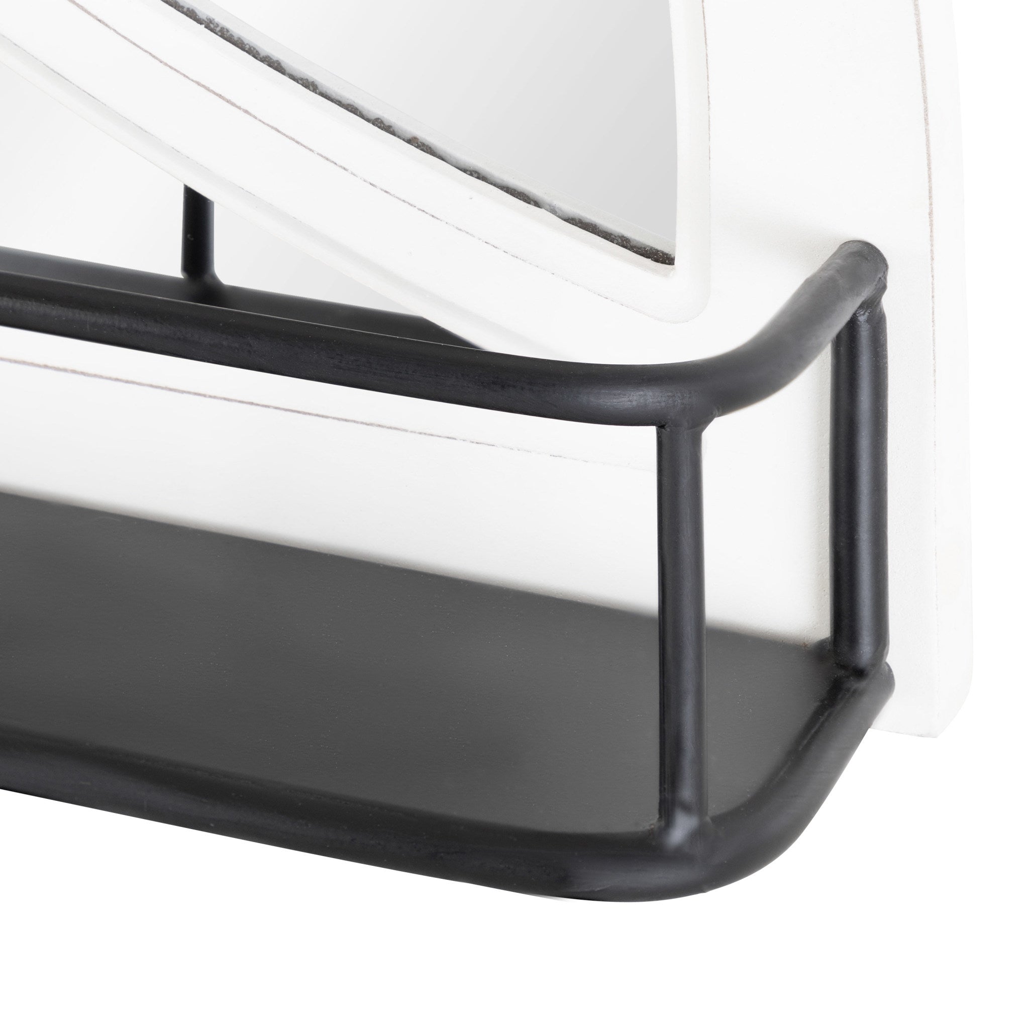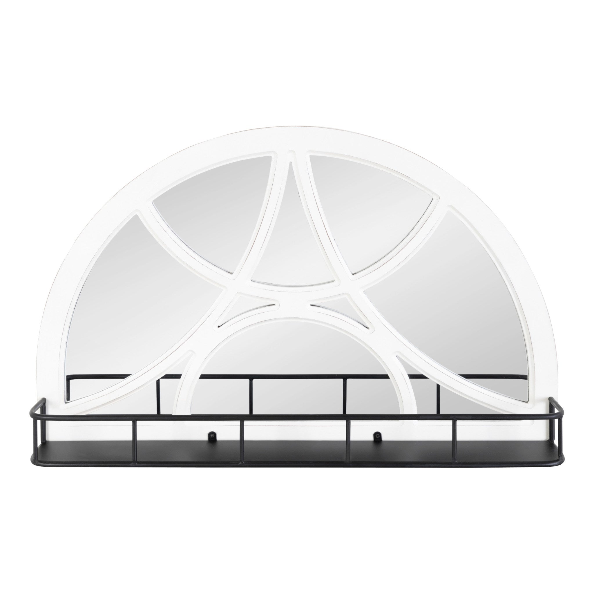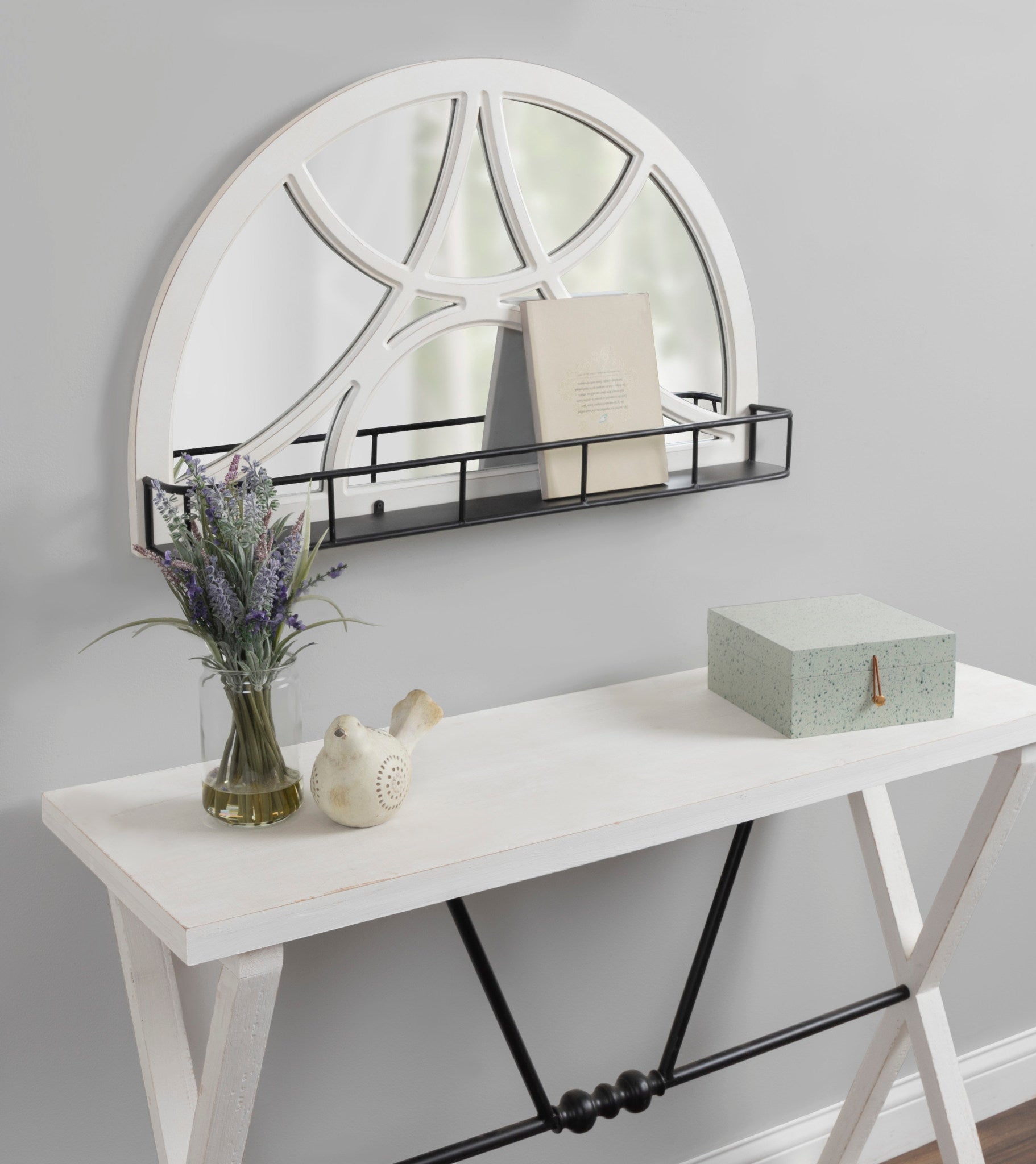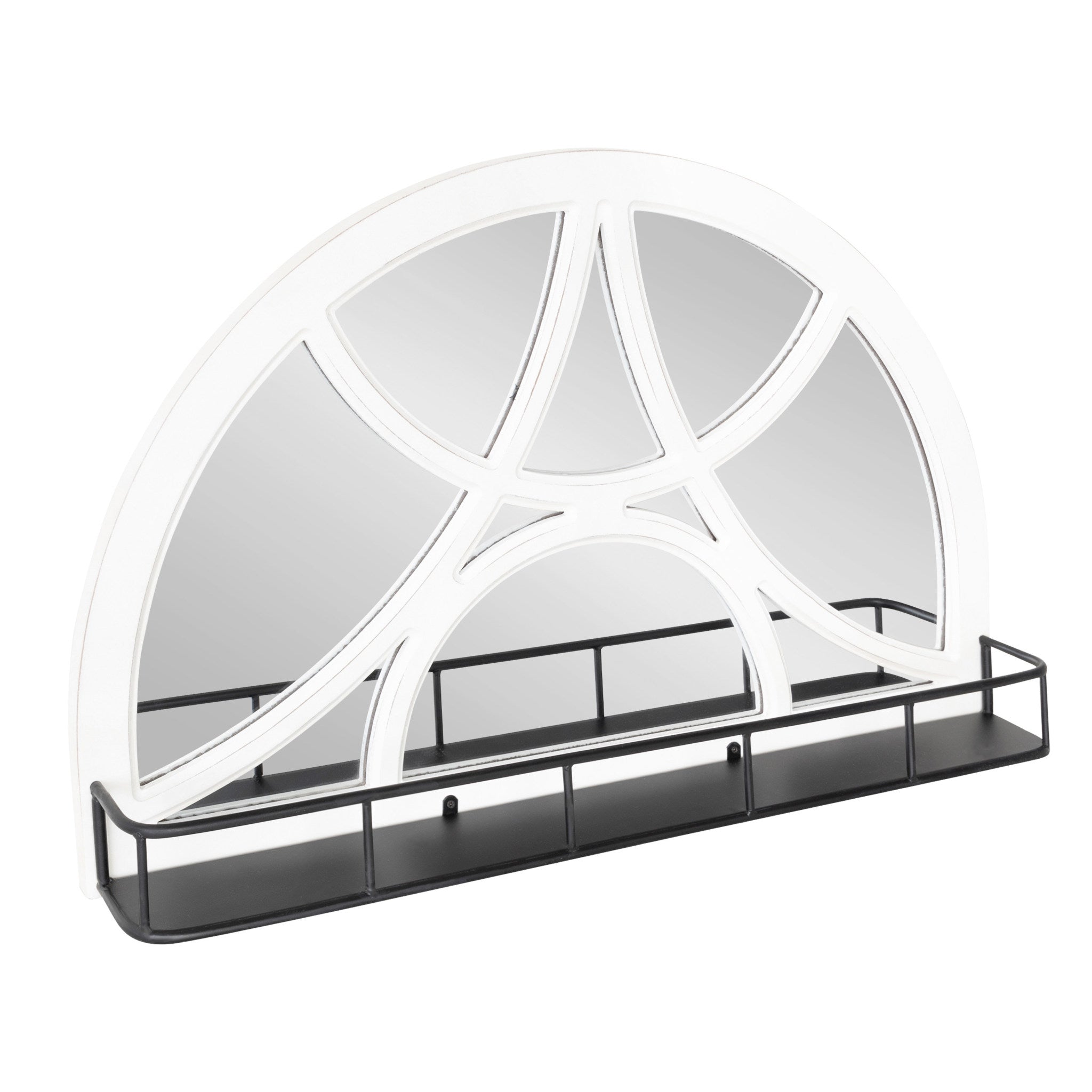 The Hollowday wall mirror brings the sophisticated and quality of vintage decor to your rustic home. With an arched shape and geometric latticework inlay, the Hollowday mirror makes an excellent farmhouse focal point. It also features a 4 inch shelf constructed from a resilient metal to highlight small, decorative items, like photos, succulents, or candles. Combining decorative, farmhouse aesthetics with practical storage make this shelf a must-have for your rustic living space.