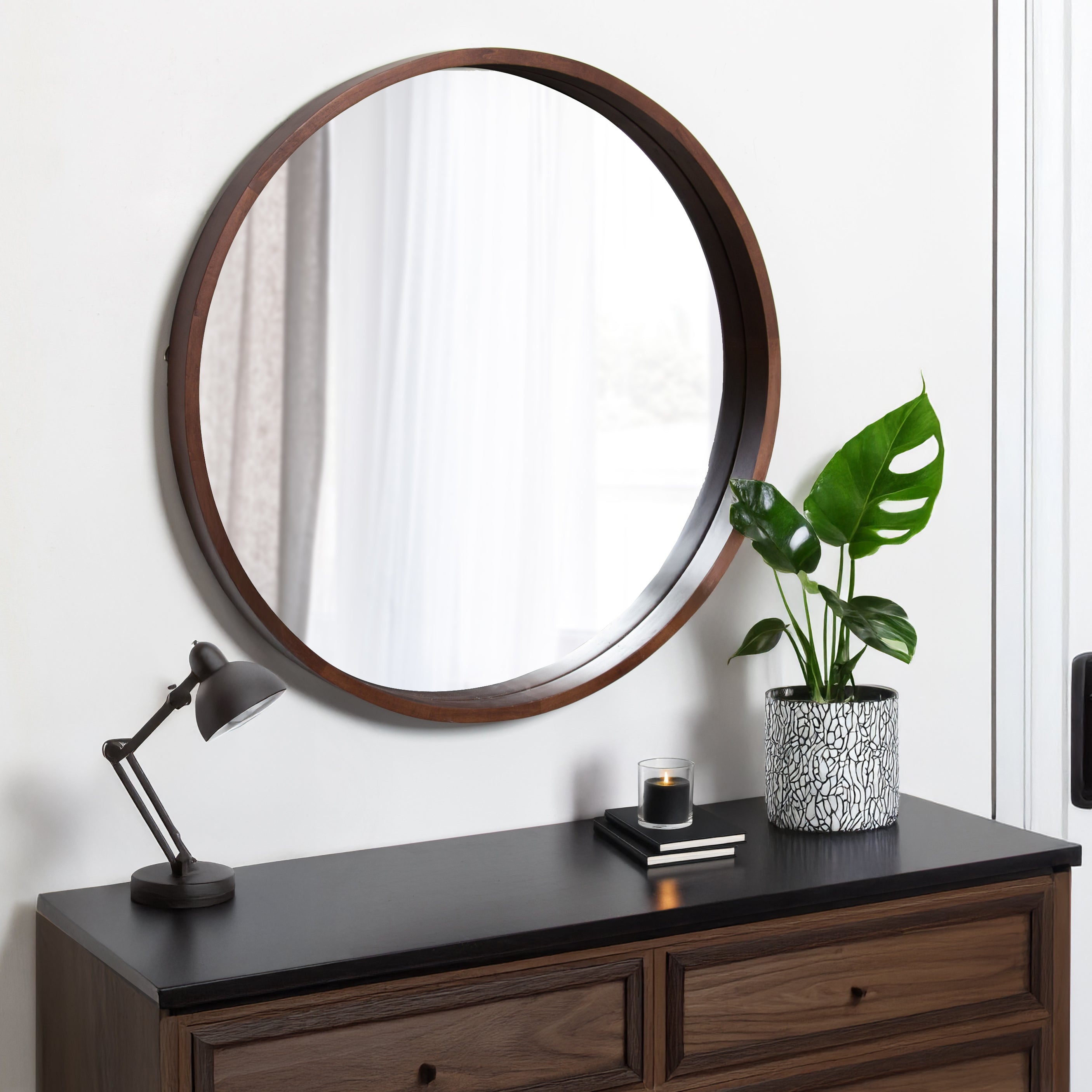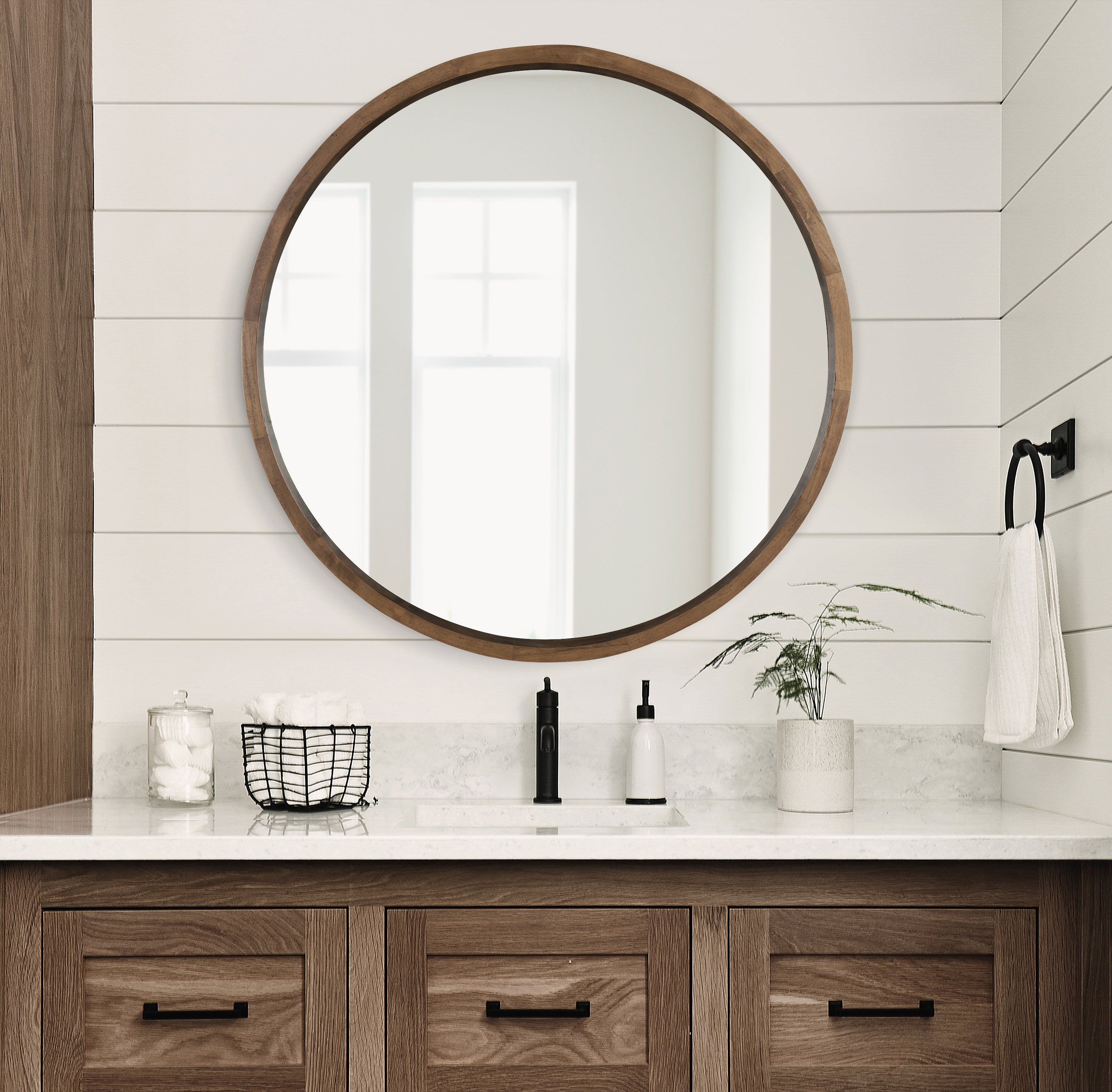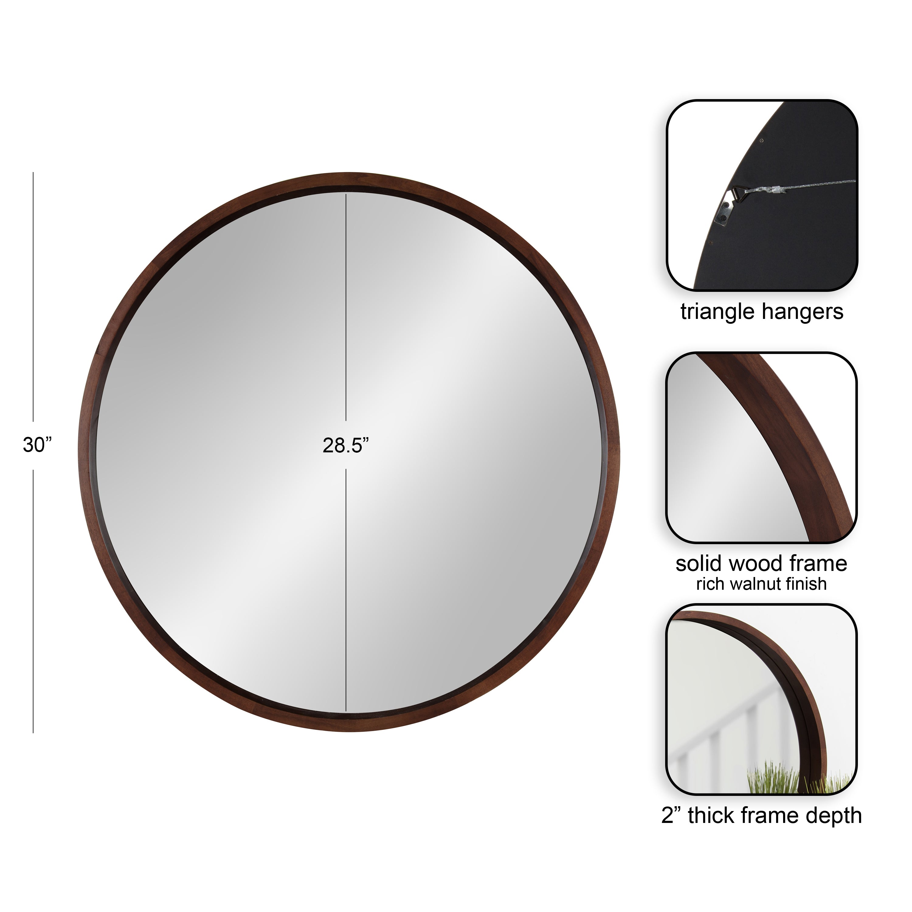 The Hutton round wood mirror makes a beautiful yet functional statement piece for your home. Indulge your proclivity for rustic-yet-modern farmhouse decor with its genuine solid poplar wood frame. Its ample diameter creates a stellar focal point for whichever room you decide to put it in. Add traditional charm to your living room mantle, above the console table in the entry, or over the bed in your master bedroom. However you decide to display it, it installs in only seconds with metal D-ring hangers already attached.
