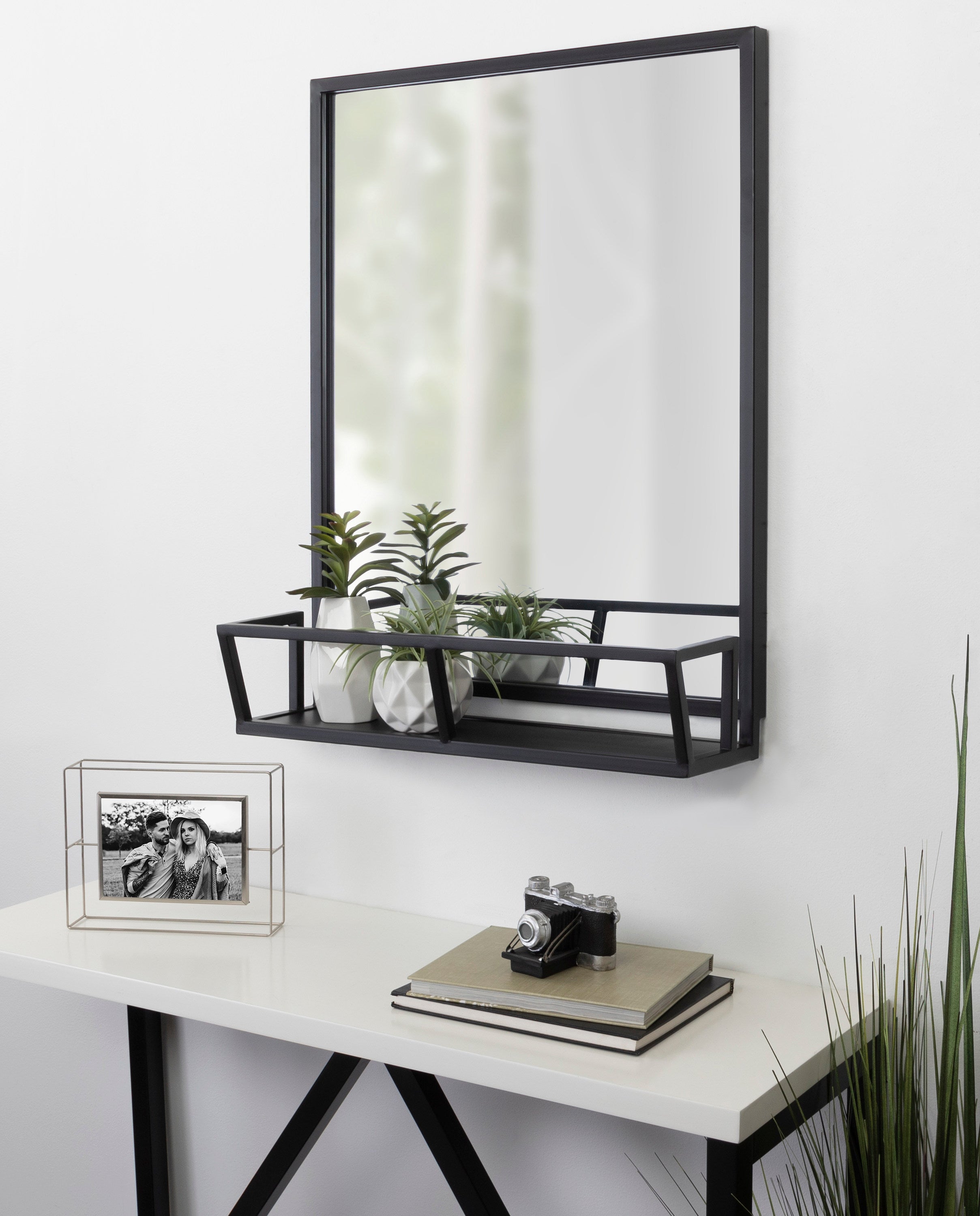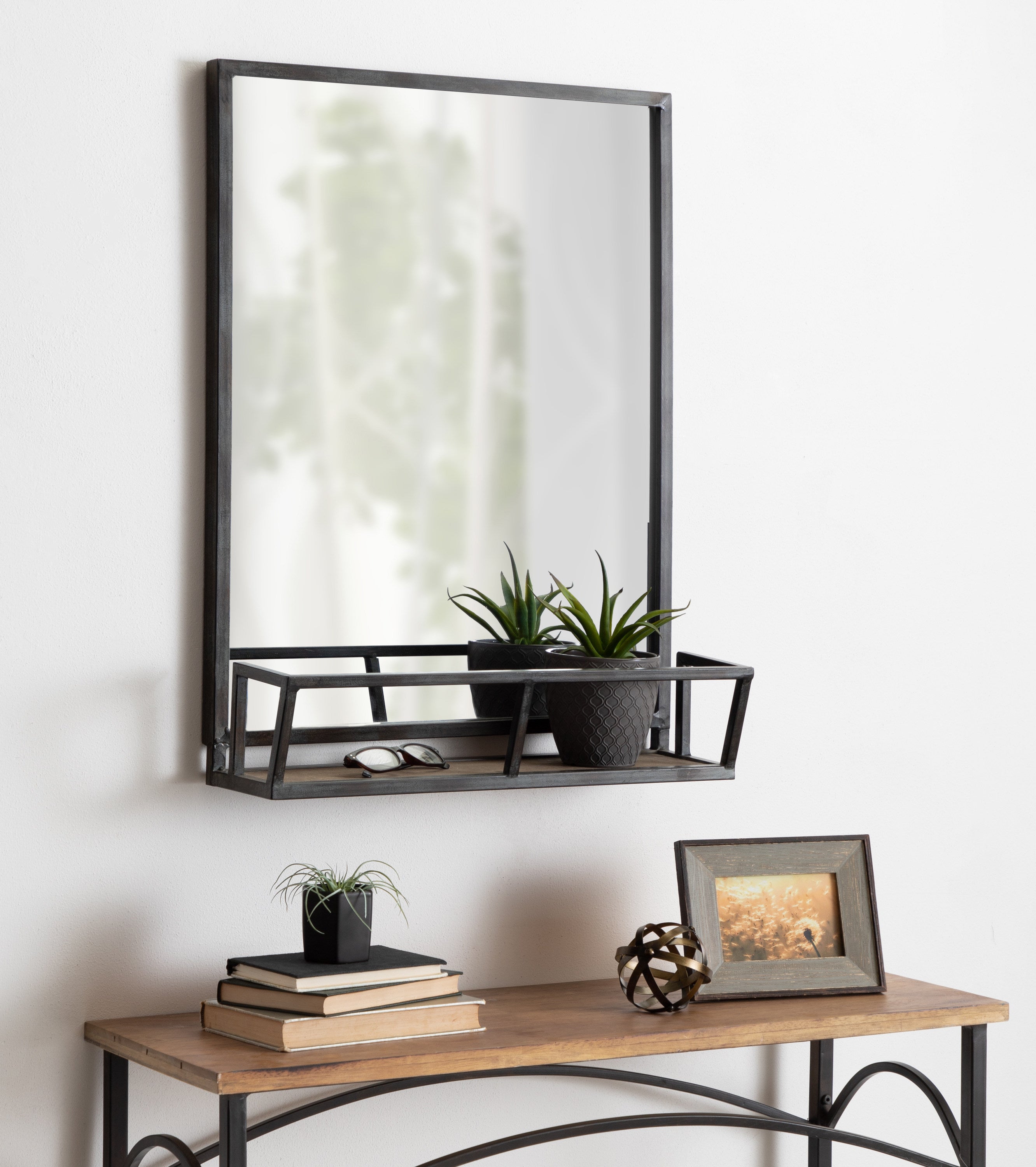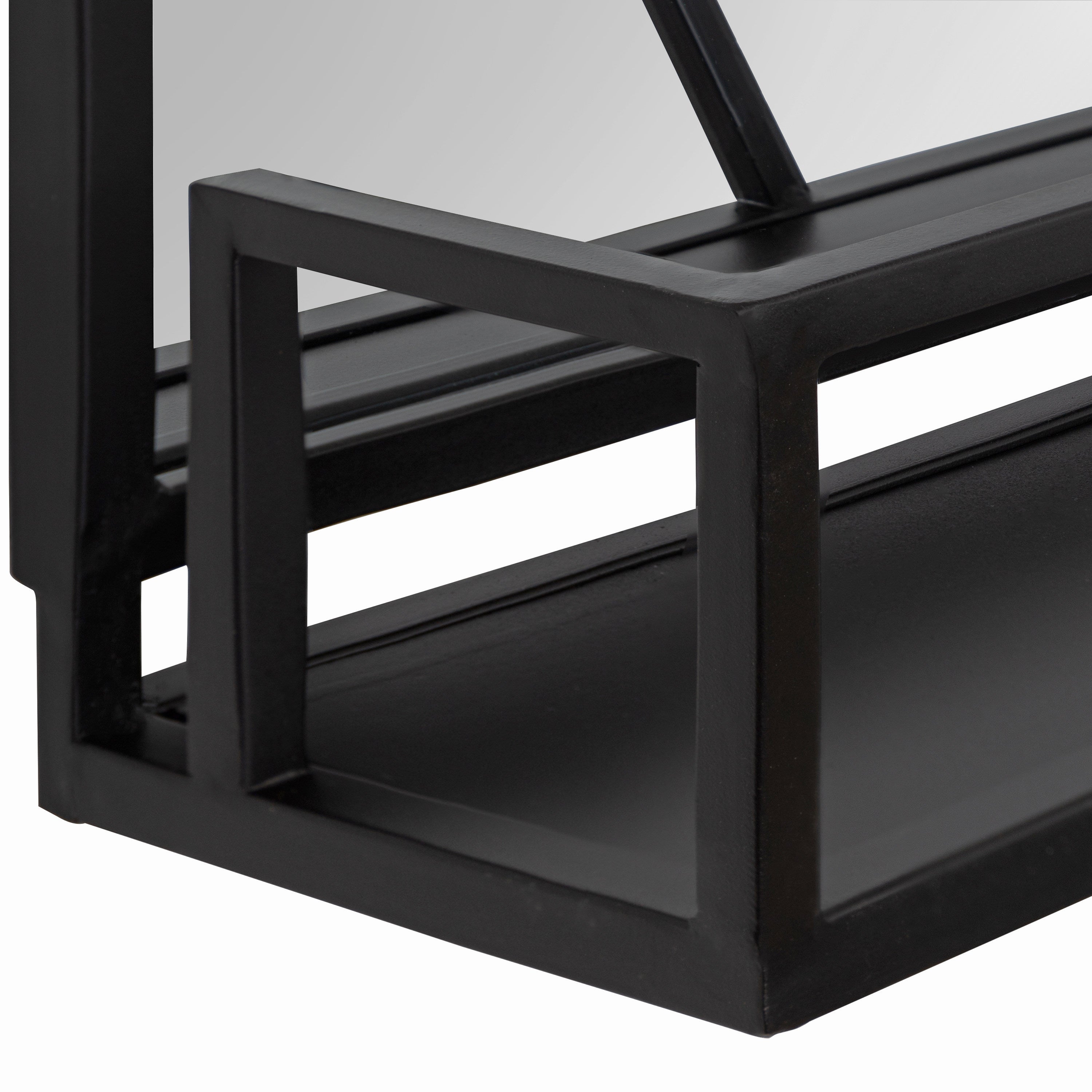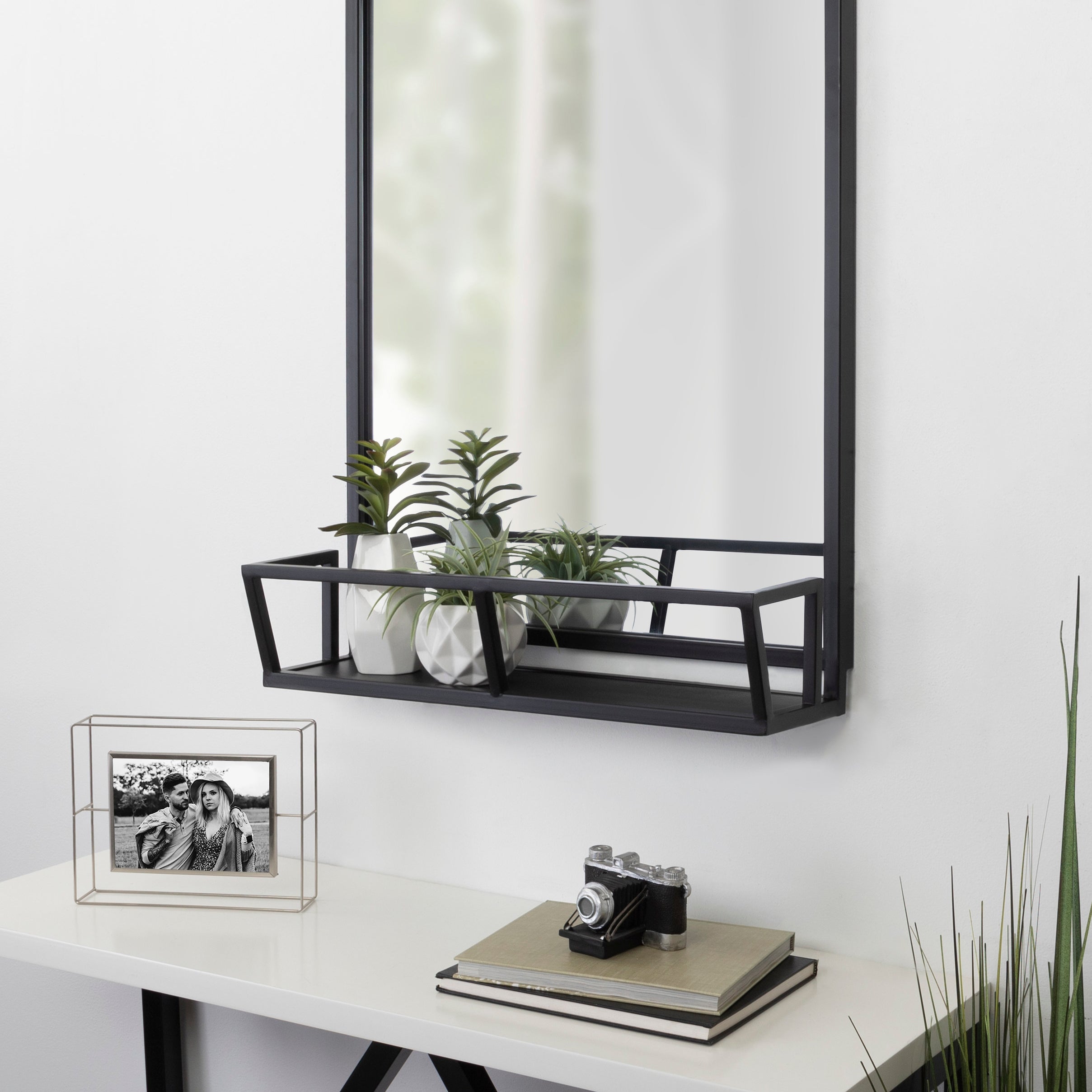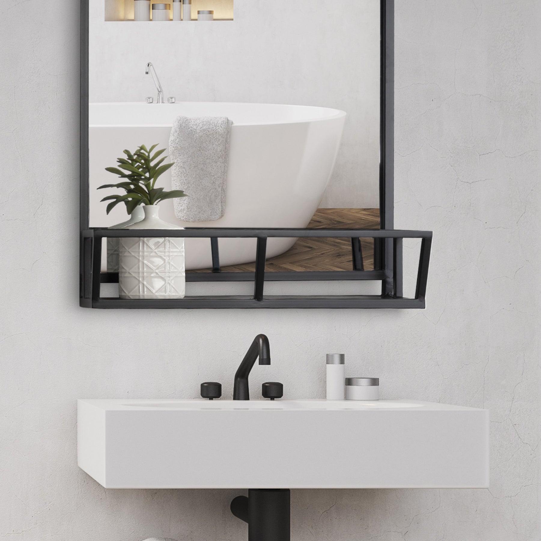 Develop a modern living space in your home by adding a lovely mirror like the Jackson wall mirror. This sharp accent relishes in its contemporary style, with a chic, black metal frame and a convenient 5-inch shelf. Use the mirror itself to create dimension and space in your home and use its attached shelf for soaps, lotions, small succulents, and more!