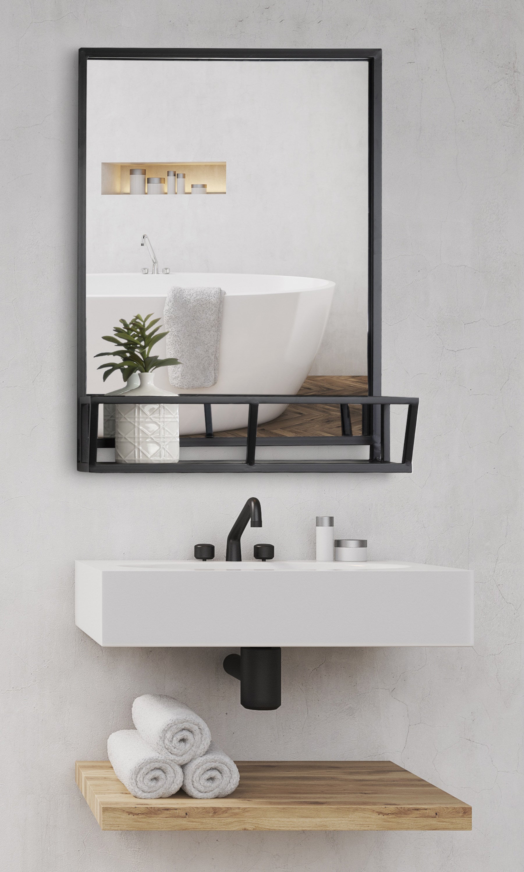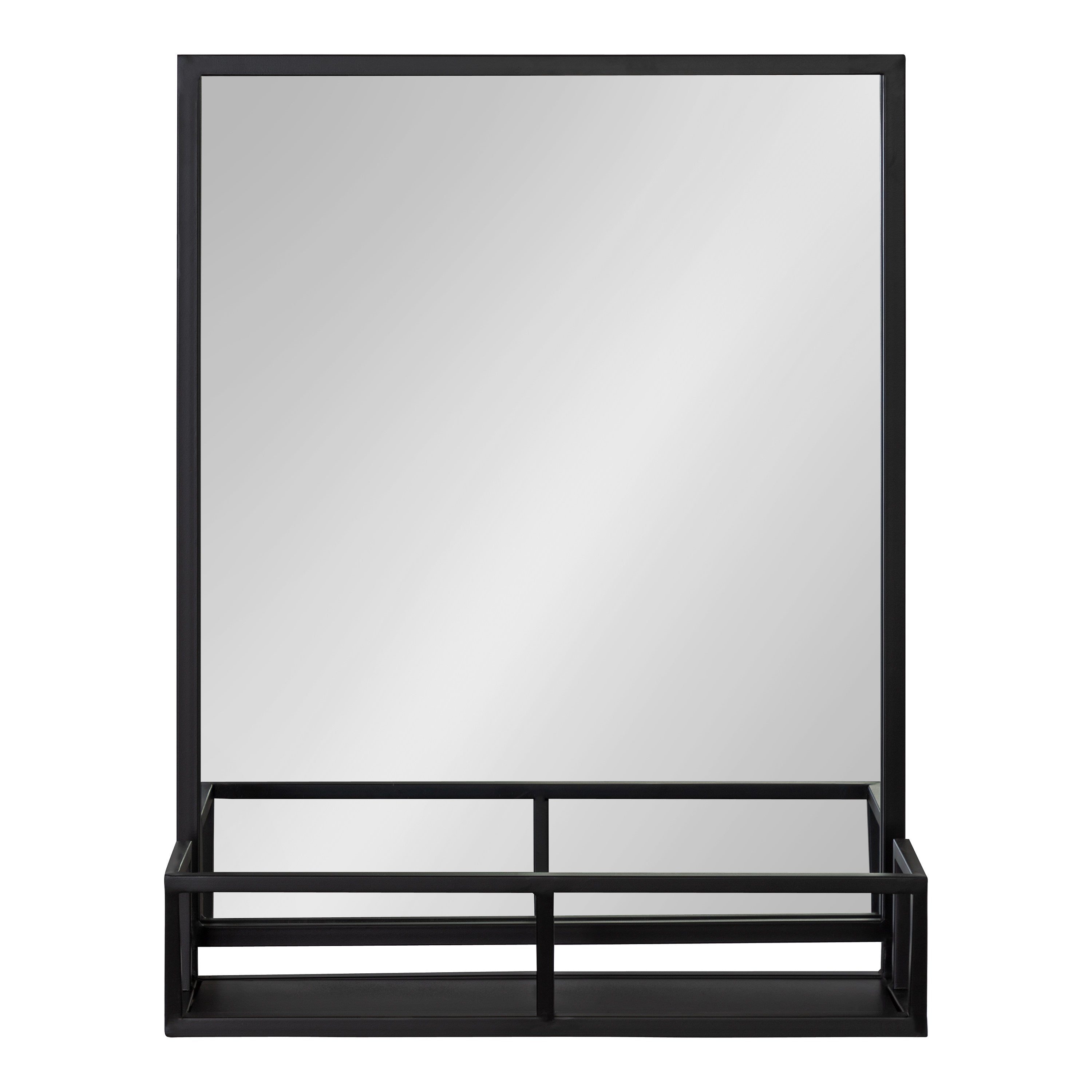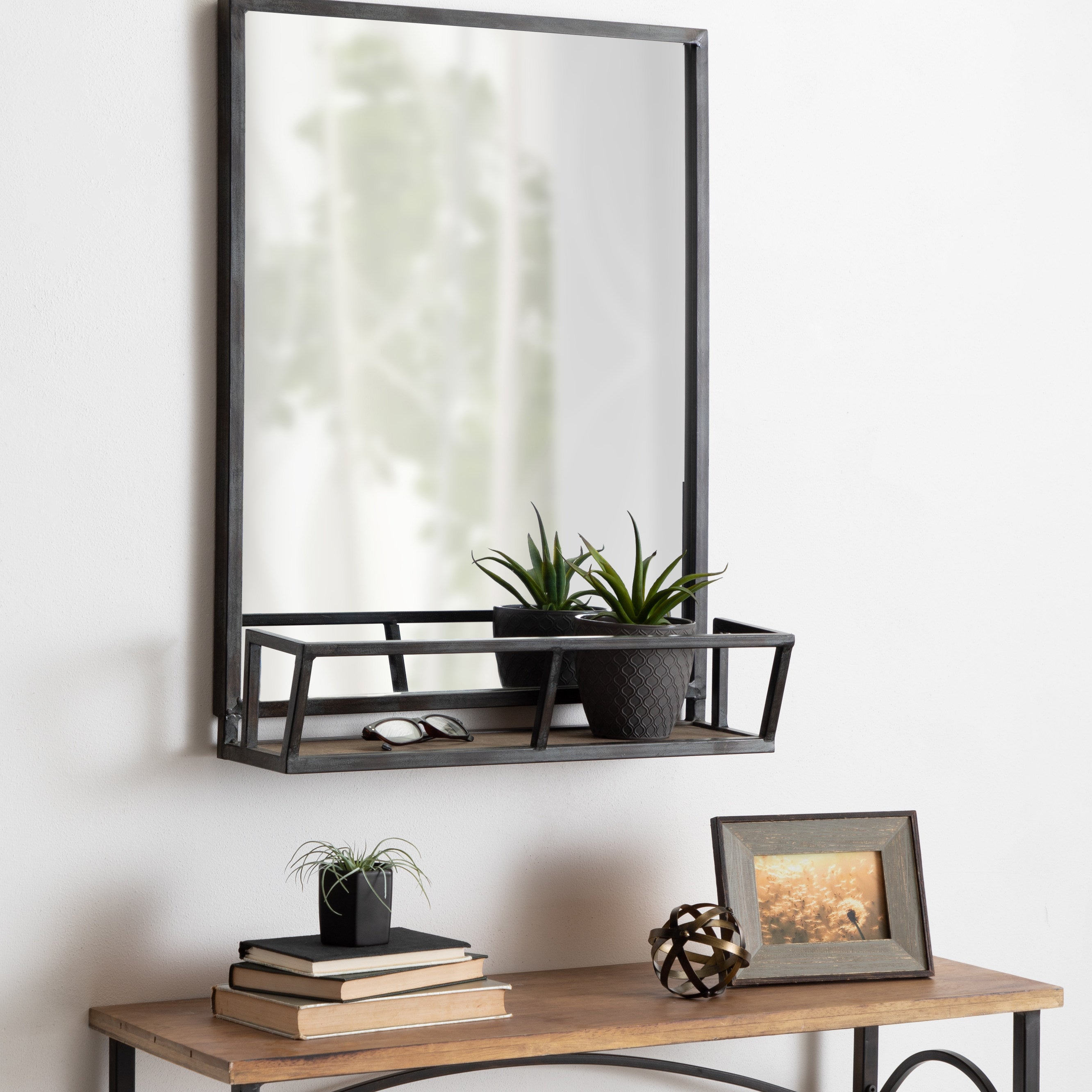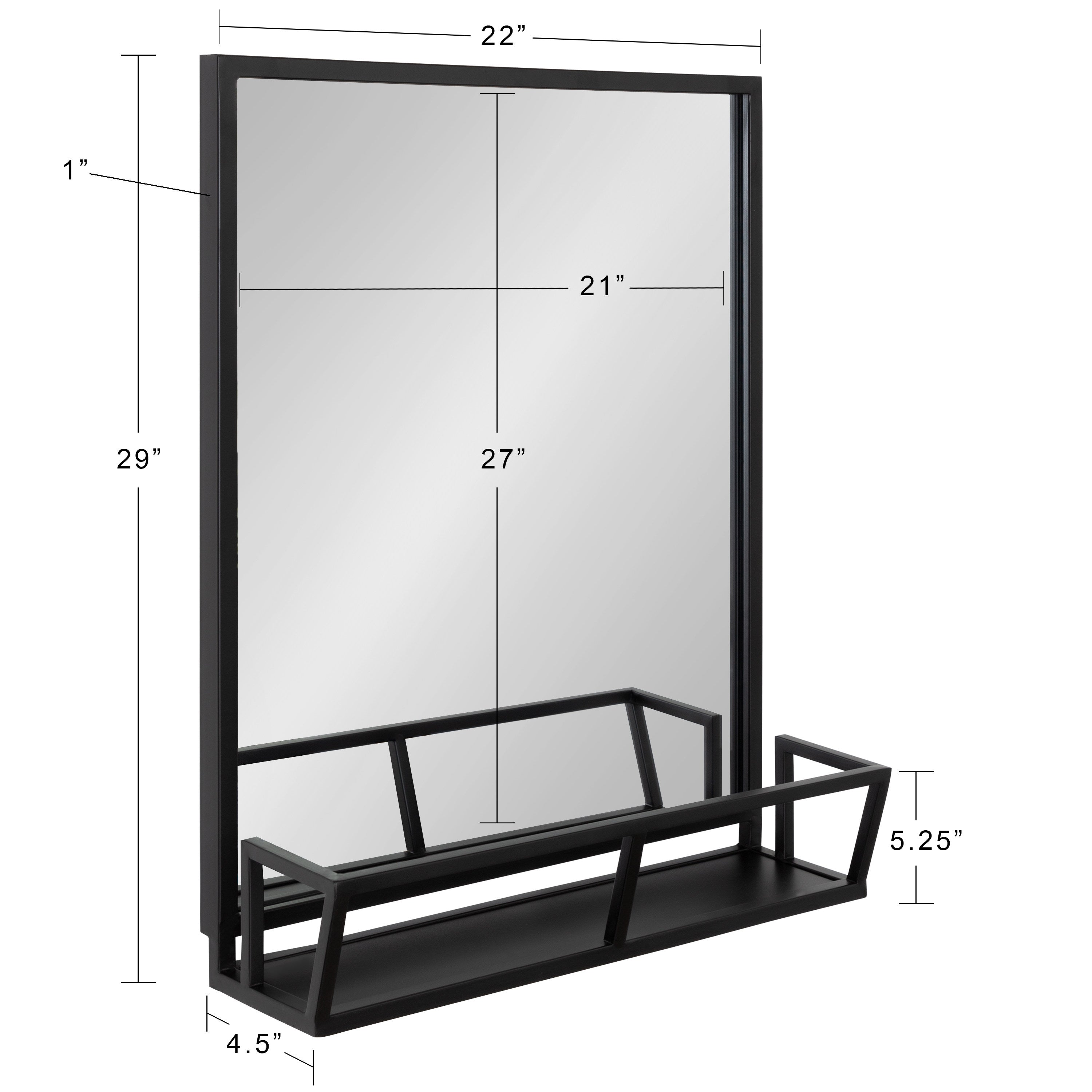 Develop a modern living space in your home by adding a lovely mirror like the Jackson wall mirror. This sharp accent relishes in its contemporary style, with a chic, black metal frame and a convenient 5-inch shelf. Use the mirror itself to create dimension and space in your home and use its attached shelf for soaps, lotions, small succulents, and more!