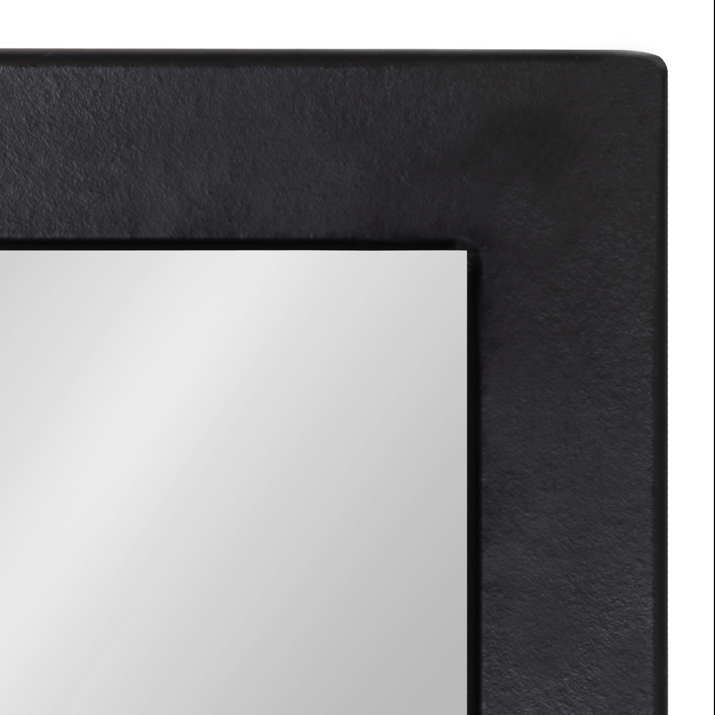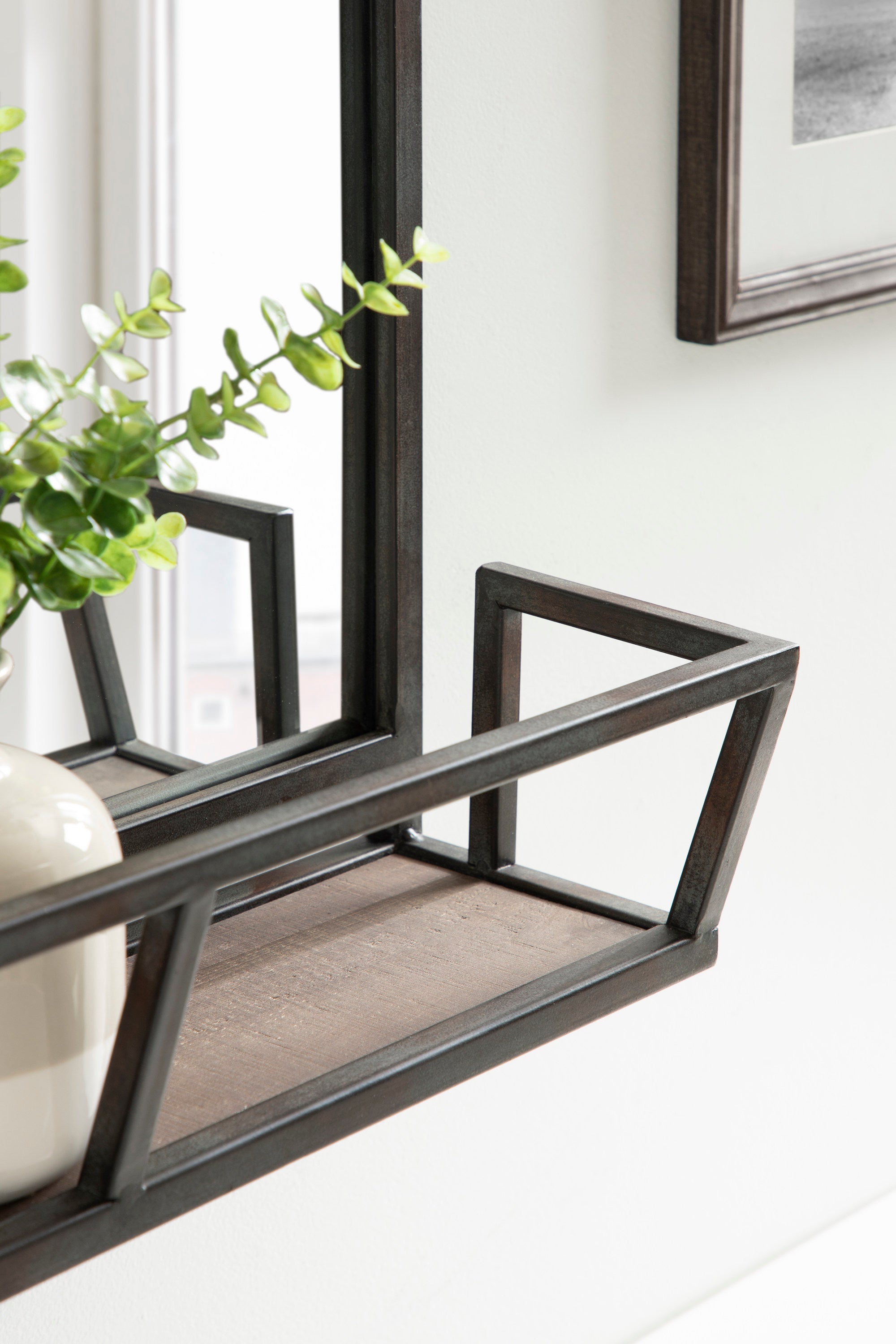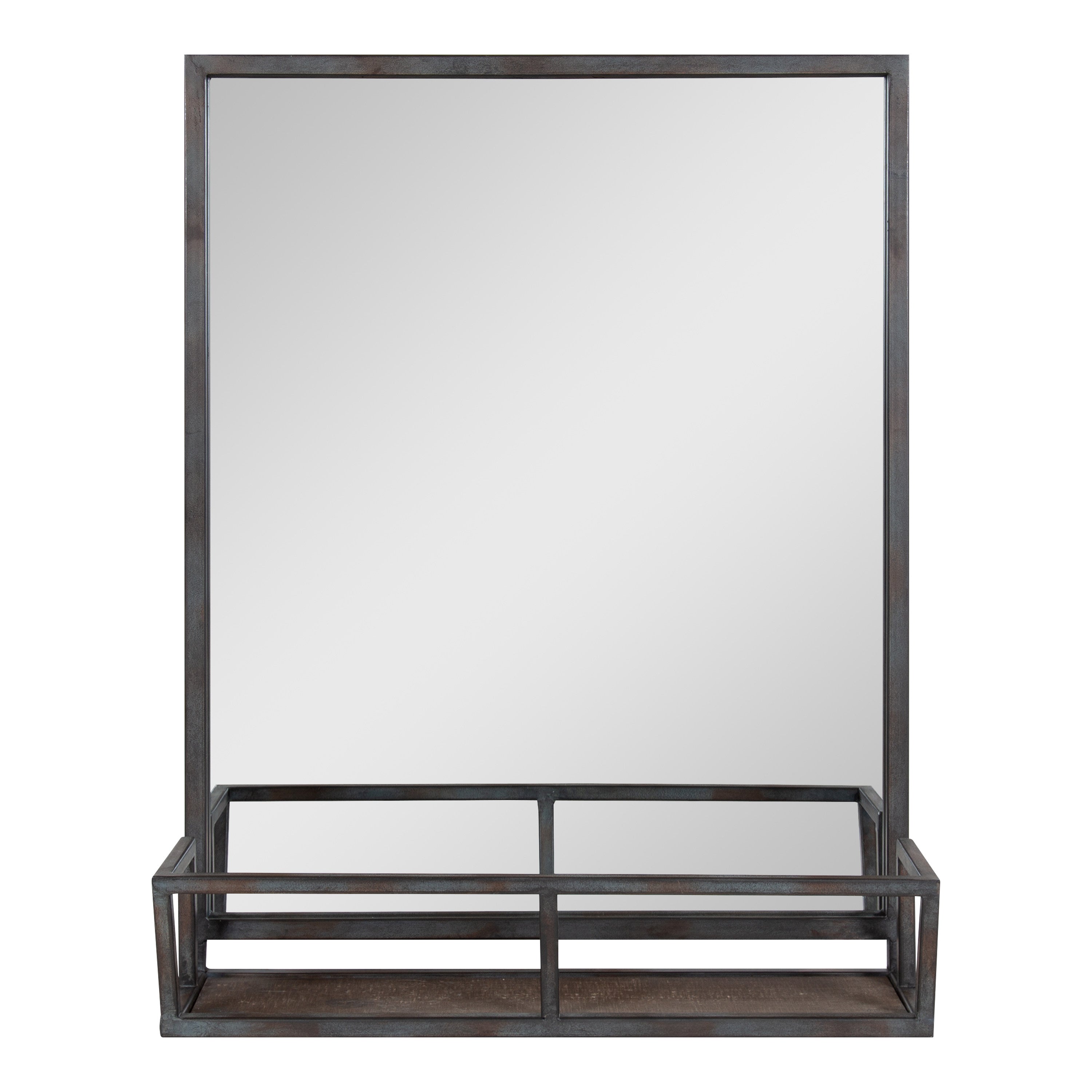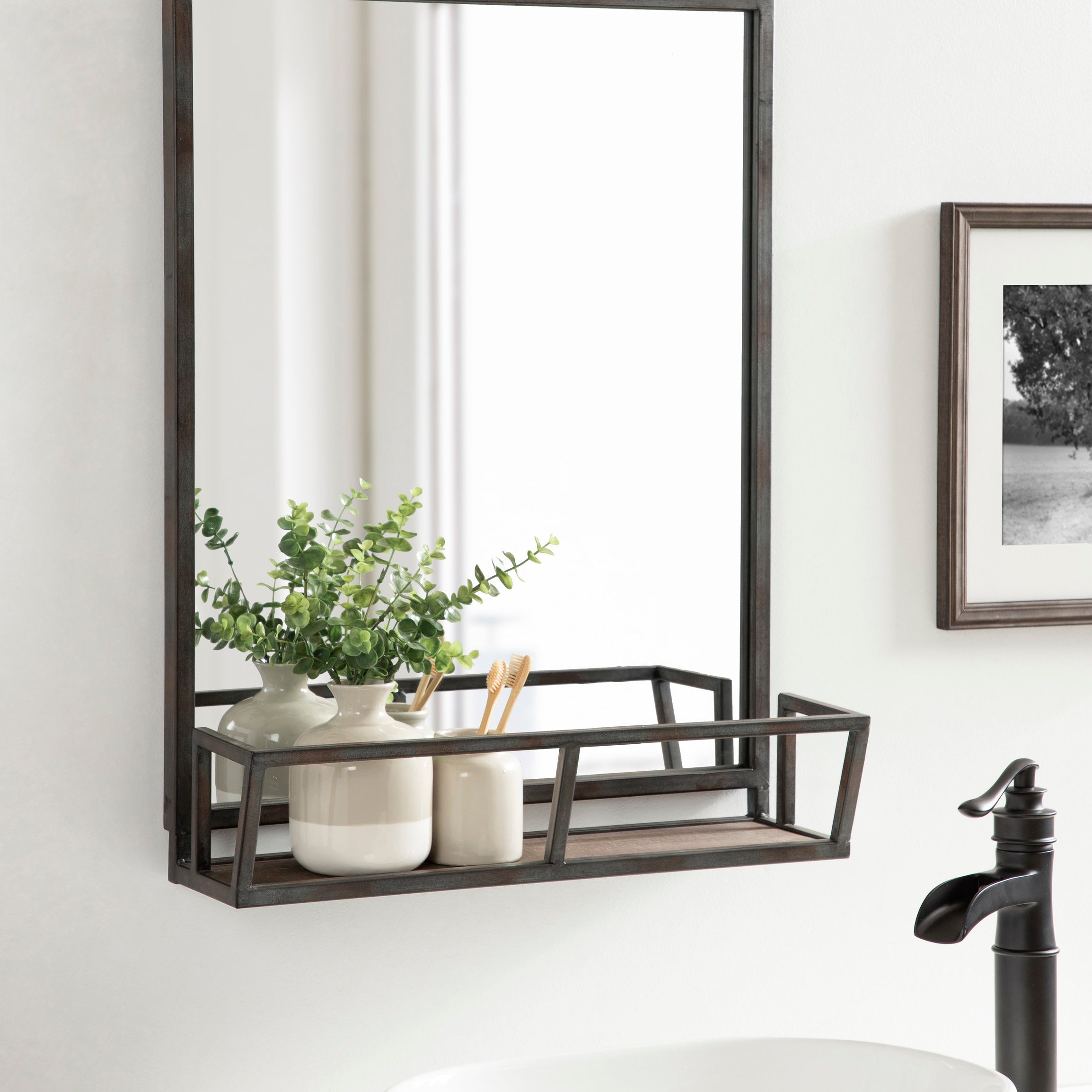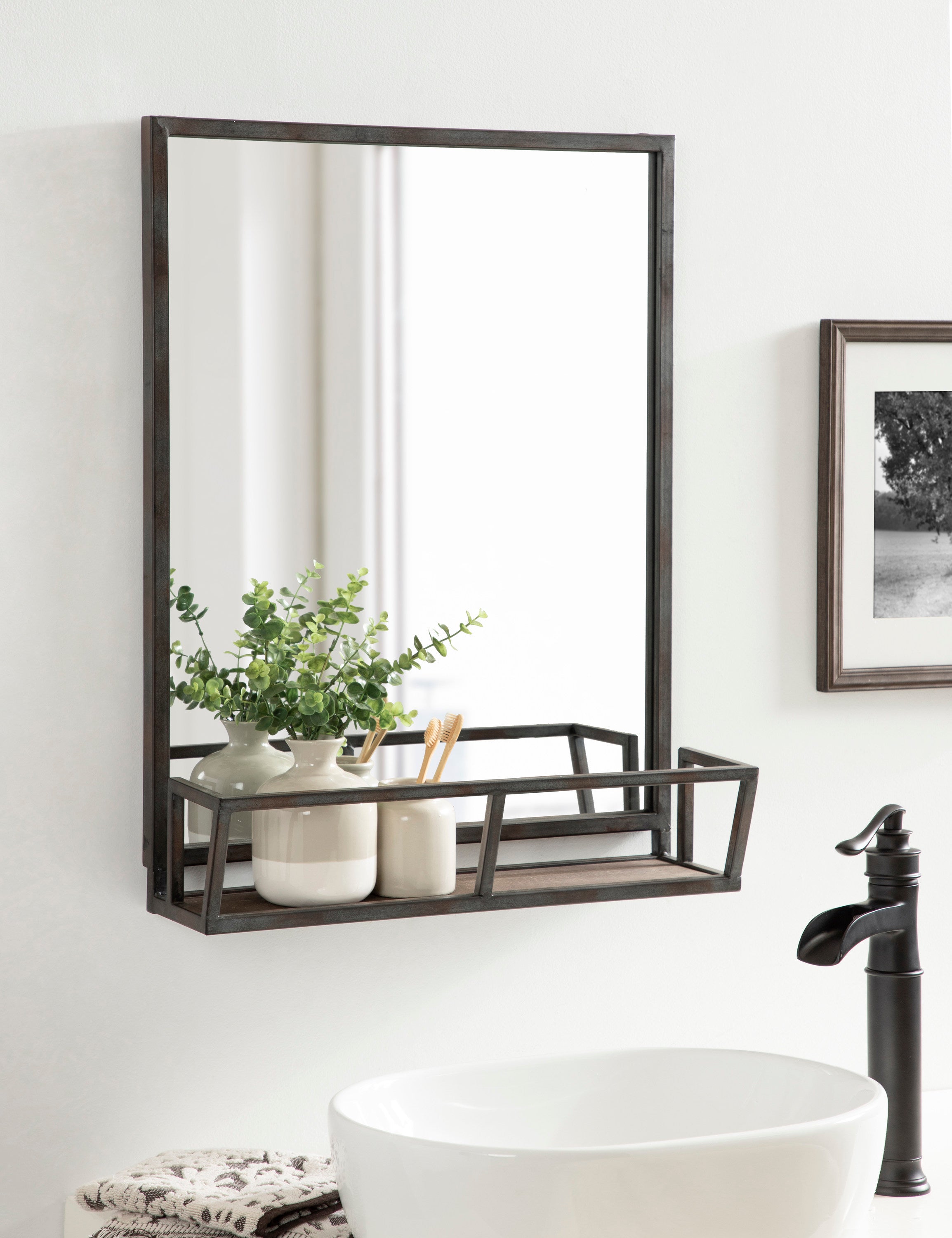 Develop a modern living space in your home by adding a lovely mirror like the Jackson wall mirror. This sharp accent relishes in its contemporary style, with a chic, black metal frame and a convenient 5-inch shelf. Use the mirror itself to create dimension and space in your home and use its attached shelf for soaps, lotions, small succulents, and more!