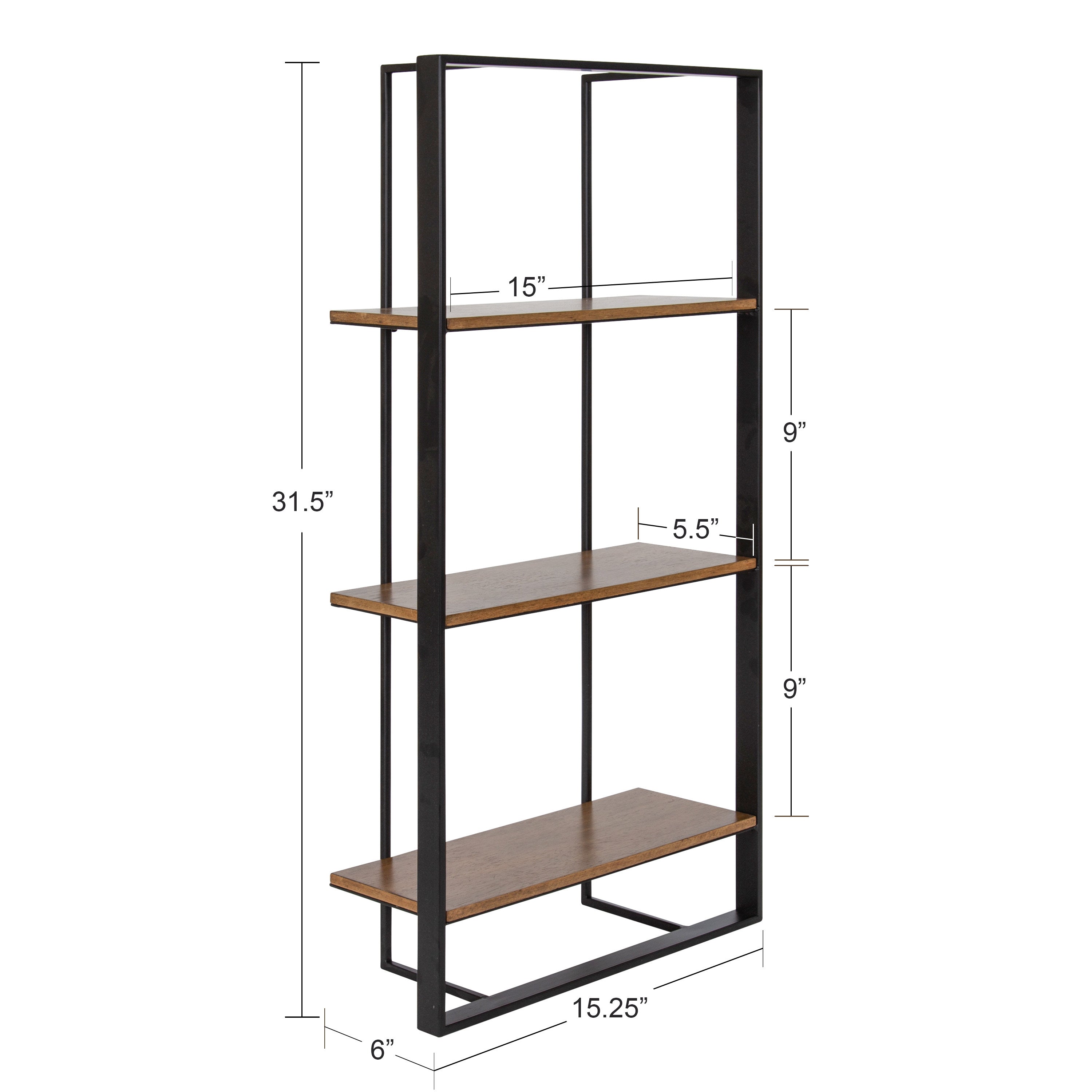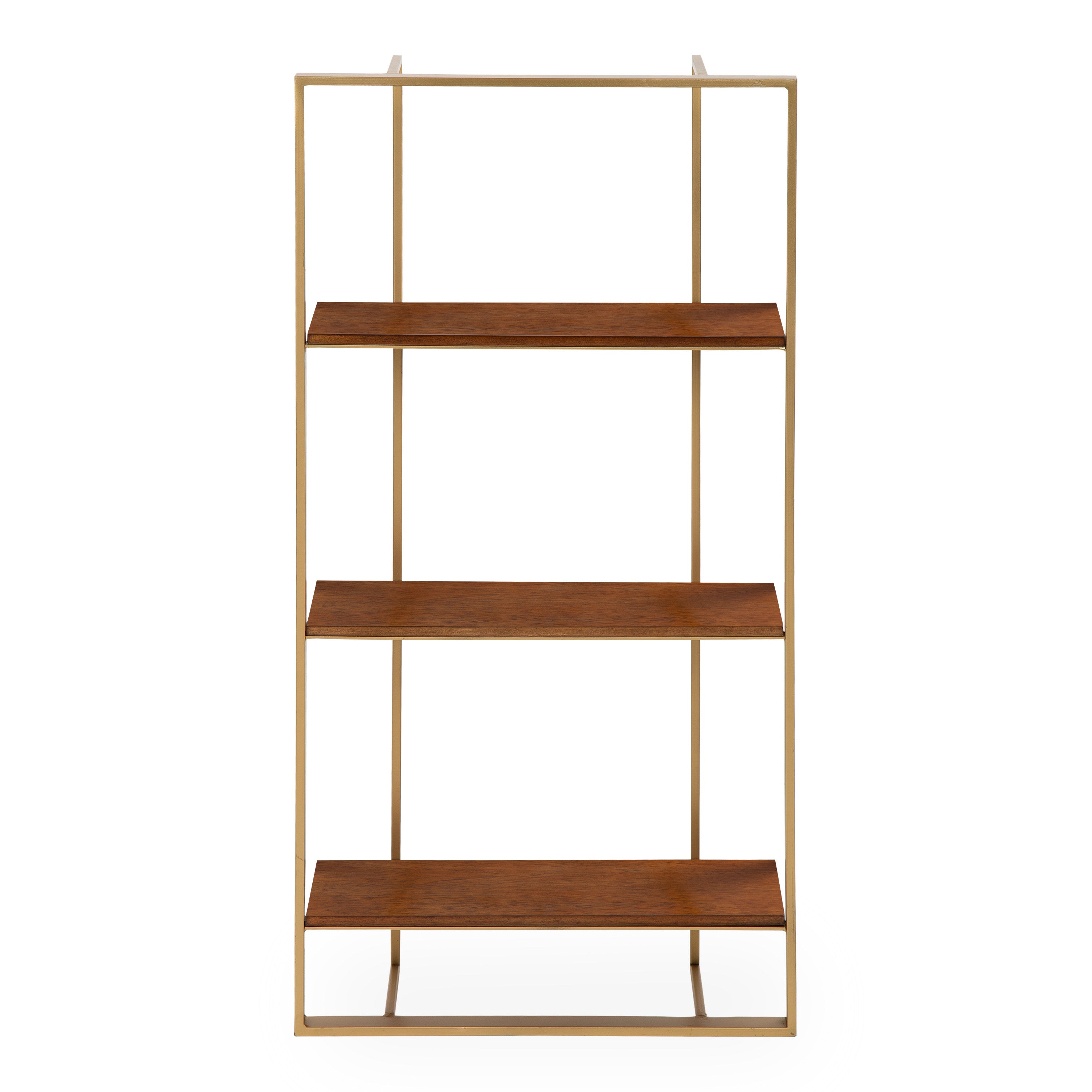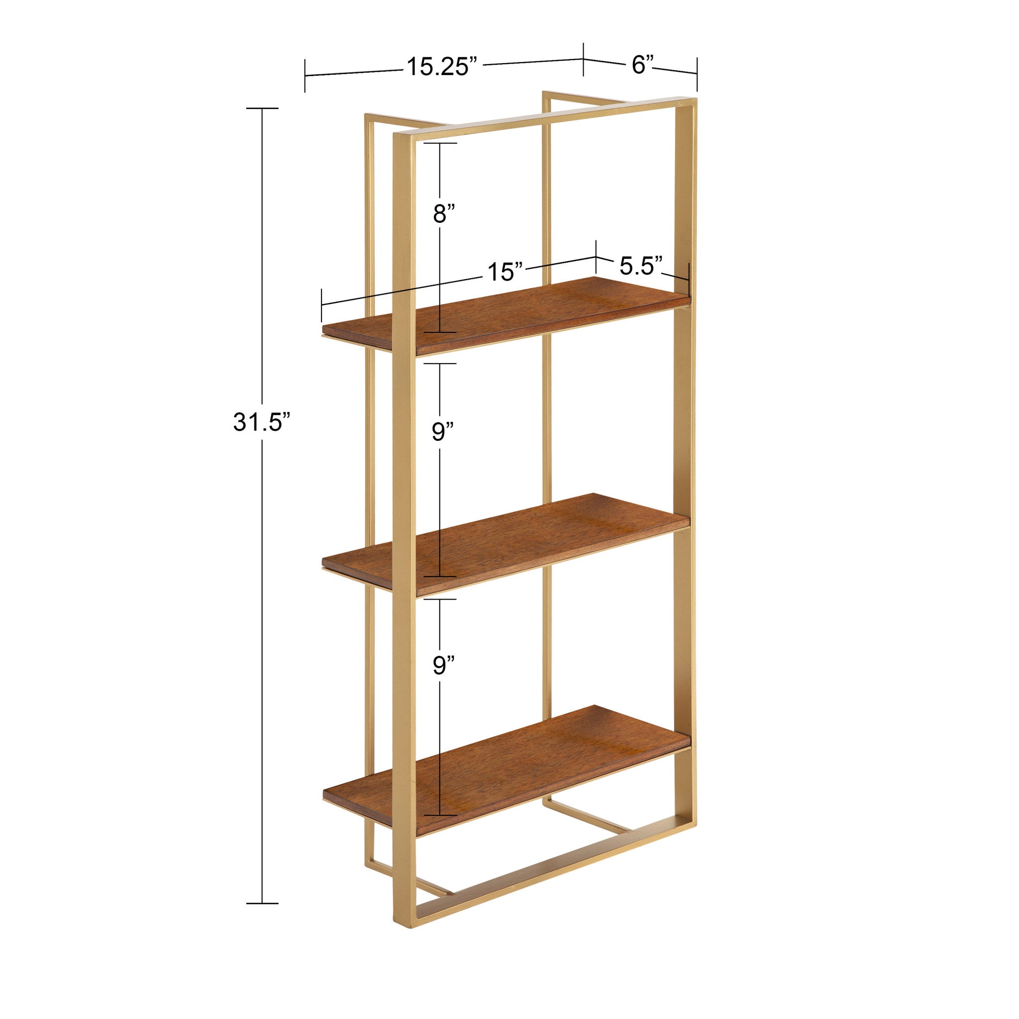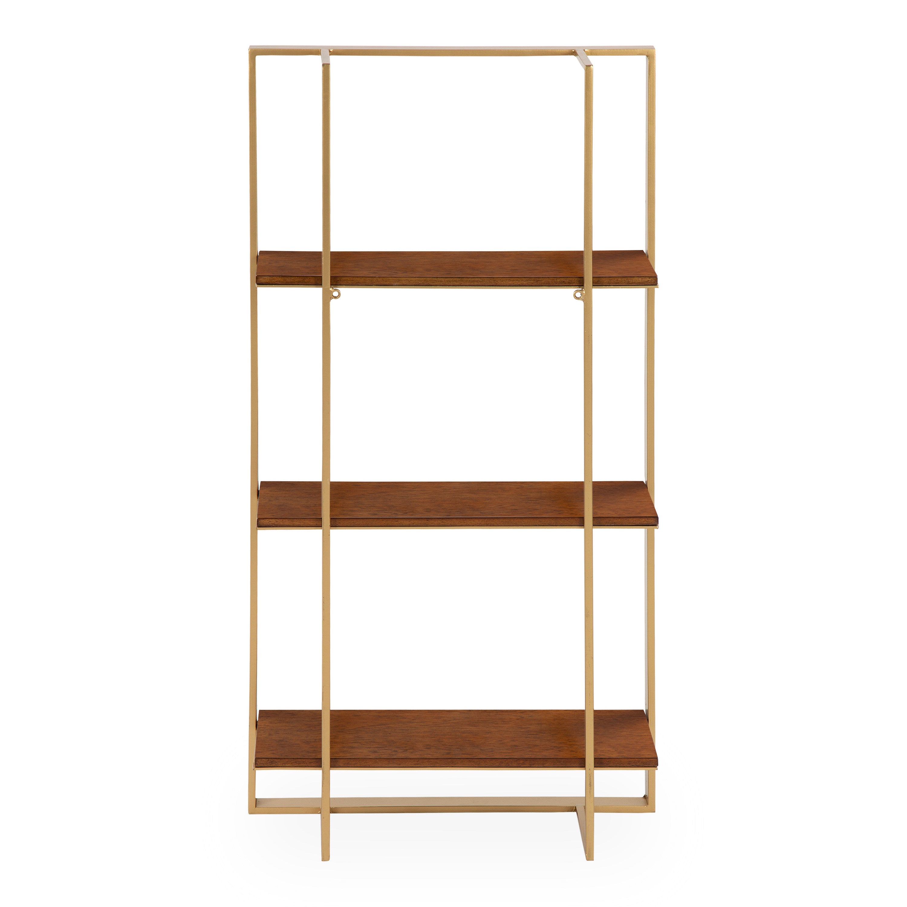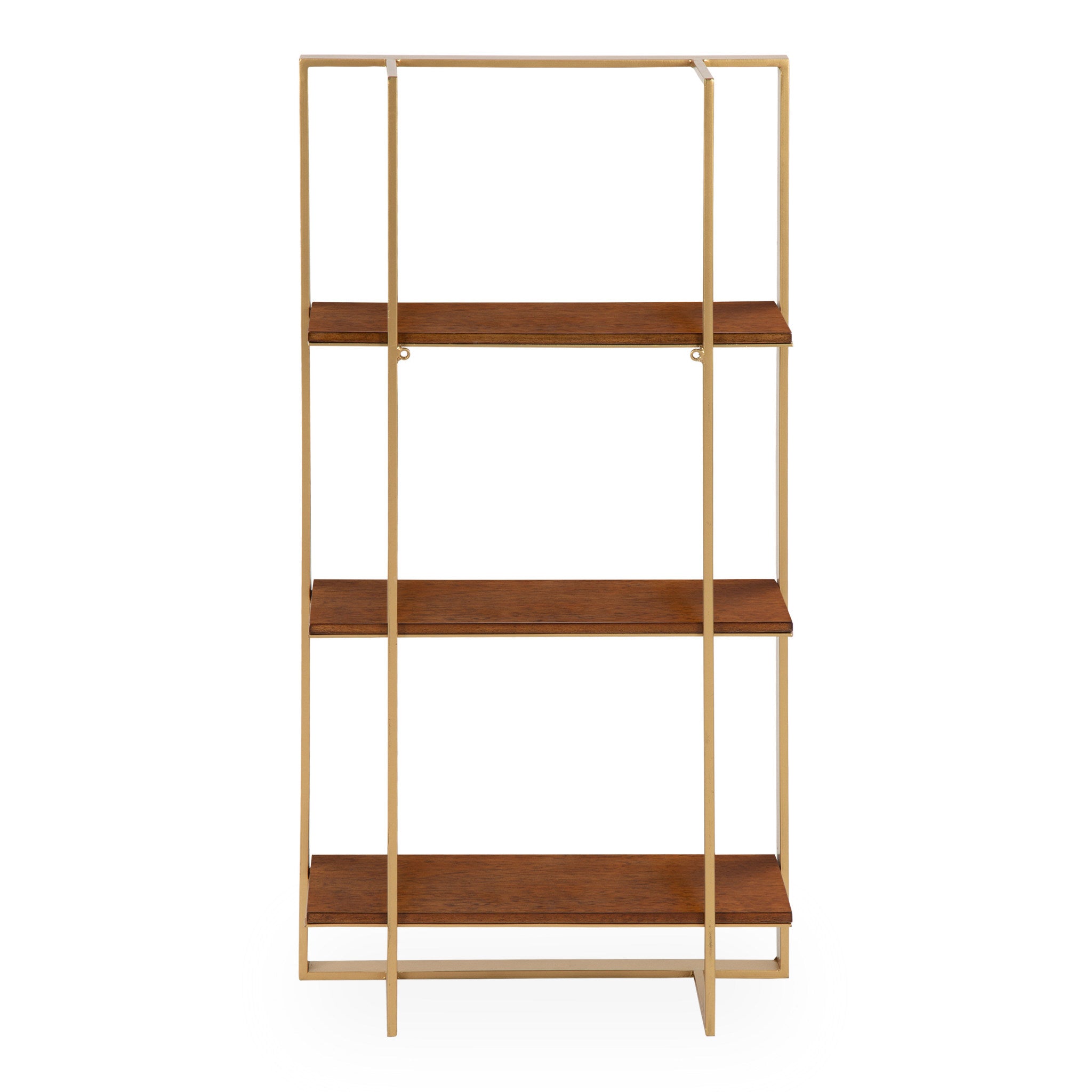 The Kercheval wood shelf brings an elegant solution to your de-cluttering needs. This three-tier shelf includes a mid-century modern design, with a metal frame and wood shelves. Save some space in your home or office by adding your novelties, plants, and photos to each shelf. It serves as an easy storage or display area for your kitchen, bathroom, office, bedroom, entryway or living room.
