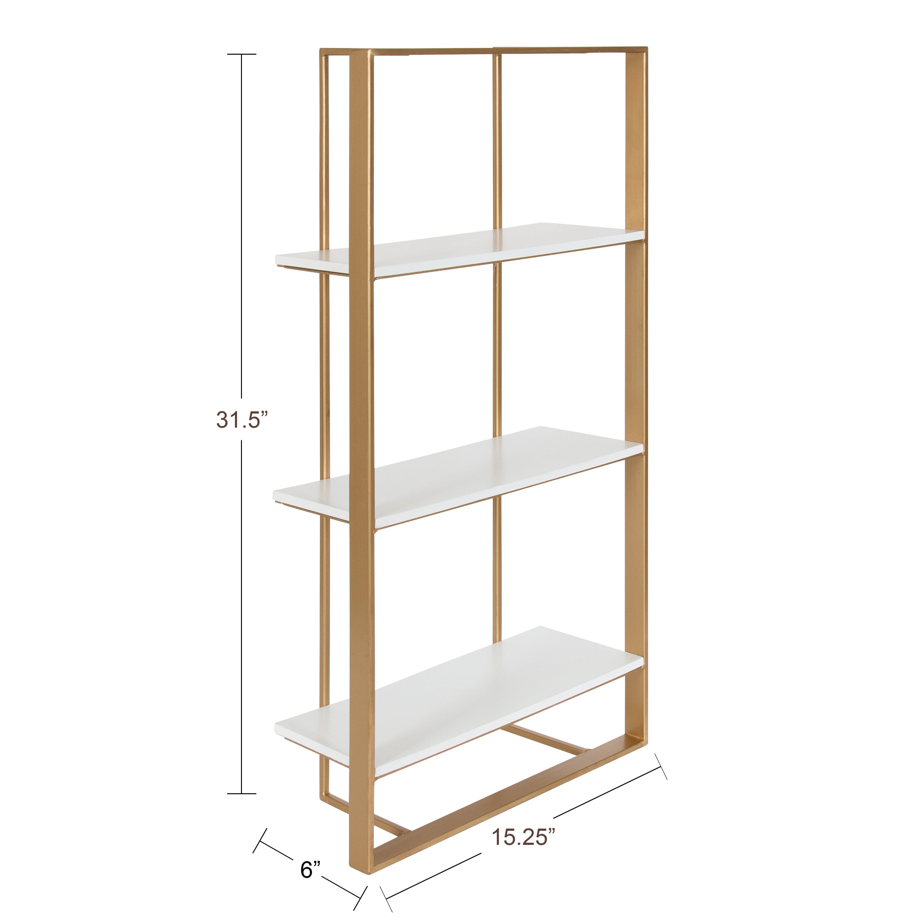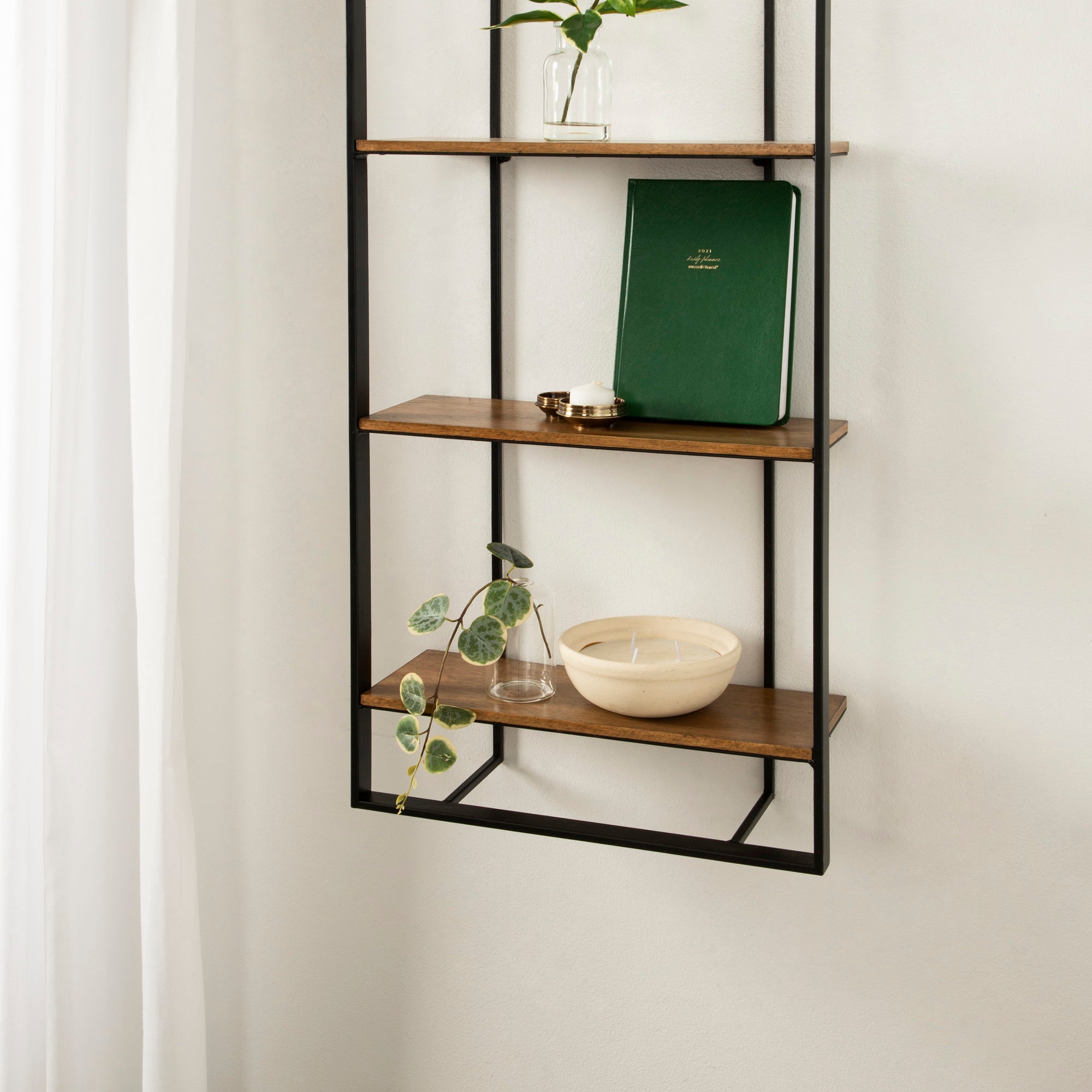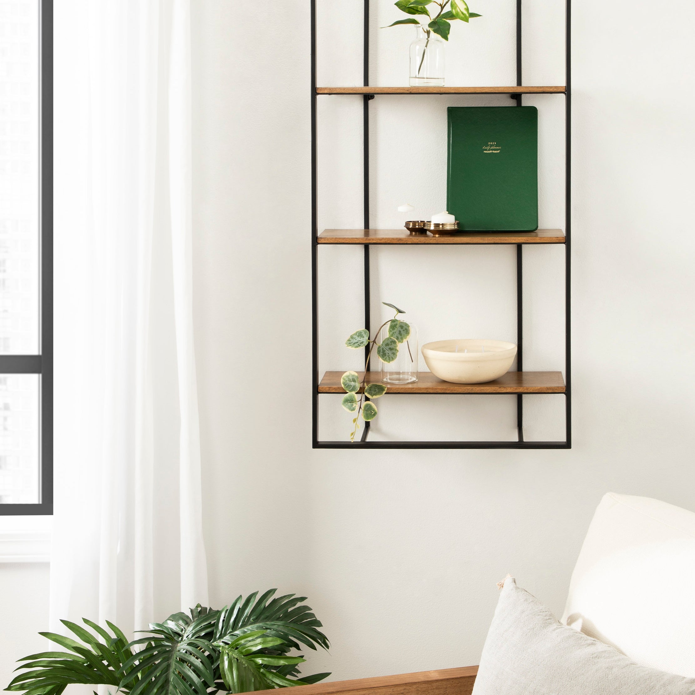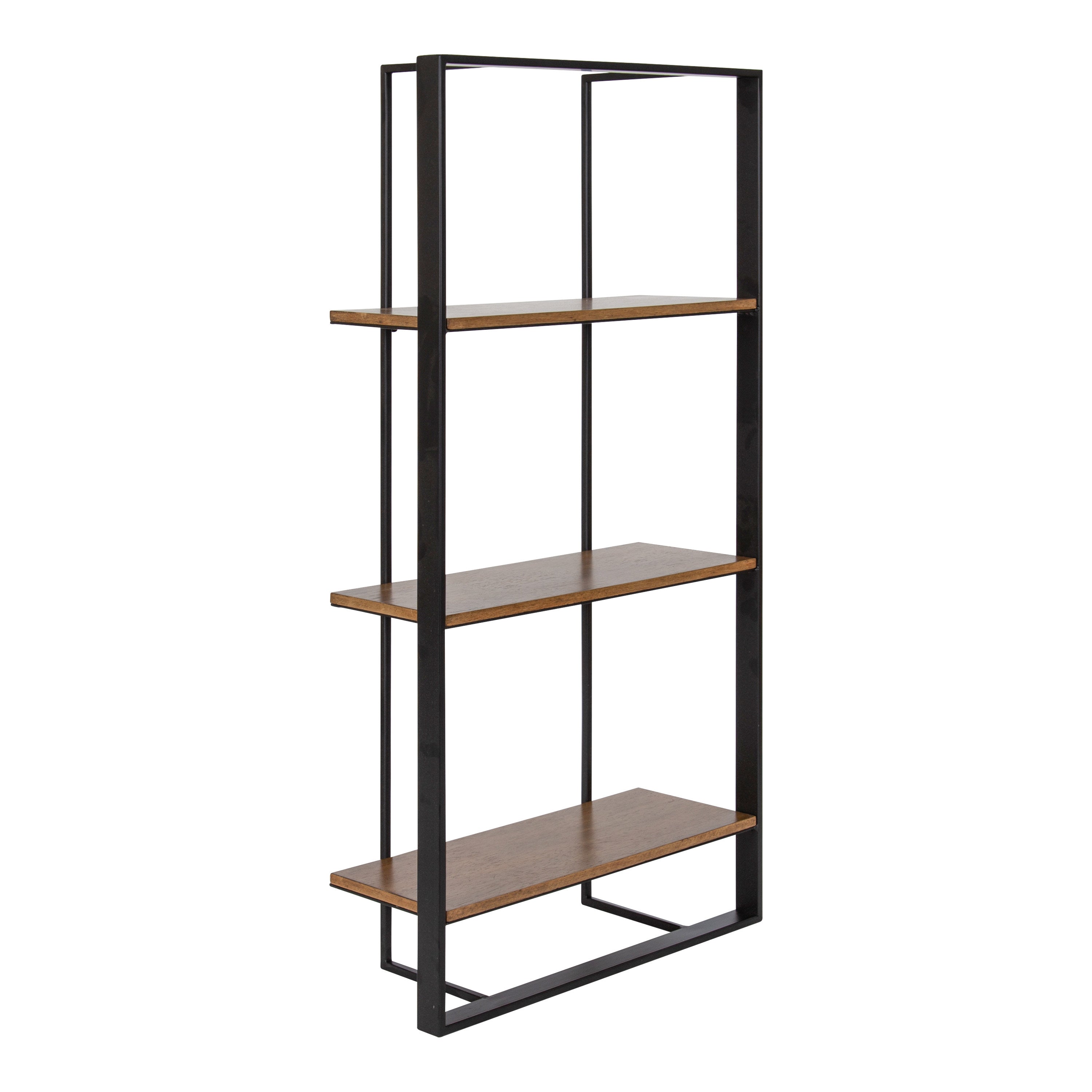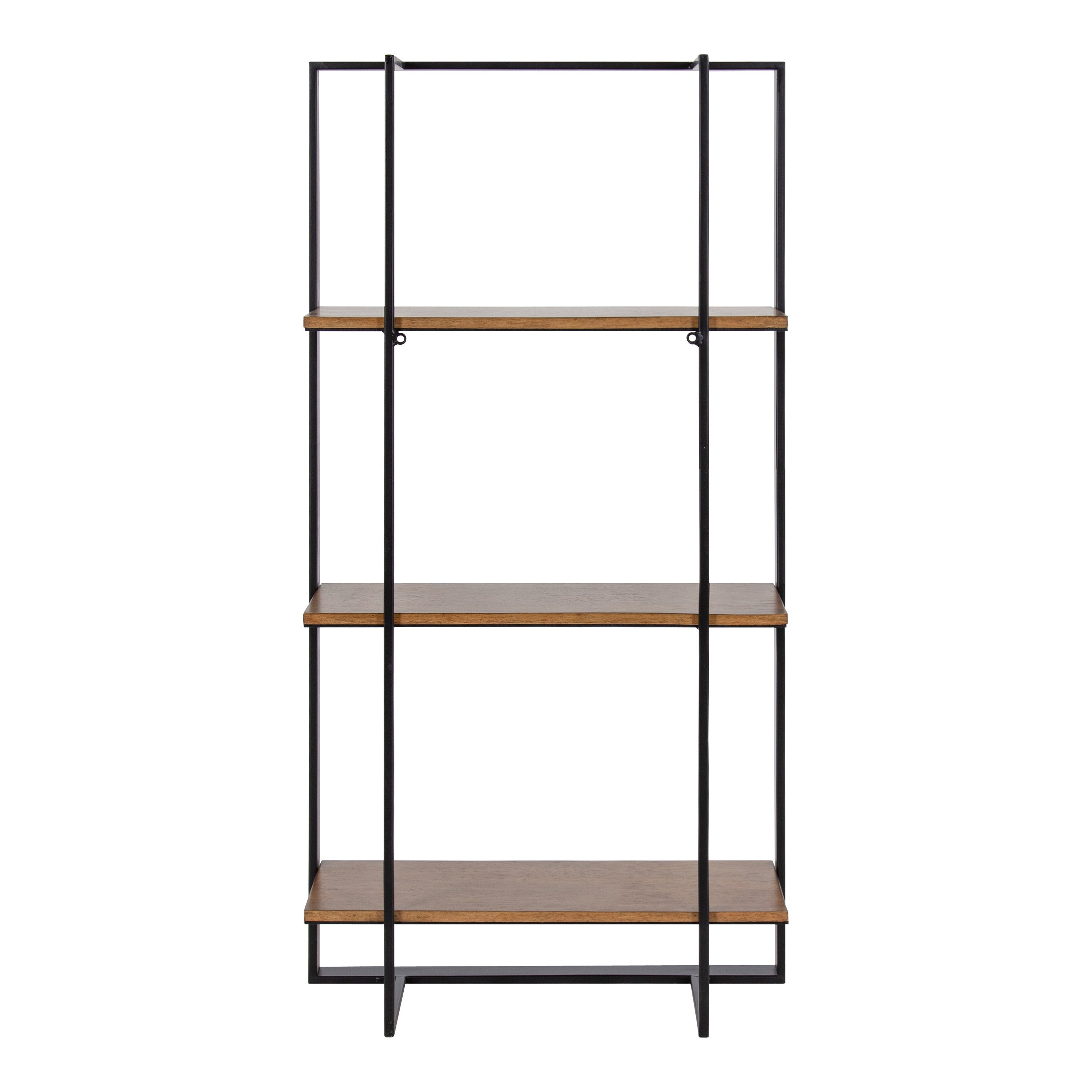 The Kercheval wood shelf brings an elegant solution to your de-cluttering needs. This three-tier shelf includes a mid-century modern design, with a metal frame and wood shelves. Save some space in your home or office by adding your novelties, plants, and photos to each shelf. It serves as an easy storage or display area for your kitchen, bathroom, office, bedroom, entryway or living room.