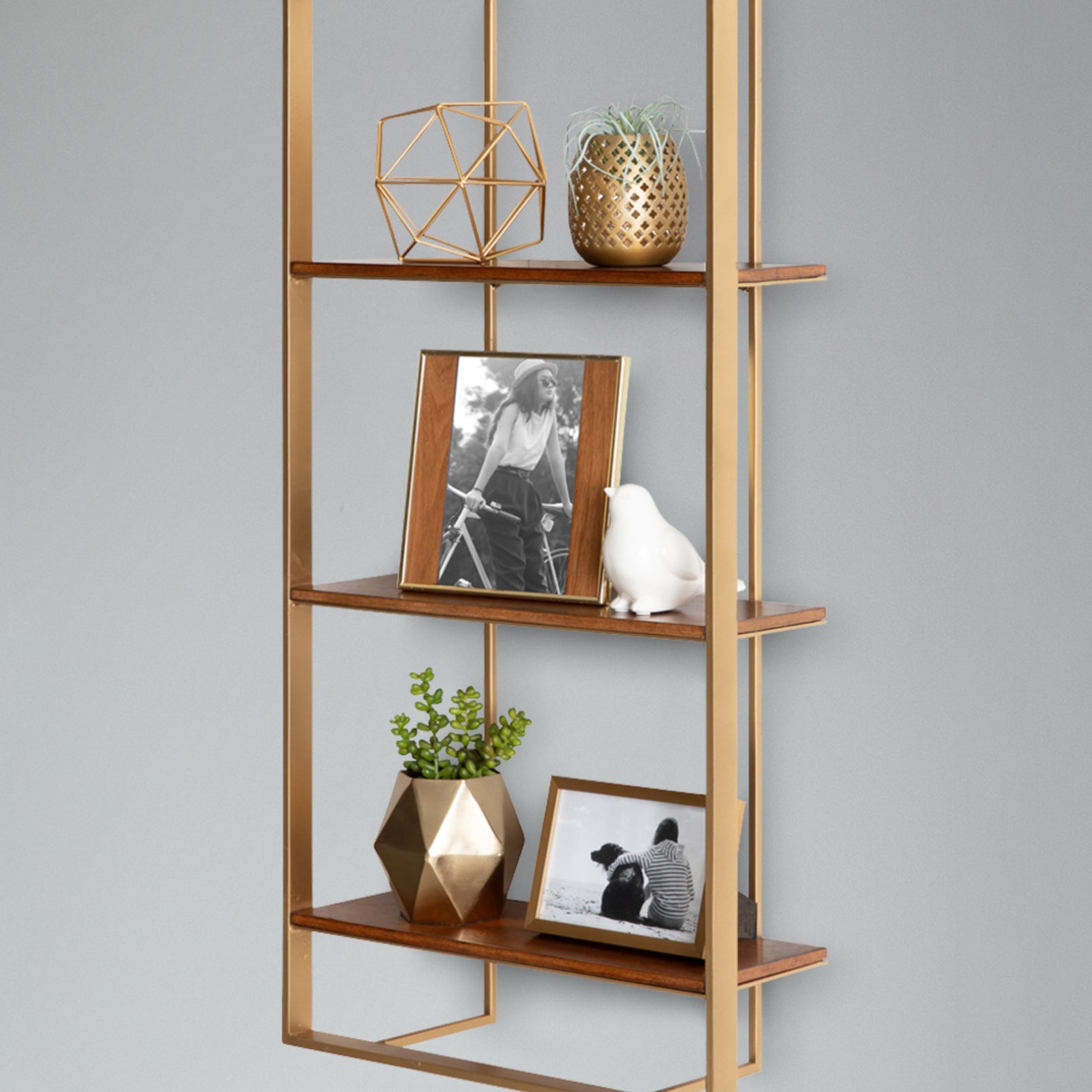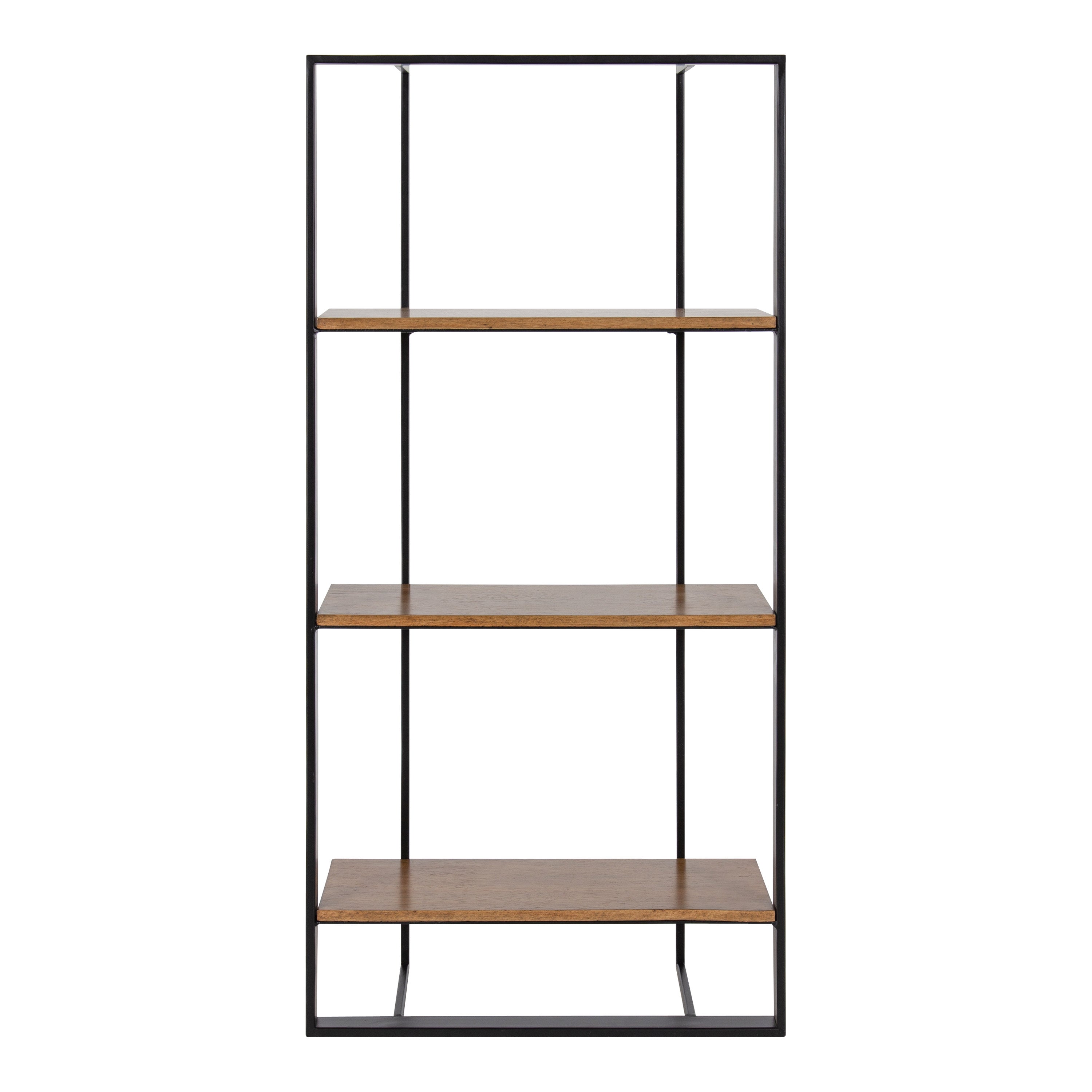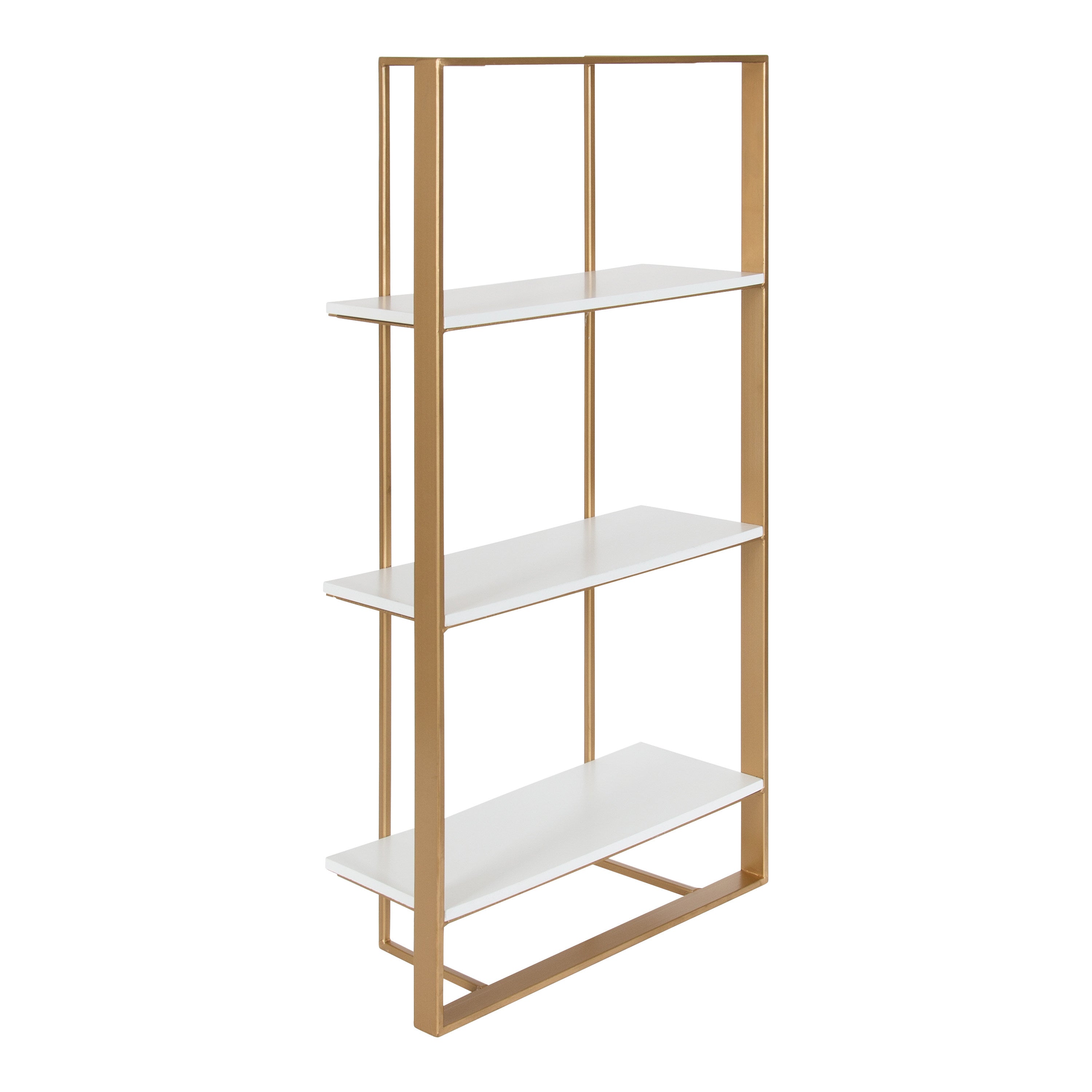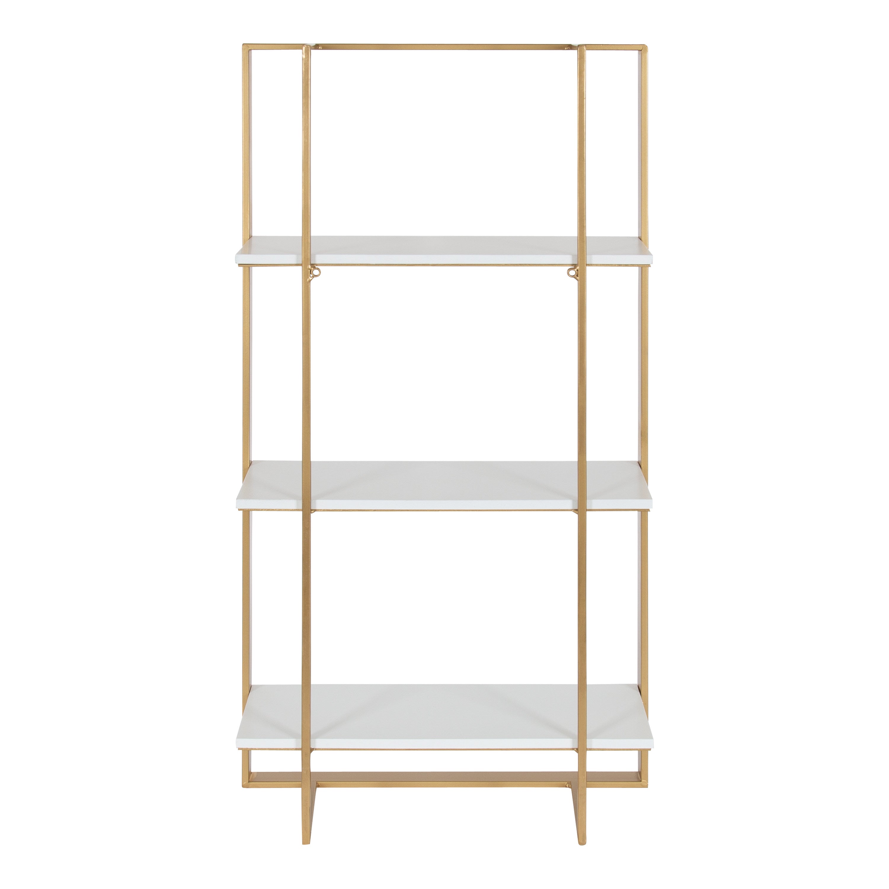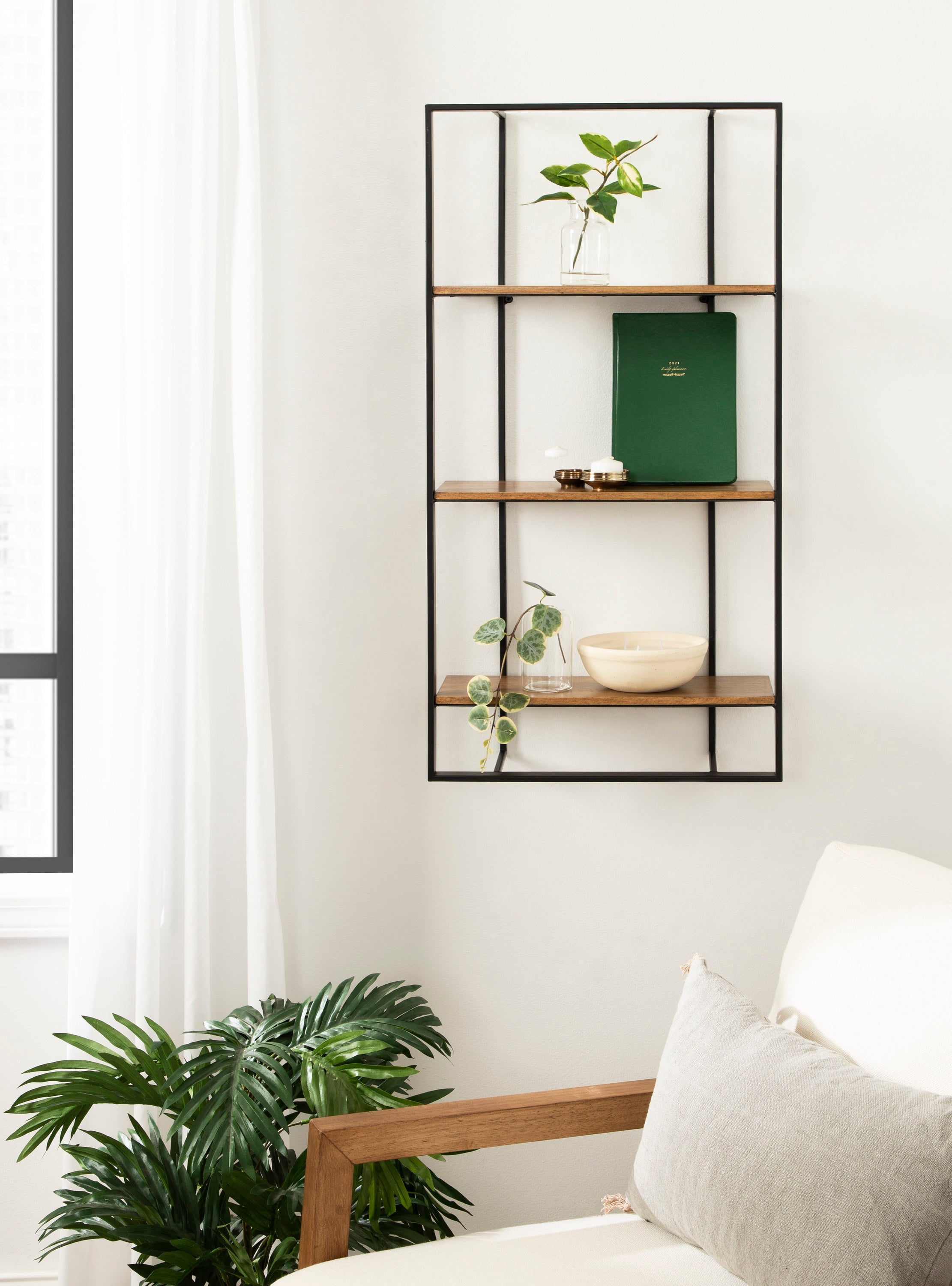 The Kercheval wood shelf brings an elegant solution to your de-cluttering needs. This three-tier shelf includes a mid-century modern design, with a metal frame and wood shelves. Save some space in your home or office by adding your novelties, plants, and photos to each shelf. It serves as an easy storage or display area for your kitchen, bathroom, office, bedroom, entryway or living room.