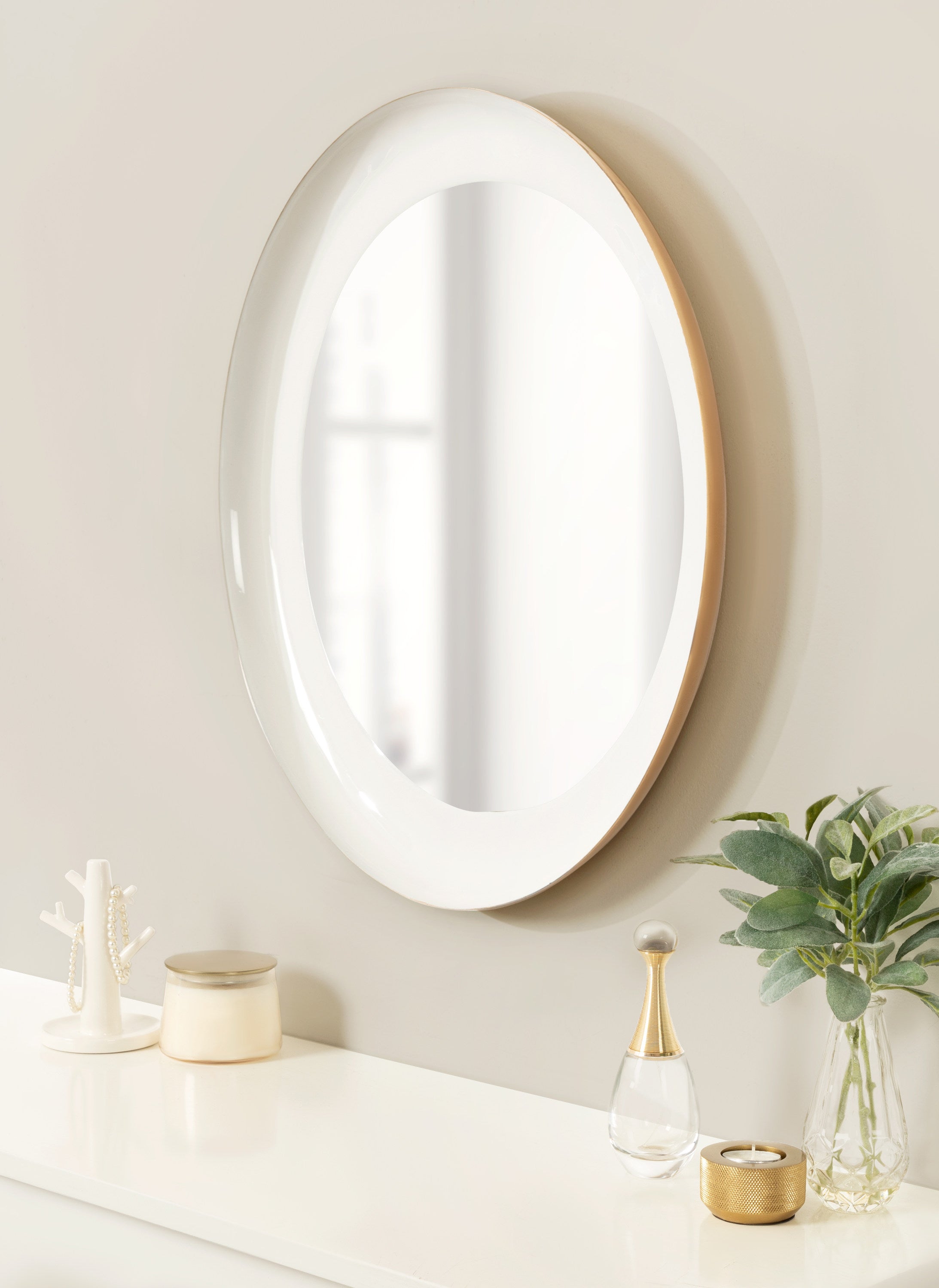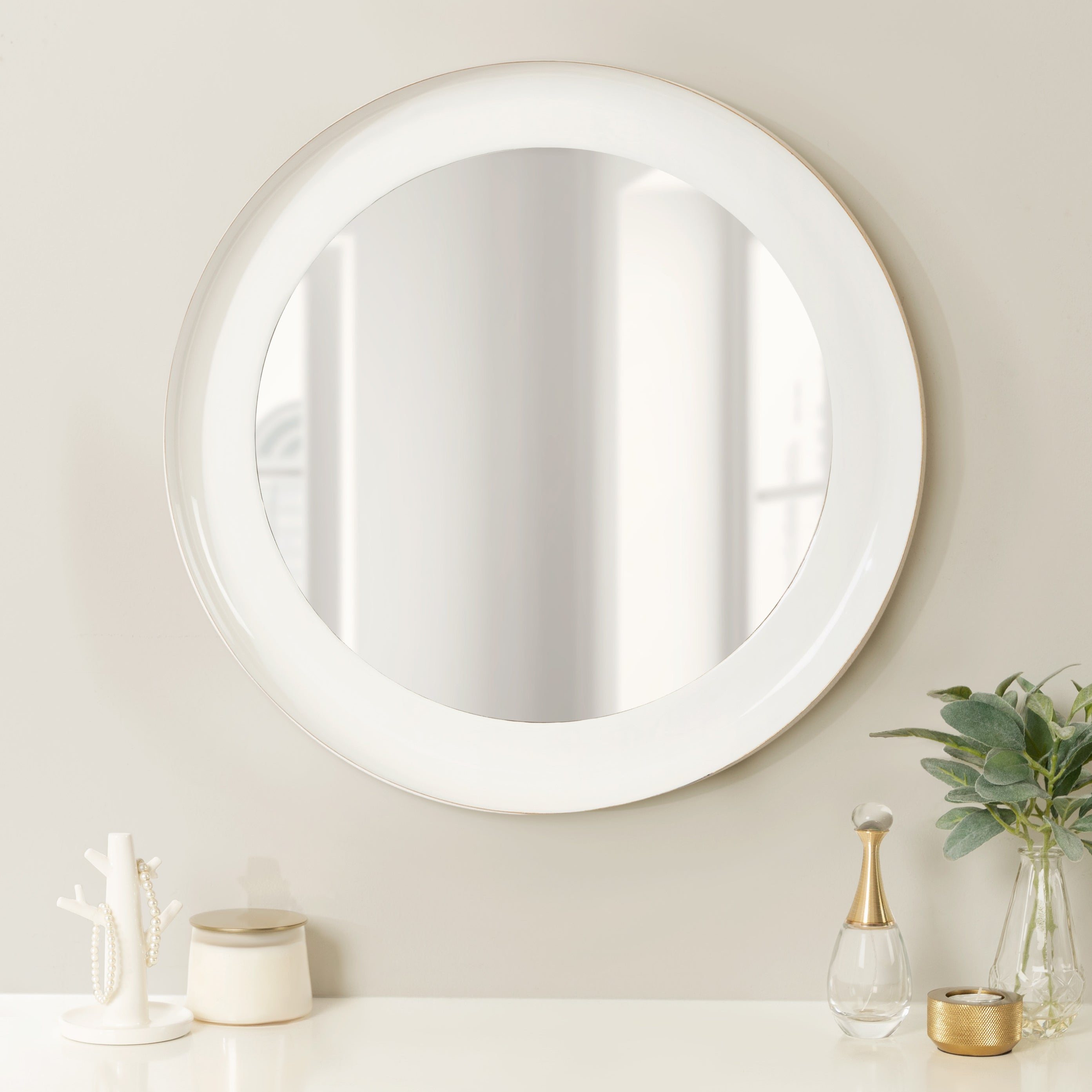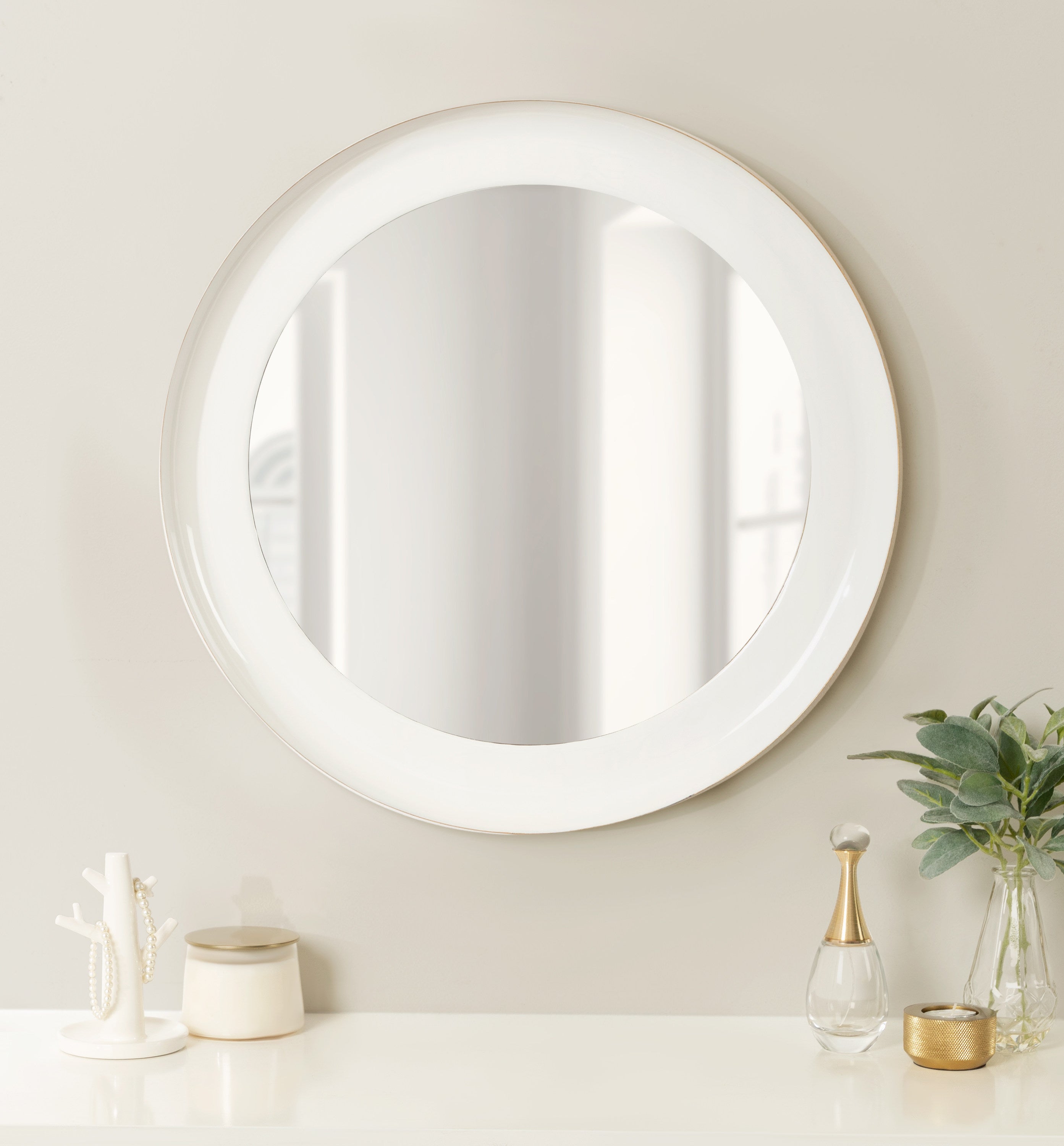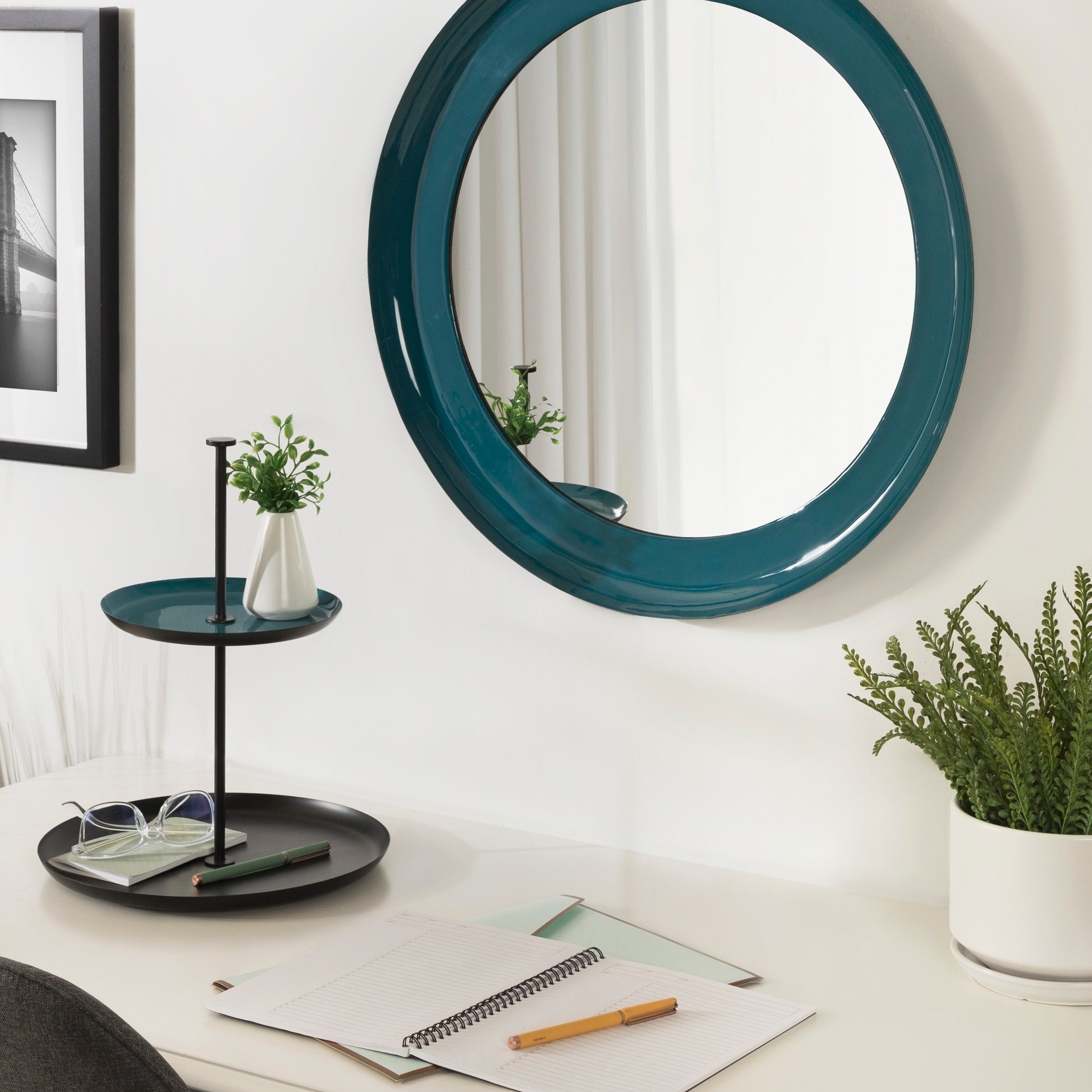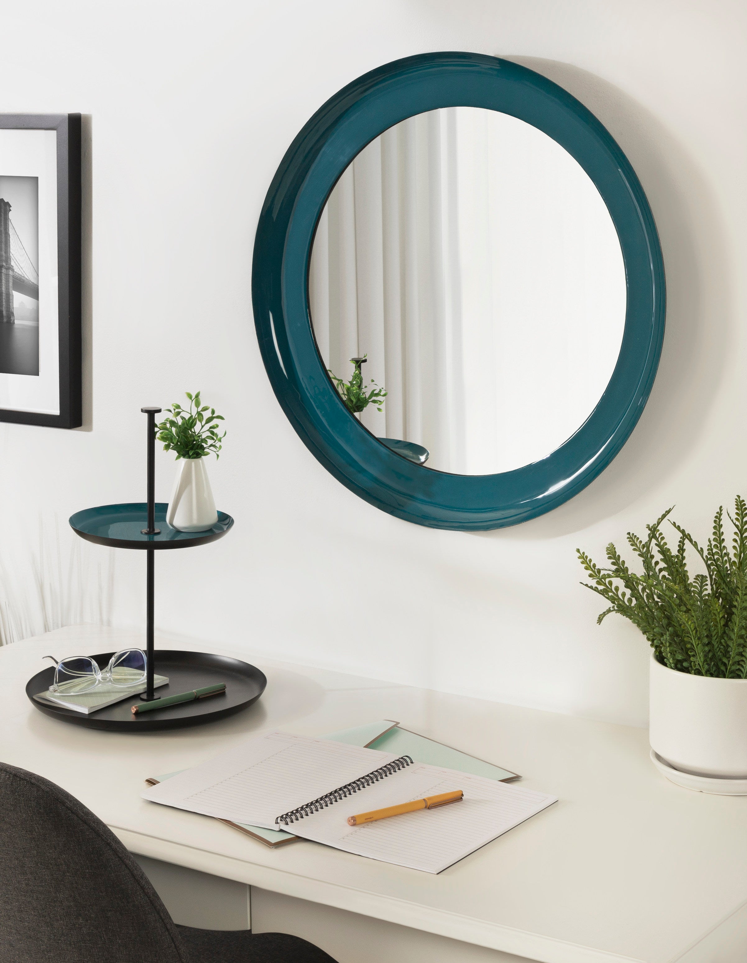 Bring color and life into your home with the lovely mid-century modern style of the Laranya mirror. This bold mirror offers a circular shape with a raised lip, creating a 3-dimensional look to provide depth to your space. Its two-tone finish also has an enamel coat, creating high gloss that draws the eye. Whether you hang it as a decorative accent or a practical powder room vanity mirror, the lovely Laranya is a fabulous addition to any space.