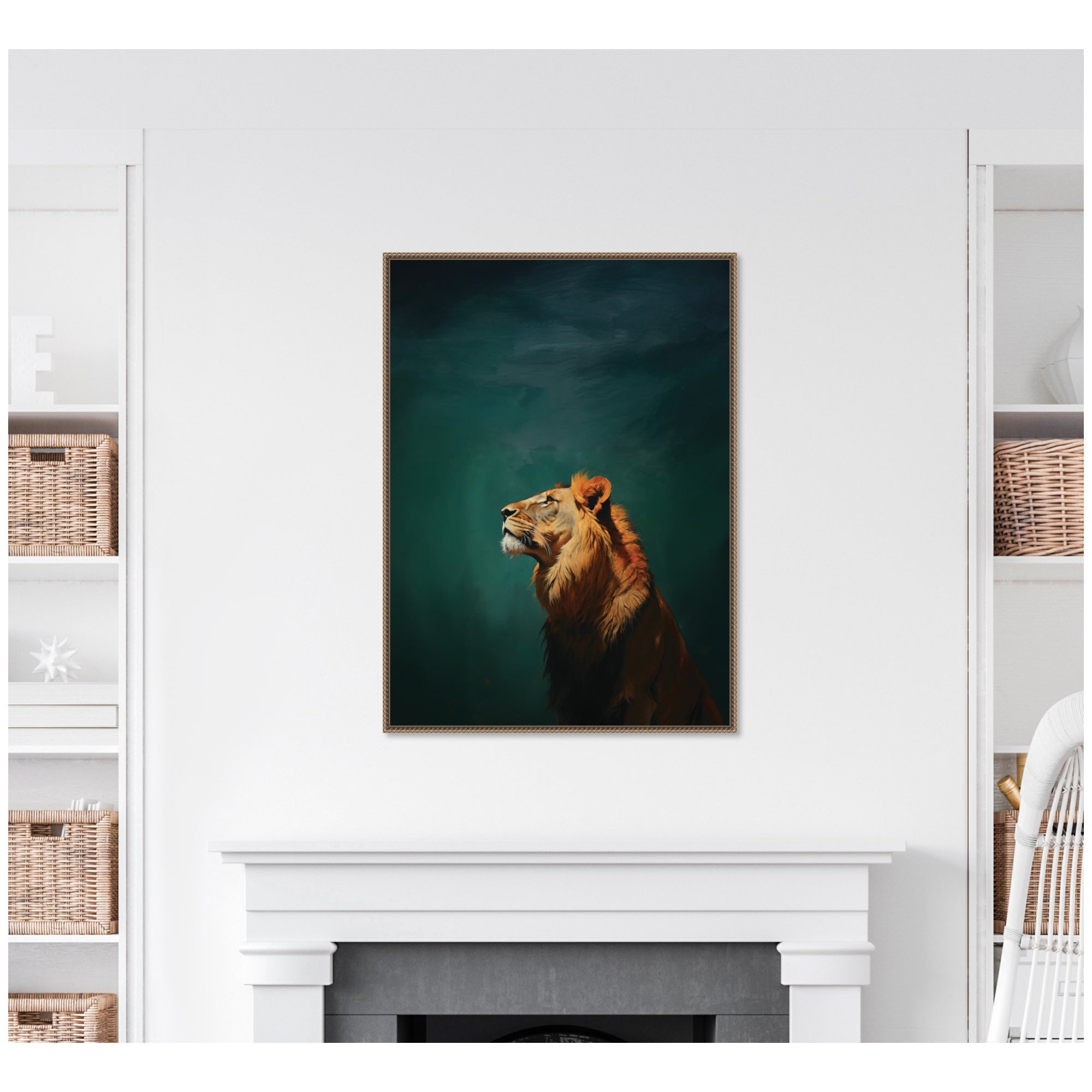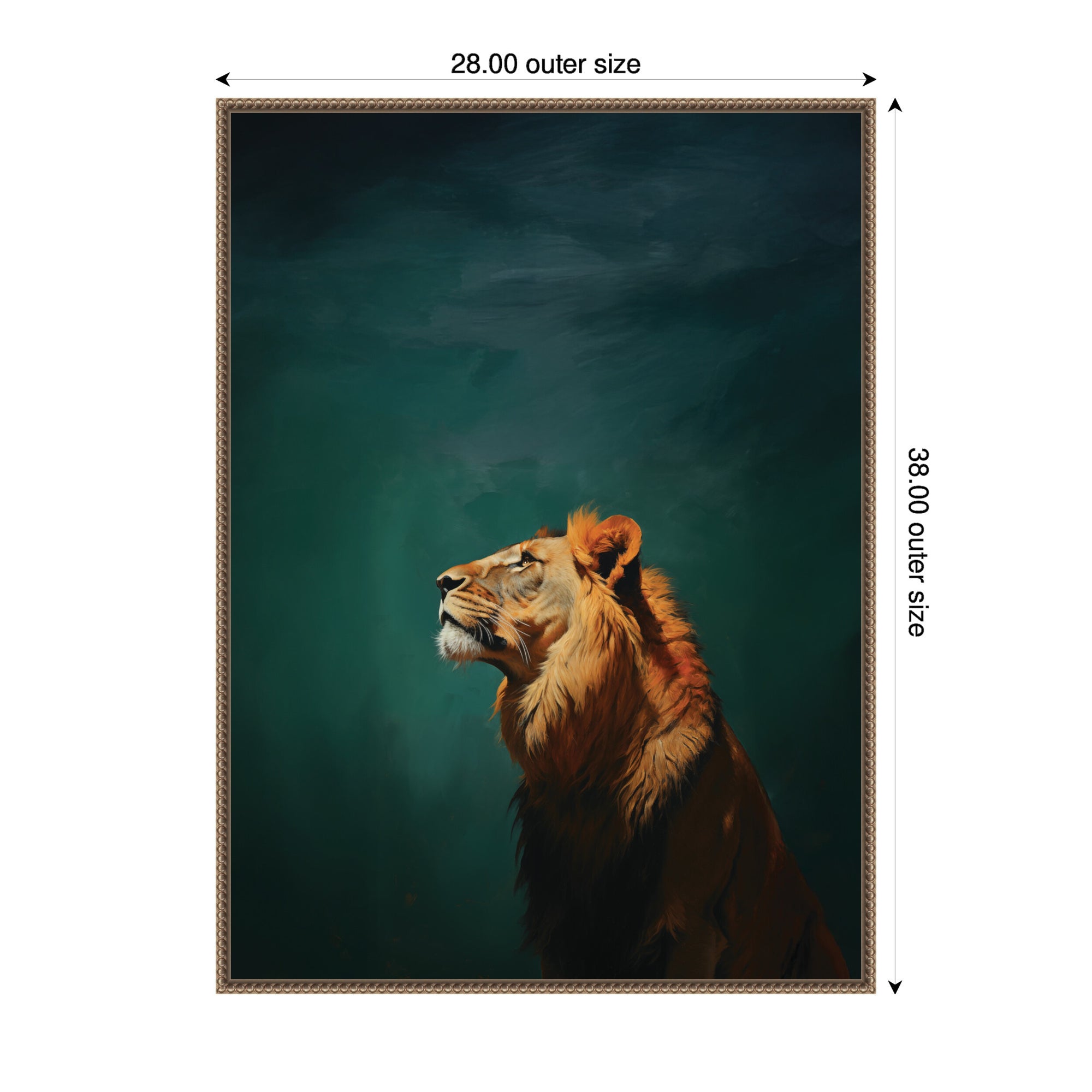 - Gallery Quality Art: Measuring 28 x 38 inches, this is beautifully presented in Sylvie Beaded Dark Gold frame - a vintage float frame featuring a traditionally beaded ornate design with dark gold coloring, subtle antiquing and dramatic depth.. Expressive Wall Art Story:The artwork features a majestic lion with a richly detailed mane, gazing confidently into the distance. The background is a blend of dark and deep green hues, creating a dramatic and serene atmosphere. The play of light and shadow on the lion enhances its regal and powerful presence.