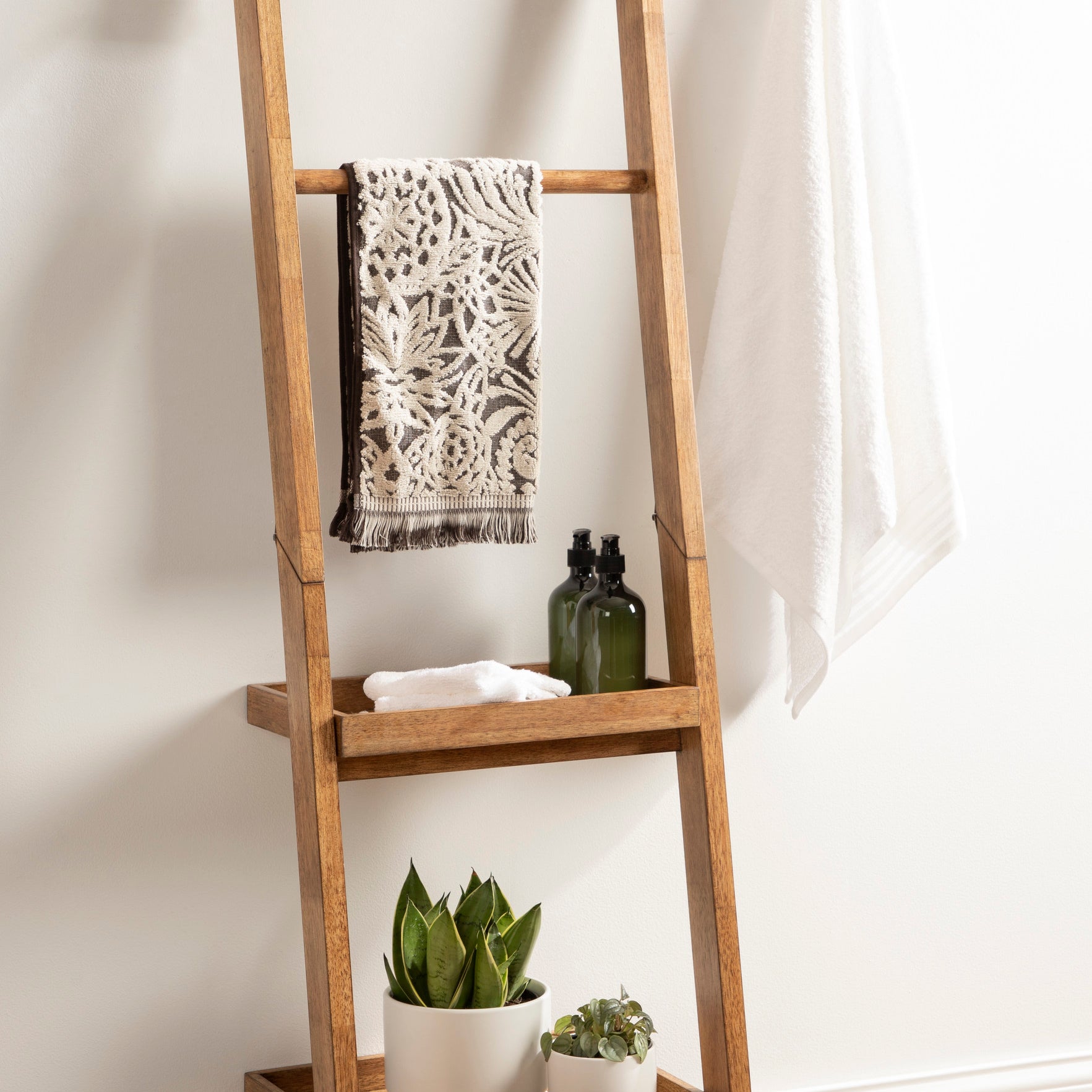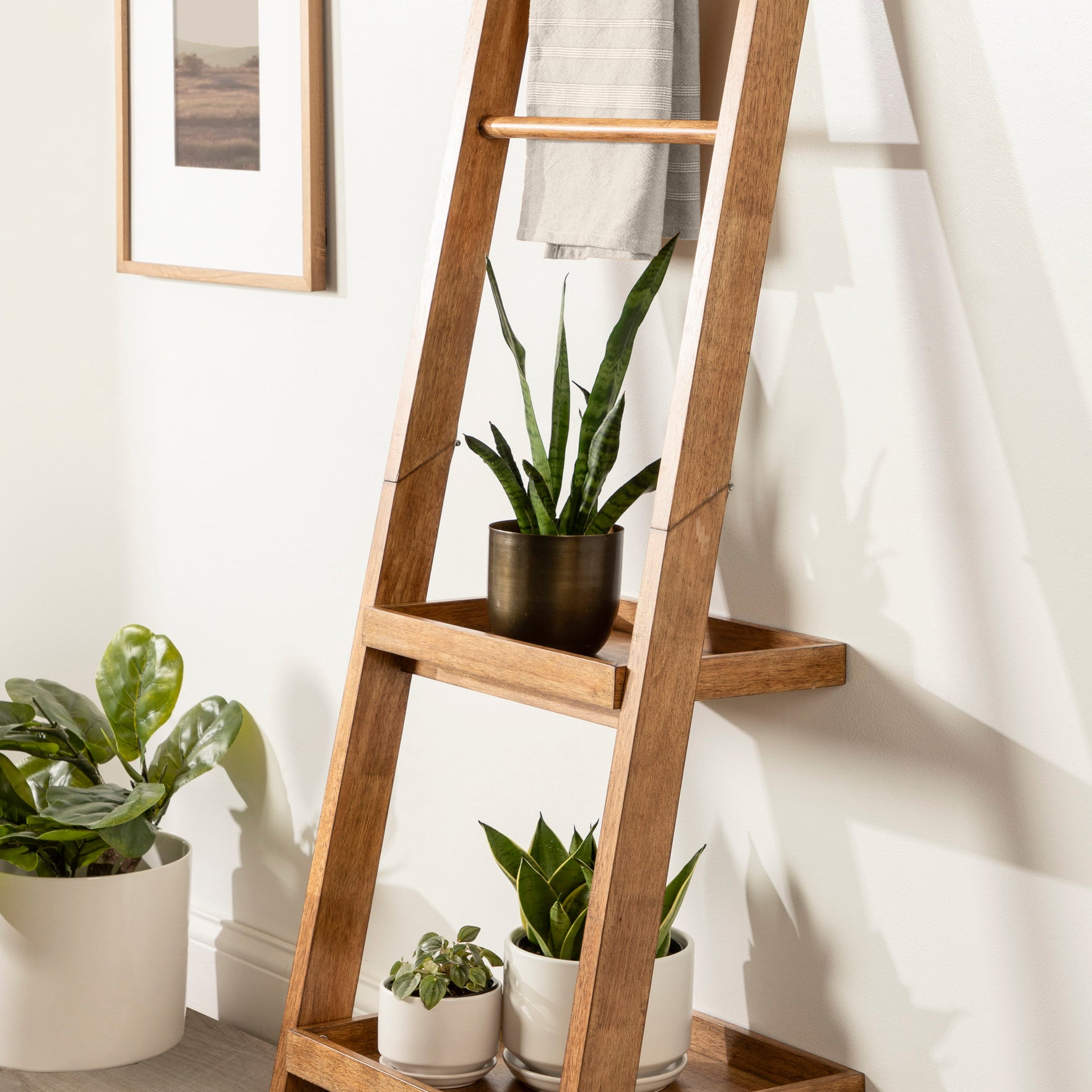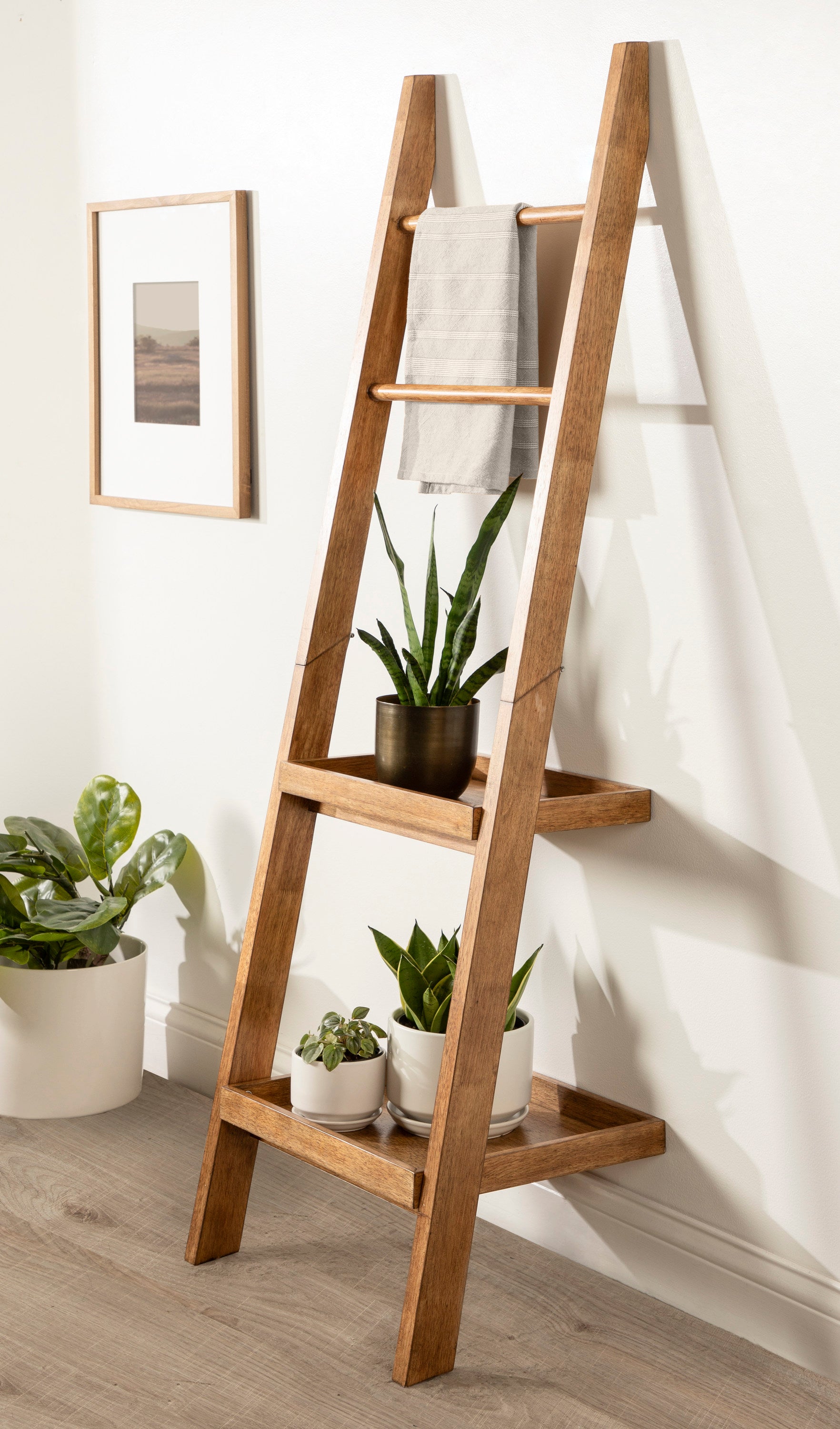 Upgrade your storage with modern style by showcasing the Lowry ladder shelf! This shelving features two shelves and two hanging rungs to store blankets, towels, household necessities, and decorative accents. This ladder shelf looks fabulous when it flanks your fireplace, stores folders next to your office desk, or keeping your mail, keys, scarves, and wallet safe near your entryway. Mount this ladder easily by unfolding it and securing the Lowry to the wall with the provided tether kit.