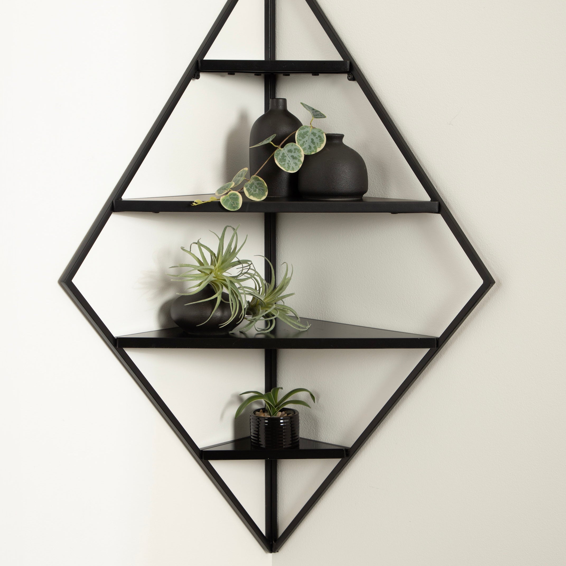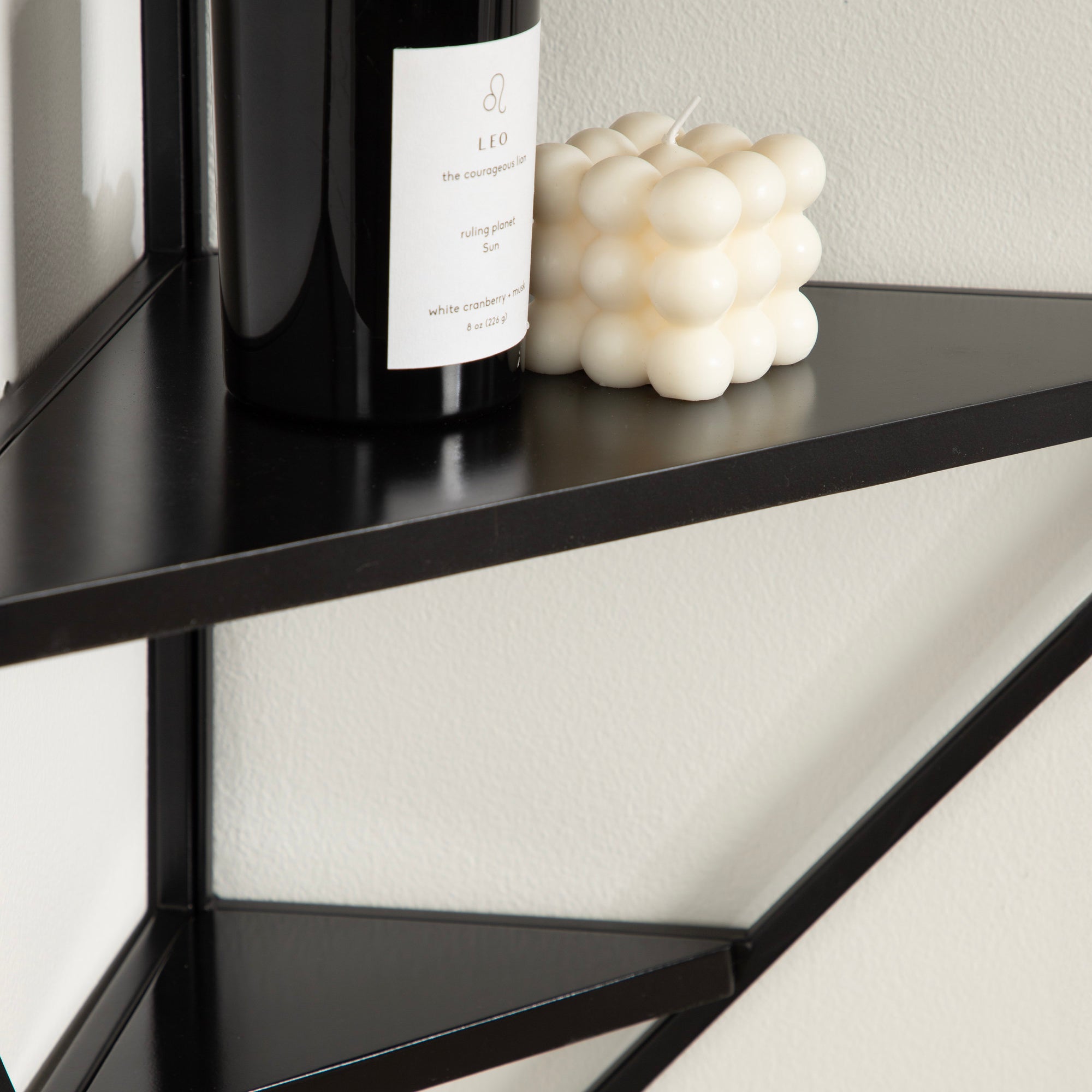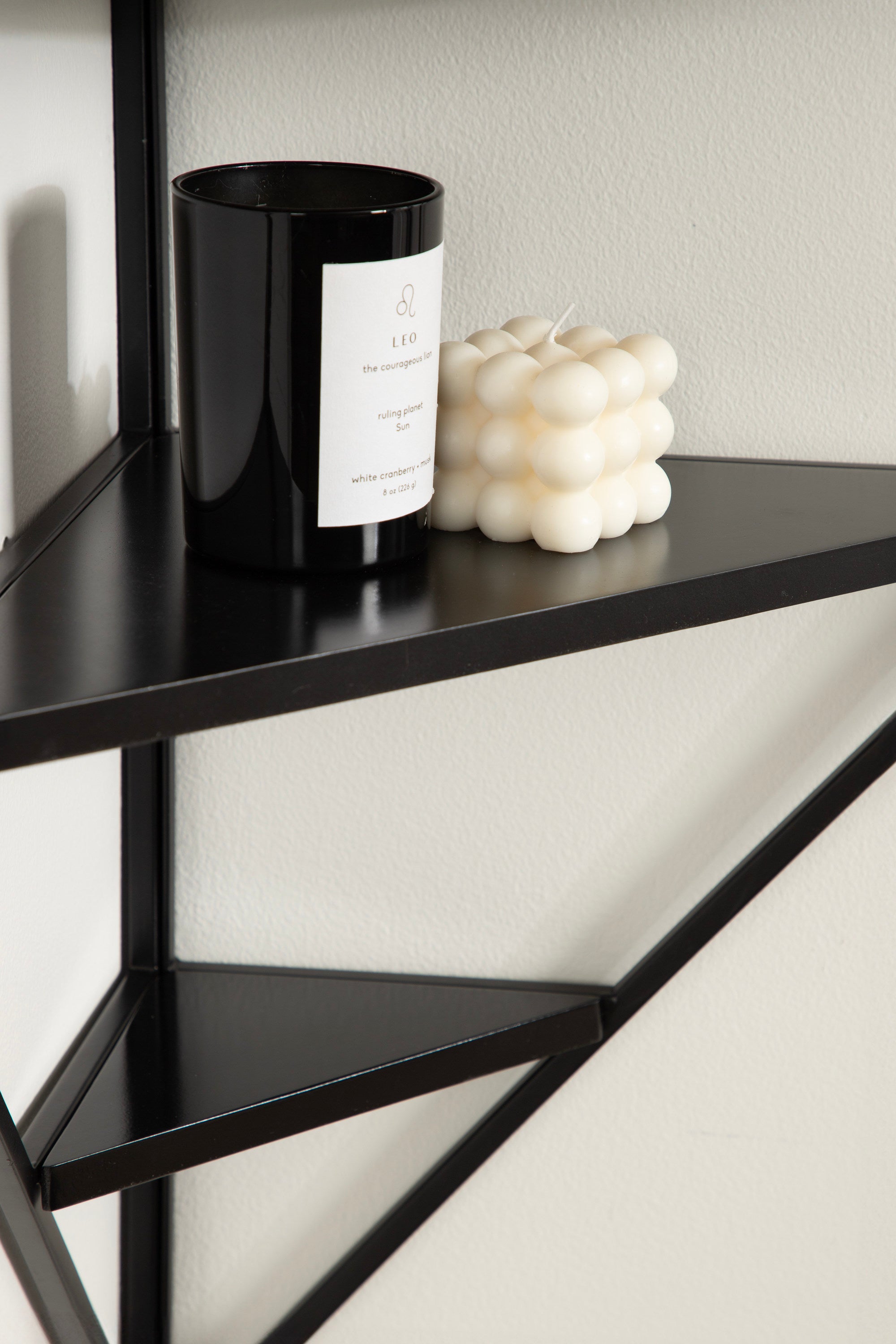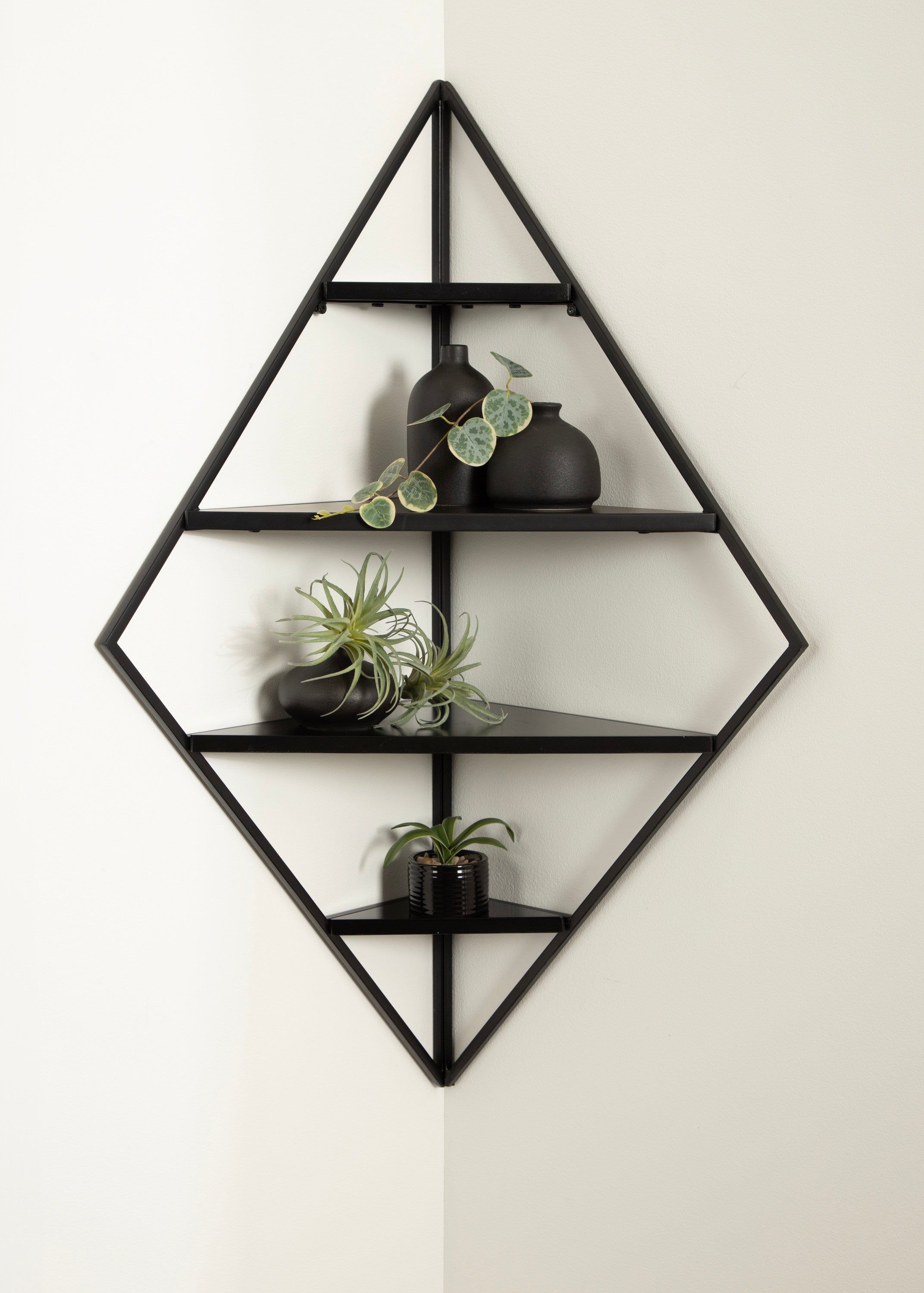 Beautiful modern design with a real artistic appeal is what makes this floating corner shelf so unique. Constructed with a sturdy metal frame and cascading wooden shelf boards, it will look great displaying a variety of decor collections including photo frames, small plants, or books. Hang it in a corner of your living room, bedroom, home office, or even your bathroom to add stylish storage to any space in your home or office. Its space-saving corner shelf design is perfect for an apartment or college dorm that needs all the storage it can get!