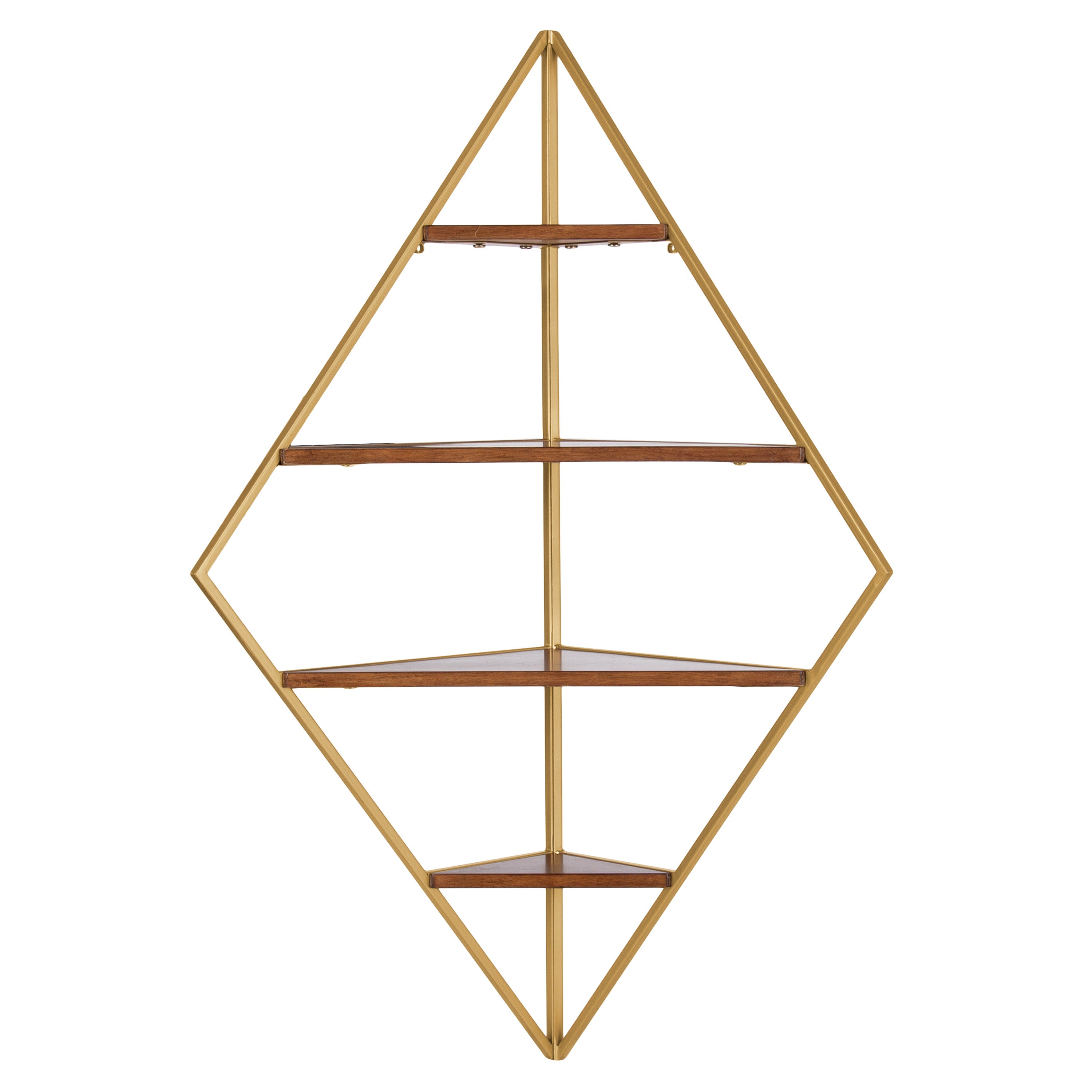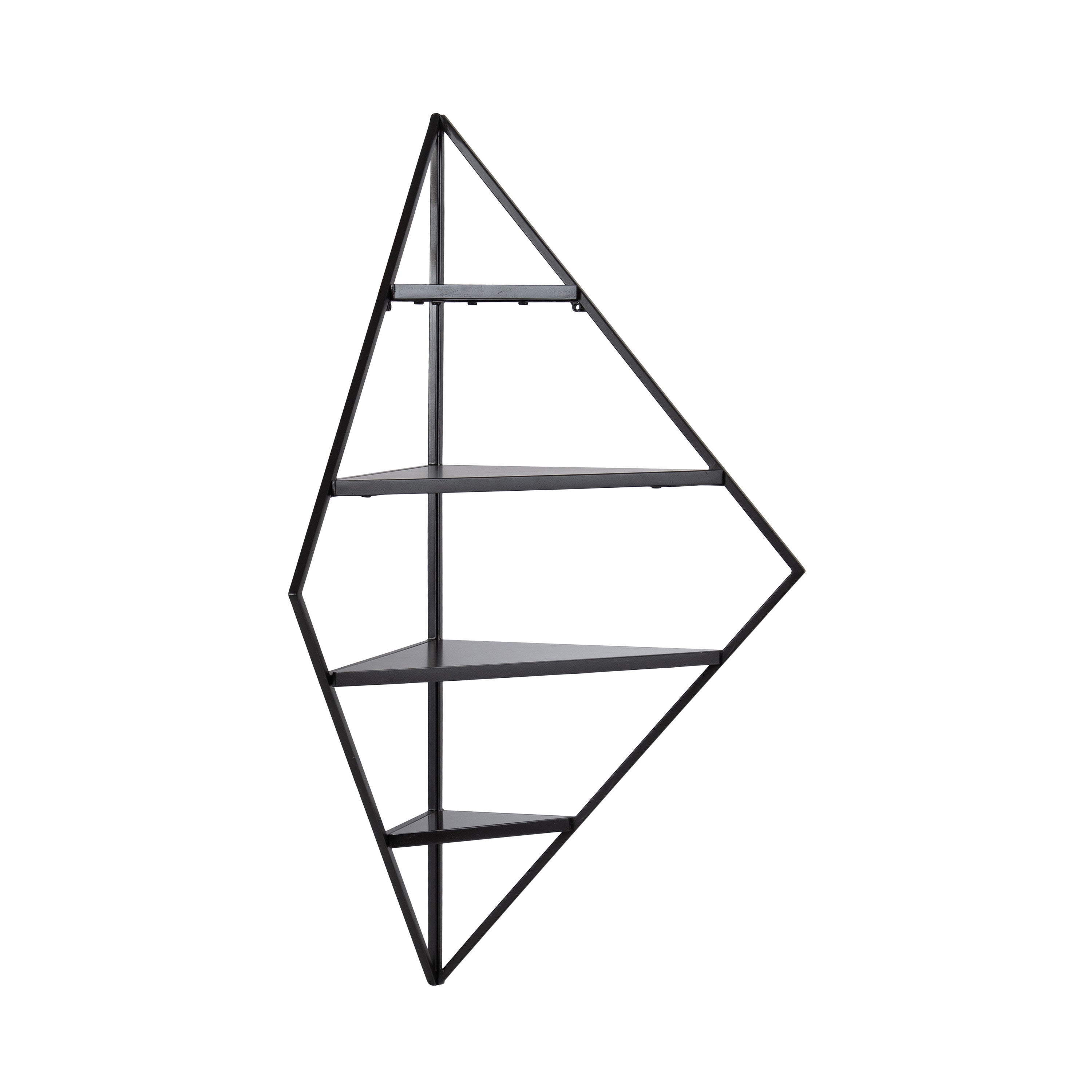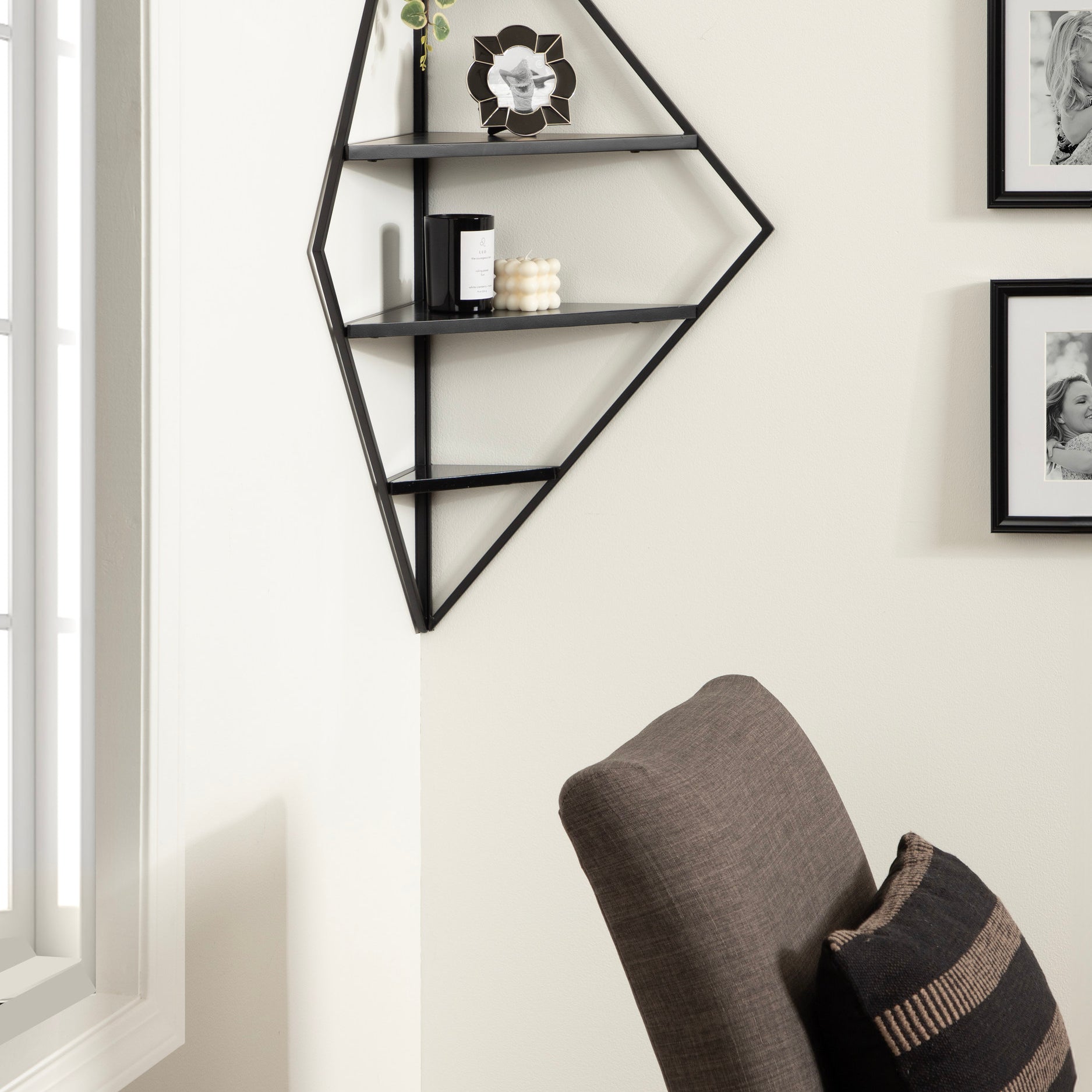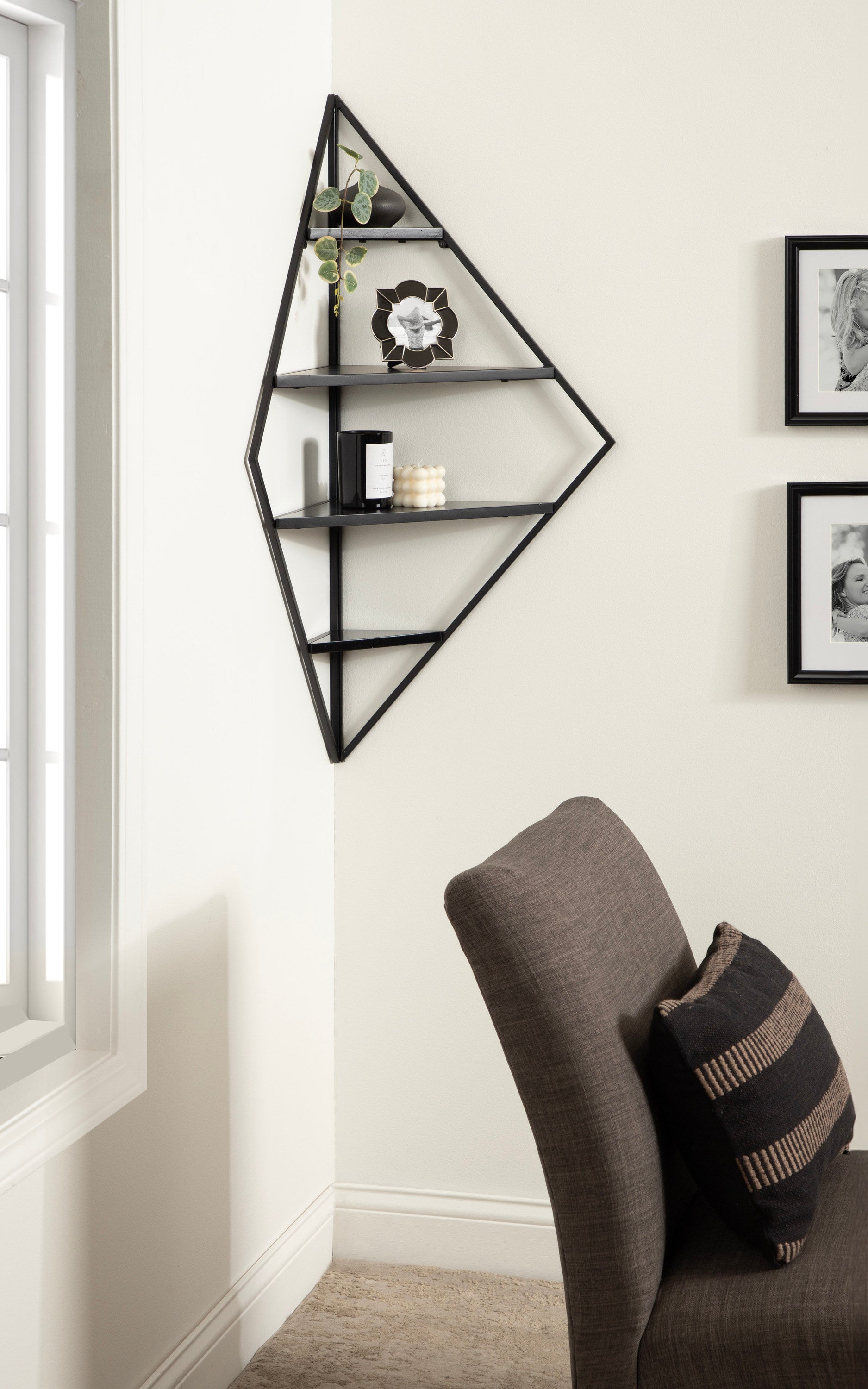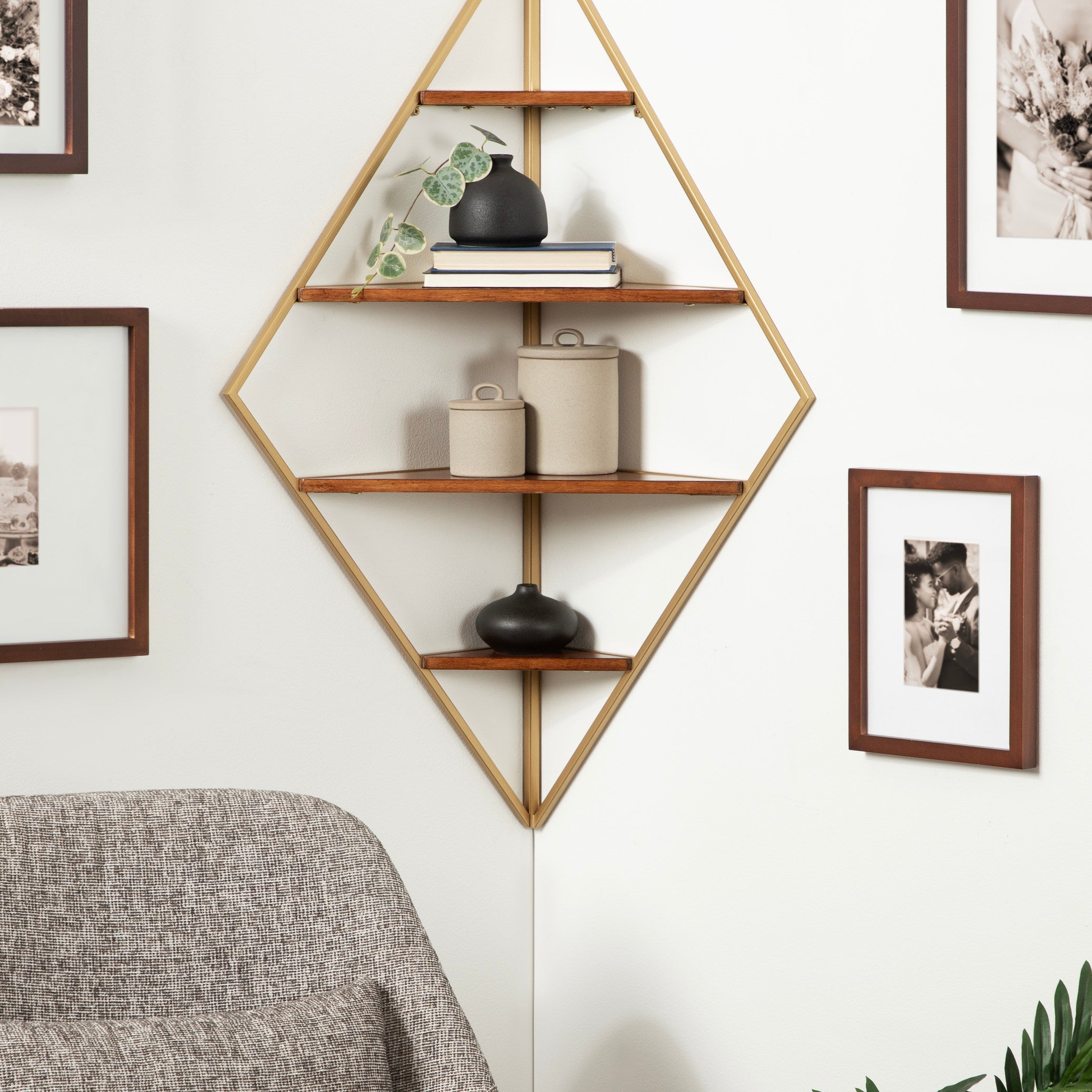 Beautiful modern design with a real artistic appeal is what makes this floating corner shelf so unique. Constructed with a sturdy metal frame and cascading wooden shelf boards, it will look great displaying a variety of decor collections including photo frames, small plants, or books. Hang it in a corner of your living room, bedroom, home office, or even your bathroom to add stylish storage to any space in your home or office. Its space-saving corner shelf design is perfect for an apartment or college dorm that needs all the storage it can get!