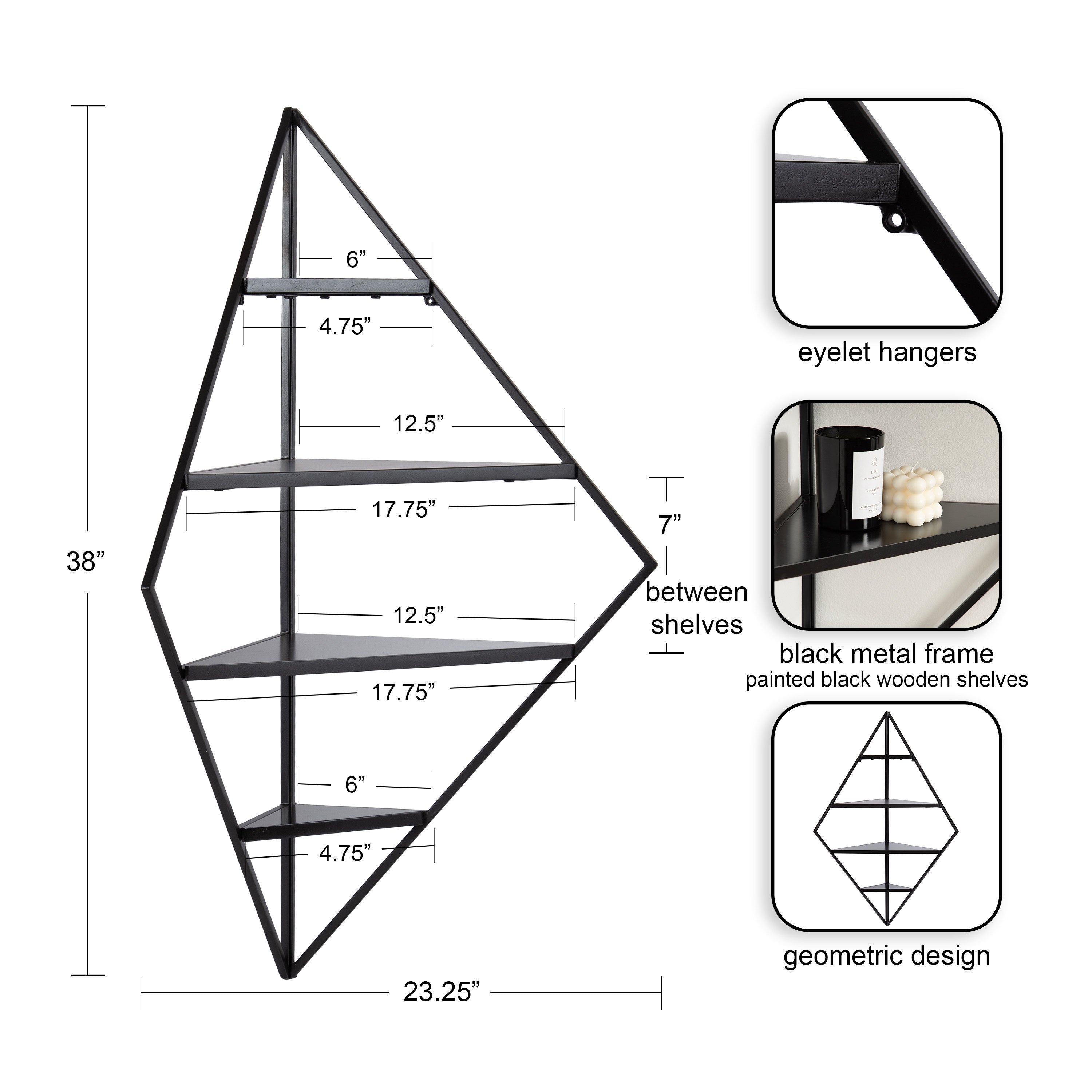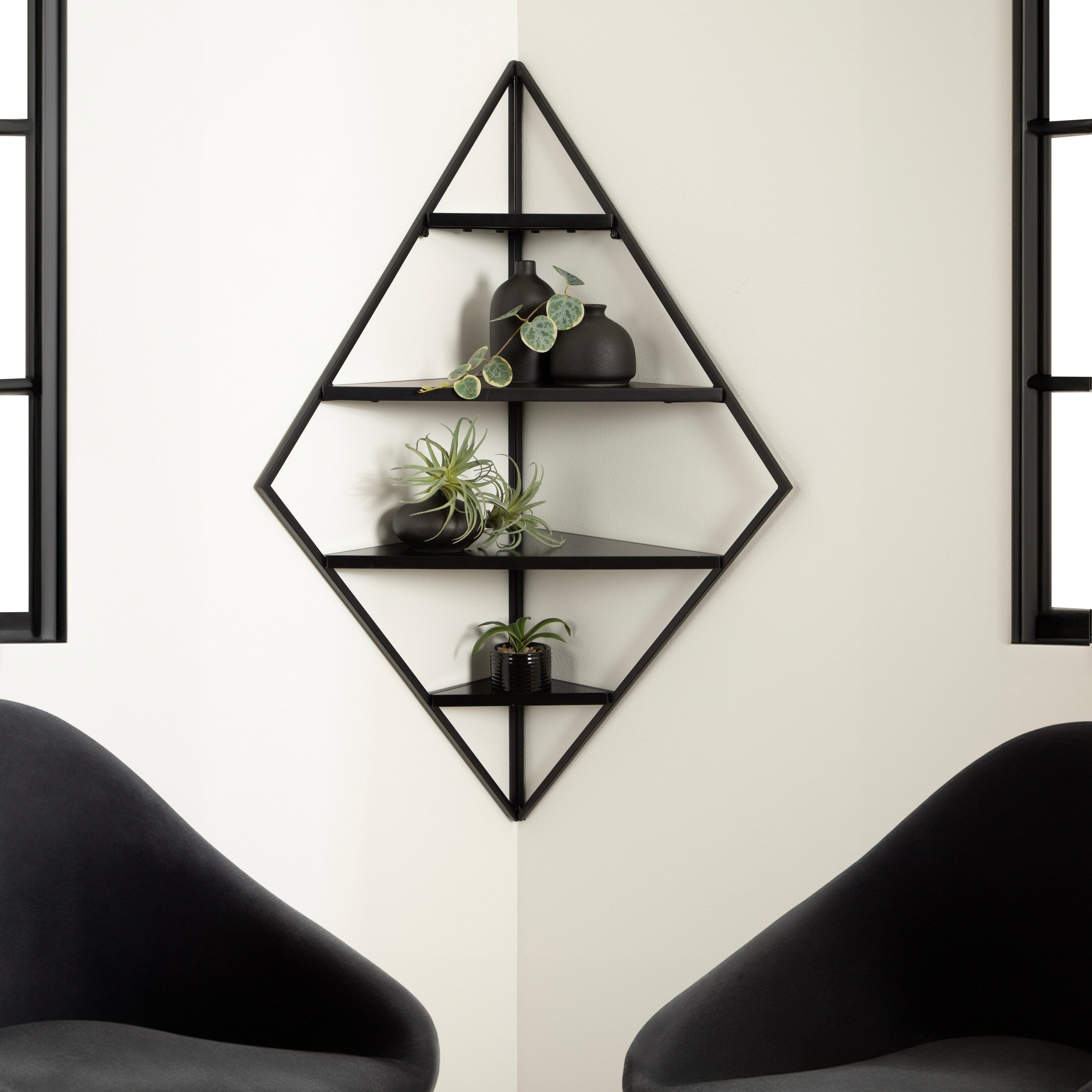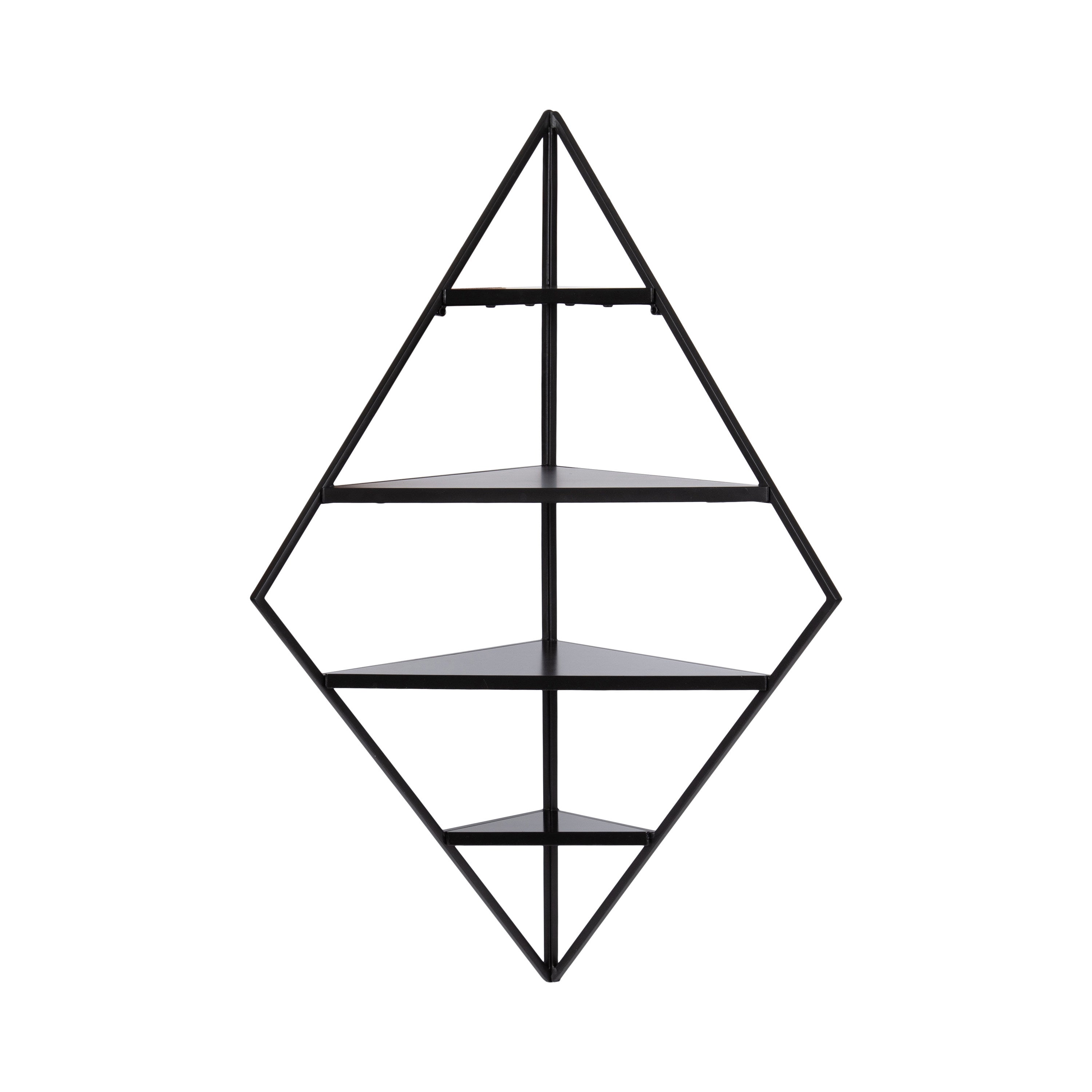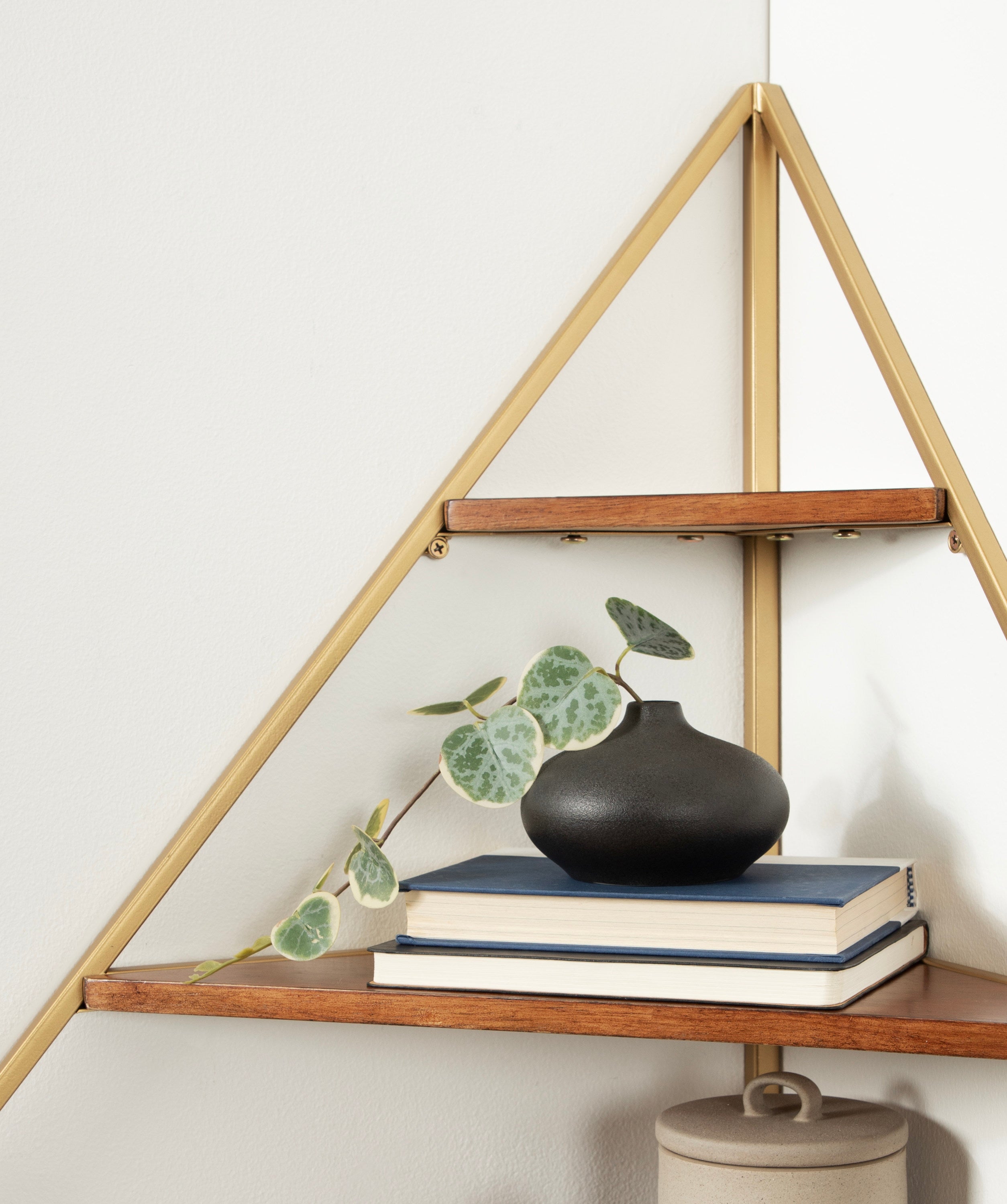 Beautiful modern design with a real artistic appeal is what makes this floating corner shelf so unique. Constructed with a sturdy metal frame and cascading wooden shelf boards, it will look great displaying a variety of decor collections including photo frames, small plants, or books. Hang it in a corner of your living room, bedroom, home office, or even your bathroom to add stylish storage to any space in your home or office. Its space-saving corner shelf design is perfect for an apartment or college dorm that needs all the storage it can get!