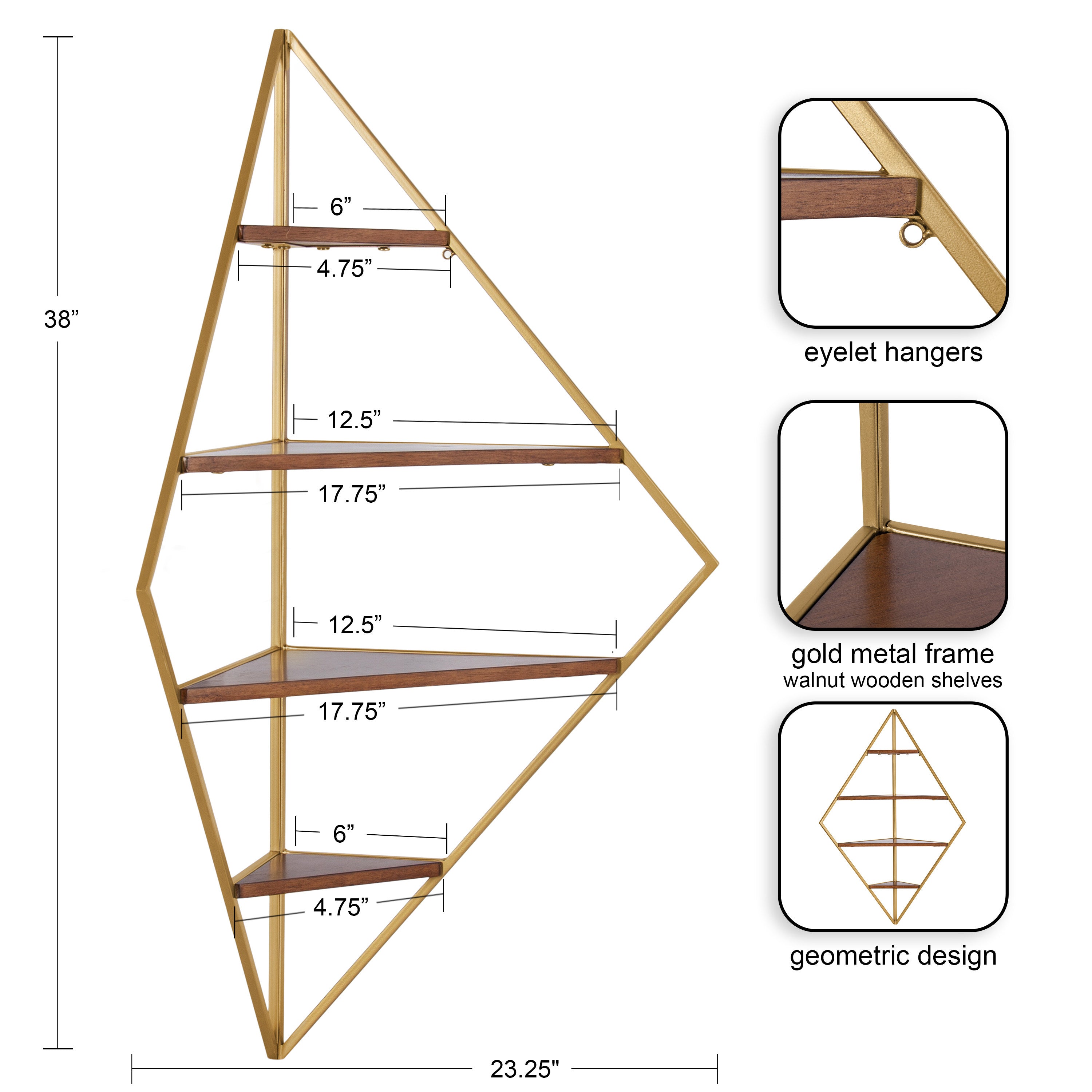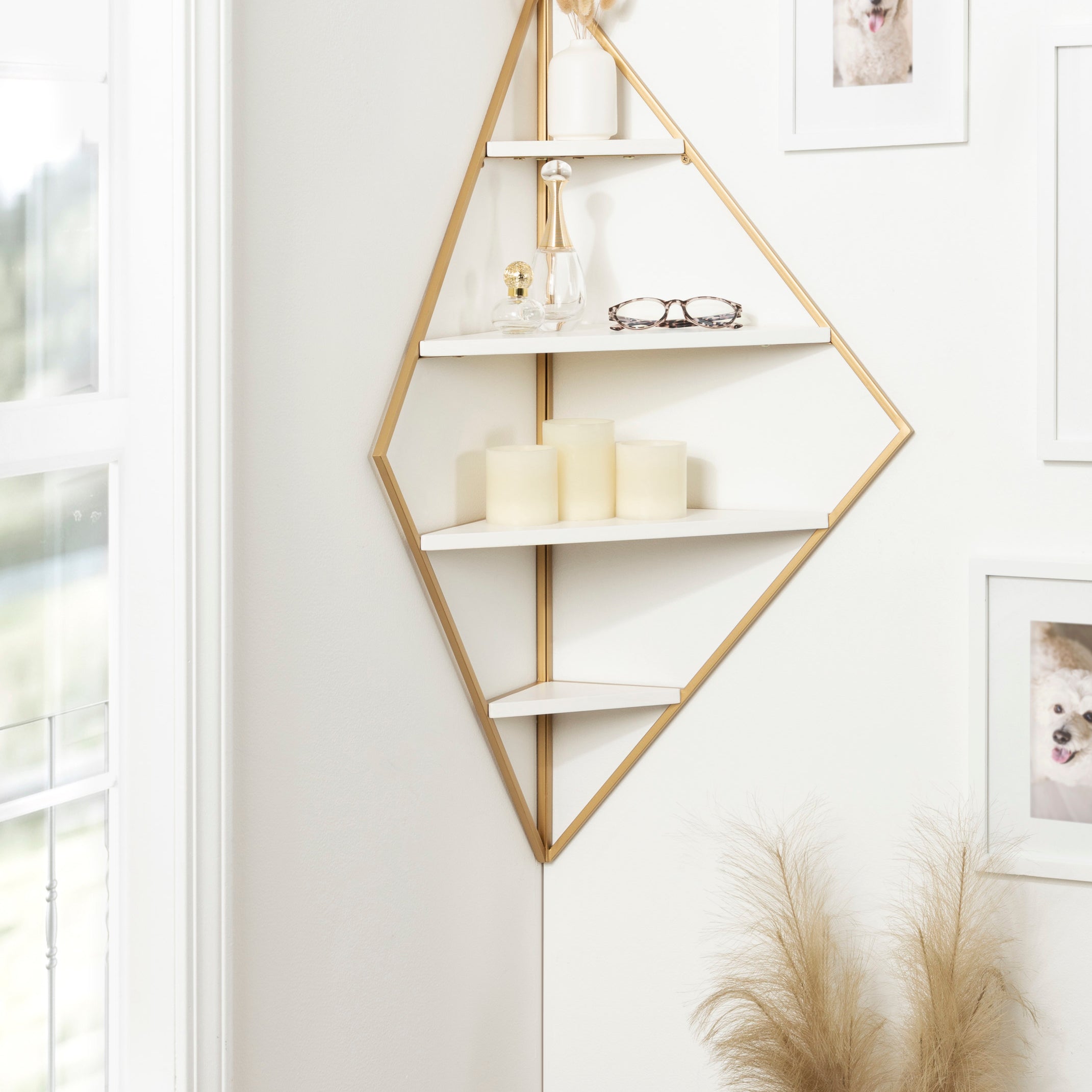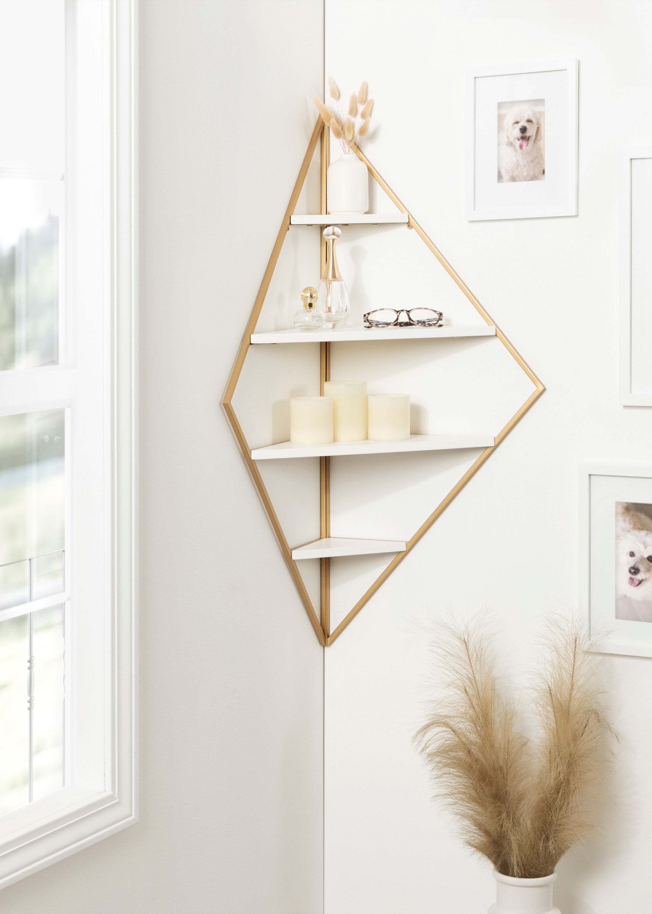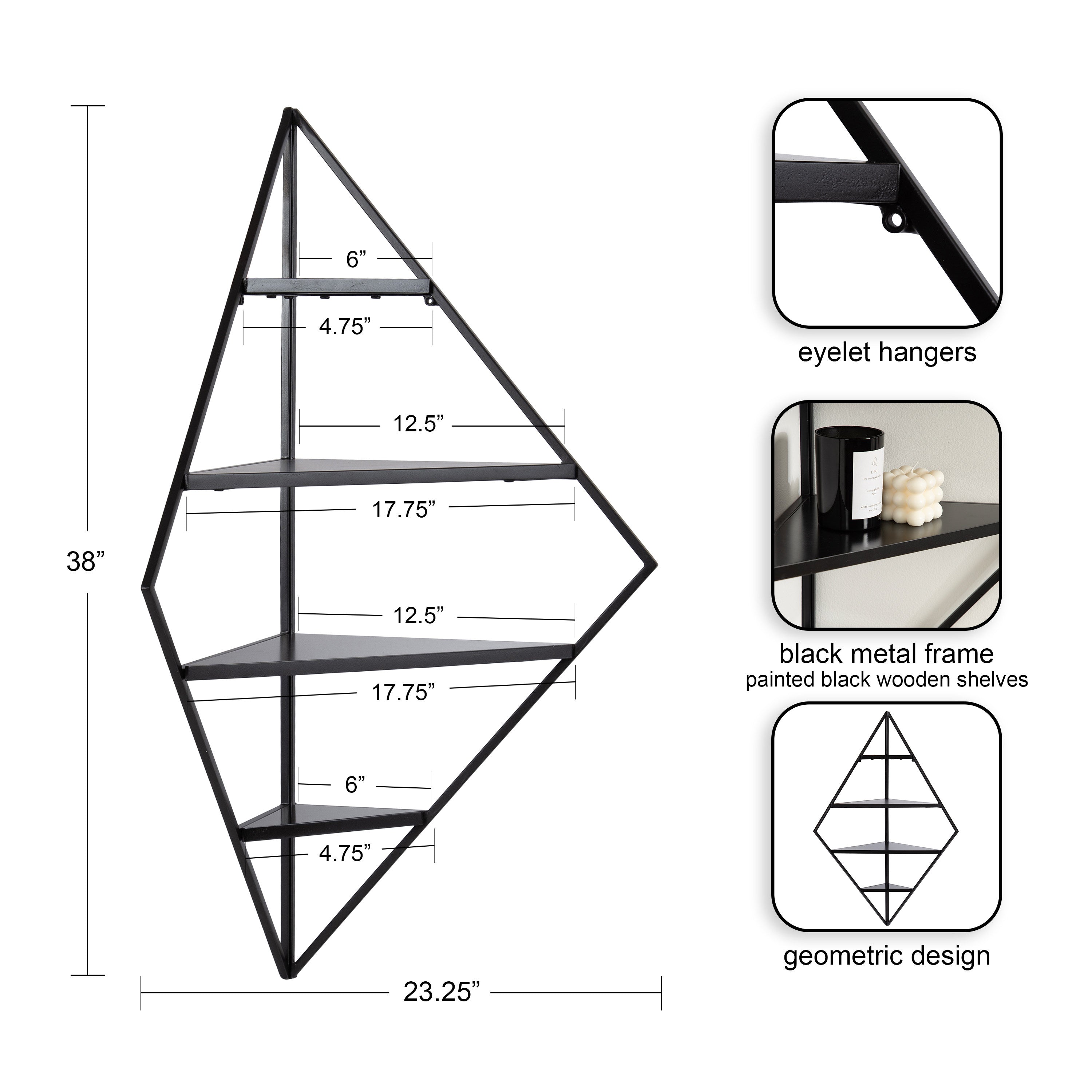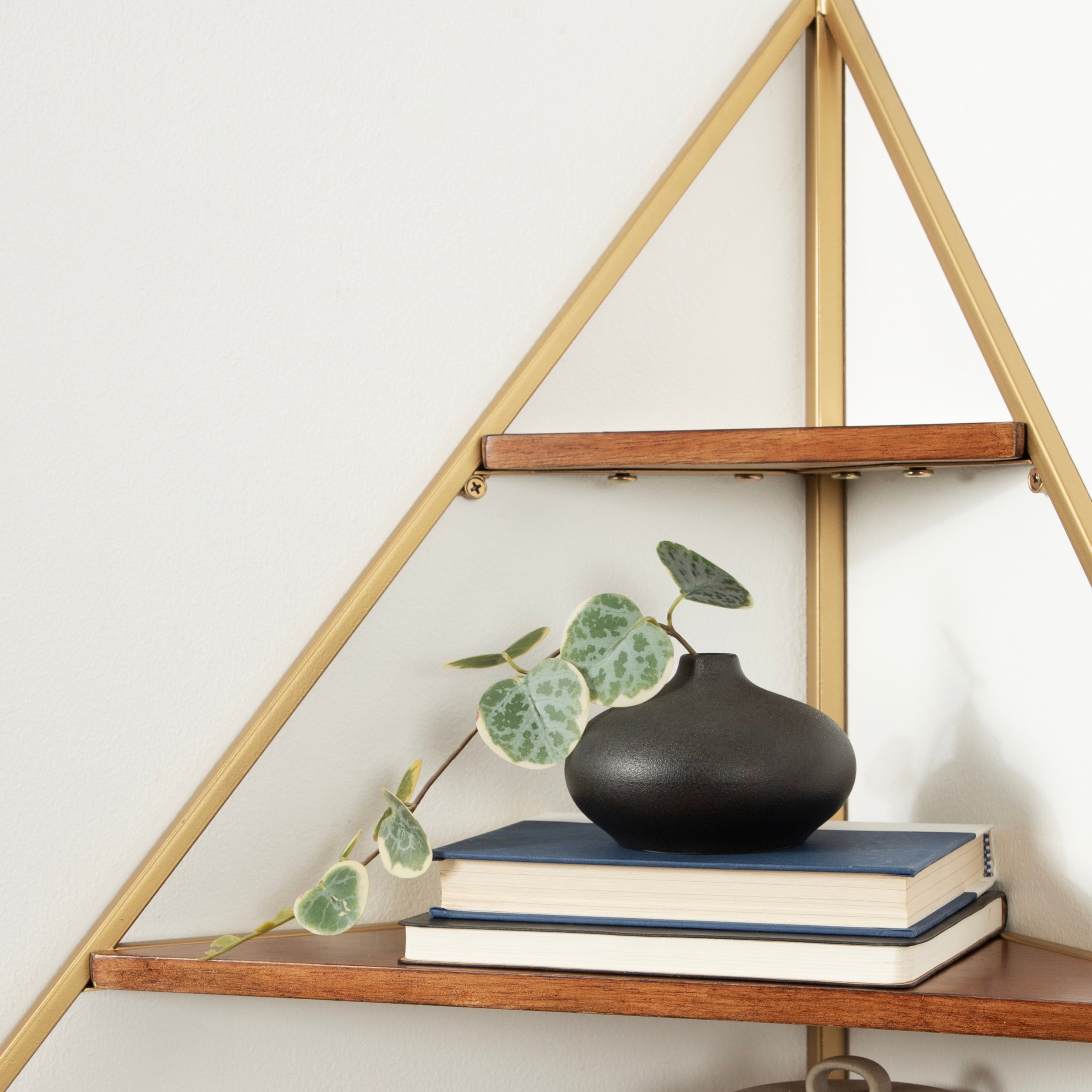 Beautiful modern design with a real artistic appeal is what makes this floating corner shelf so unique. Constructed with a sturdy metal frame and cascading wooden shelf boards, it will look great displaying a variety of decor collections including photo frames, small plants, or books. Hang it in a corner of your living room, bedroom, home office, or even your bathroom to add stylish storage to any space in your home or office. Its space-saving corner shelf design is perfect for an apartment or college dorm that needs all the storage it can get!