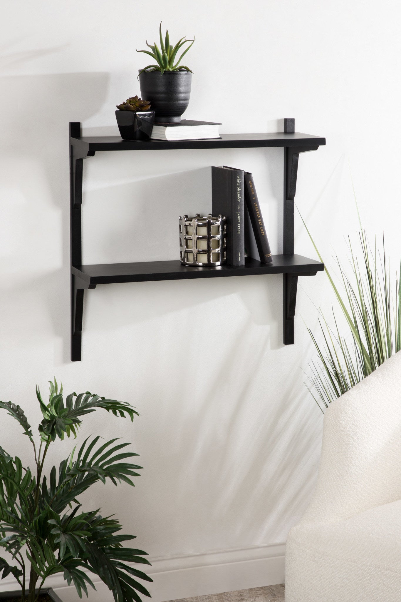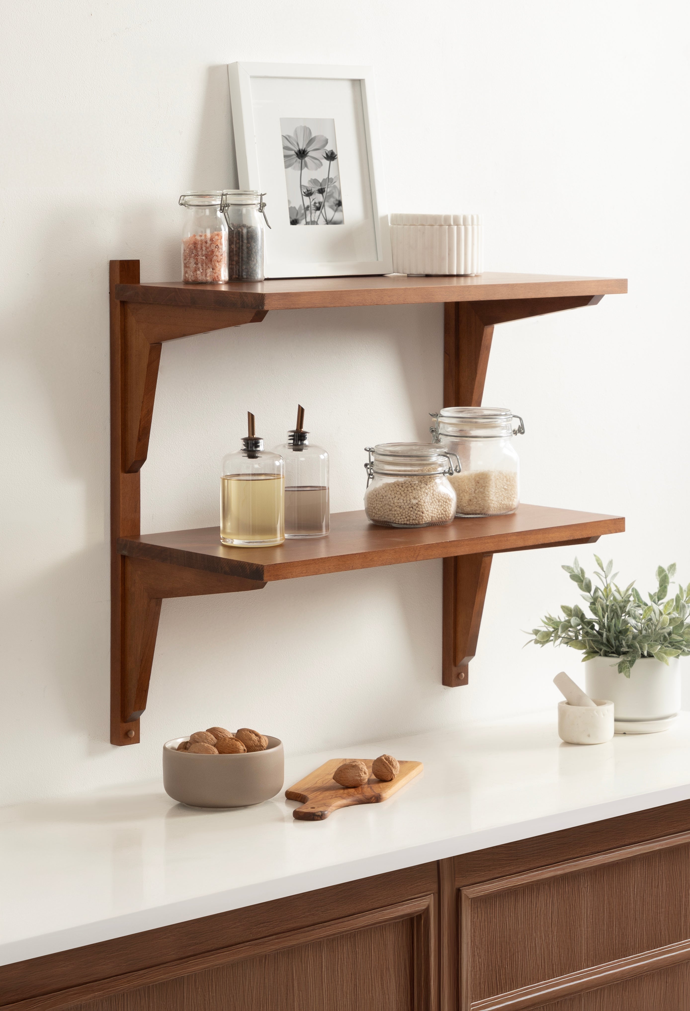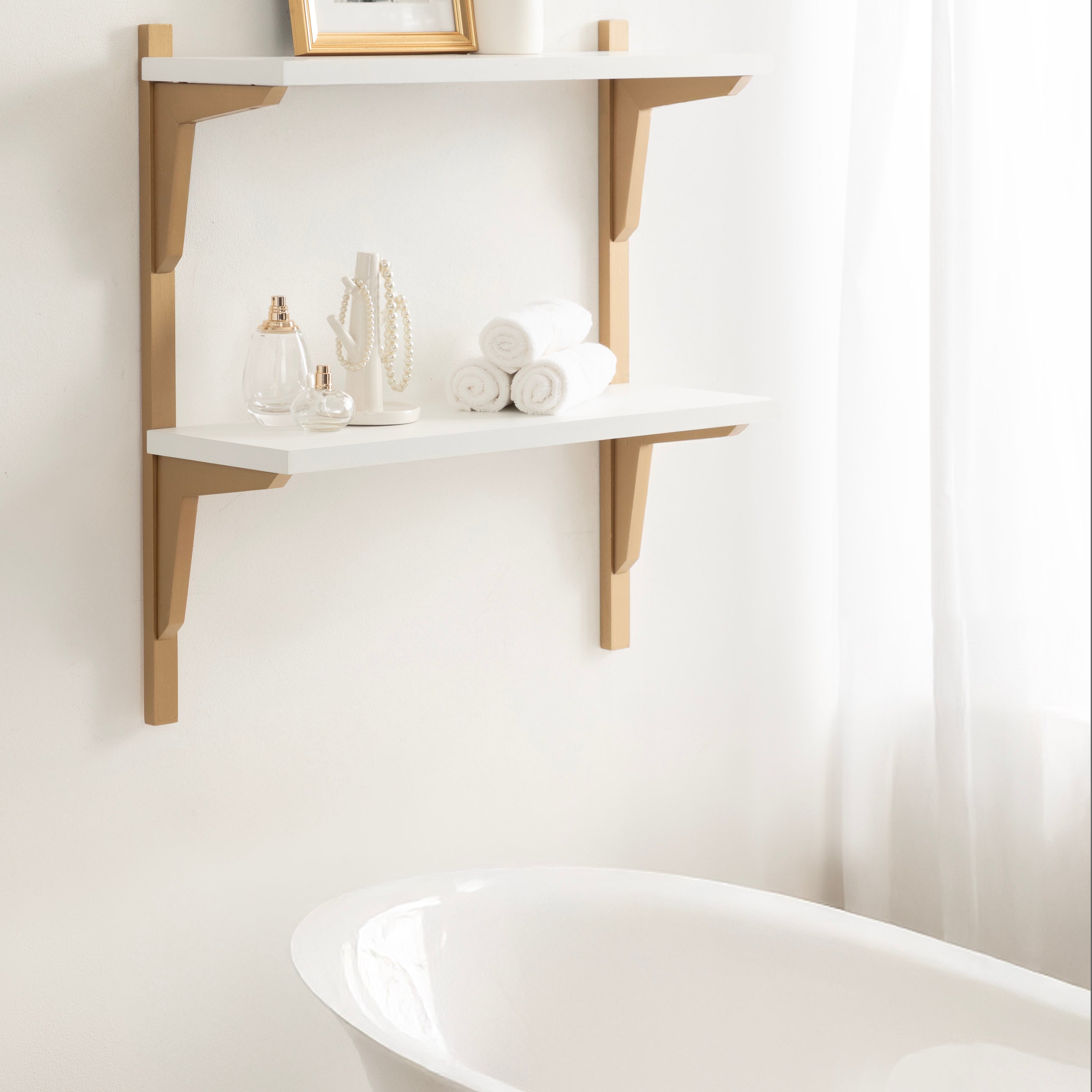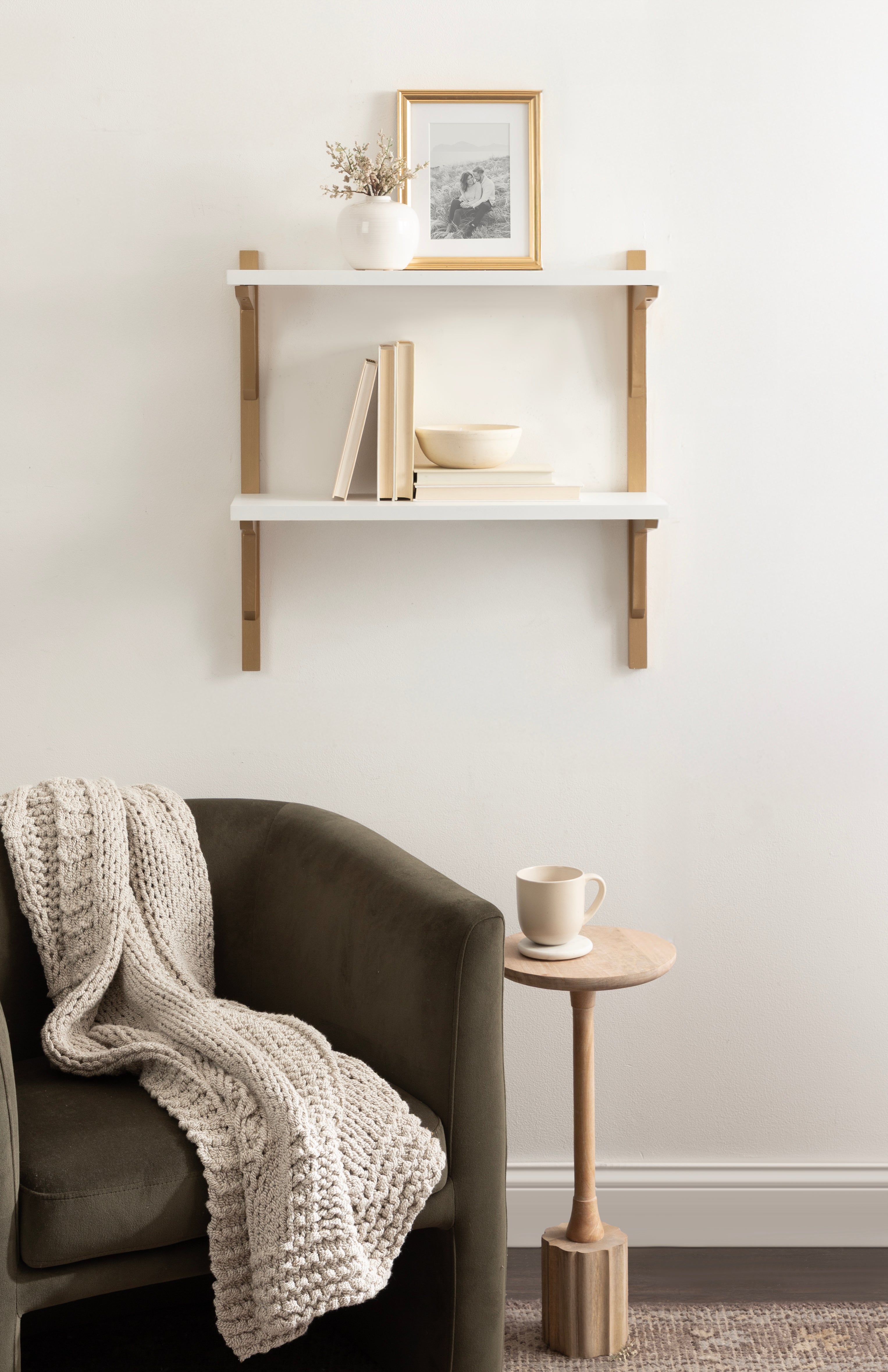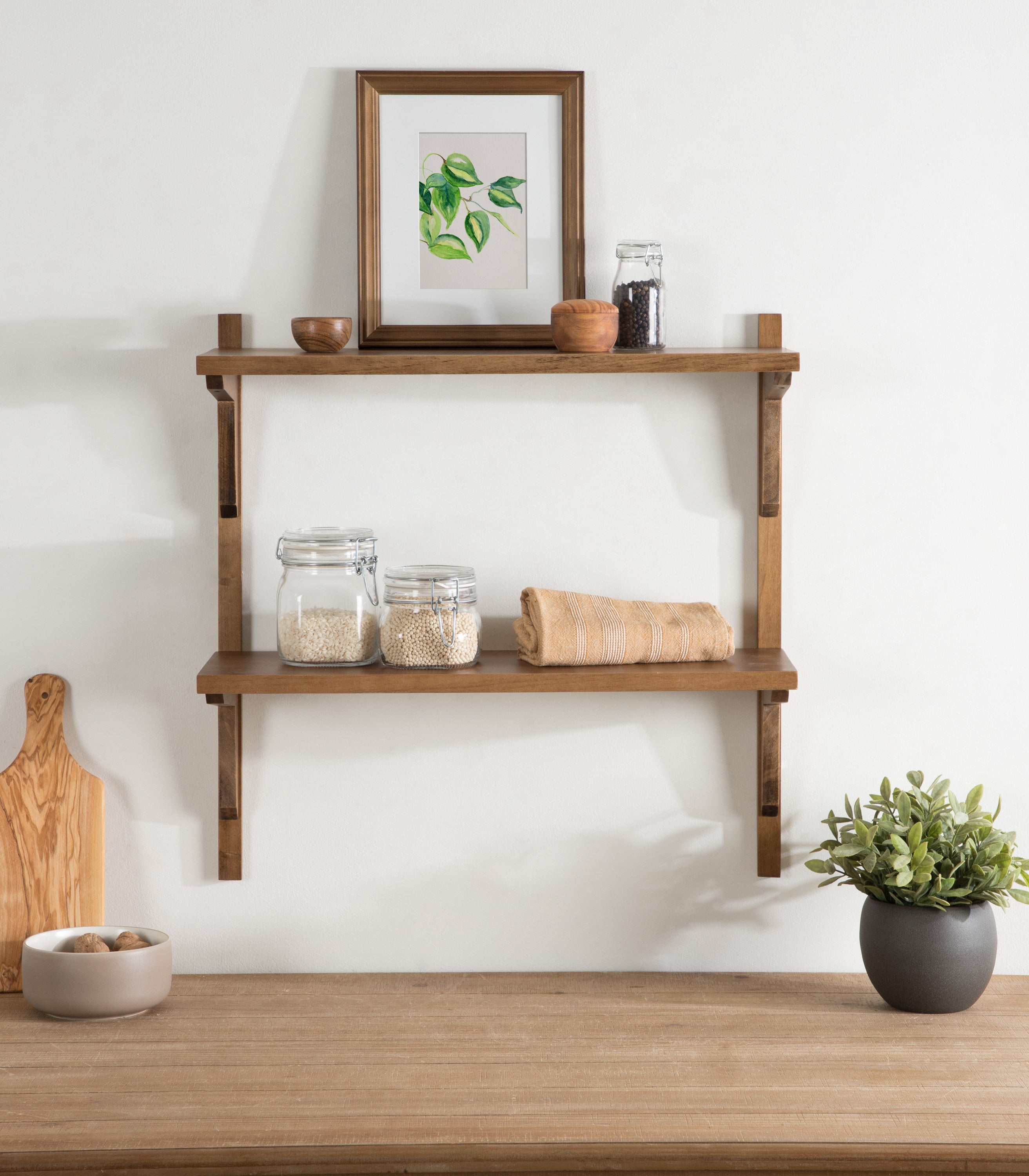 Add classic style to your home with the Meridian shelf. The transitional-yet-modern design features two tiers within brackets, giving you a refined, minimal quality. The sleek finish gives it a transitional look that makes it blend seamlessly into any entryway, living room, dining room, bedroom, bathroom, or kitchen decor. Use it to display your favorite small plants, keepsakes, and photos, or use it as a kitchen spice rack and baking shelf.