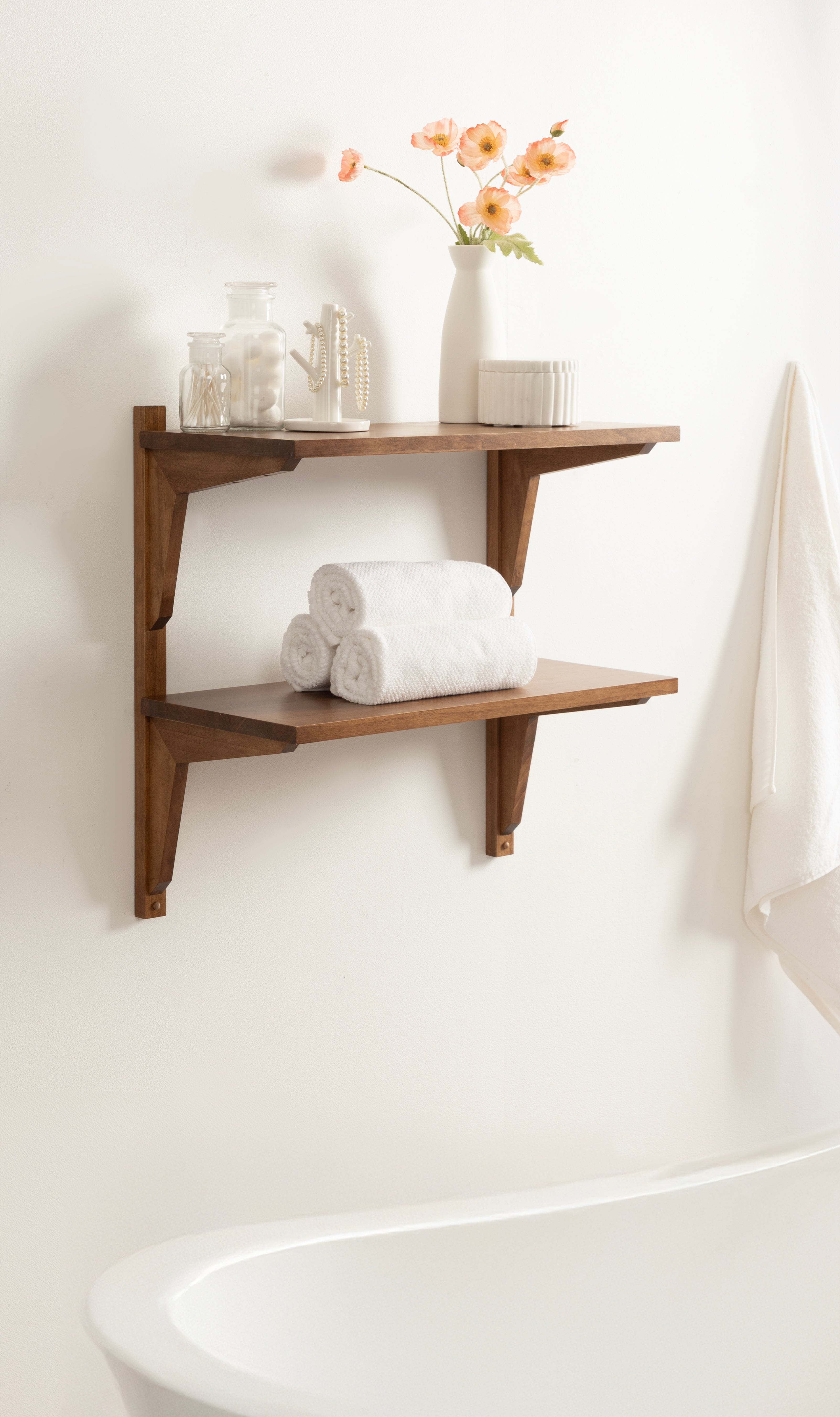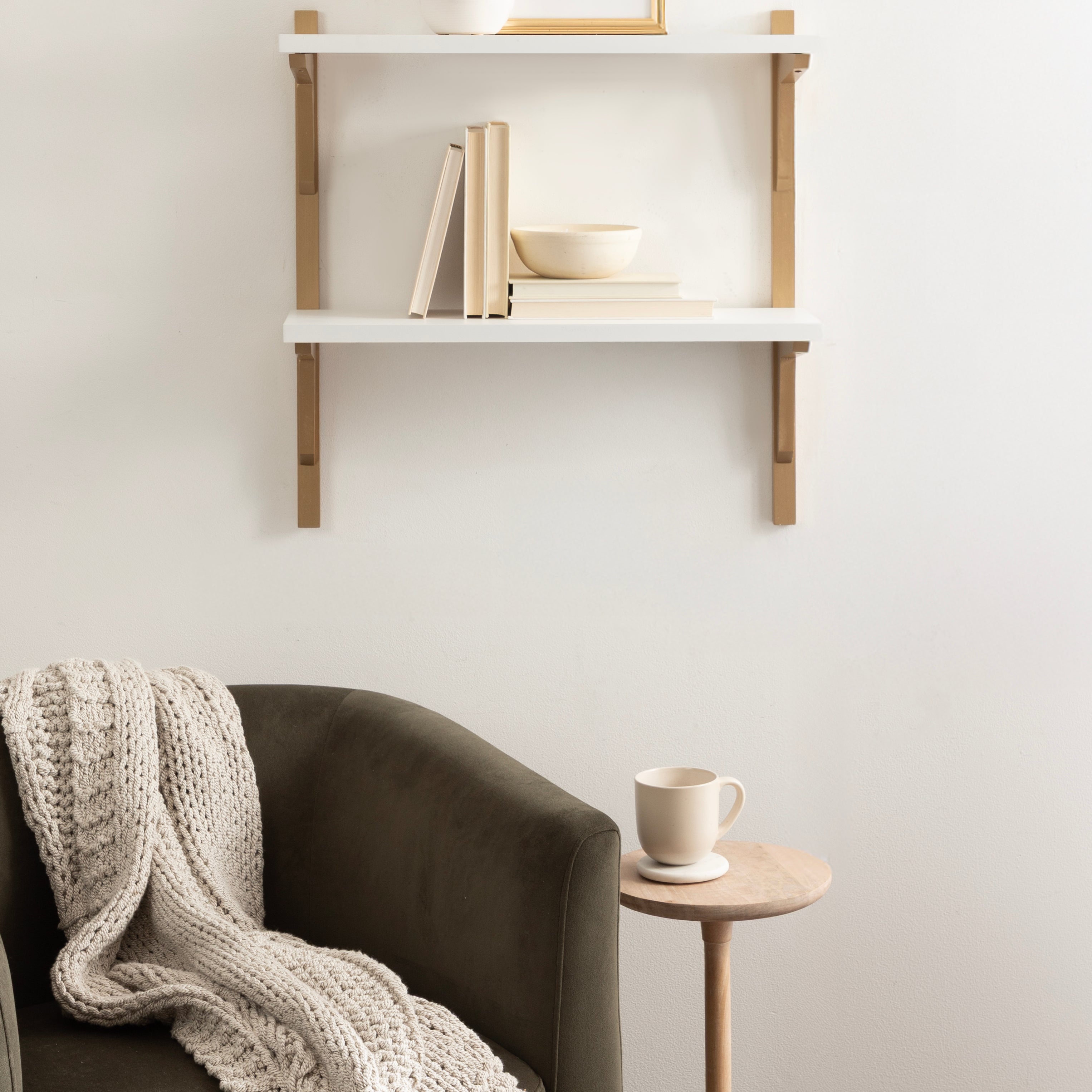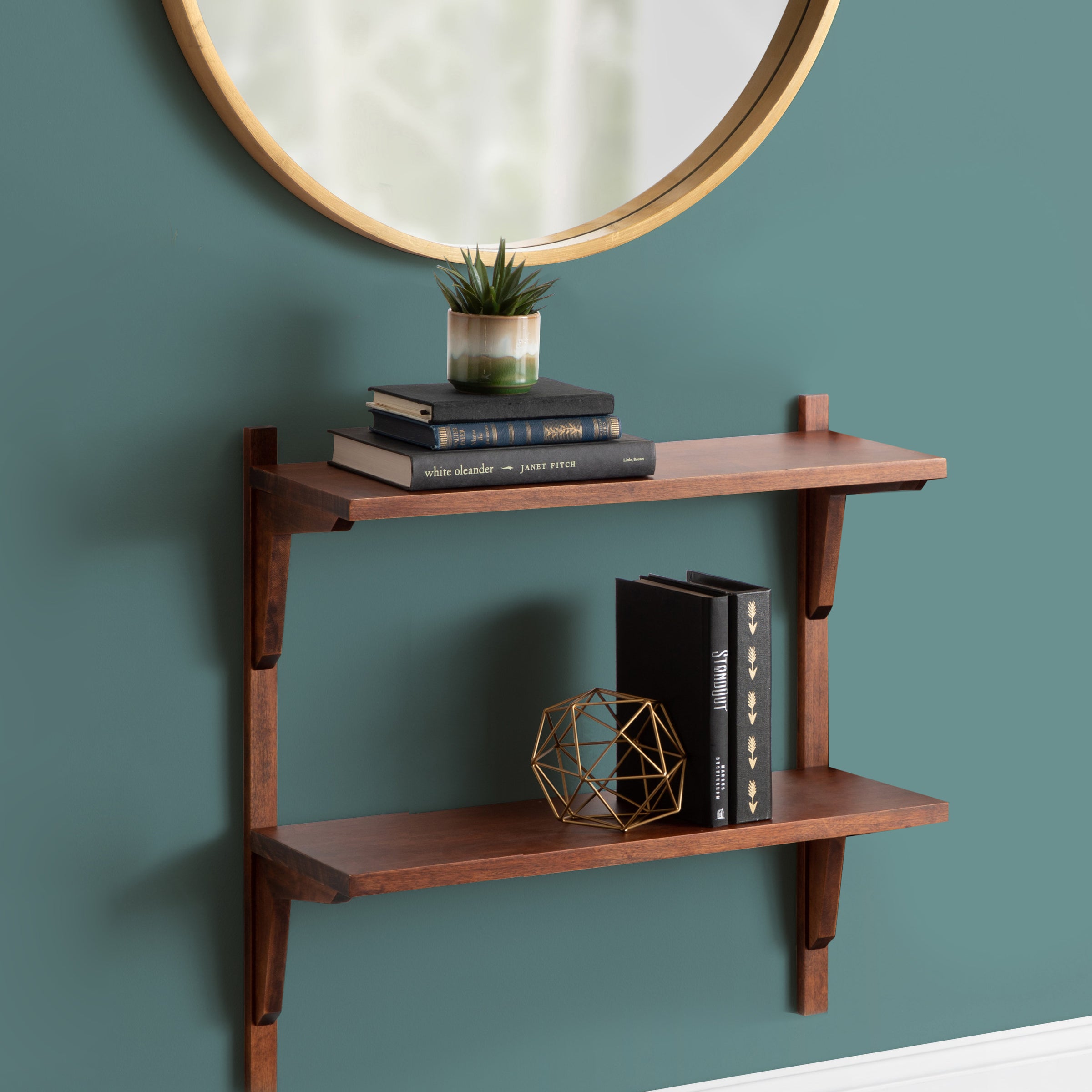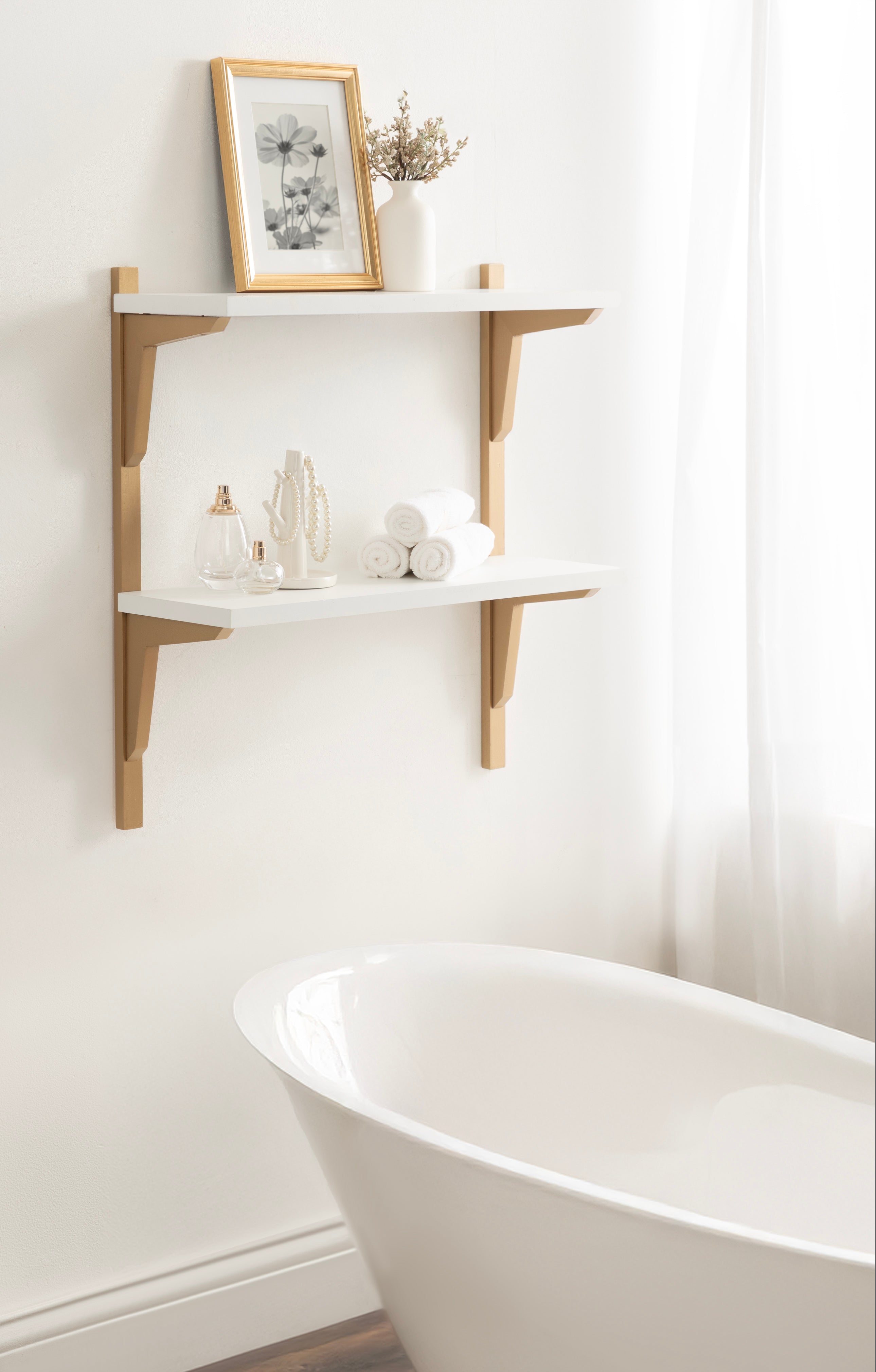 Add classic style to your home with the Meridian shelf. The transitional-yet-modern design features two tiers within brackets, giving you a refined, minimal quality. The sleek finish gives it a transitional look that makes it blend seamlessly into any entryway, living room, dining room, bedroom, bathroom, or kitchen decor. Use it to display your favorite small plants, keepsakes, and photos, or use it as a kitchen spice rack and baking shelf.