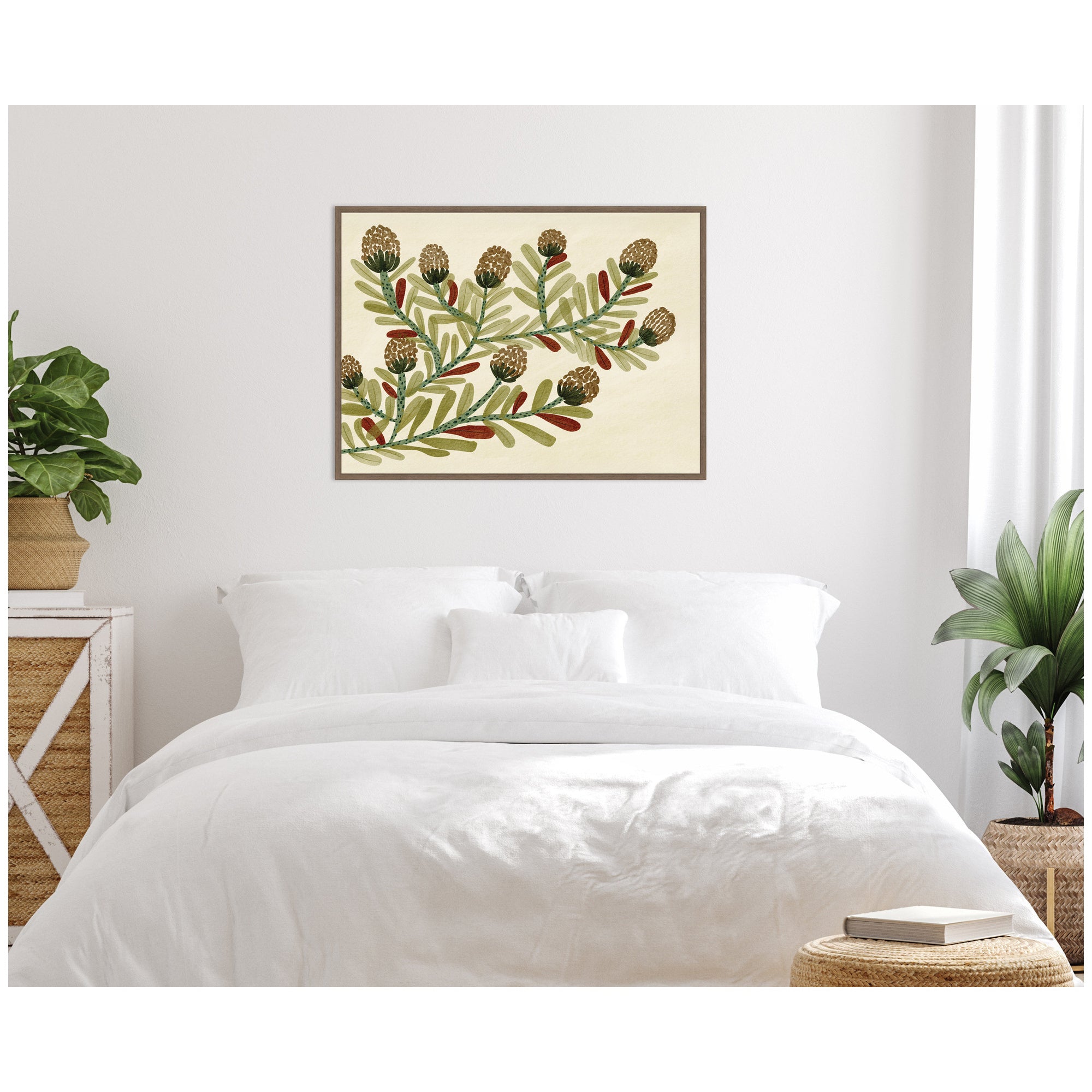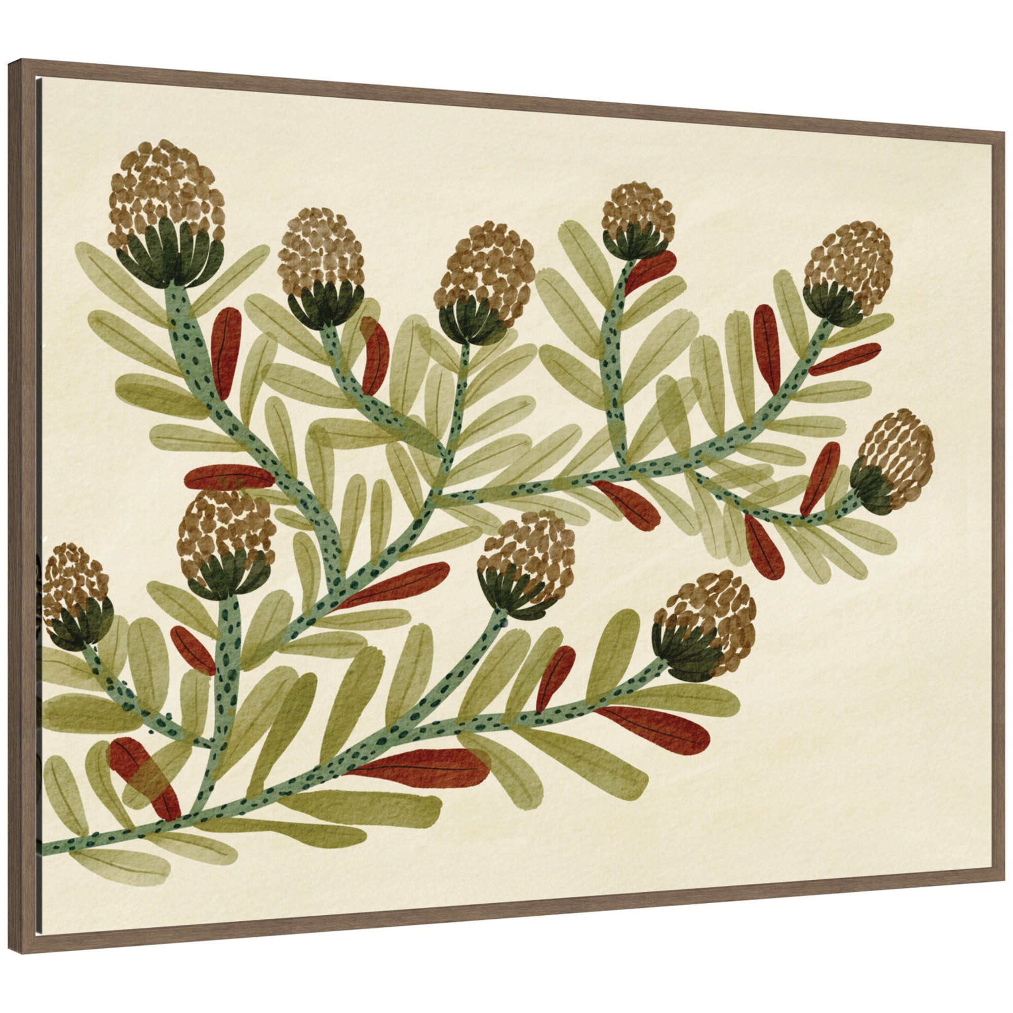 • Gallery Quality Art: Measuring 38 x 28 inches, this is beautifully presented in Sylvie Walnut frame - a modern, float frame with walnut woodgrain coloring and dramatic depth.. Expressive Wall Art Story:The artwork presents a detailed illustration of delicate branches adorned with green leaves and brown cones, set against a soft, cream-colored background. The leaves and cones are depicted with intricate watercolor textures, offering an earthy and serene feel. The composition highlights the natural beauty and simplicity of botanical elements.