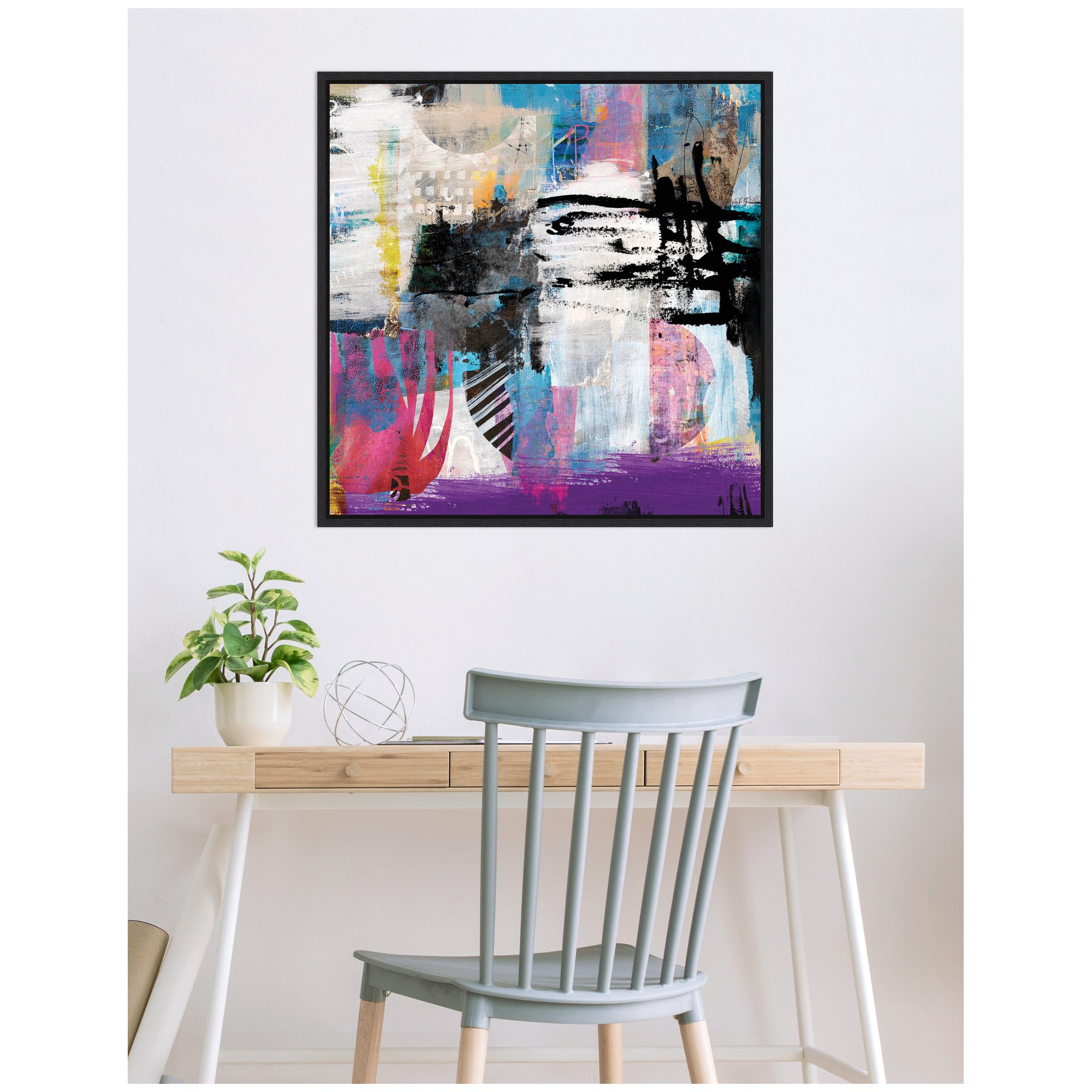 • Gallery Quality Art: Measuring 30 x 30 inches, this is beautifully presented in Sylvie Black frame - a modern, black float frame with woodgrain textured surfaces and dramatic depth.. Expressive Wall Art Story:The artwork features a dynamic composition of overlapping textures and bold colors, blending elements of blue, pink, black, and white. Thick brushstrokes and layered patterns create a sense of movement and energy. The abstract nature invites viewers to explore the complexity and depth of the piece.