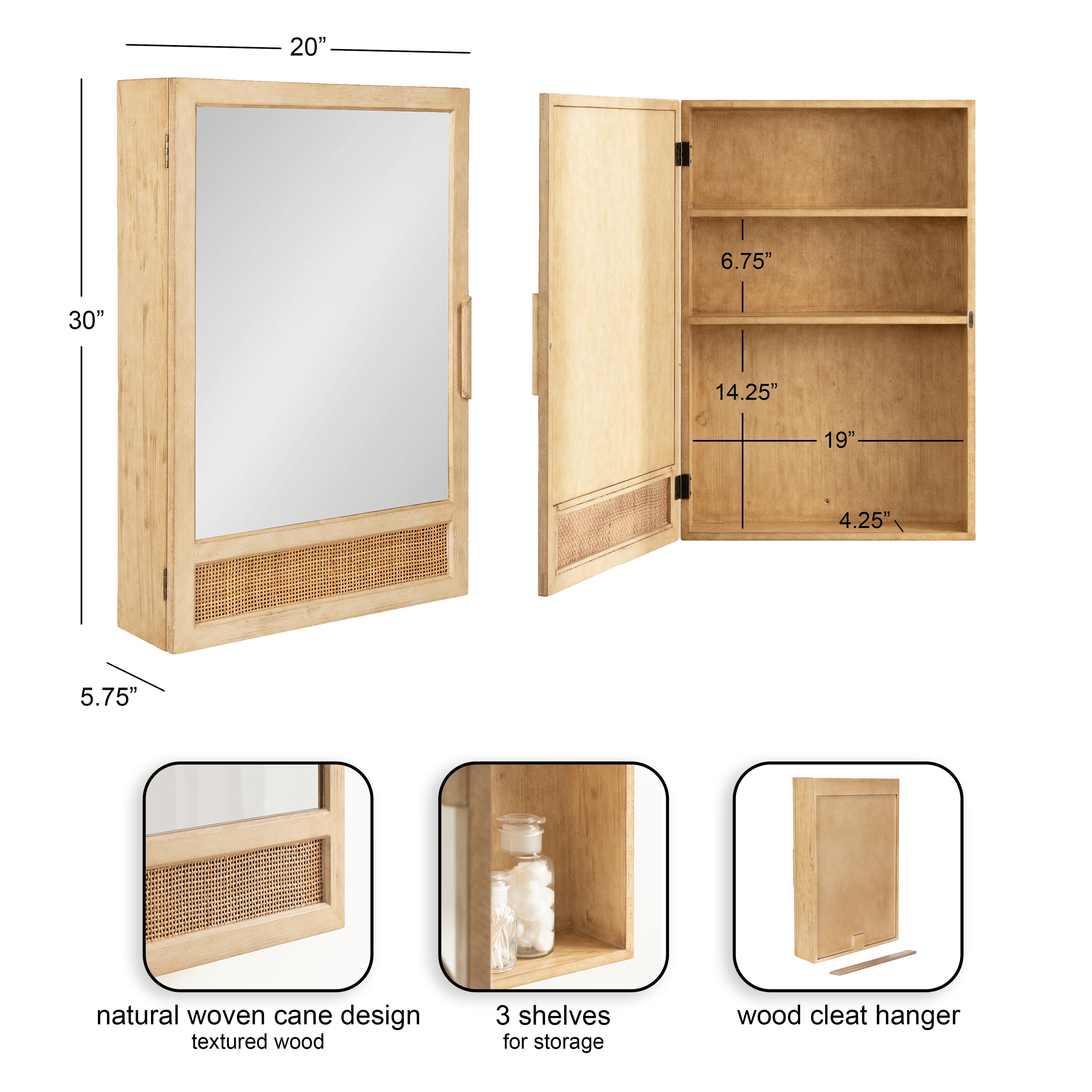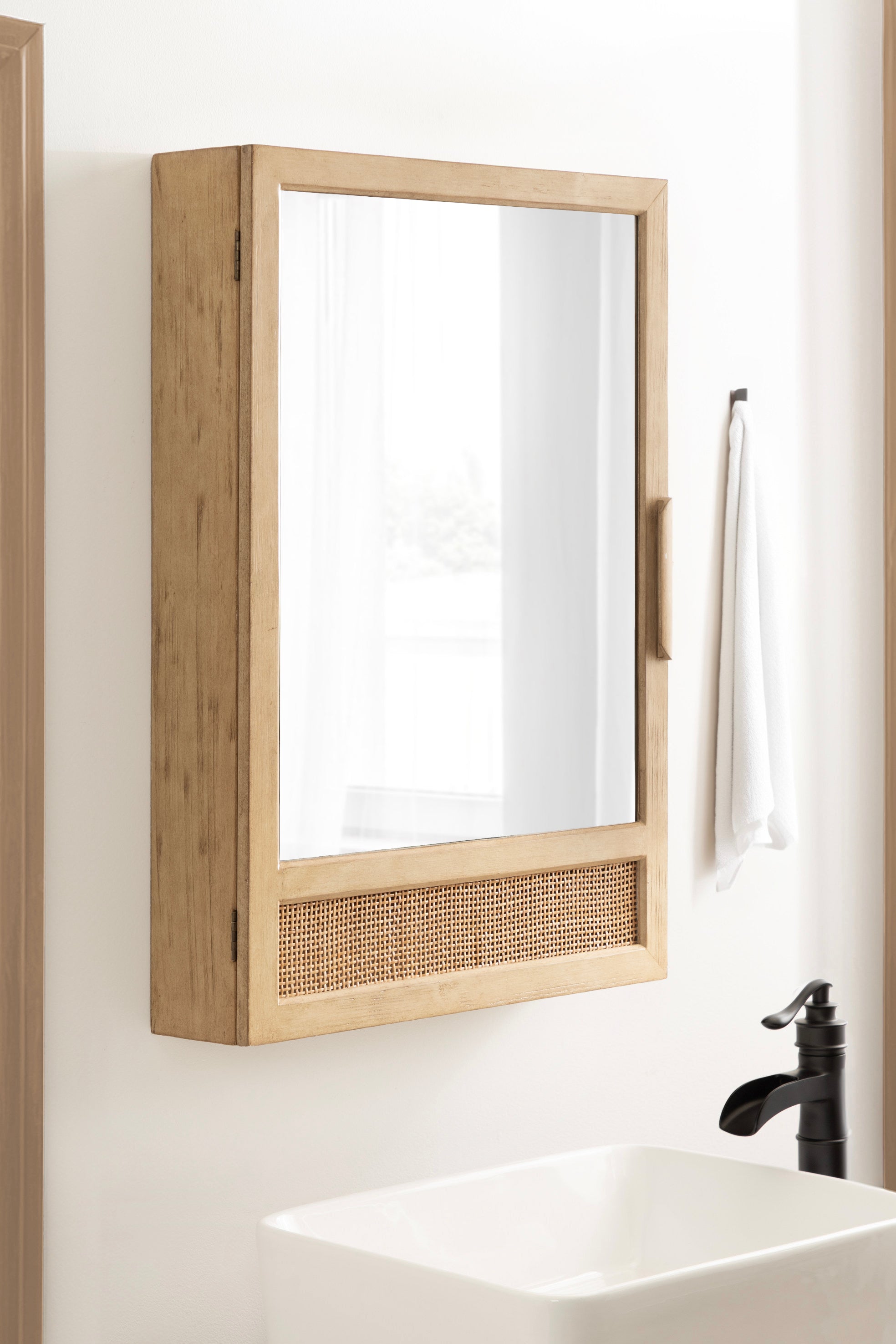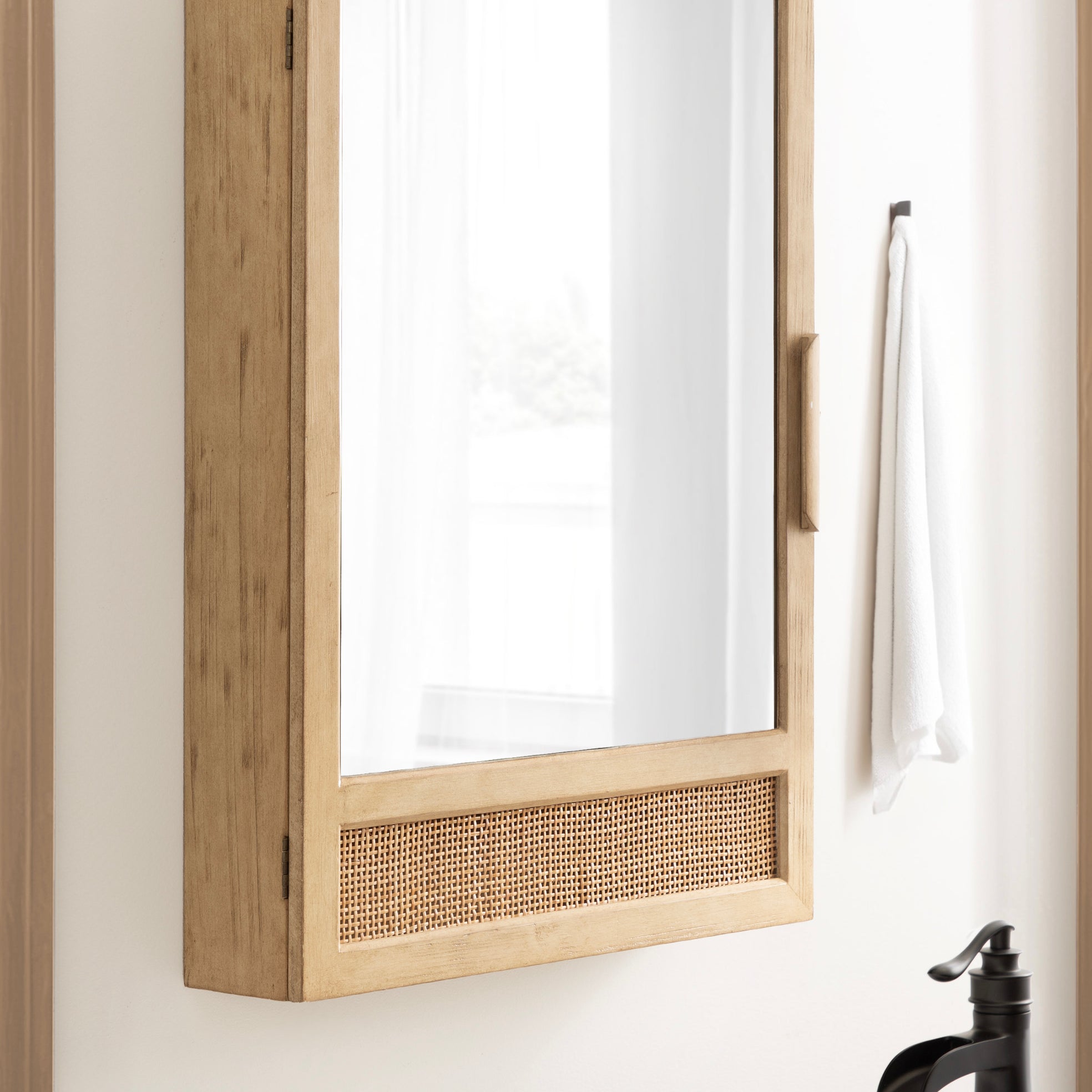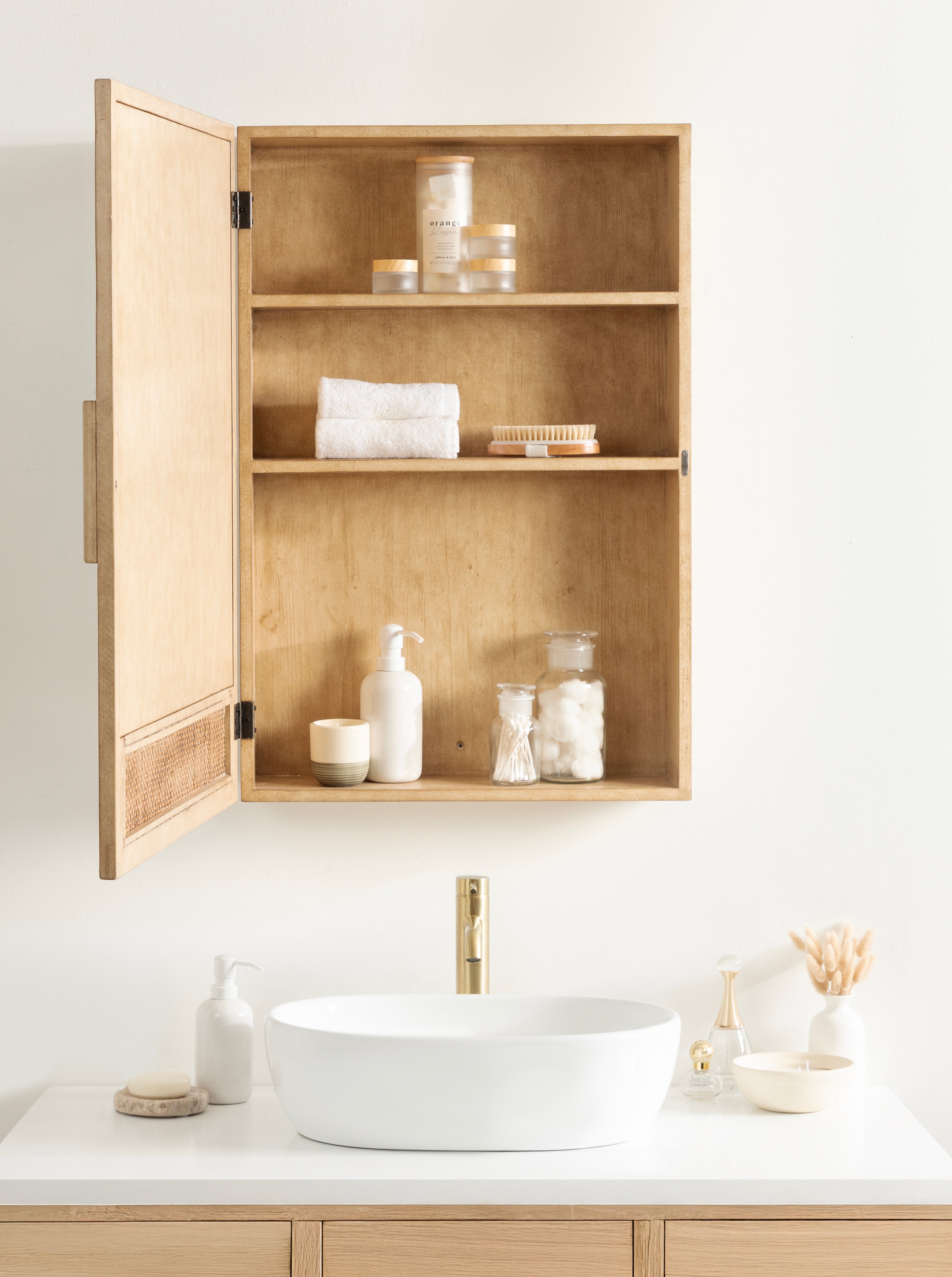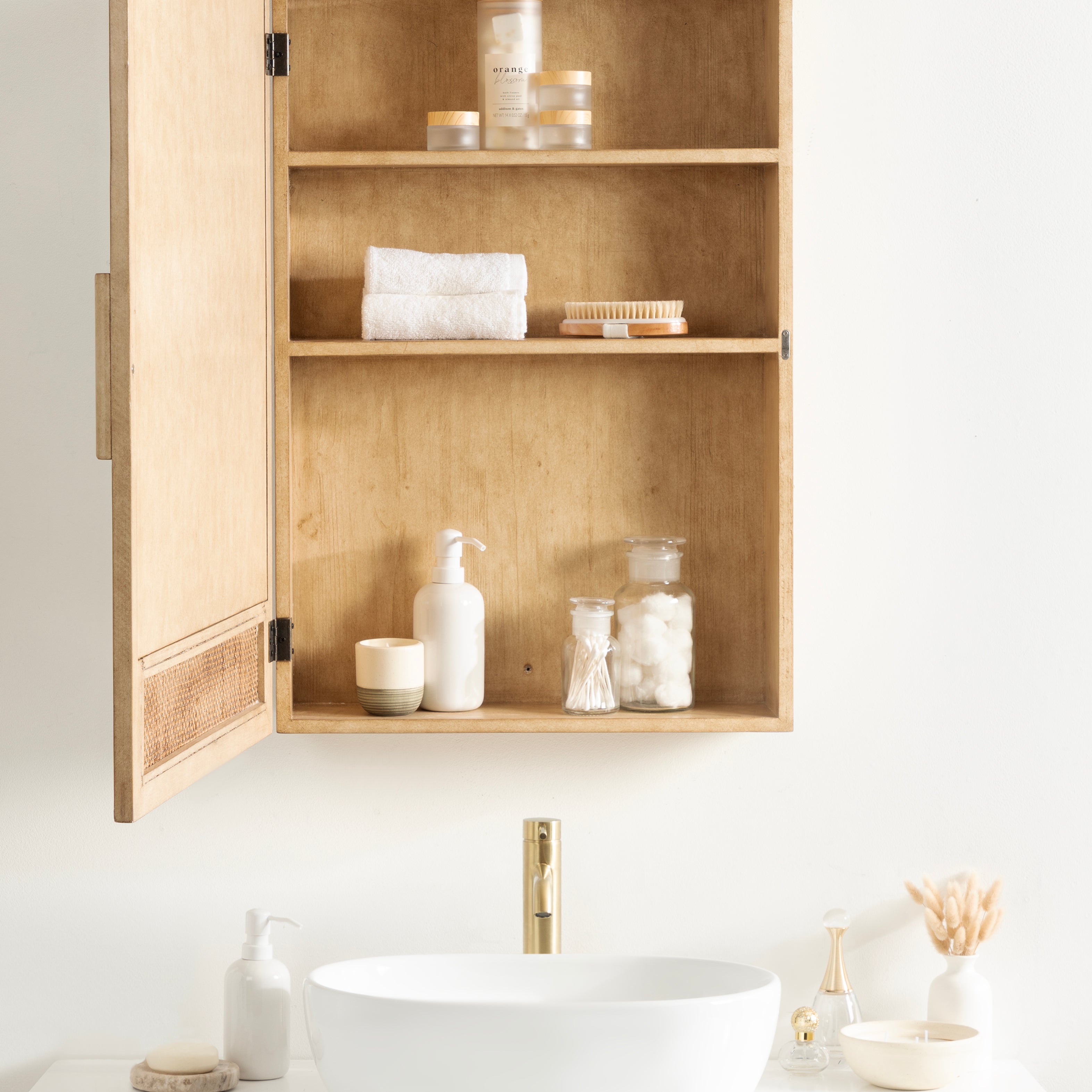 This stunning Ori rattan medicine cabinet is the perfect blend of style and functionality for your bathroom. The cabinet features a large, crystal-clear mirror on its front and a unique woven cane detailing below. Inside, you'll find ample storage space, perfect for organizing toiletries, medications, and other essentials. The cabinet's compact design allows it to be mounted above your sink or over the toilet, maximizing your bathroom's space without sacrificing style. It also includes magnetic closures on the doors to ensure that it stays closed and keeps your items secure. The transitional design seamlessly blends with both modern and traditional decor, making it a versatile addition to any bathroom. Crafted with durability in mind, the frame of the Ori cabinet is crafted from a careful blend of solid wood and wooden material for an organic look and feel. Elevate your skincare routine and your overall bathroom aesthetic with this beautiful, practical cabinet.