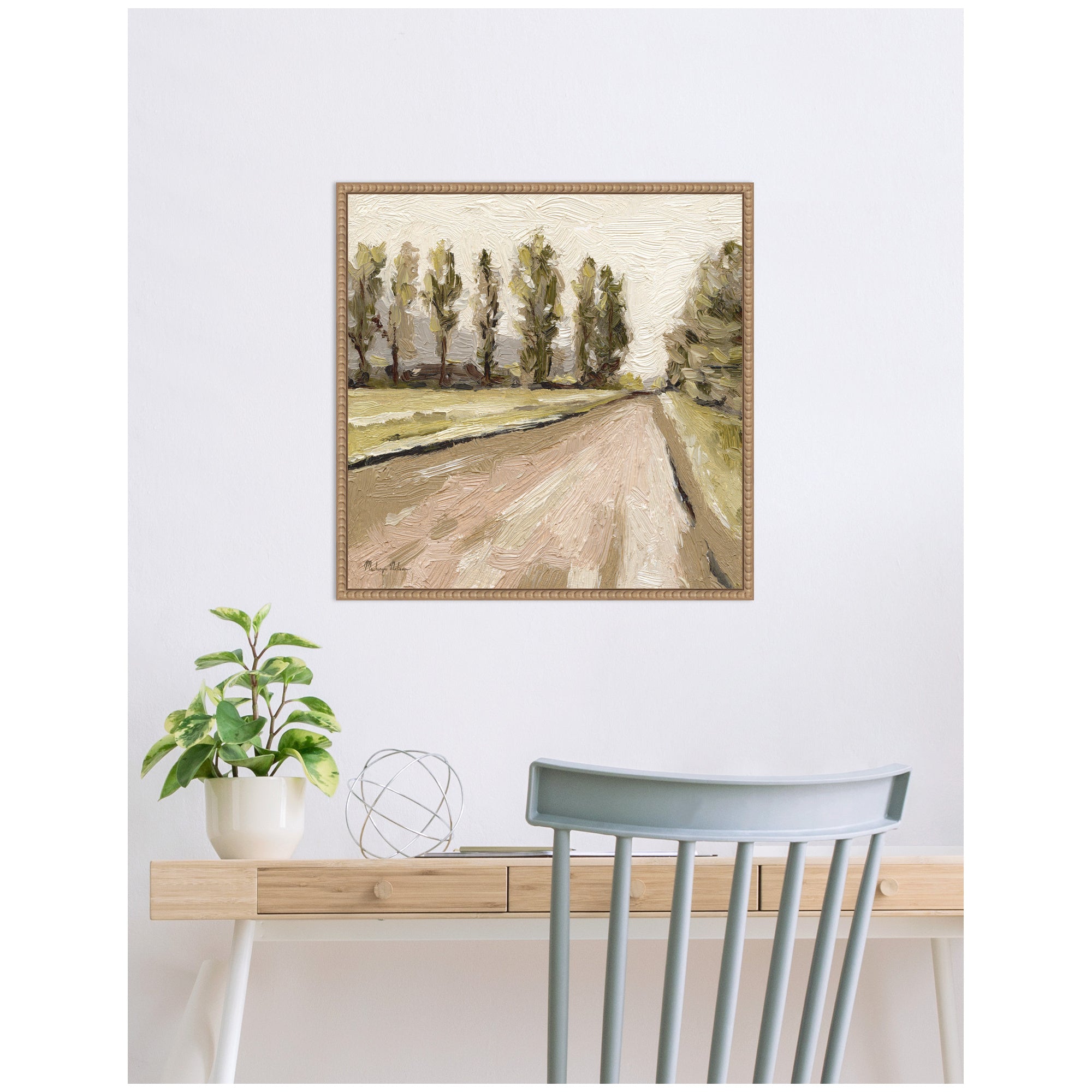 - Gallery Quality Art: Measuring 22 x 22 inches, this is beautifully presented in Sylvie Beaded Rustic Natural frame - a float frame featuring a beaded ornate design with natural woodgrain coloring and dramatic depth.. Expressive Wall Art Story:The artwork depicts a peaceful countryside scene with a row of trees lining a dirt road. The use of impasto technique adds texture, bringing life to the greenery and earth tones. The serene setting evokes a sense of calm and natural beauty.