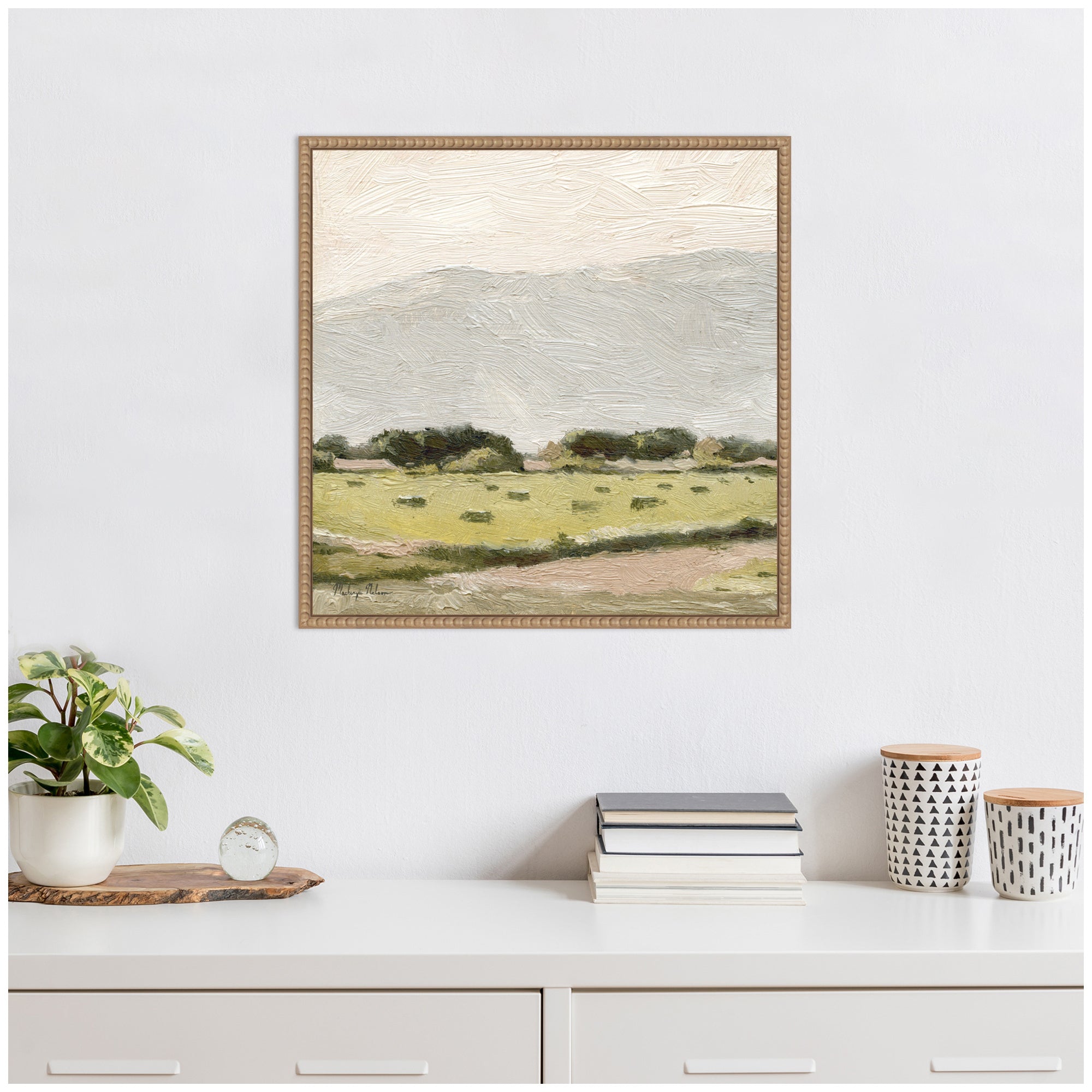• Gallery Quality Art: Measuring 22 x 22 inches, this is beautifully presented in Sylvie Beaded Rustic Natural frame - a float frame featuring a beaded ornate design with natural woodgrain coloring and dramatic depth.. Expressive Wall Art Story:The artwork depicts a tranquil landscape with a wide, grassy field stretching towards the horizon. Soft, textured brushstrokes create a sense of movement and depth in the clouds above and the greenery below. A line of trees separates the field from the sky, adding contrast and balance to the scene.