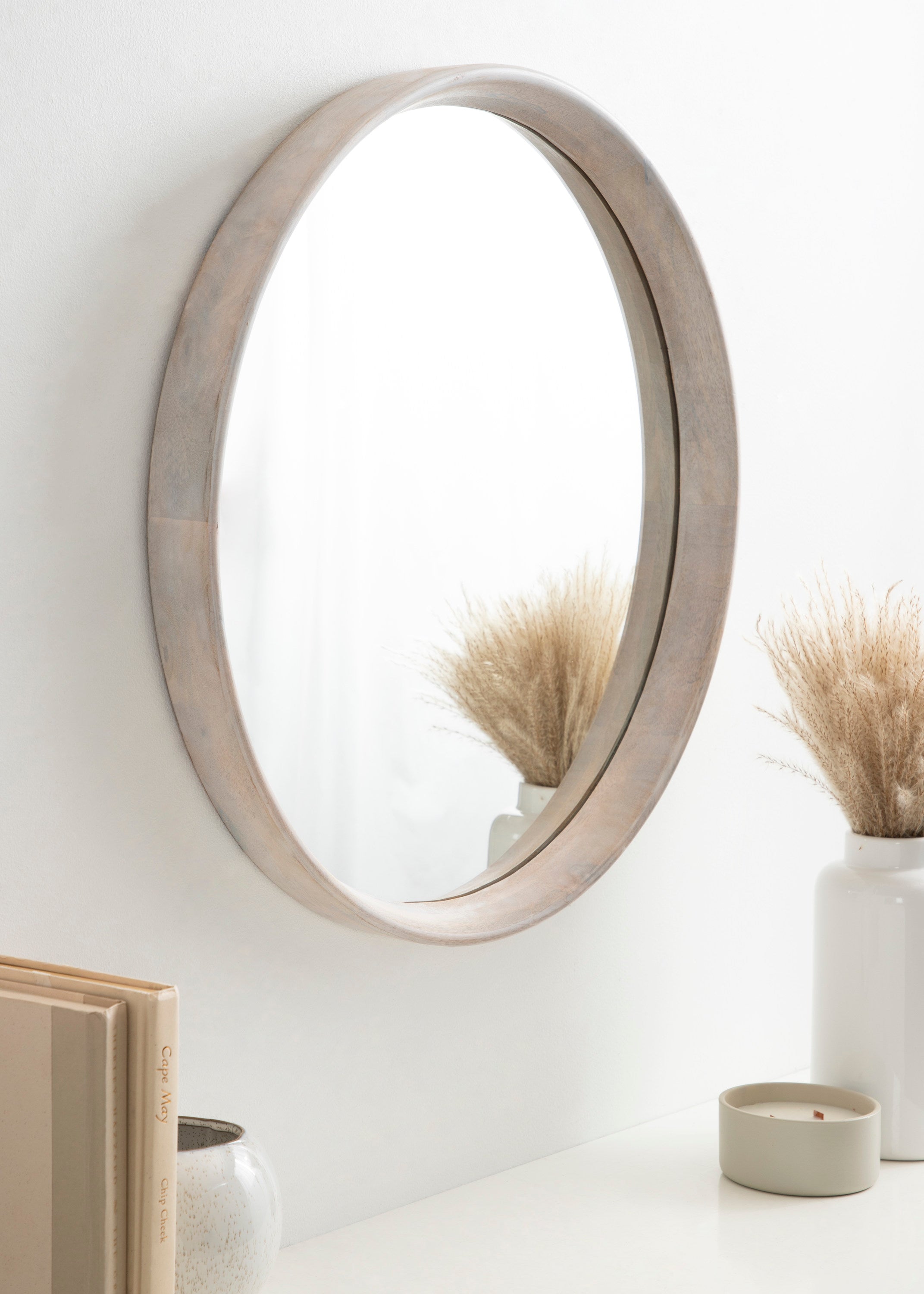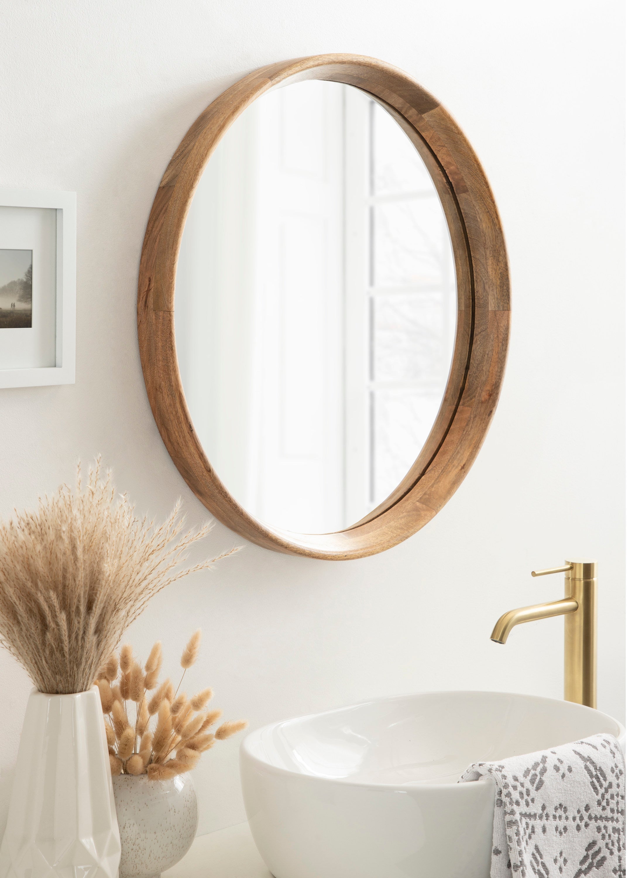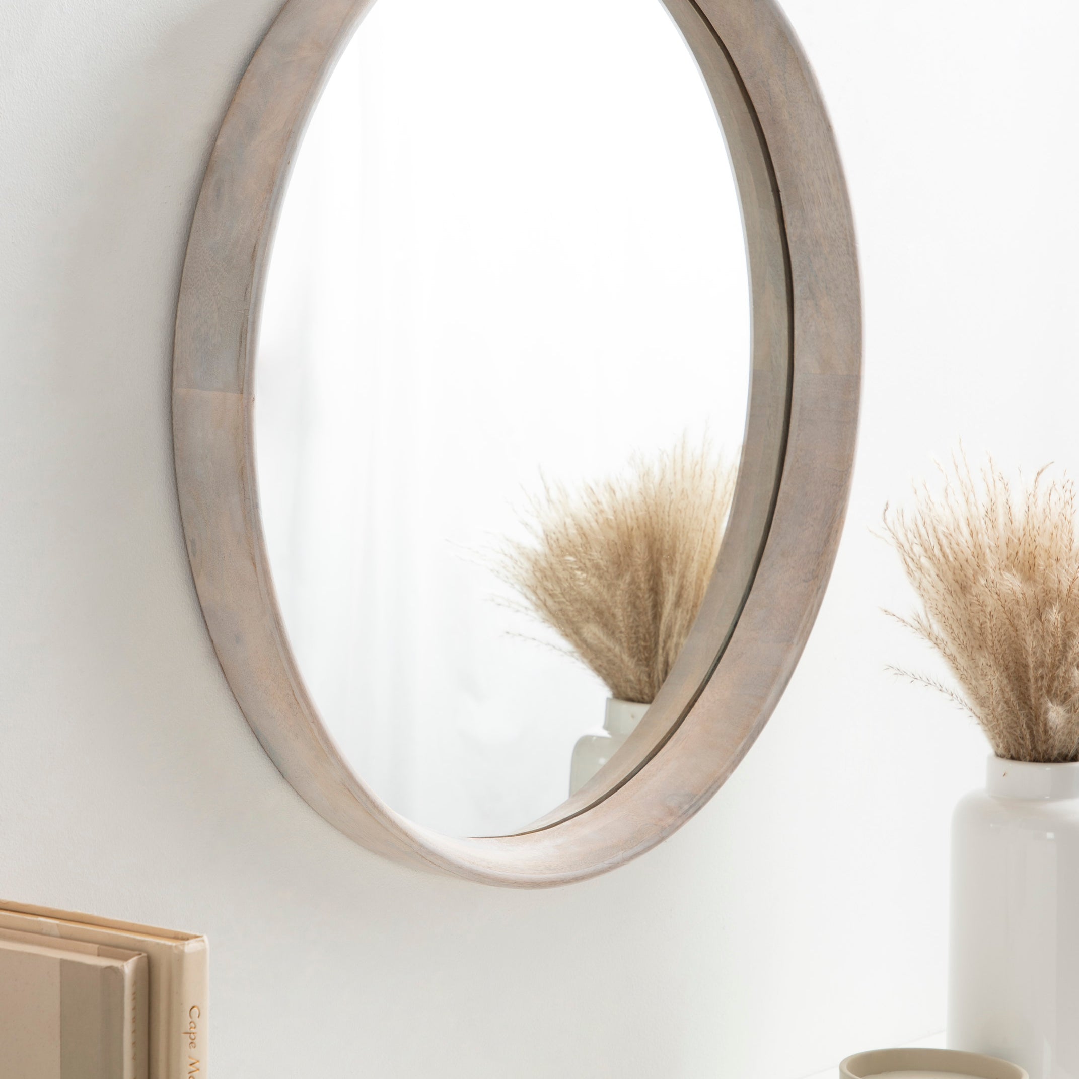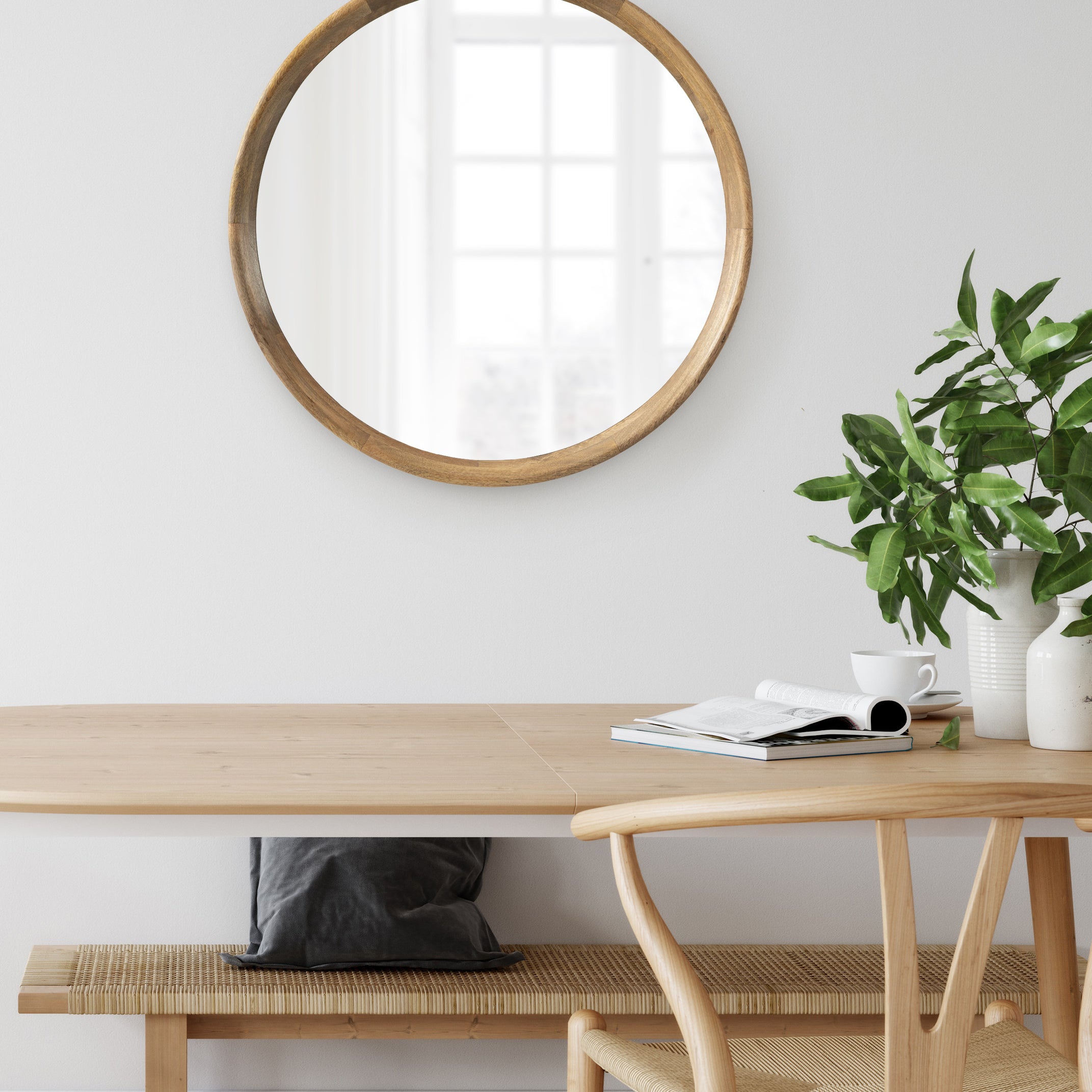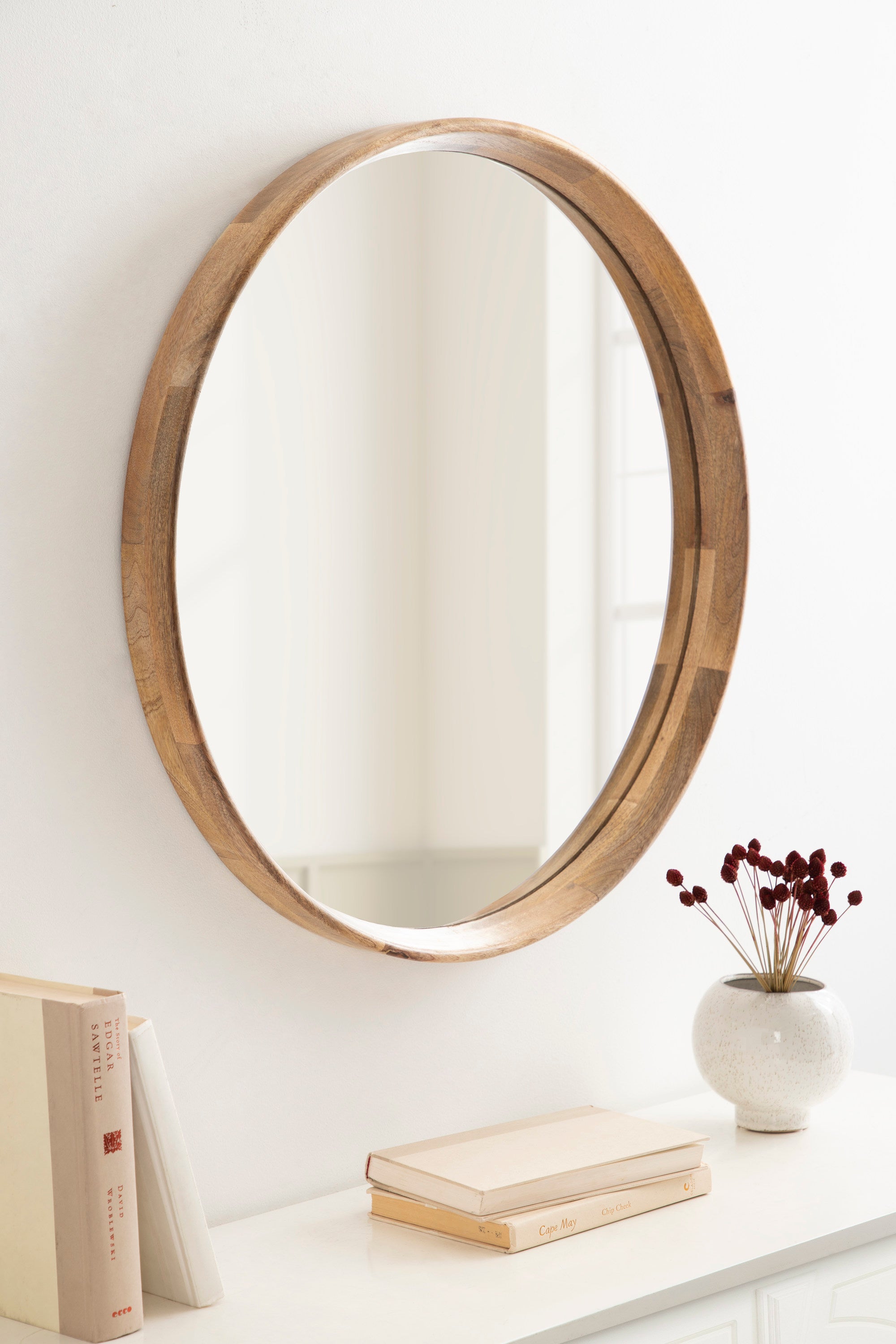 Add modern simplicity to your space with this delightful Prema wall mirror. Handcrafted out of solid mango wood in India, the Prema features a unique wood grain along its soft, curved frame. This mirror has a unique frame with a slim width along the edges with a prominent 2-inch profile depth. This gives the Prema a refined look that fits a variety of decor styles. Due to its simple yet dignified look, the Prema is a stunning piece to place throughout your home. It is a great addition to any bathroom, bedroom, living room, or entryway area because of its natural versatility.