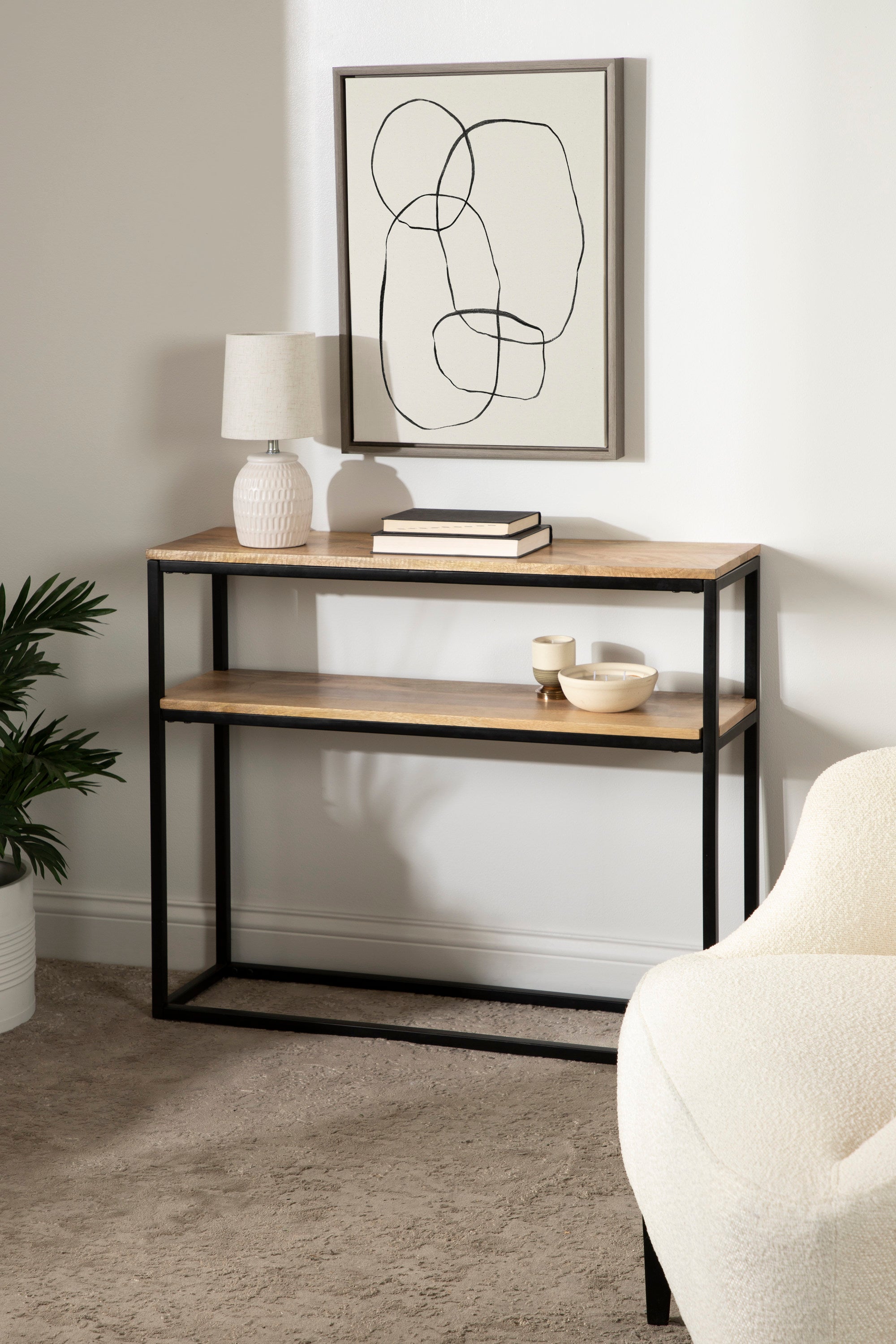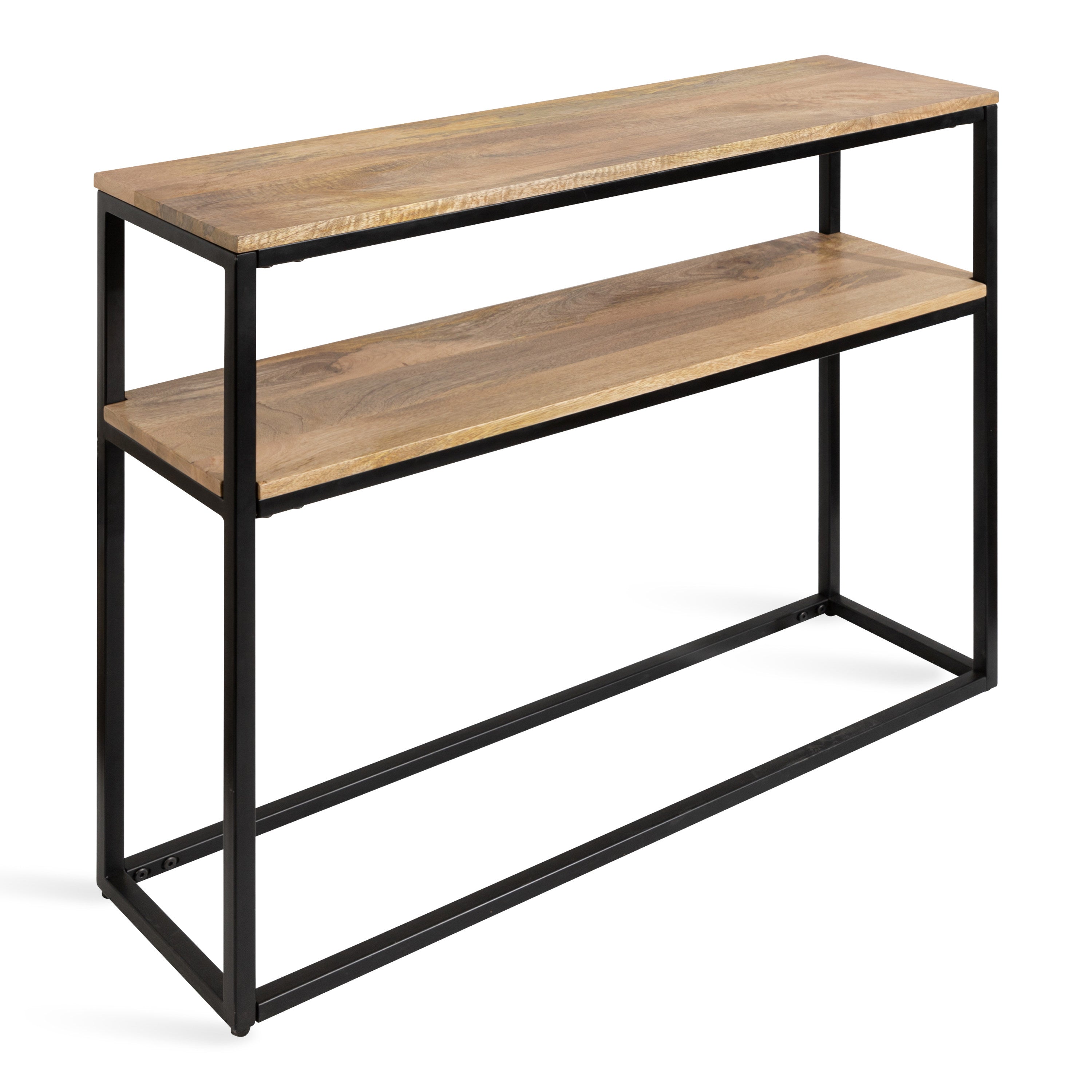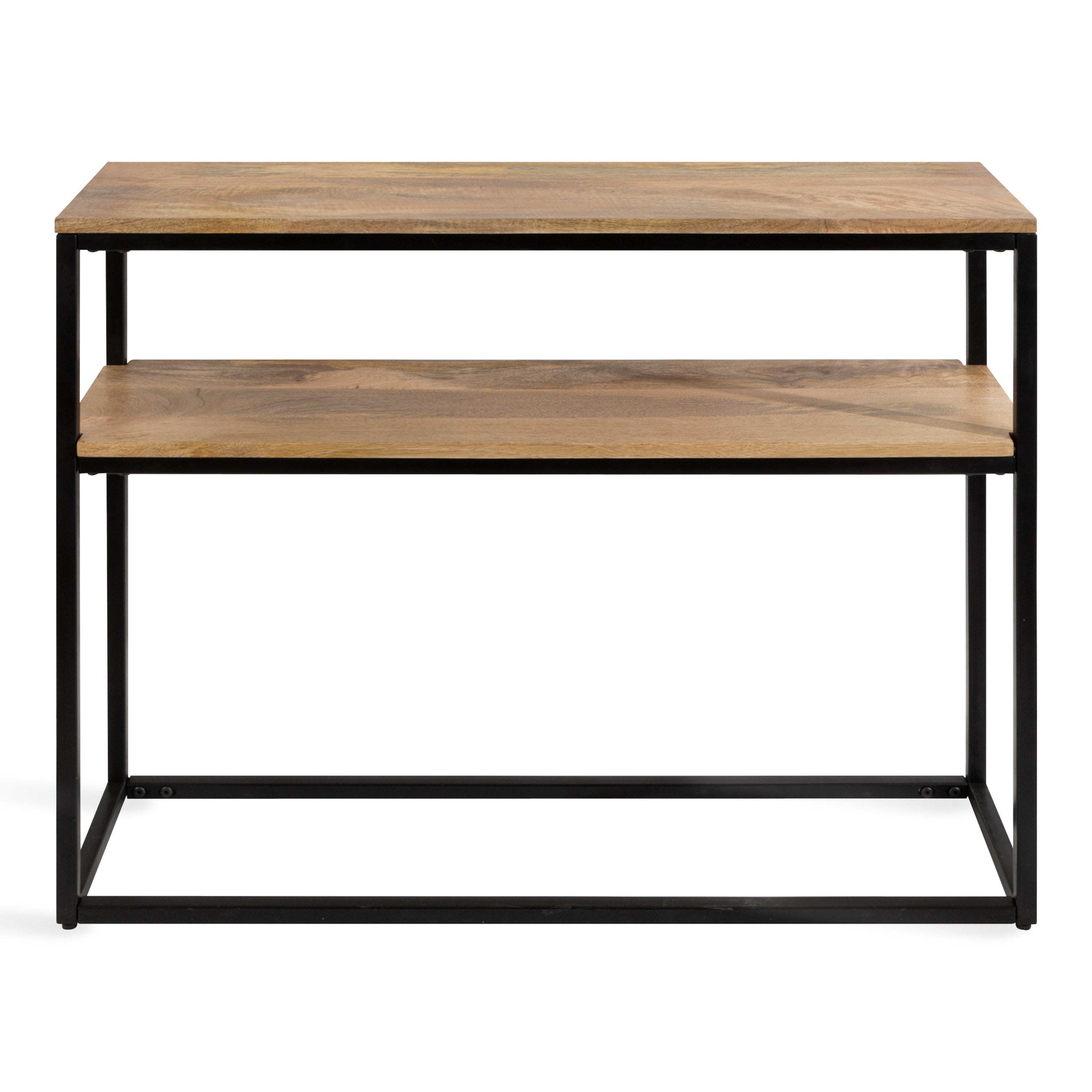 The Quarles console table brings functional farmhouse style to your space! This table is handcrafted in India of iron and solid mango wood, giving it a one-of-a-kind look in terms of finish and woodgrain. It's a truly unique accent that delivers two tiers of tabletops for storage and display. It's fabulous near your entryway as a doorway catch-all, an end table next to your couch or armchair, or a place to rest your book and lotions in your bedroom. Its bold look and fresh practicality make it a staple for any room of your home.