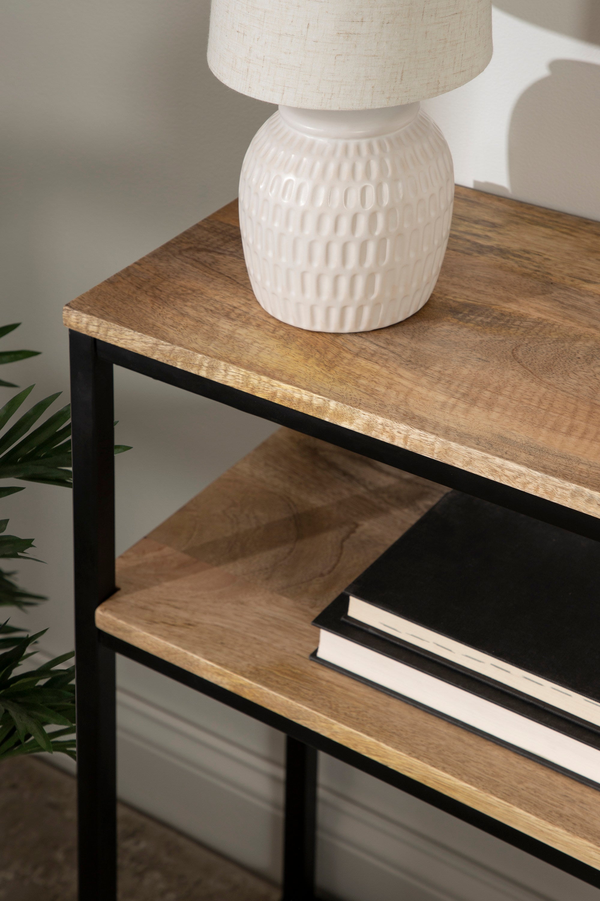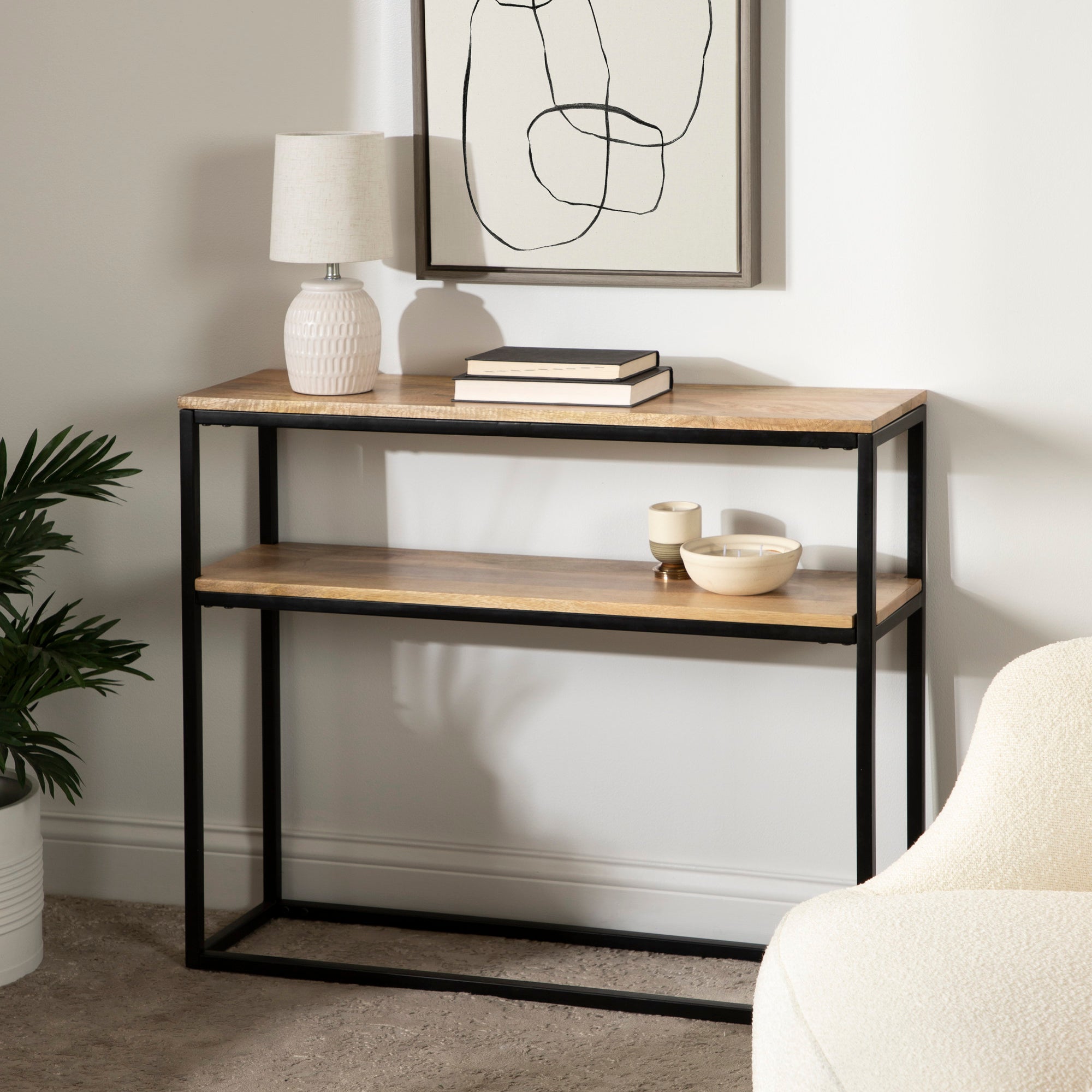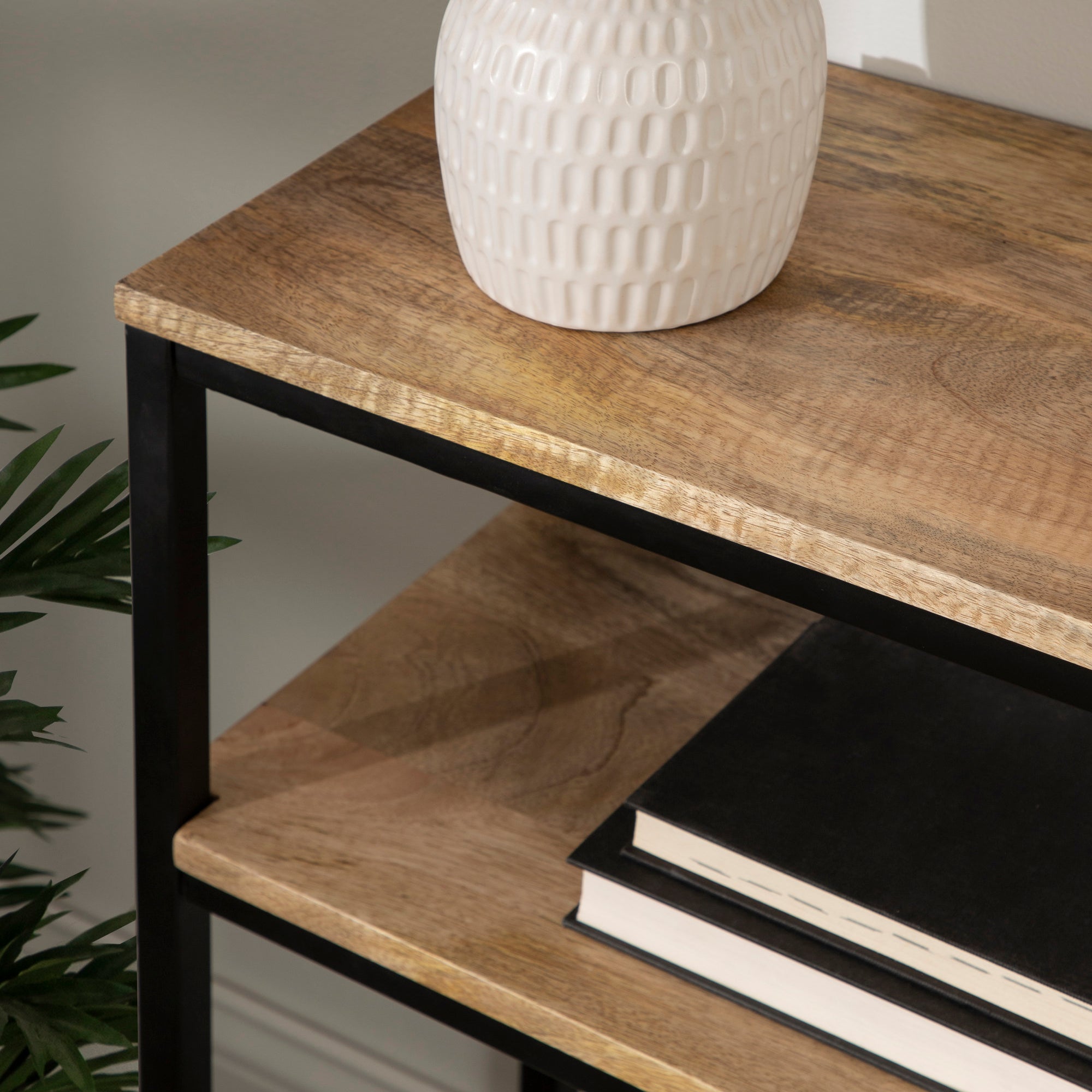The Quarles console table brings functional farmhouse style to your space! This table is handcrafted in India of iron and solid mango wood, giving it a one-of-a-kind look in terms of finish and woodgrain. It's a truly unique accent that delivers two tiers of tabletops for storage and display. It's fabulous near your entryway as a doorway catch-all, an end table next to your couch or armchair, or a place to rest your book and lotions in your bedroom. Its bold look and fresh practicality make it a staple for any room of your home.