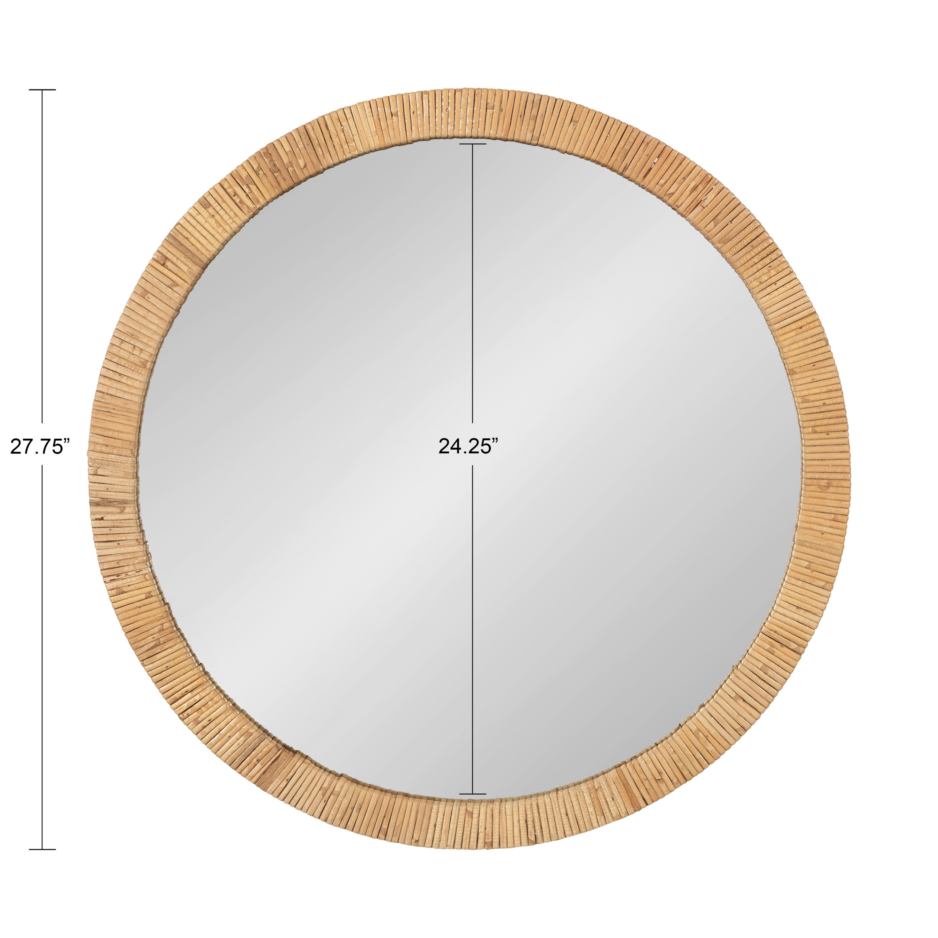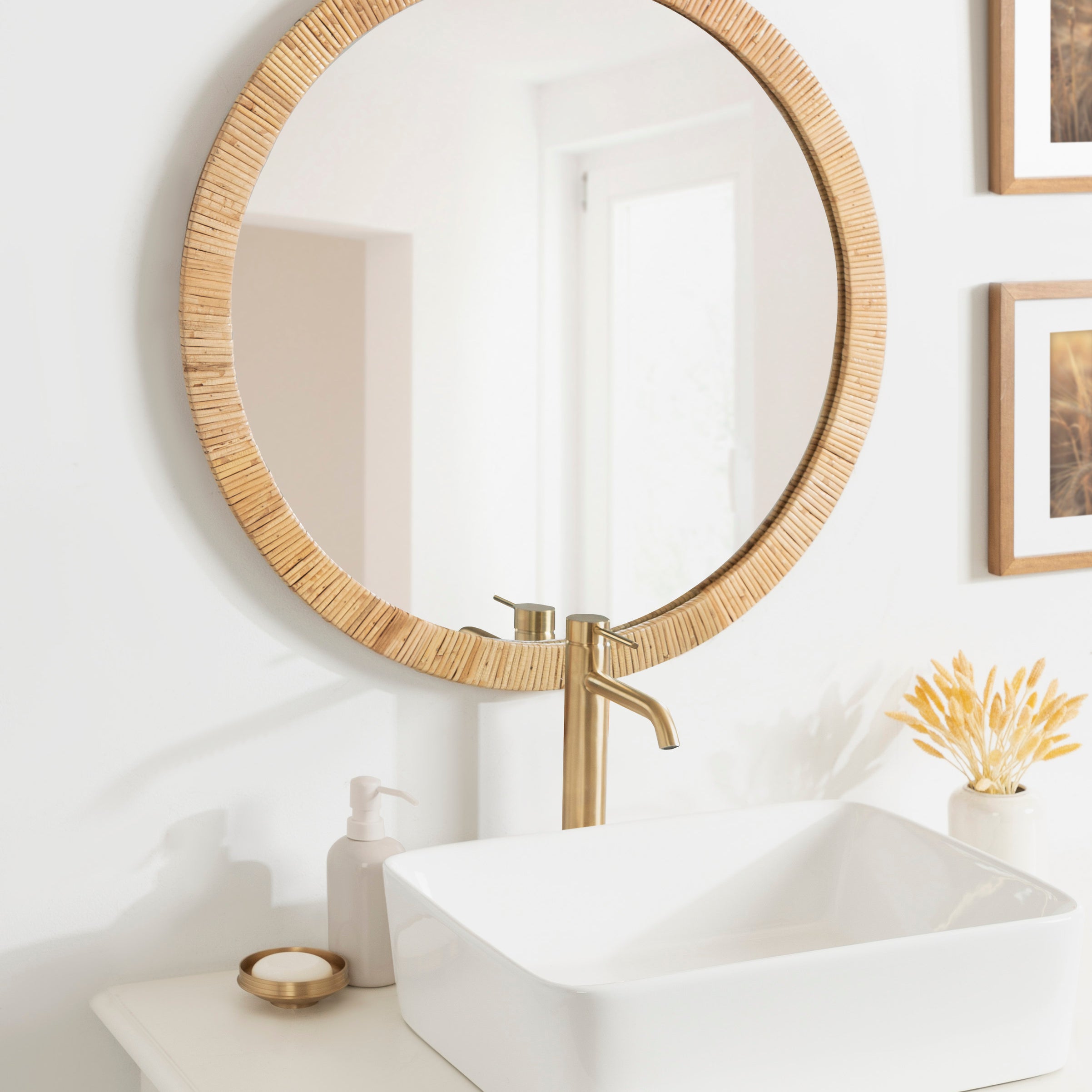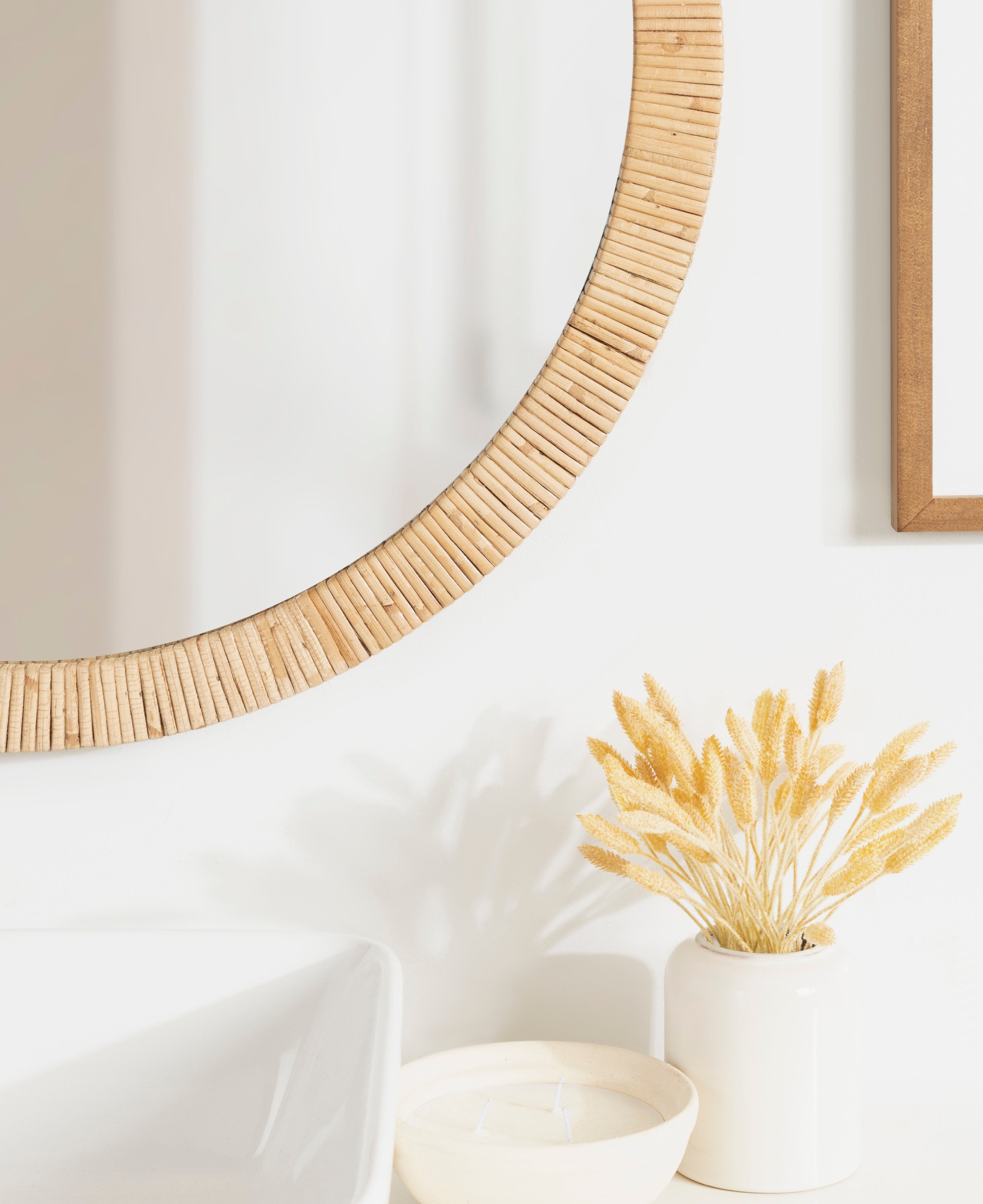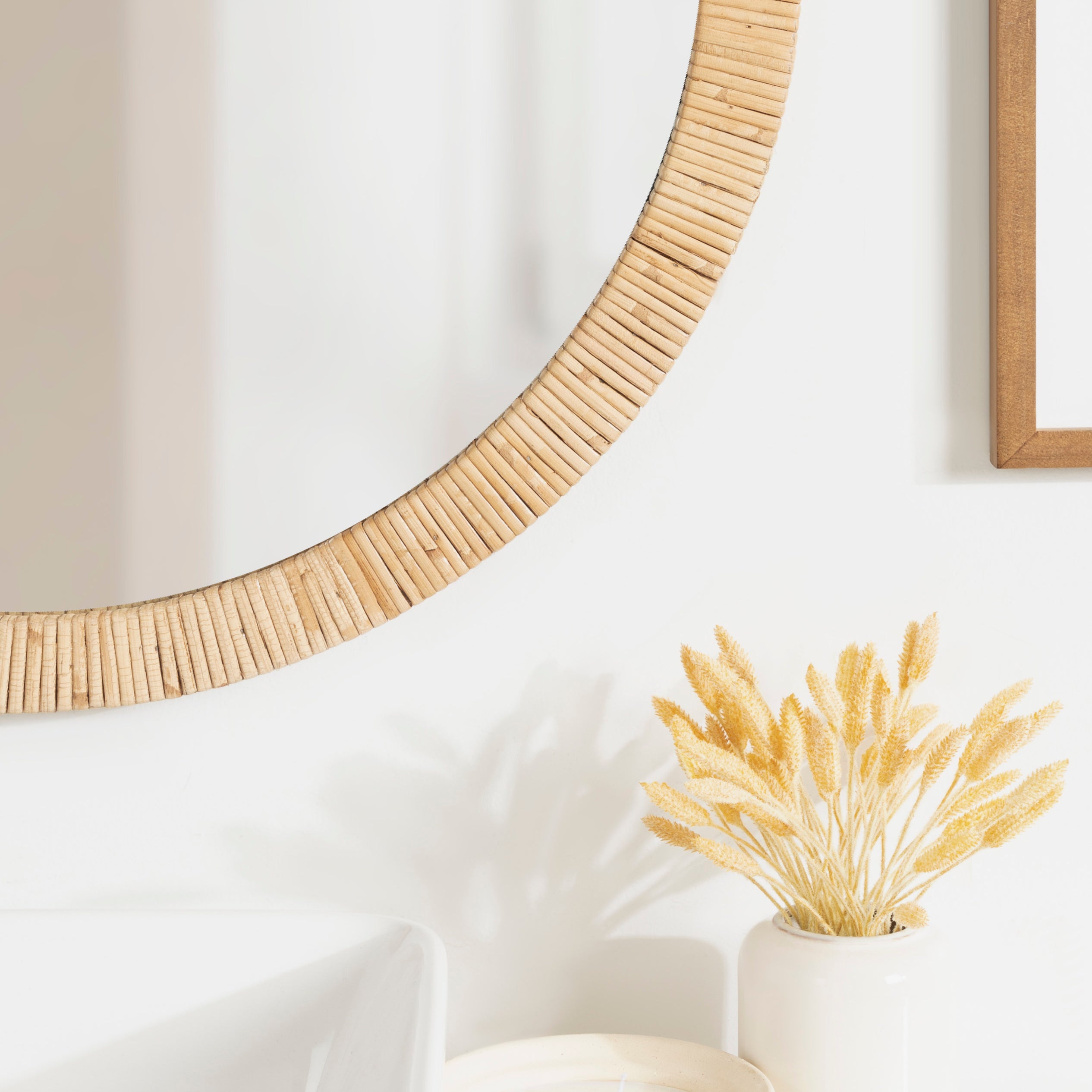 Elevate your wall decor with boho sophistication by hanging the Rahfy mirror! This lovely mirror offers textured visual intrigue to your home with a rattan-wrapped, round frame. It's a bold style choice that pays off with a vibrant surface area and a dimensional design. Whether you're redecorating your bathroom or adding a stylish and textured focal point to your favorite living space, it's perfect for setting the tone of your aesthetic.