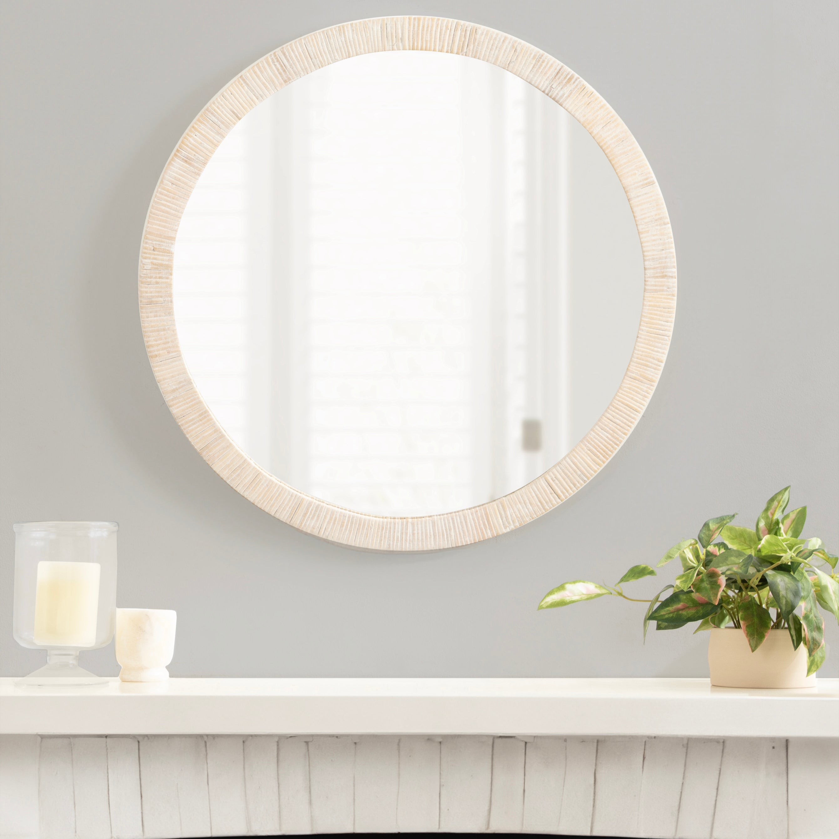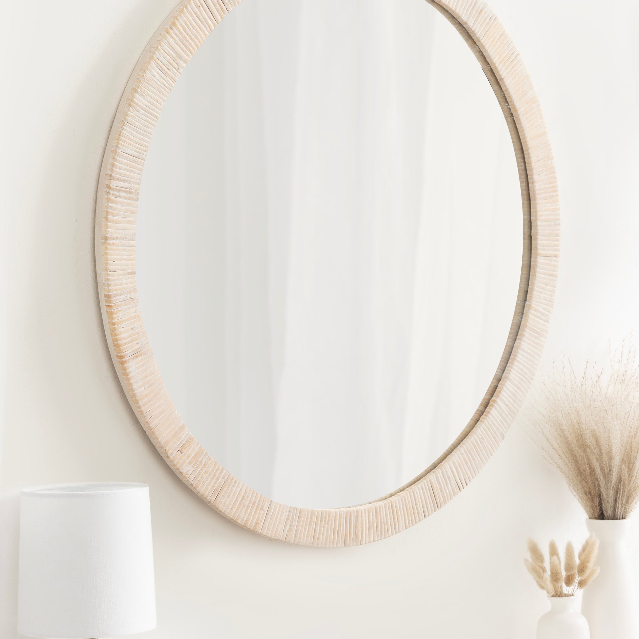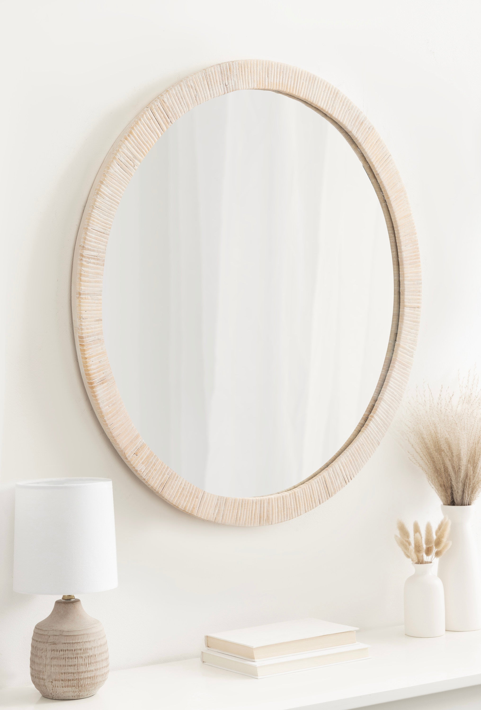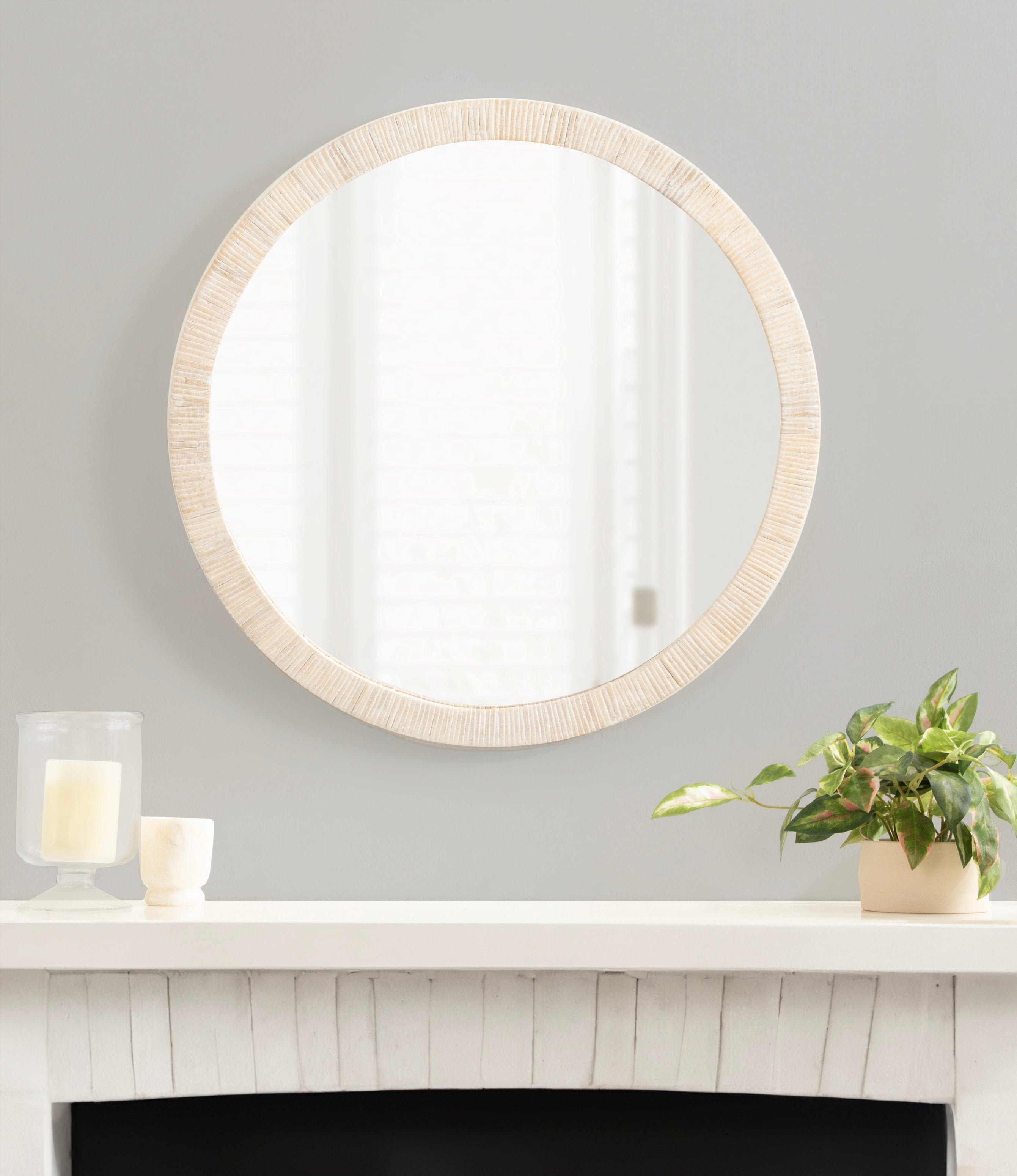 Elevate your wall decor with boho sophistication by hanging the Rahfy mirror! This lovely mirror offers textured visual intrigue to your home with a rattan-wrapped, round frame. It's a bold style choice that pays off with a vibrant surface area and a dimensional design. Whether you're redecorating your bathroom or adding a stylish and textured focal point to your favorite living space, it's perfect for setting the tone of your aesthetic.