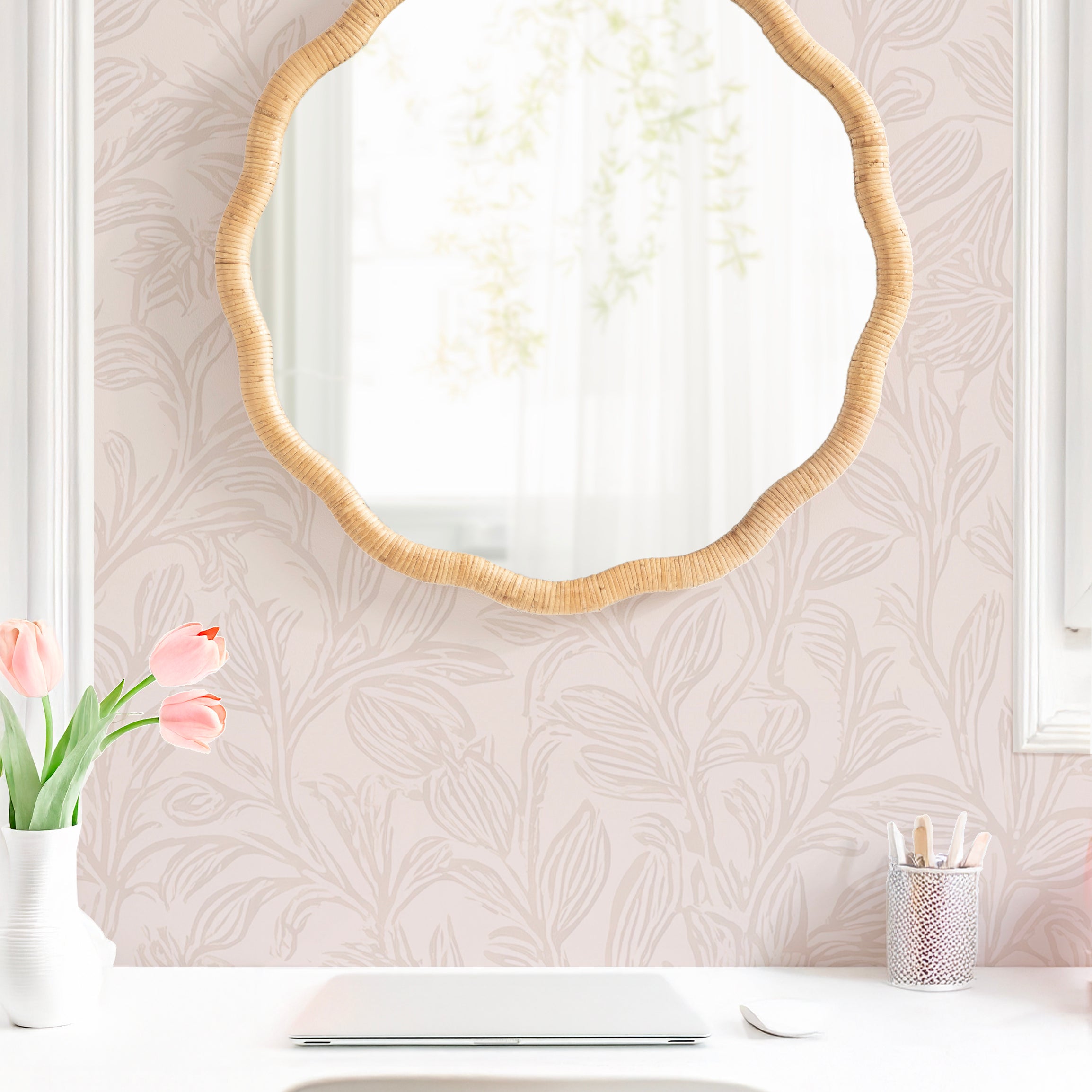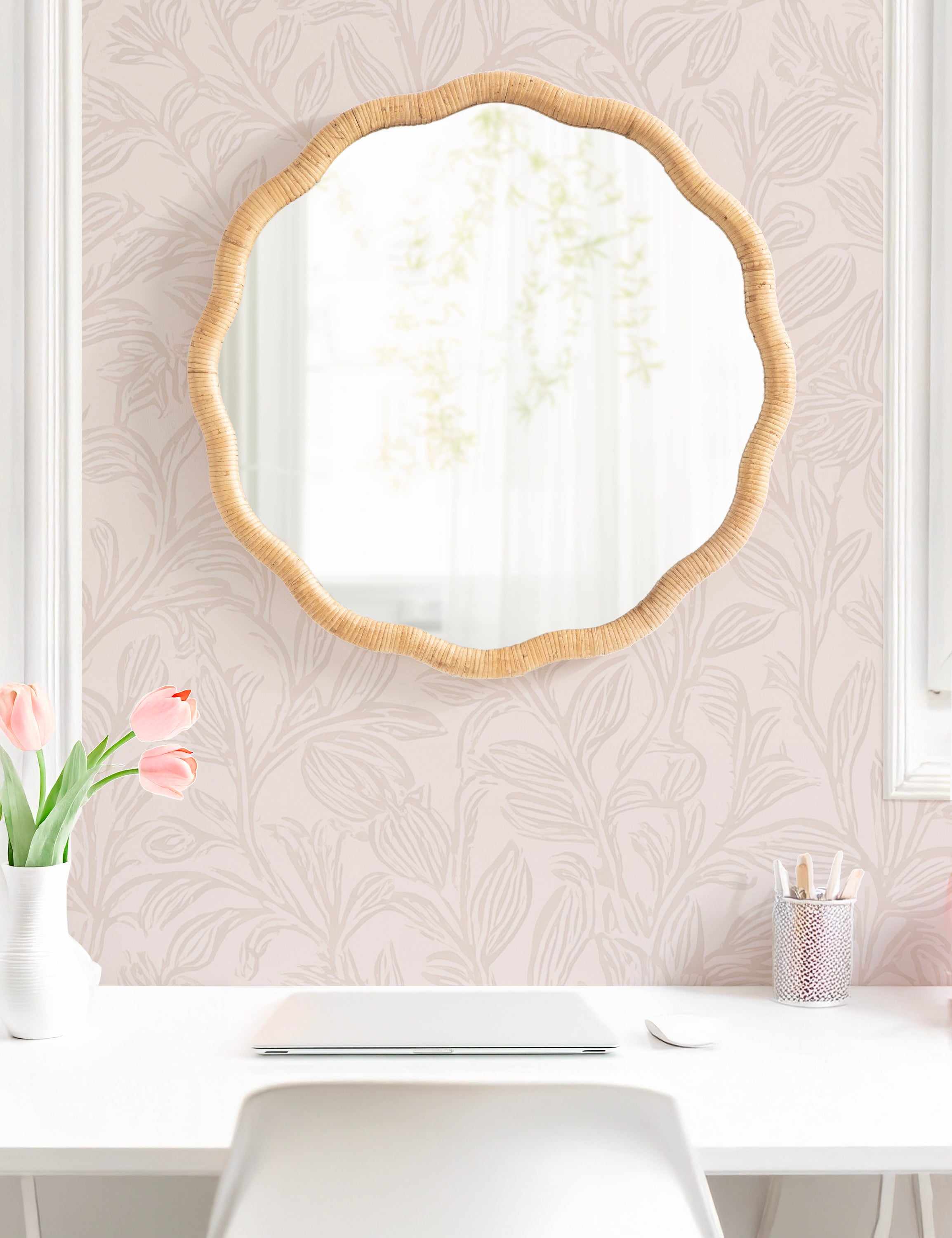 Elevate your wall decor with boho sophistication by hanging the Rahfy mirror! This lovely mirror offers textured visual intrigue to your home with a rattan-wrapped, round scalloped frame. It's a bold style choice that pays off with a vibrant surface area and a dimensional design. Whether you're redecorating your bathroom or adding a stylish and textured focal point to your favorite living space, it's perfect for setting the tone of your aesthetic.