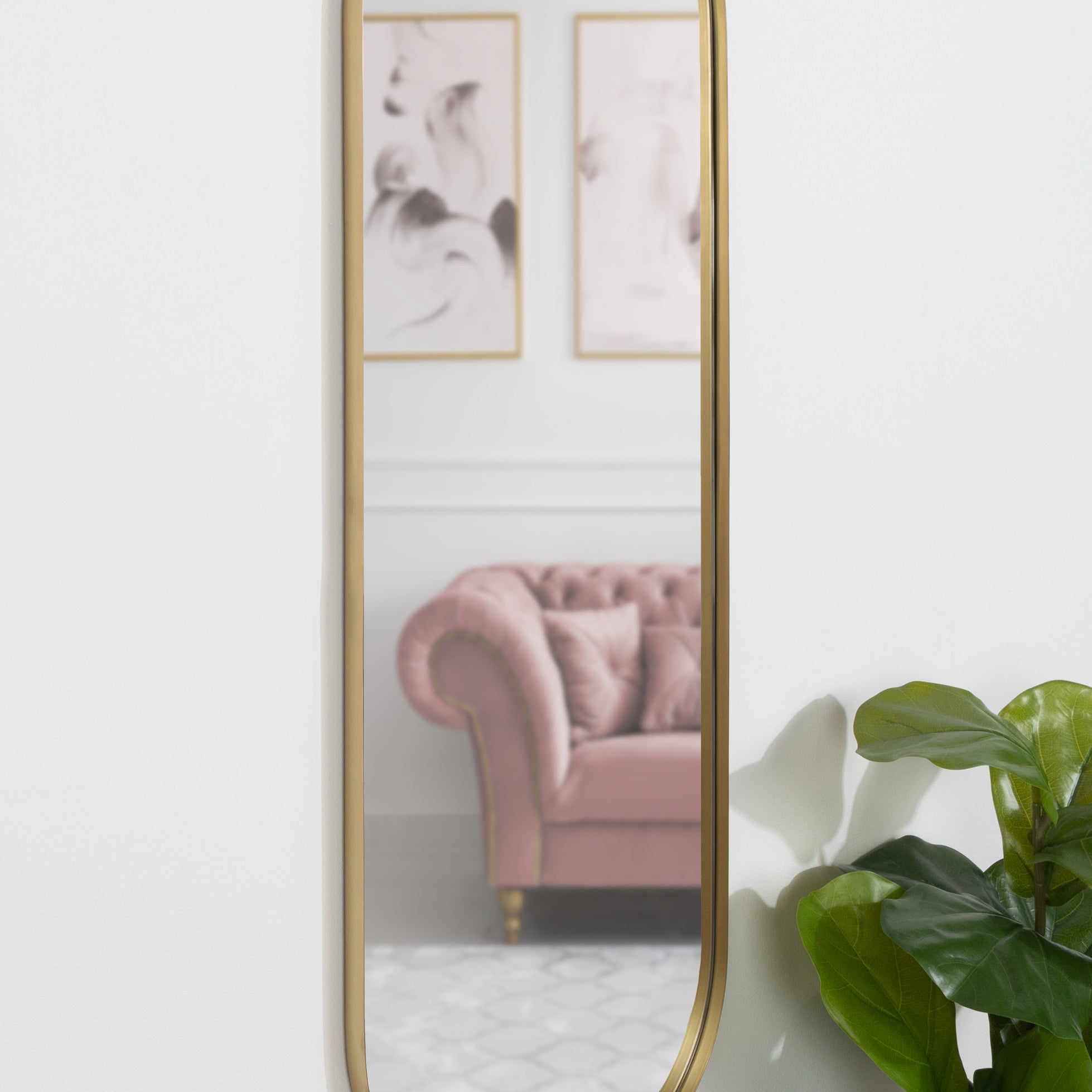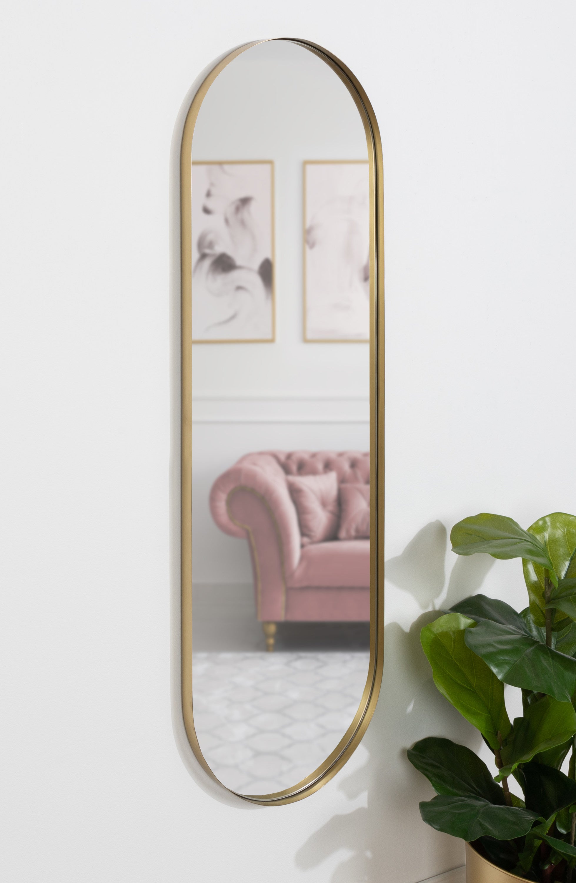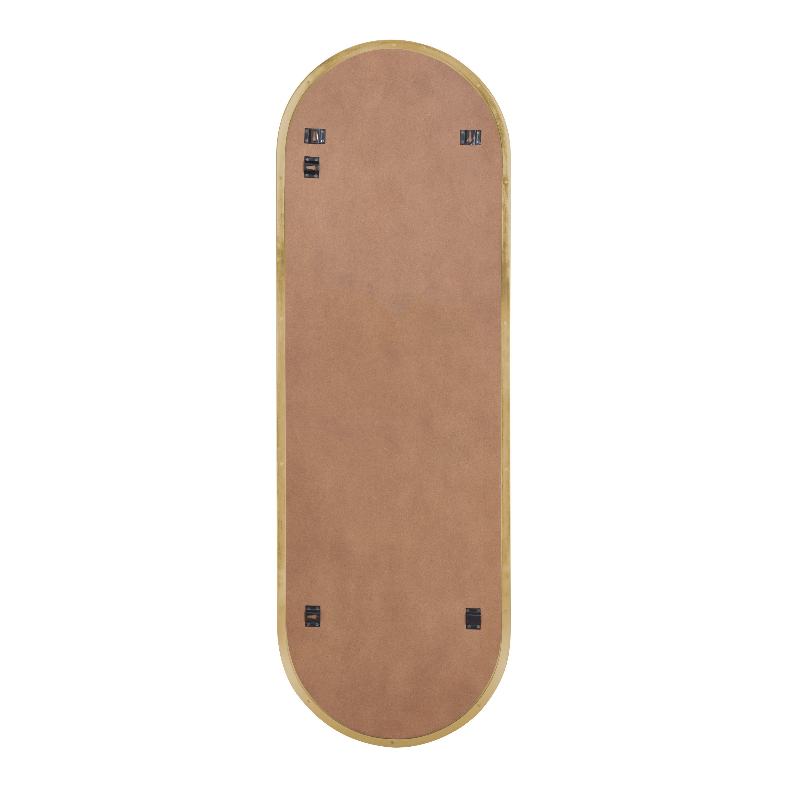 Showcase modern style with the beautiful Rollo mirror's sophisticated design. This mirror features an oval capsule shape, with elegant arches at each side. The beautiful finish on the frame enhances the warm glow of the space while capturing the true elegance of this statement piece. Hang it vertically or horizontally to create the wall display of your dreams, using this mirror as a decorative focal point or a functional bathroom vanity mirror.
