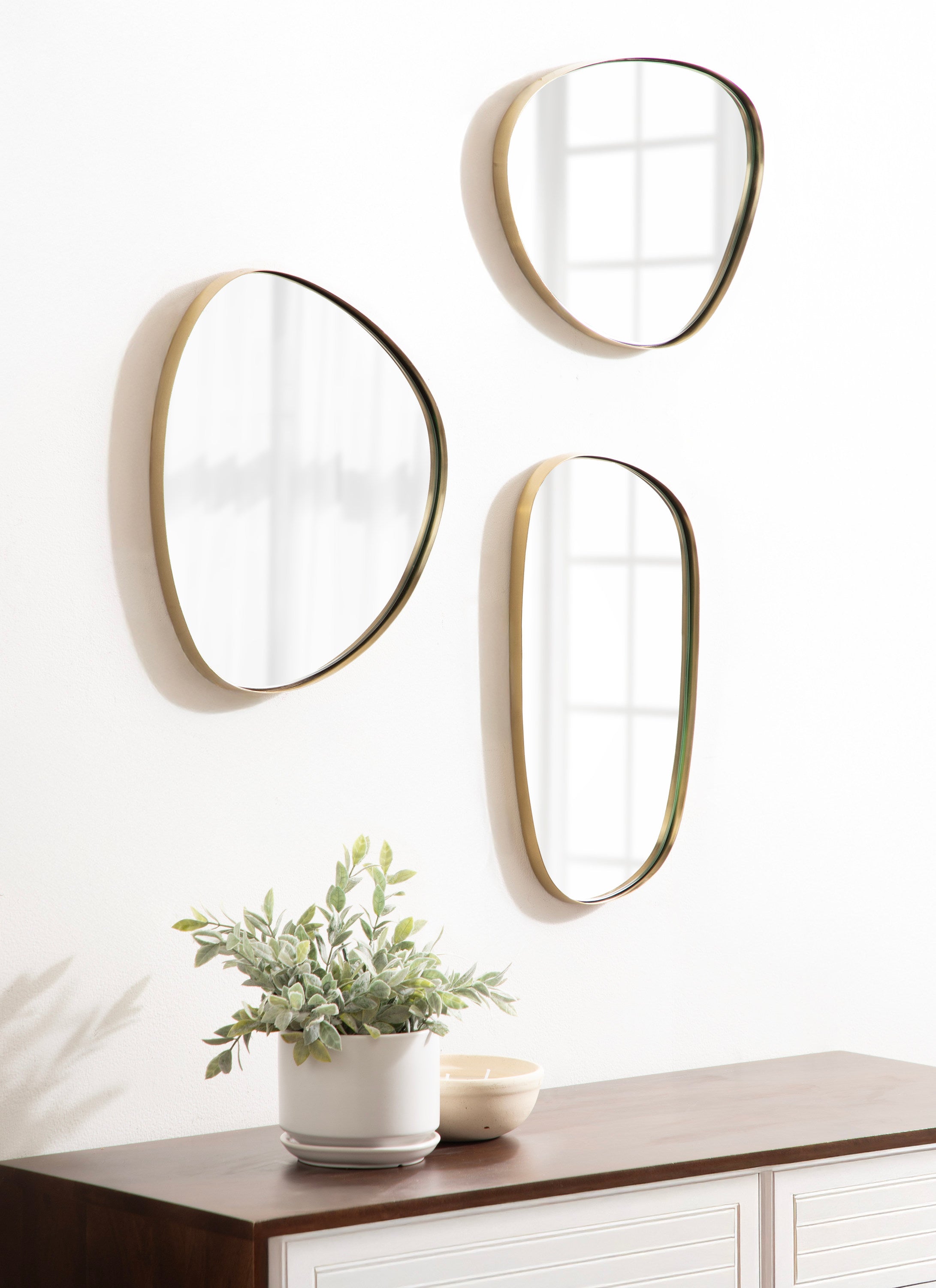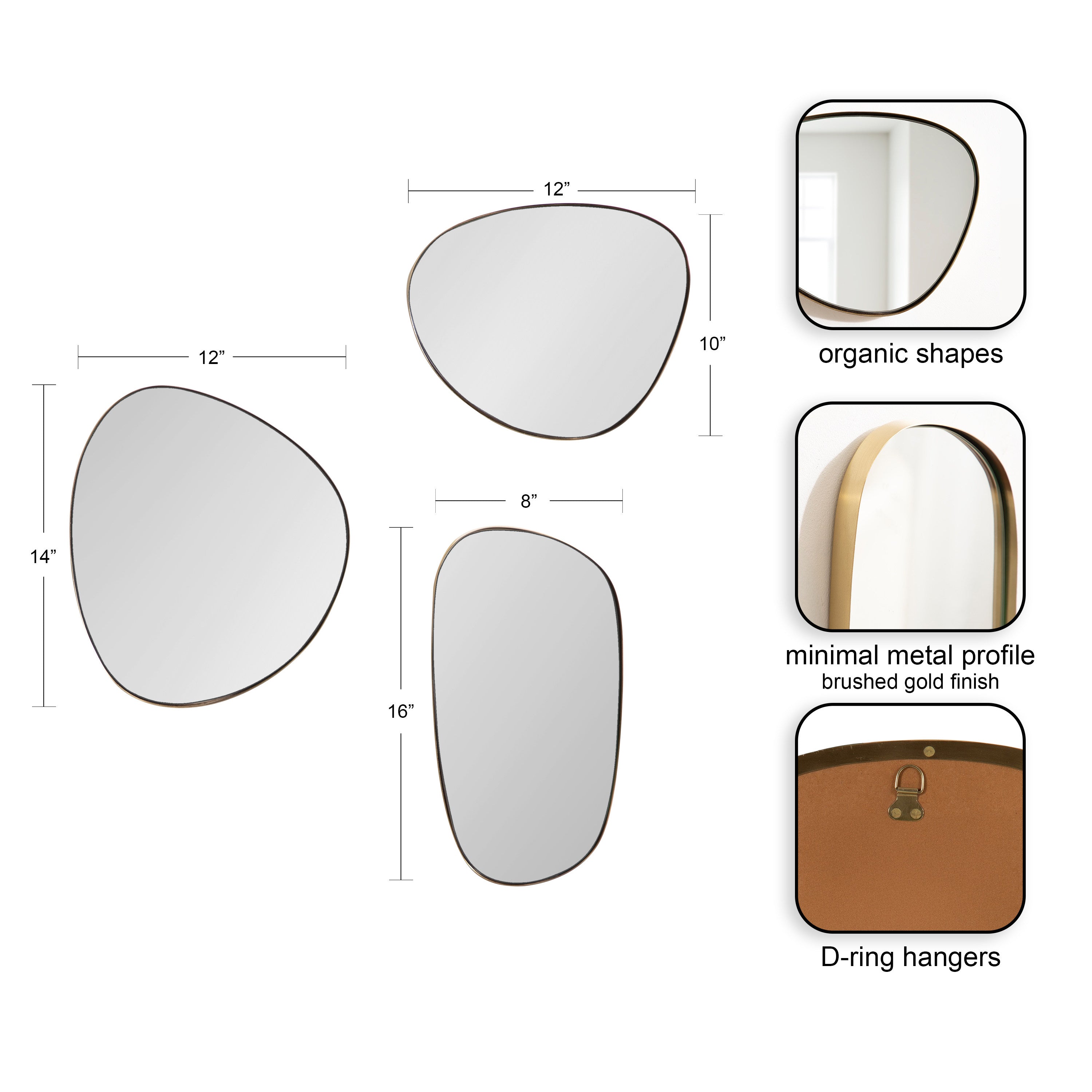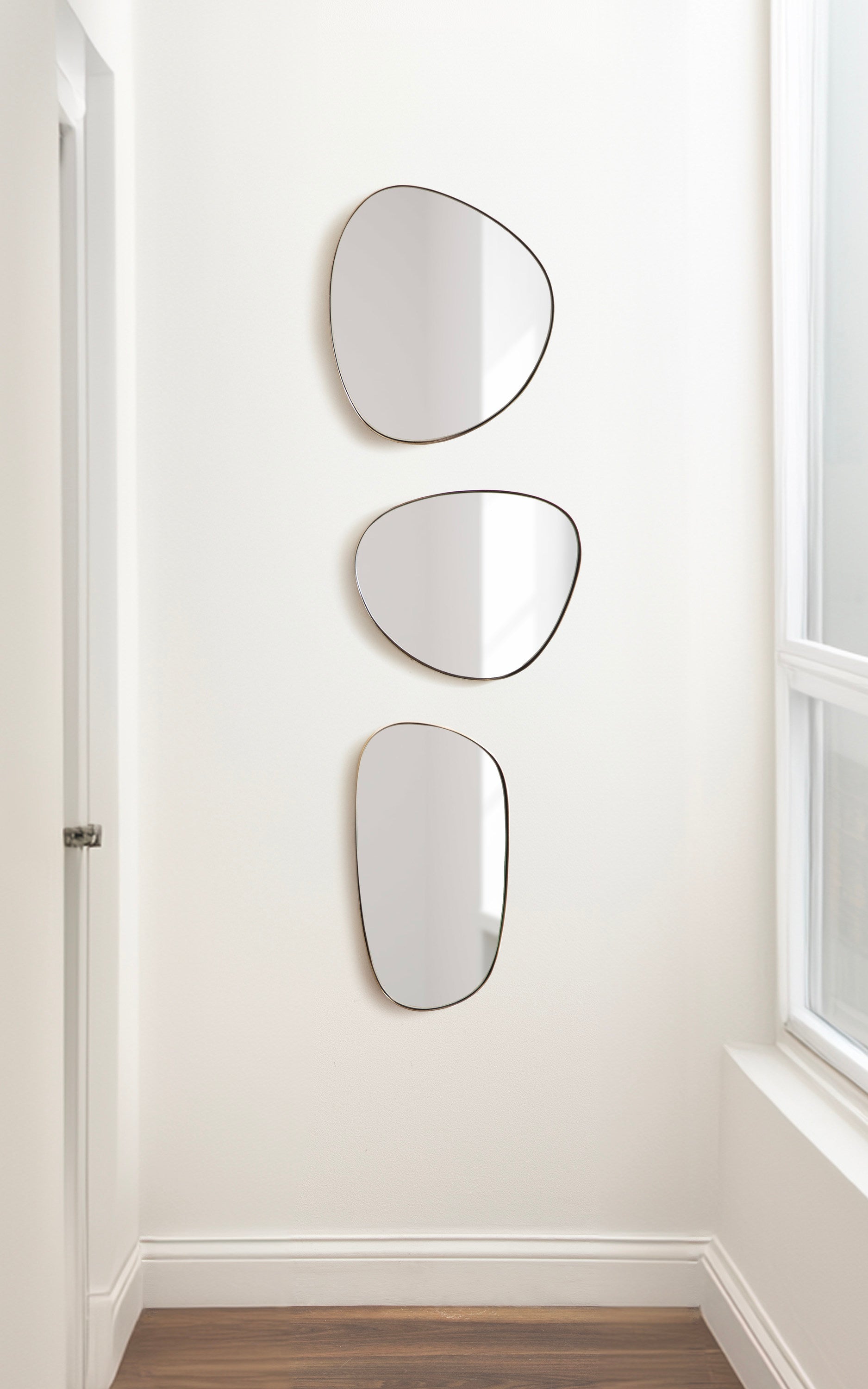Decorate your blank wall with a collection of mirrors that bring modern beauty to your space. The Rollo mirror set embraces modern style with slim minimal frame profiles and irregular mirror shapes, embracing unique curvature. Adding to this contemporary style is the refined finish on the frame, allowing the Rollo set to reflect beauty in any space. Each mirror has a slightly different shape and works well as a cohesive three-piece set, or spread throughout your home as individual accents. This means that at least one of the mirrors will likely fit the specific wall space you have in mind and allow you to change up the theme how you see fit. These irregular, organic shapes easily blend into your home decor scheme with a fun, youthful energy. To install these mirrors on your wall, use the D-ring hangers attached to each back.