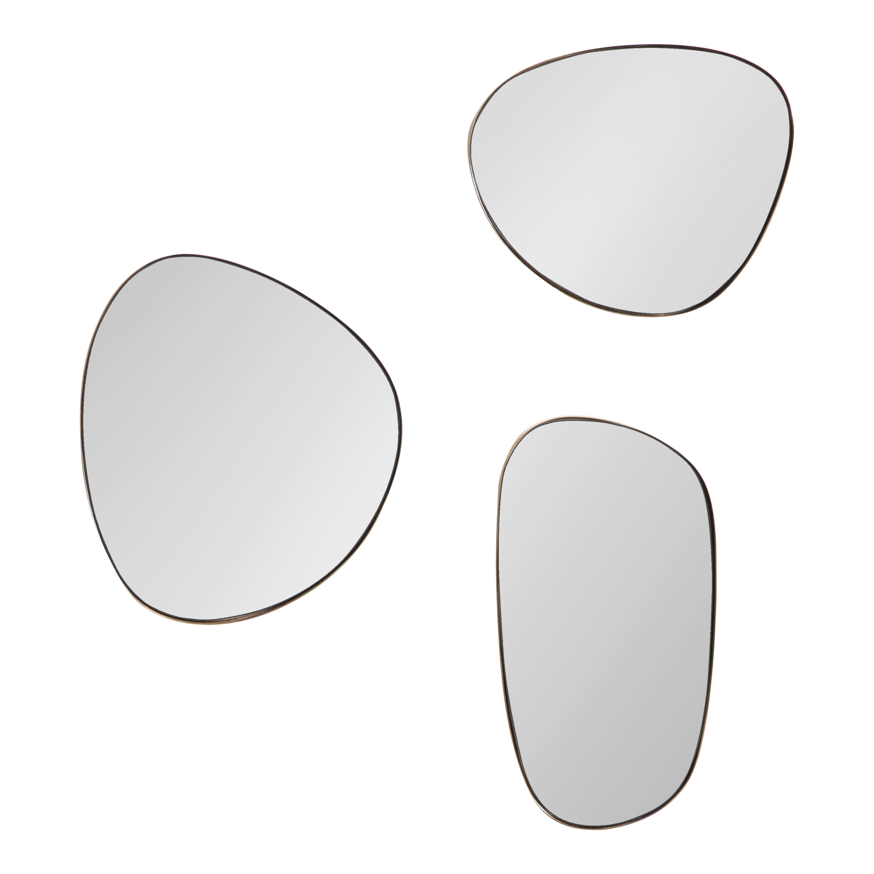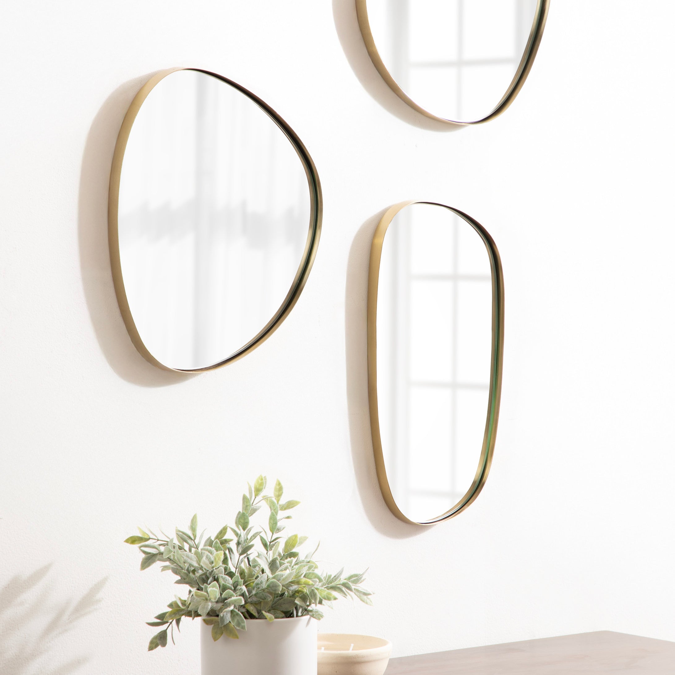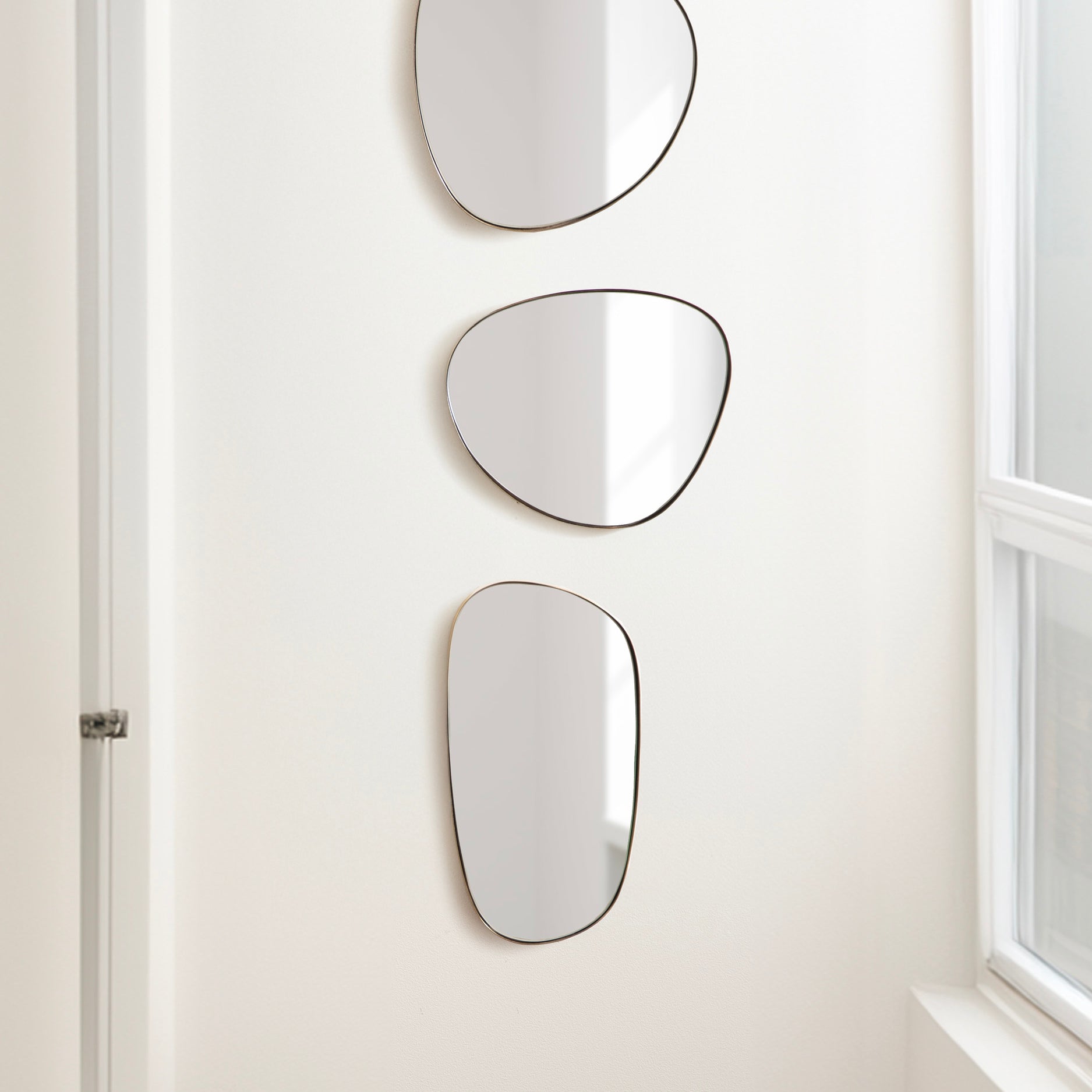 Decorate your blank wall with a collection of mirrors that bring modern beauty to your space. The Rollo mirror set embraces modern style with slim minimal frame profiles and irregular mirror shapes, embracing unique curvature. Adding to this contemporary style is the refined finish on the frame, allowing the Rollo set to reflect beauty in any space. Each mirror has a slightly different shape and works well as a cohesive three-piece set, or spread throughout your home as individual accents. This means that at least one of the mirrors will likely fit the specific wall space you have in mind and allow you to change up the theme how you see fit. These irregular, organic shapes easily blend into your home decor scheme with a fun, youthful energy. To install these mirrors on your wall, use the D-ring hangers attached to each back.
