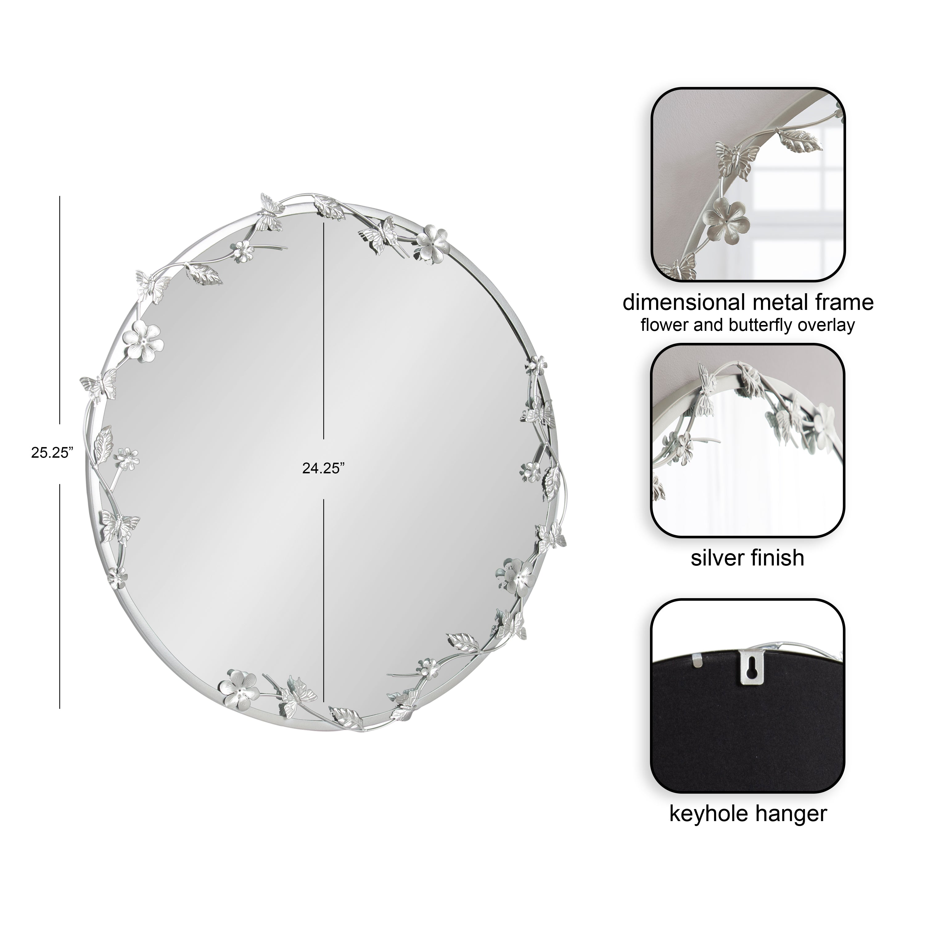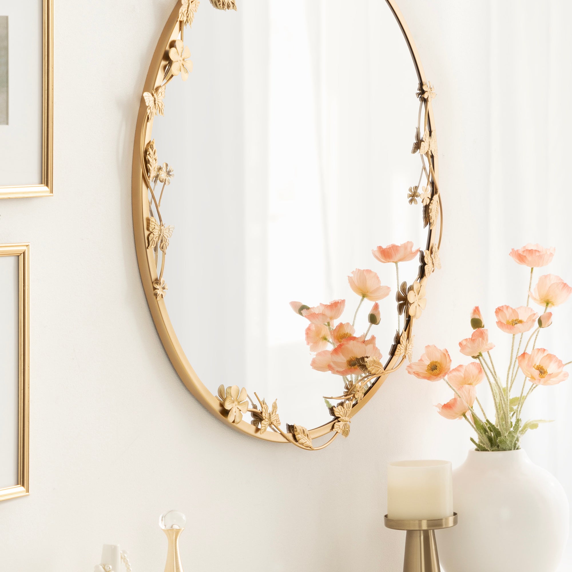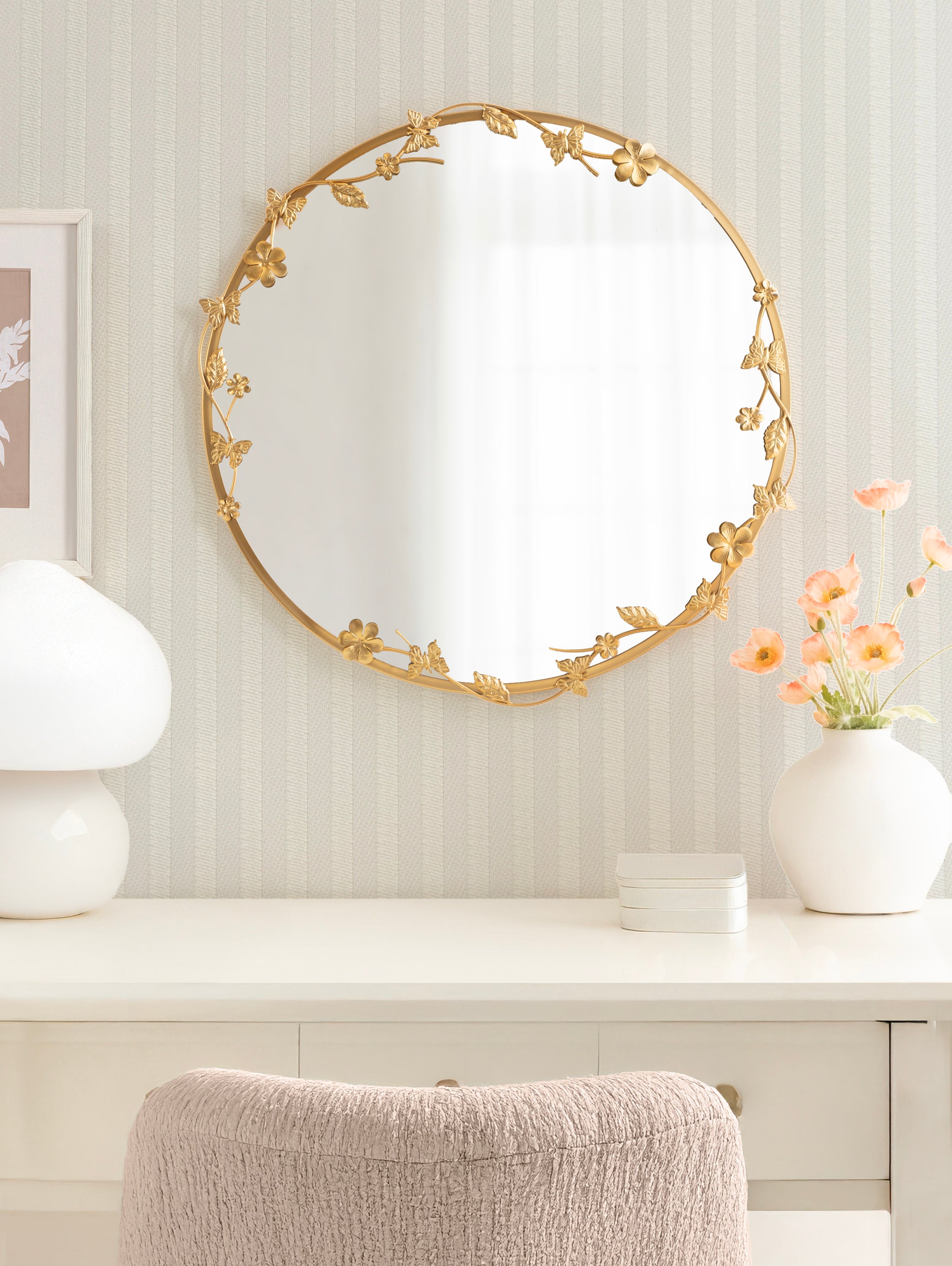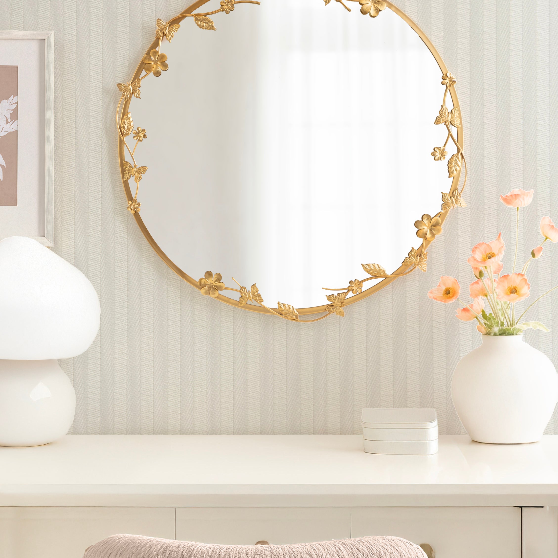Enhance the glamorous aesthetic of your home by featuring the beautiful Rosella wall mirror in your home. Inspired by modern design and glam style, the ornate mirror has a round shape with a floral and butterfly details, creating a fascinating visual piece with an elegant presence. Hang this beautiful piece of wall decor over your entryway console, above a living room mantel, or a bedroom dresser. If you're looking to renovate your powder room or master bath, the Rosella mirror also looks excellent as a bathroom mirror above a vanity! To hang the gorgeous Rosella mirror, use the metal keyhole hanger attached to the back of the frame.