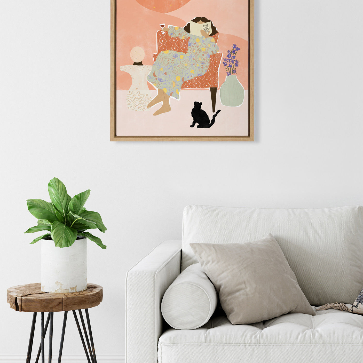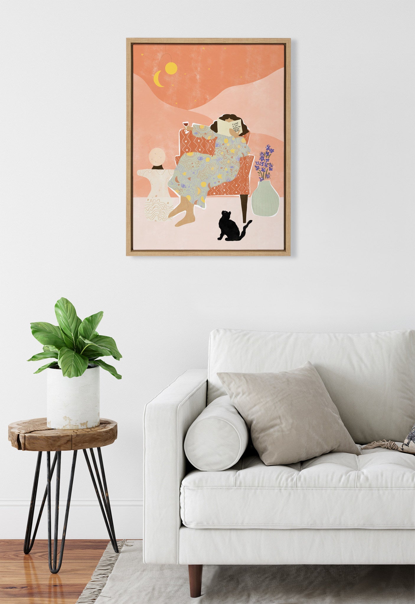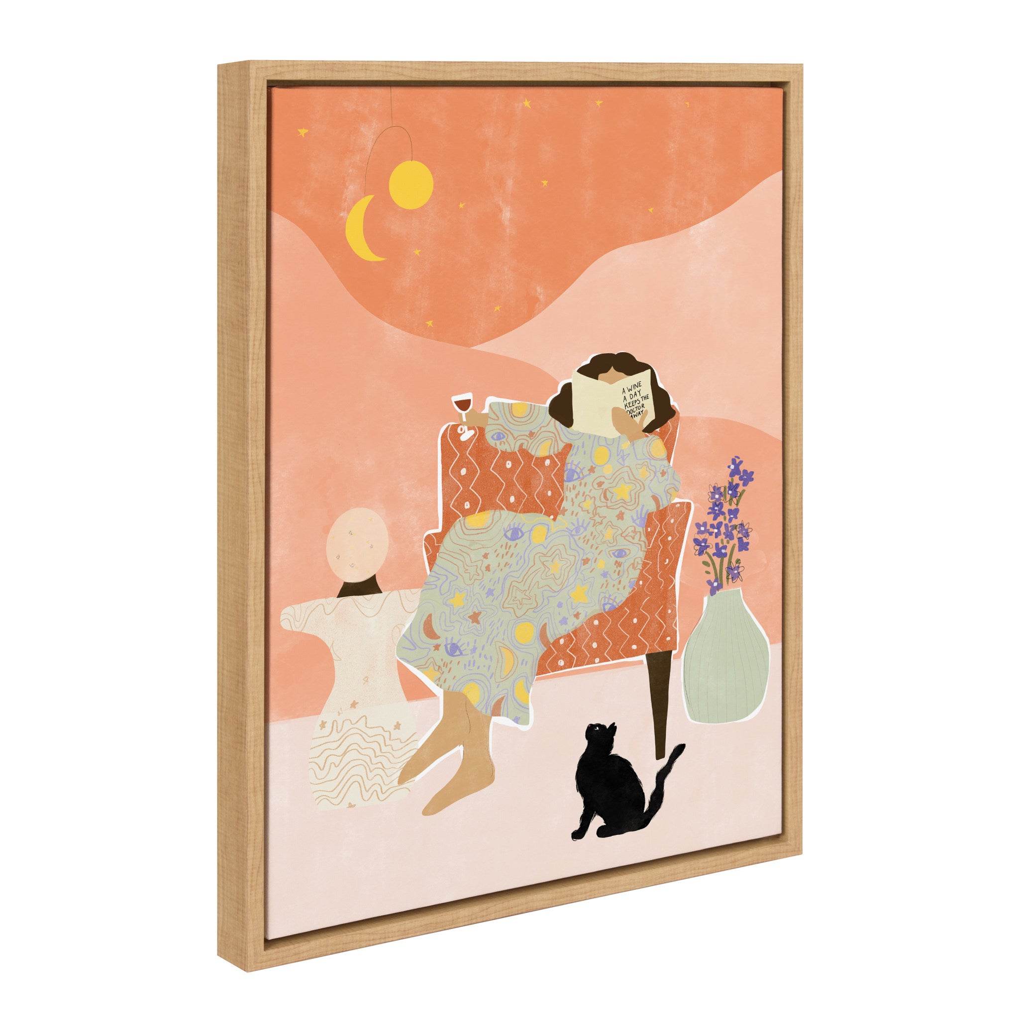 Create space for self-care with this colorful and tongue-in-cheek midcentury art print. Printed and framed in the USA in Waunakee, Wisconsin, this framed floating canvas art will be a pleasure to look at every day in your living room, bedroom, office, or any room in the home. This art print also makes an excellent gift for birthdays, holidays, or house-warming parties. Printed on gallery-wrapped canvas and framed with a lightweight polystyrene frame, this wall art has two hangers already attached to the MDF back for easy wall display.