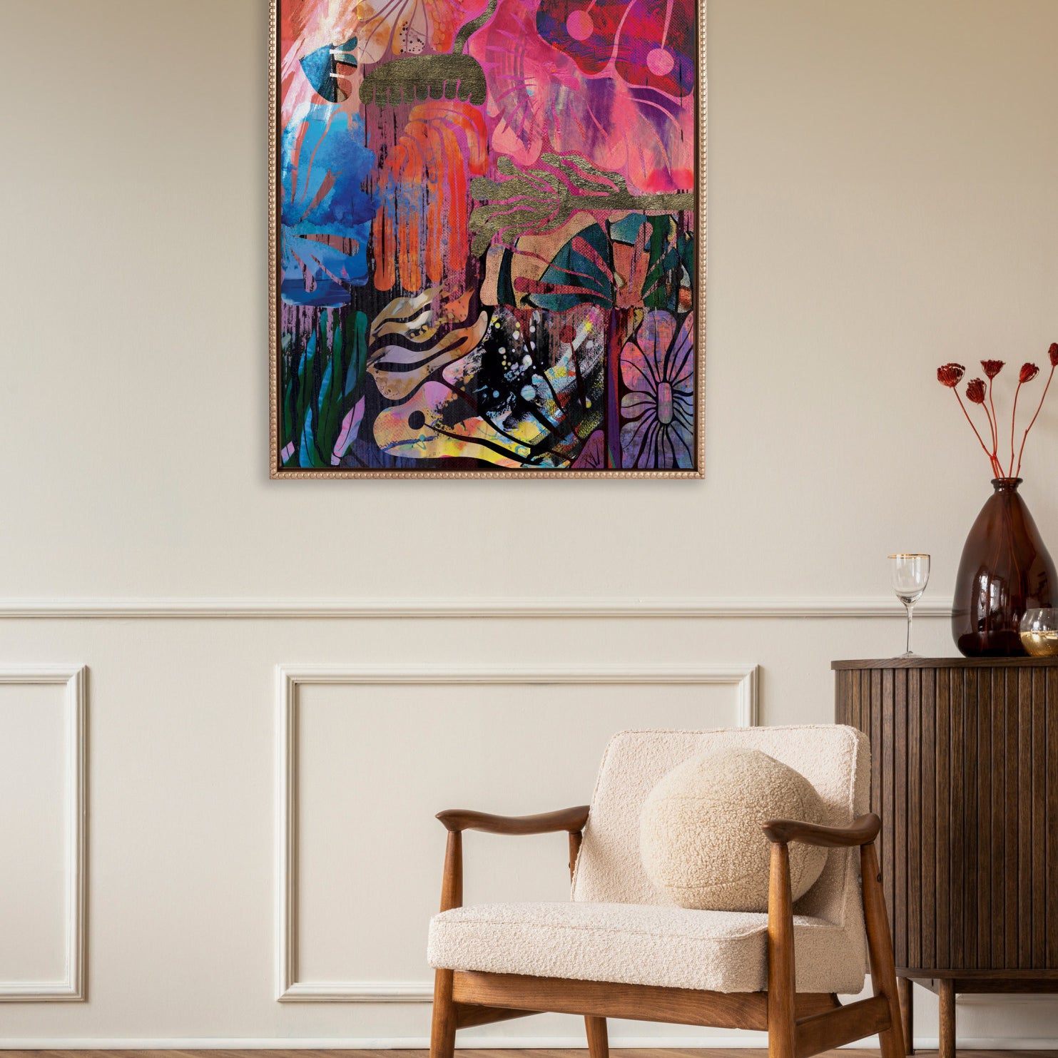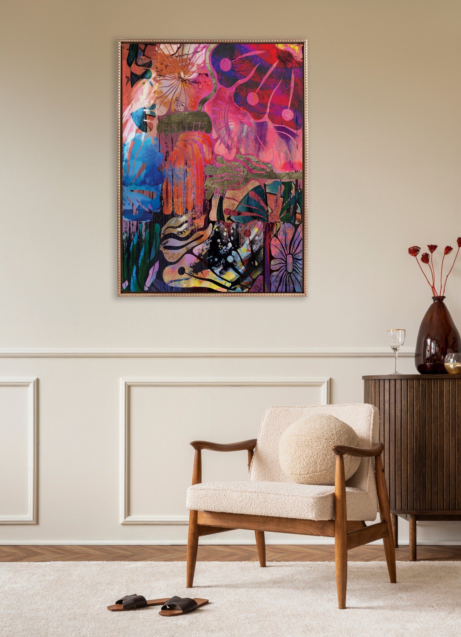 This artwork presents a colorful and abstract geometric masterpiece, featuring intricate patterns that bring a burst of energy to your decor. Printed and framed in the USA in Waunakee, Wisconsin, this vintage beaded framed floating canvas art will be a pleasure to look at every day in your living room, bedroom, office, or any room in the home. This art also makes an excellent gift for birthdays, holidays, or house-warming parties. Printed on gallery-wrapped canvas and framed with a lightweight polystyrene frame, this wall art is easy to display on the wall.