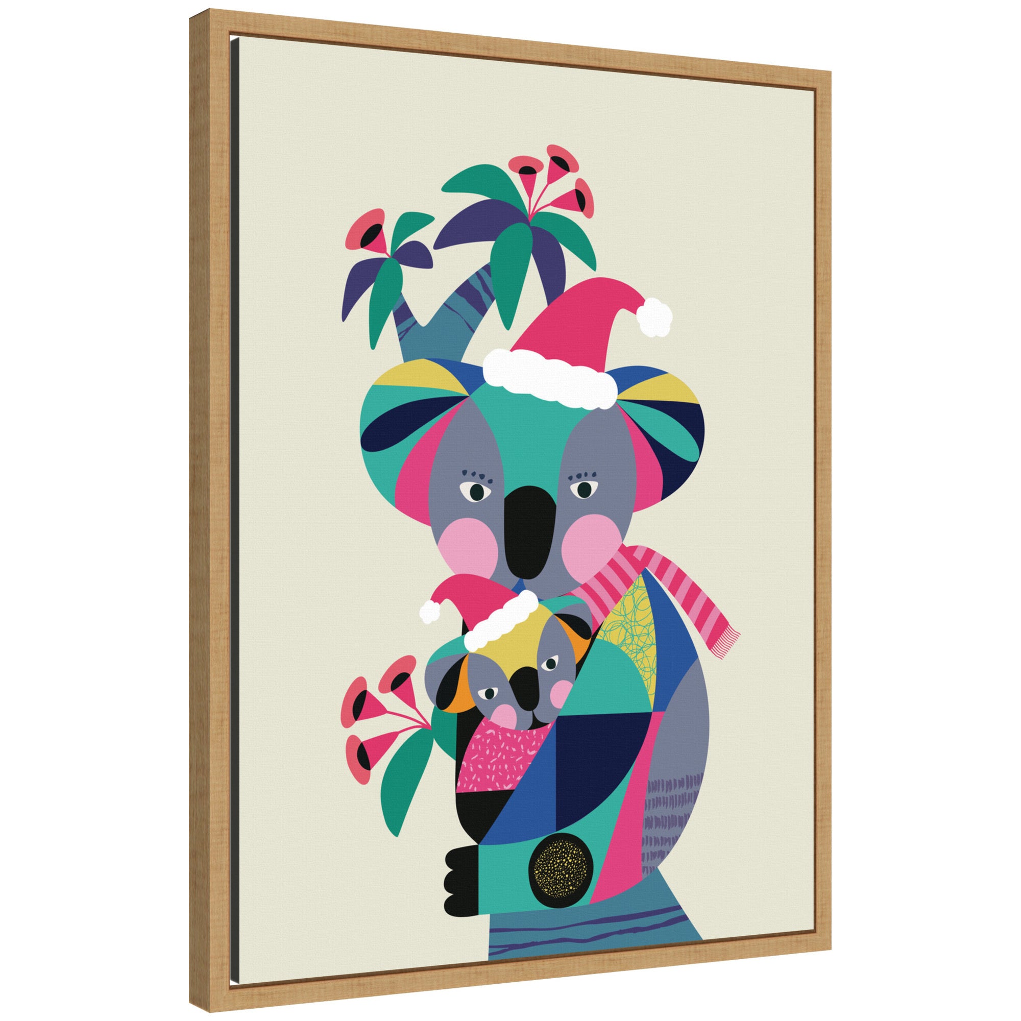 Elevate your space through thoughtfully curated style with this stunning piece designed by independent artist Rachel Lee and beautifully framed by hand in Madison, WI. The image is giclee printed using fade-resistant inks, ensuring every detail comes to life in rich, lasting color. Set in designer moulding, its a Whimsical accent crafted to make a statement. Visual Story: The artwork features a vibrant, abstract rendition of two koalas wearing festive Santa hats. The design is geometric and colorful, incorporating bold shapes and patterns. The playful composition exudes a whimsical and modern charm.