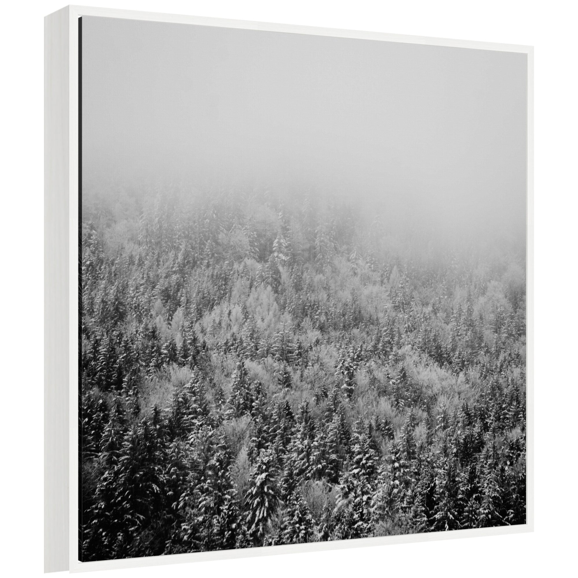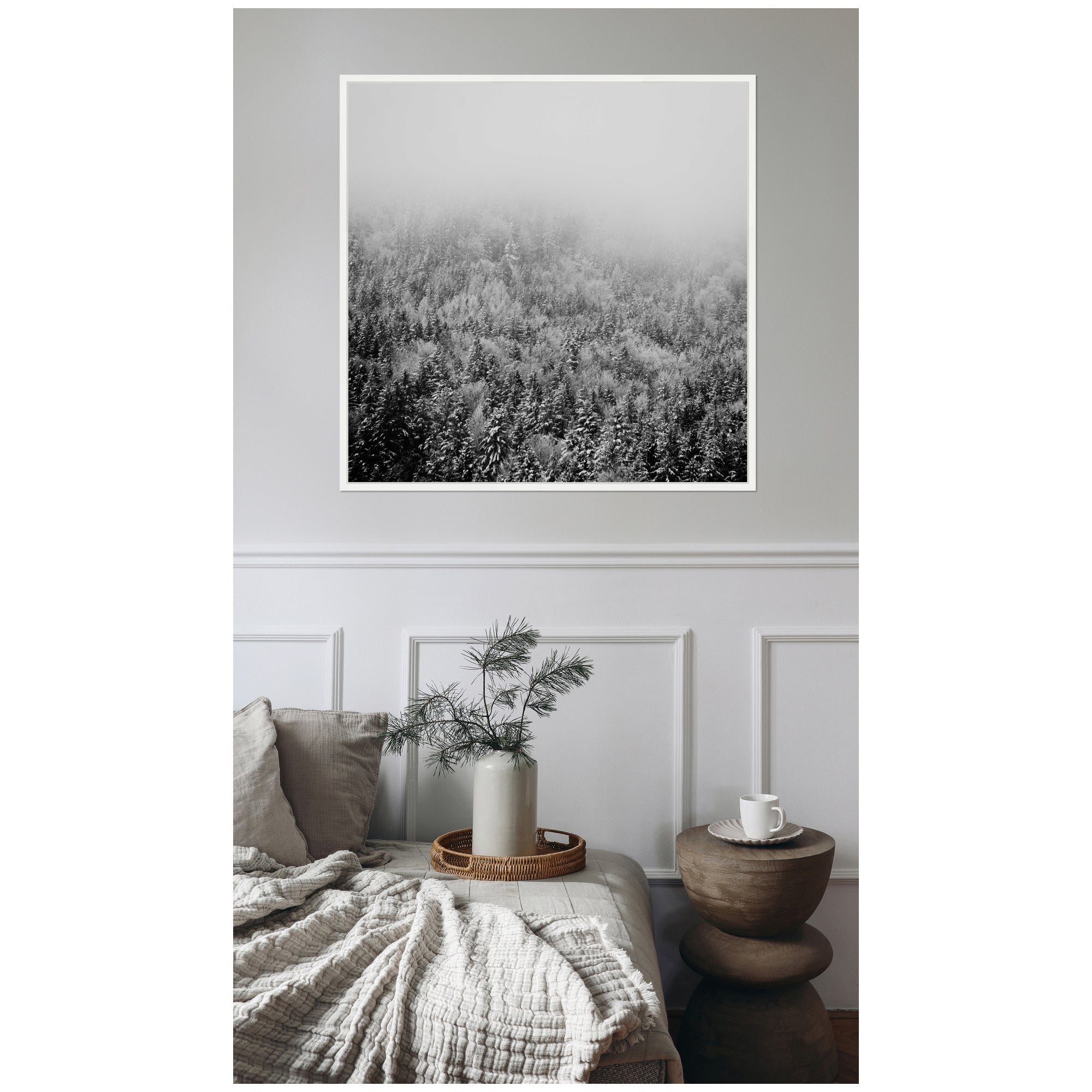 Elevate your space through thoughtfully curated style with this stunning piece designed by independent artist Laura Evans and beautifully framed by hand in Madison, WI. The image is giclee printed using fade-resistant inks, ensuring every detail comes to life in rich, lasting color. Set in designer moulding, its a Rustic Farmhouse accent crafted to make a statement. Visual Story: The image captures a tranquil winter forest shrouded in soft, white fog. Snow-dusted trees stretch across the landscape, creating a serene and peaceful scene. The monochrome palette enhances the quiet beauty and calmness of nature.