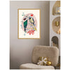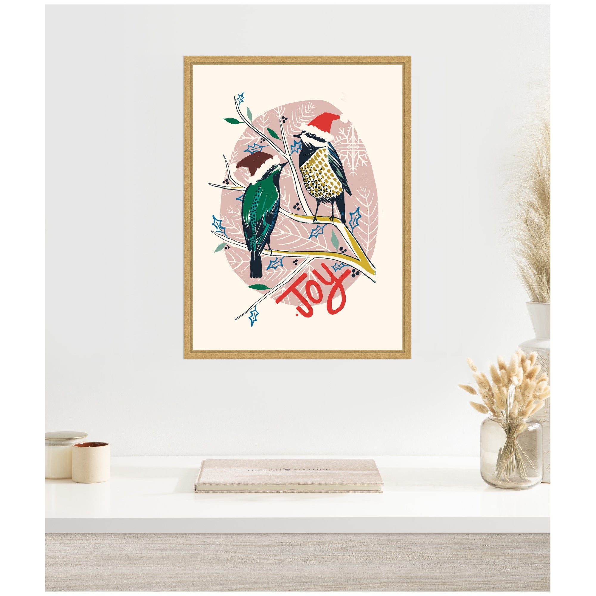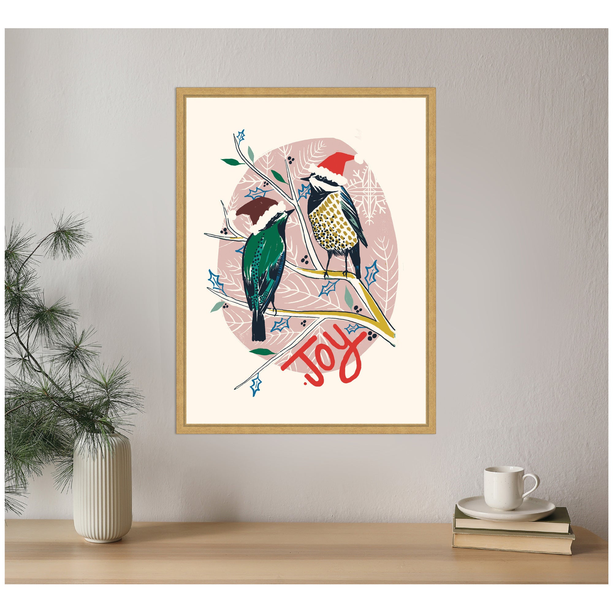 Elevate your space through thoughtfully curated style with this stunning piece designed by independent artist Hannah Beisang and beautifully framed by hand in Madison, WI. The image is giclee printed using fade-resistant inks, ensuring every detail comes to life in rich, lasting color. Set in designer moulding, its a Whimsical accent crafted to make a statement. Visual Story: The artwork features two birds wearing Santa hats perched on a branch, set against a circular backdrop with subtle snowflake and leaf patterns. The word "Joy" is prominently displayed in bold red letters at the bottom. The use of vibrant colors and holiday-themed details creates a festive and cheerful atmosphere.