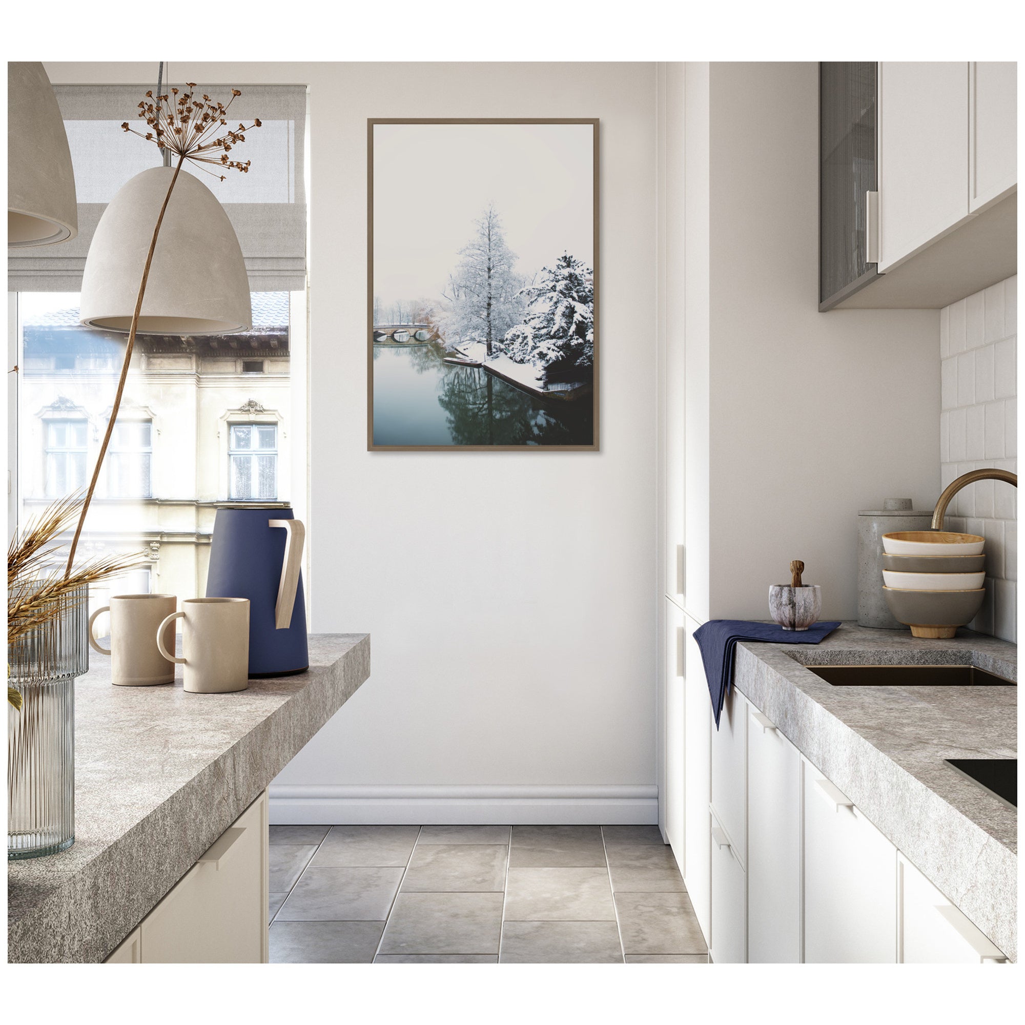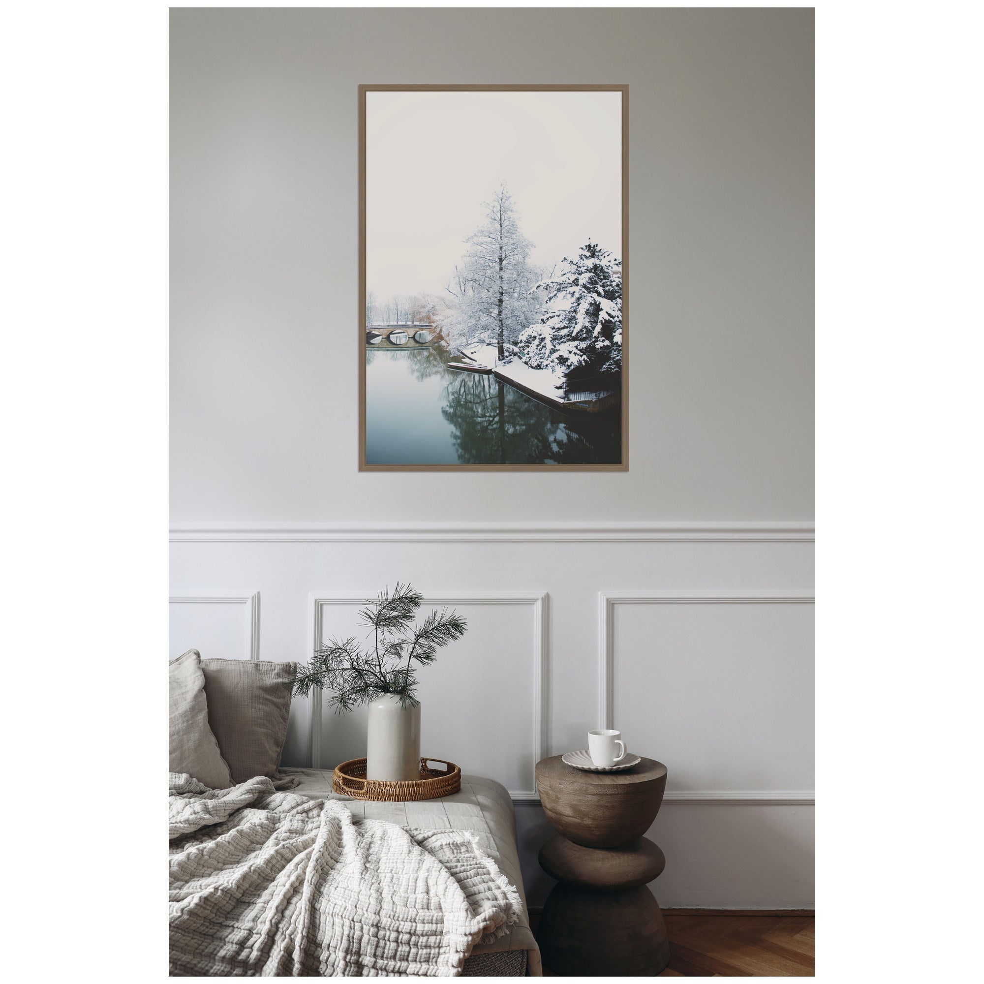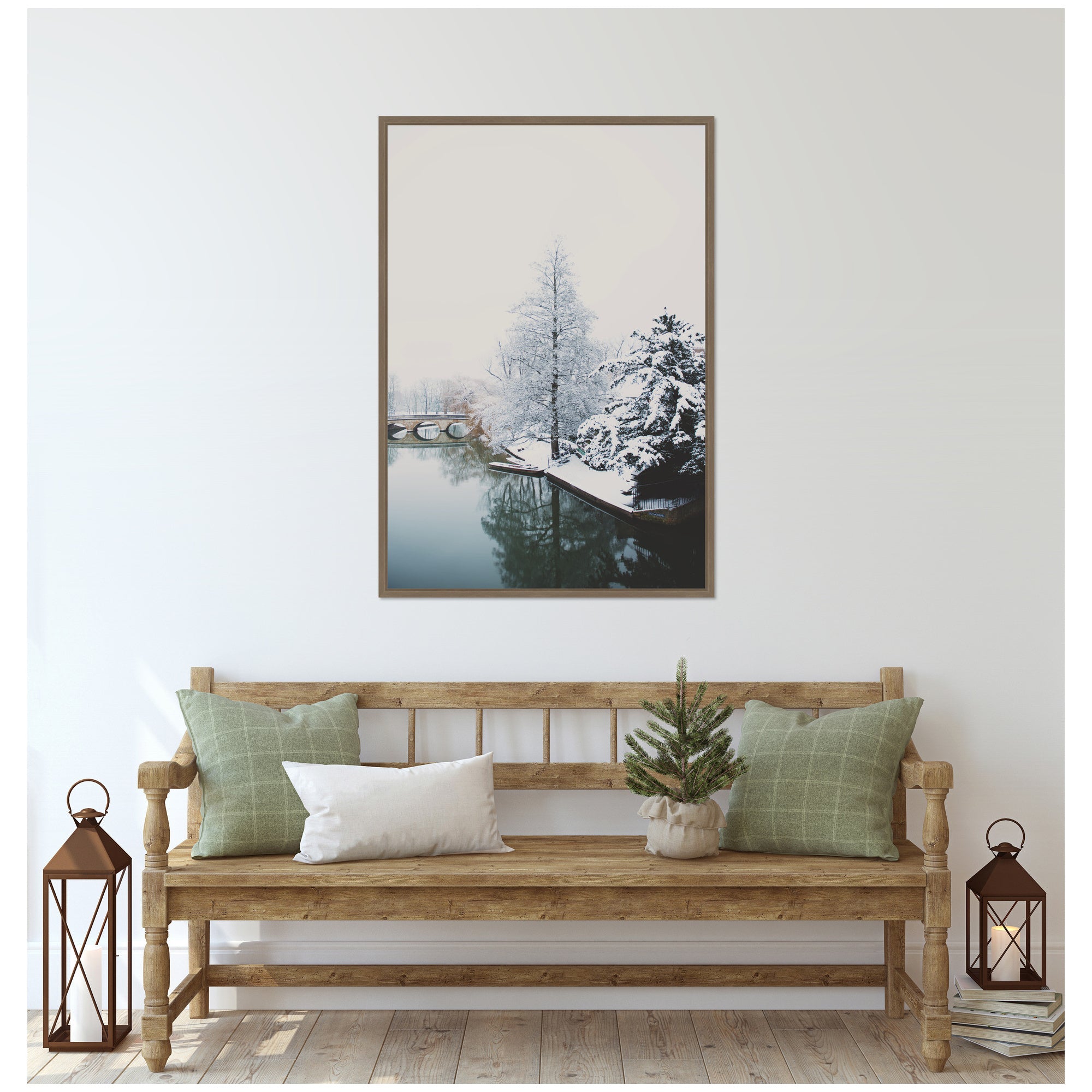 Elevate your space through thoughtfully curated style with this stunning piece designed by independent artist Laura Evans and beautifully framed by hand in Madison, WI. The image is giclee printed using fade-resistant inks, ensuring every detail comes to life in rich, lasting color. Set in designer moulding, its a Rustic Farmhouse accent crafted to make a statement. Visual Story: The image portrays a tranquil winter scene with a snow-covered landscape. A calm river reflects the surrounding snowy trees and an arched stone bridge. The atmosphere is serene and peaceful, evoking a sense of quiet and stillness.