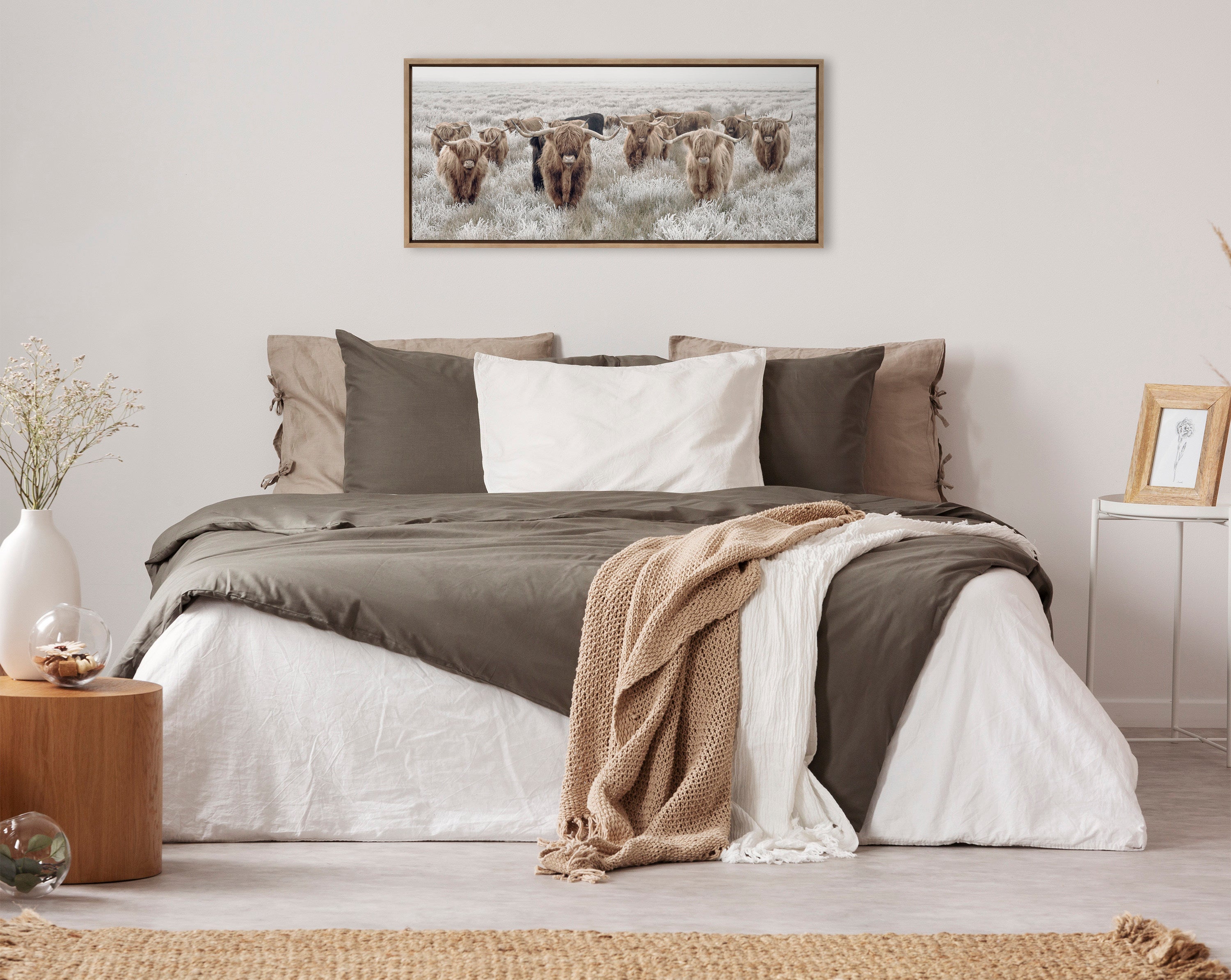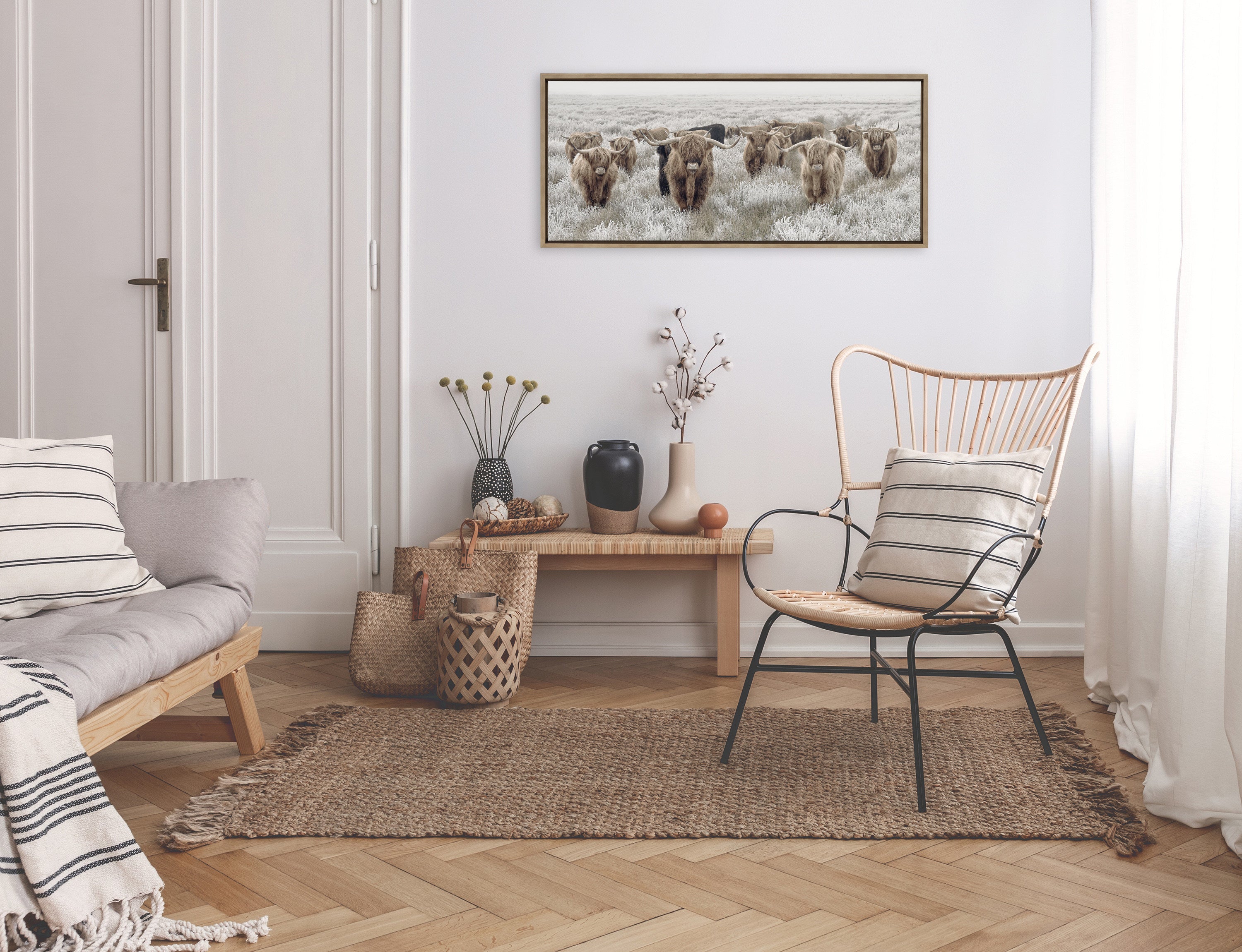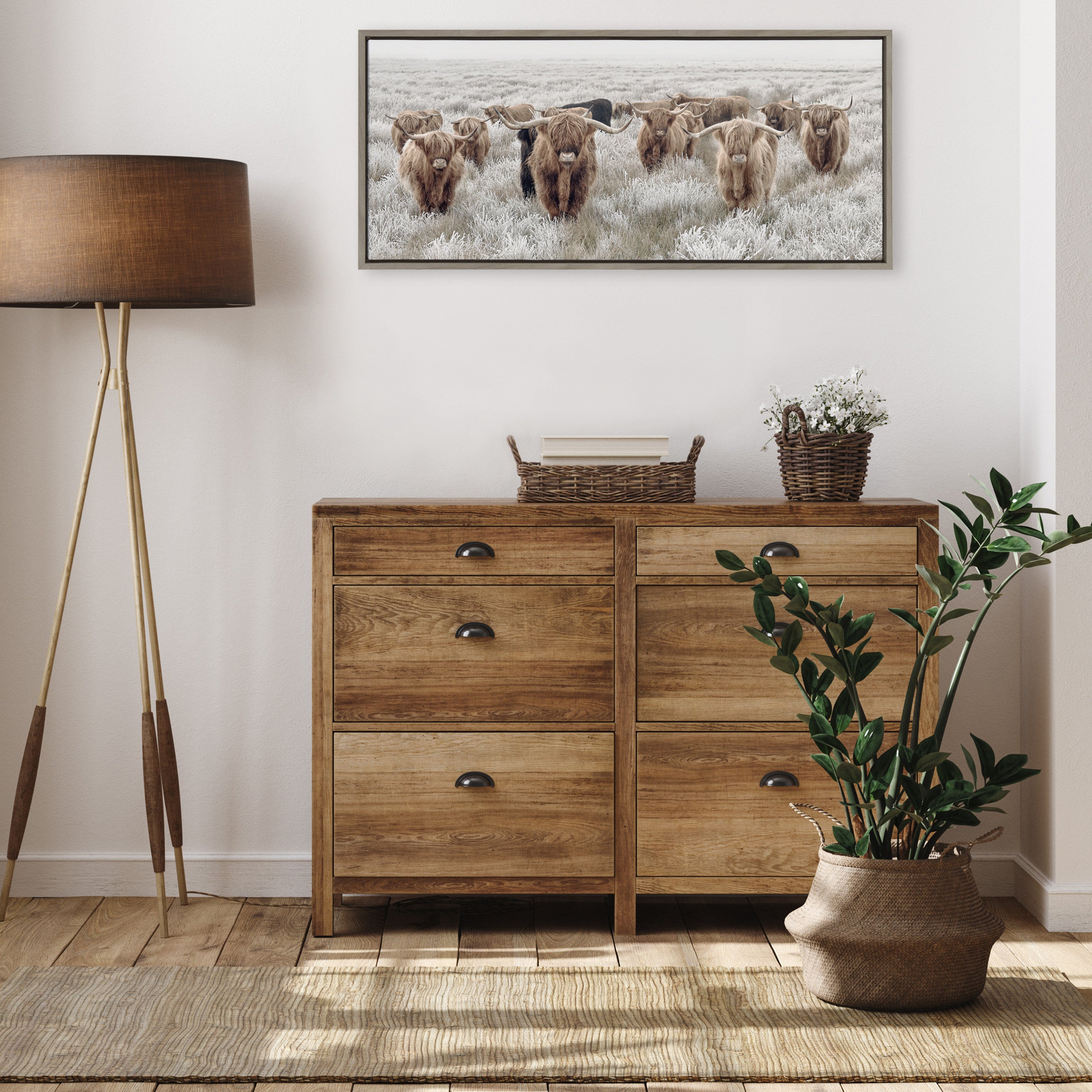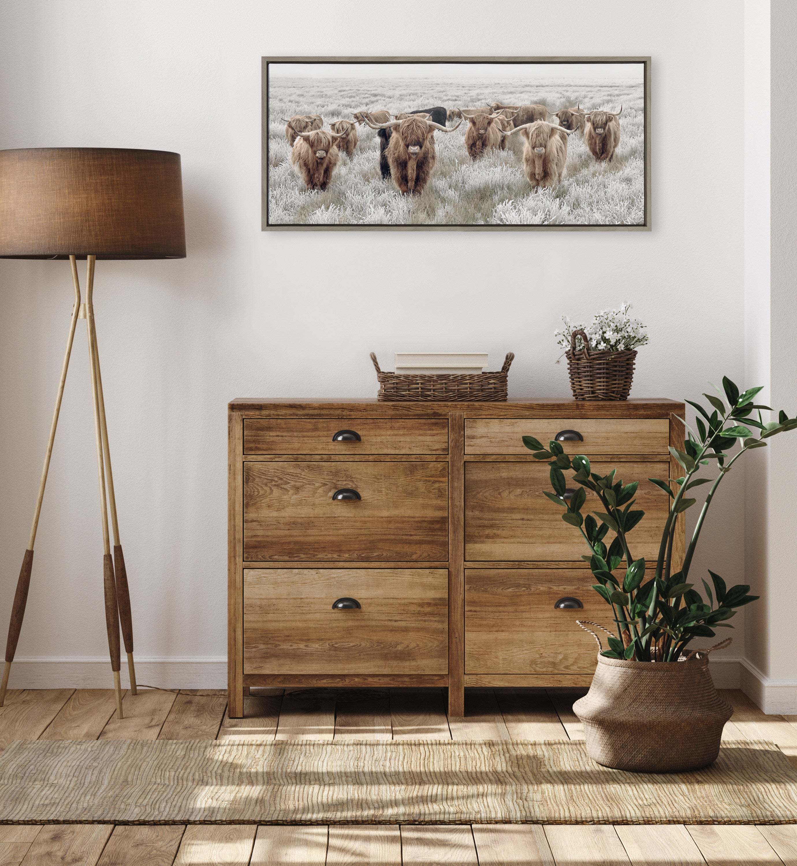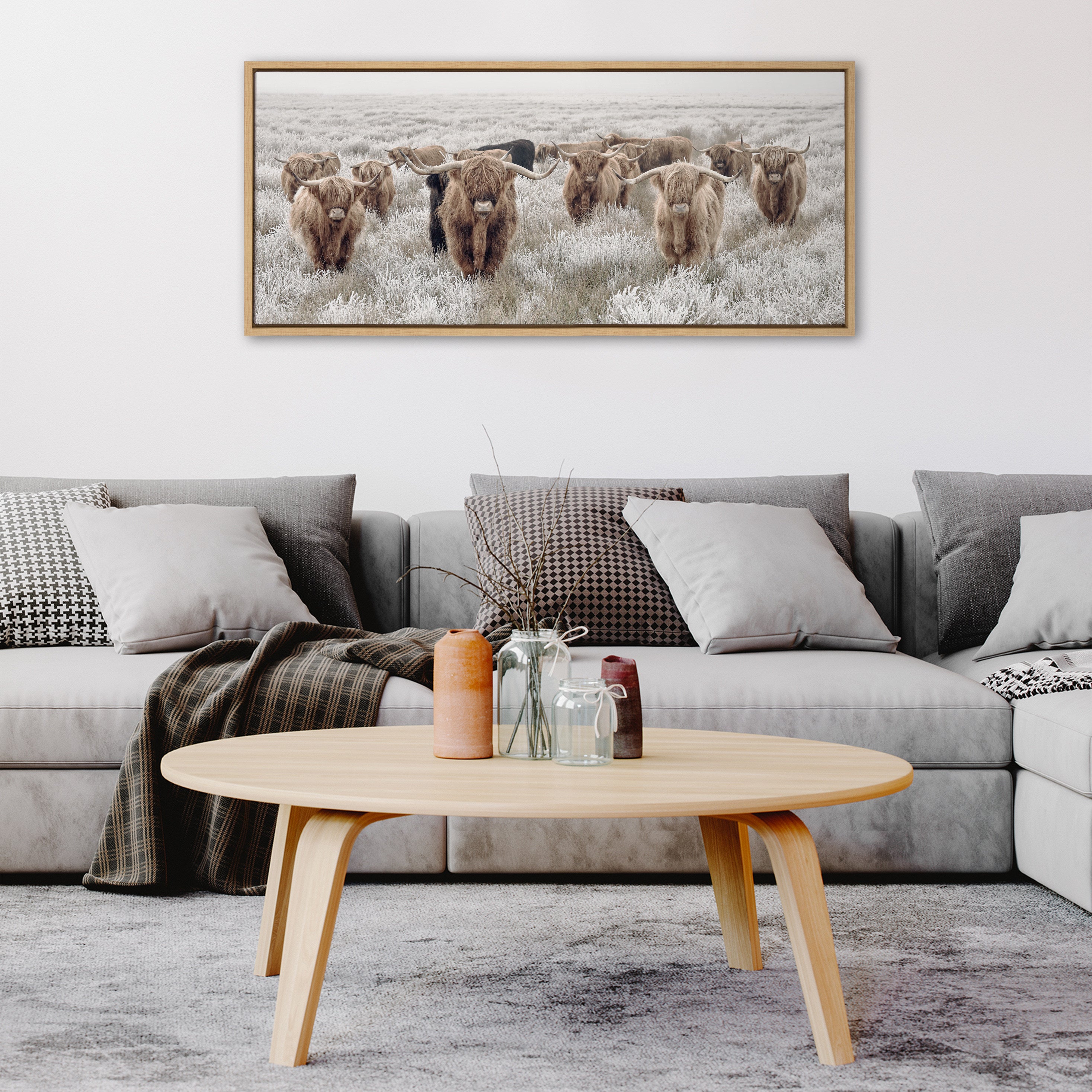 Bring rustic beauty to your farmhouse decor with this majestic cow art print. Printed and framed in the USA in Waunakee, Wisconsin, this framed floating canvas art will be a pleasure to look at every day in your living room, bedroom, office, or any room in the home. This art print also makes an excellent gift for birthdays, holidays, or house-warming parties. Printed on gallery-wrapped canvas and framed with a lightweight polystyrene frame, this wall art is easy to display on the wall.