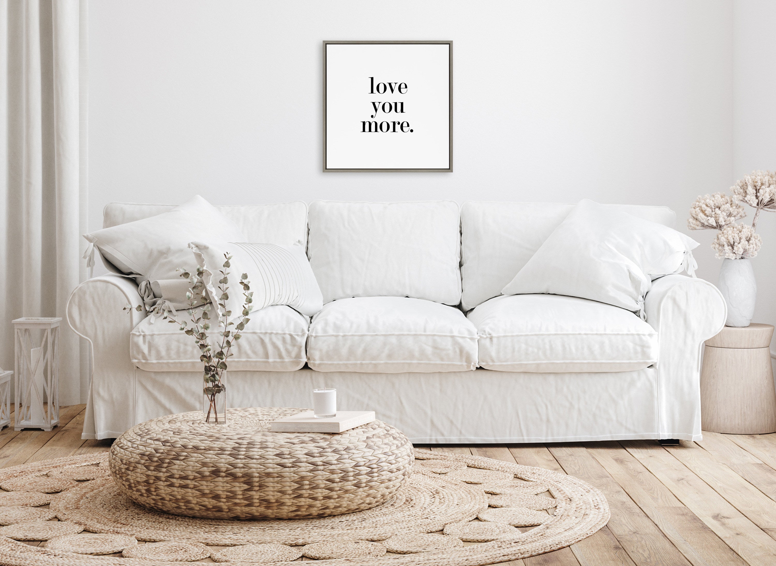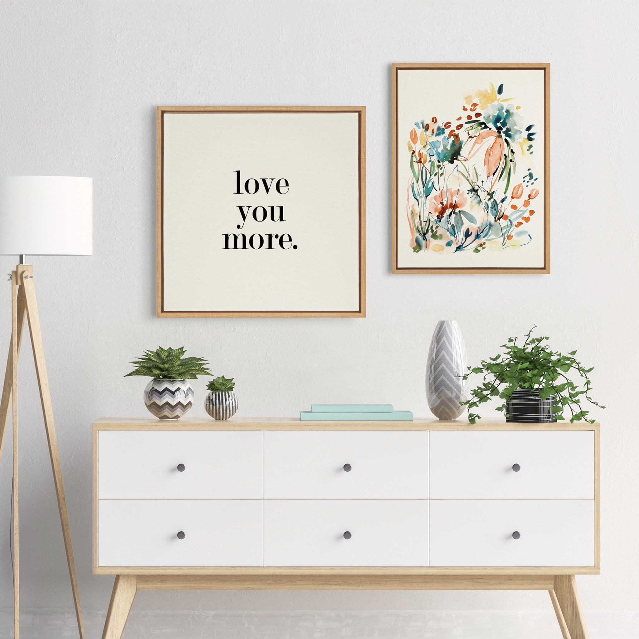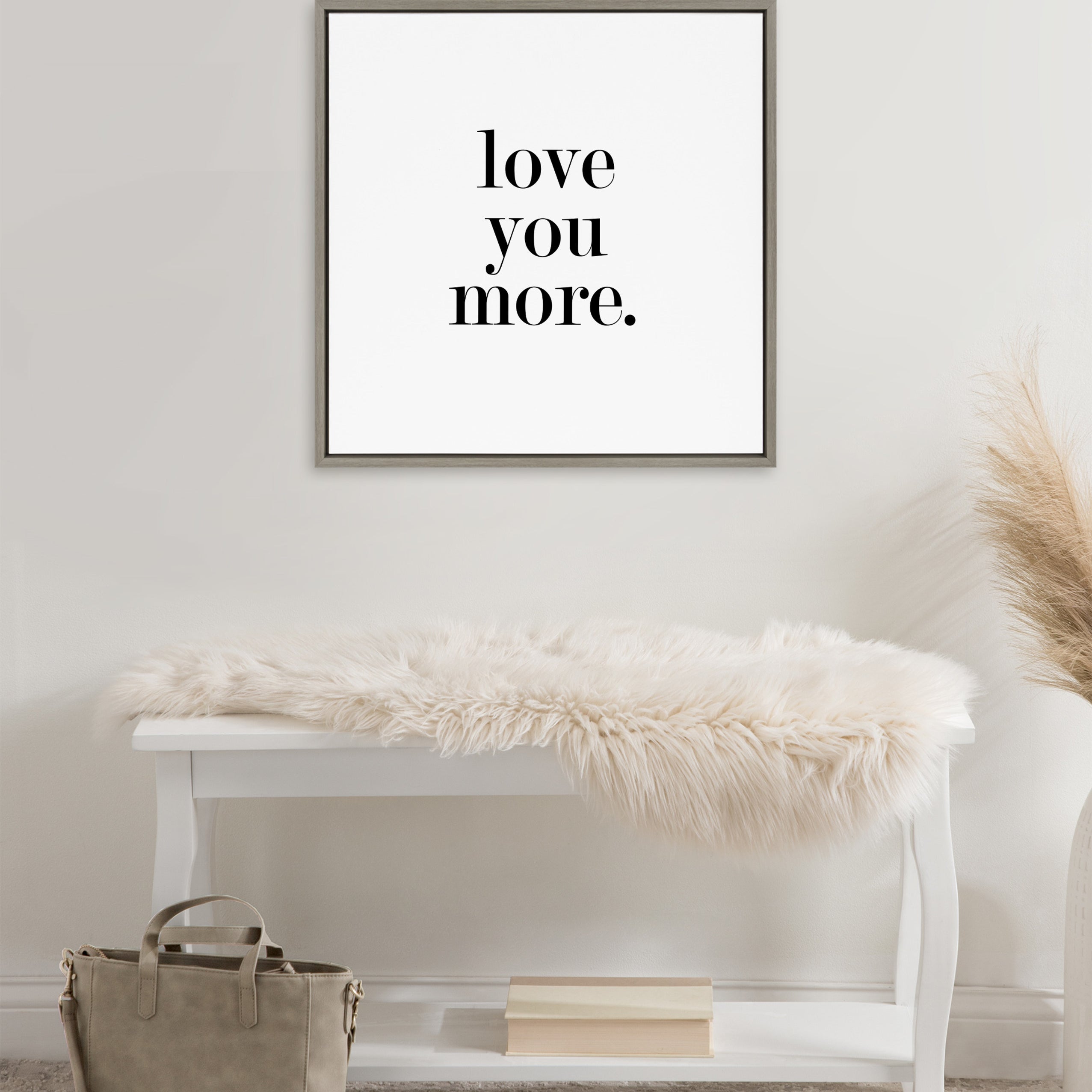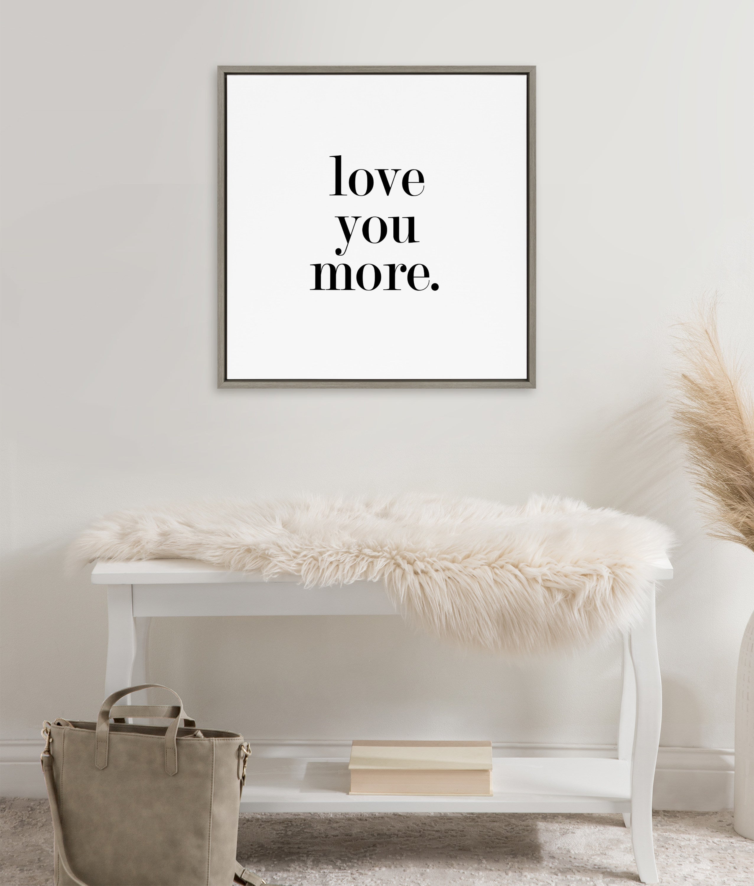 Featuring the tender phrase "Love You More," this canvas wall art by Maggie Price of Hunt and Gather Goods brings a romantic touch to your decor. Printed and framed in the USA in Waunakee, Wisconsin, this framed floating canvas art will be a pleasure to look at every day in your living room, bedroom, office, or any room in the home. This art also makes an excellent gift for birthdays, holidays, or house-warming parties. Printed on gallery-wrapped canvas and framed with a lightweight polystyrene frame, this wall art is easy to display on the wall.