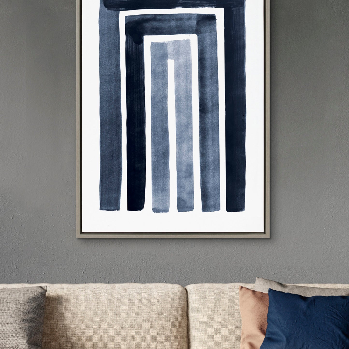 Show off your chic abstract taste in art with this lovely blue art print characterized by mesmerizing and geometric arches. Printed and framed in the USA in Waunakee, Wisconsin, this framed floating canvas art will be a pleasure to look at every day in your living room, bedroom, office, or any room in the home. This art print also makes an excellent gift for birthdays, holidays, or house-warming parties. Printed on gallery-wrapped canvas and framed with a lightweight polystyrene frame, this wall art has two hangers already attached to the MDF back for easy wall display.