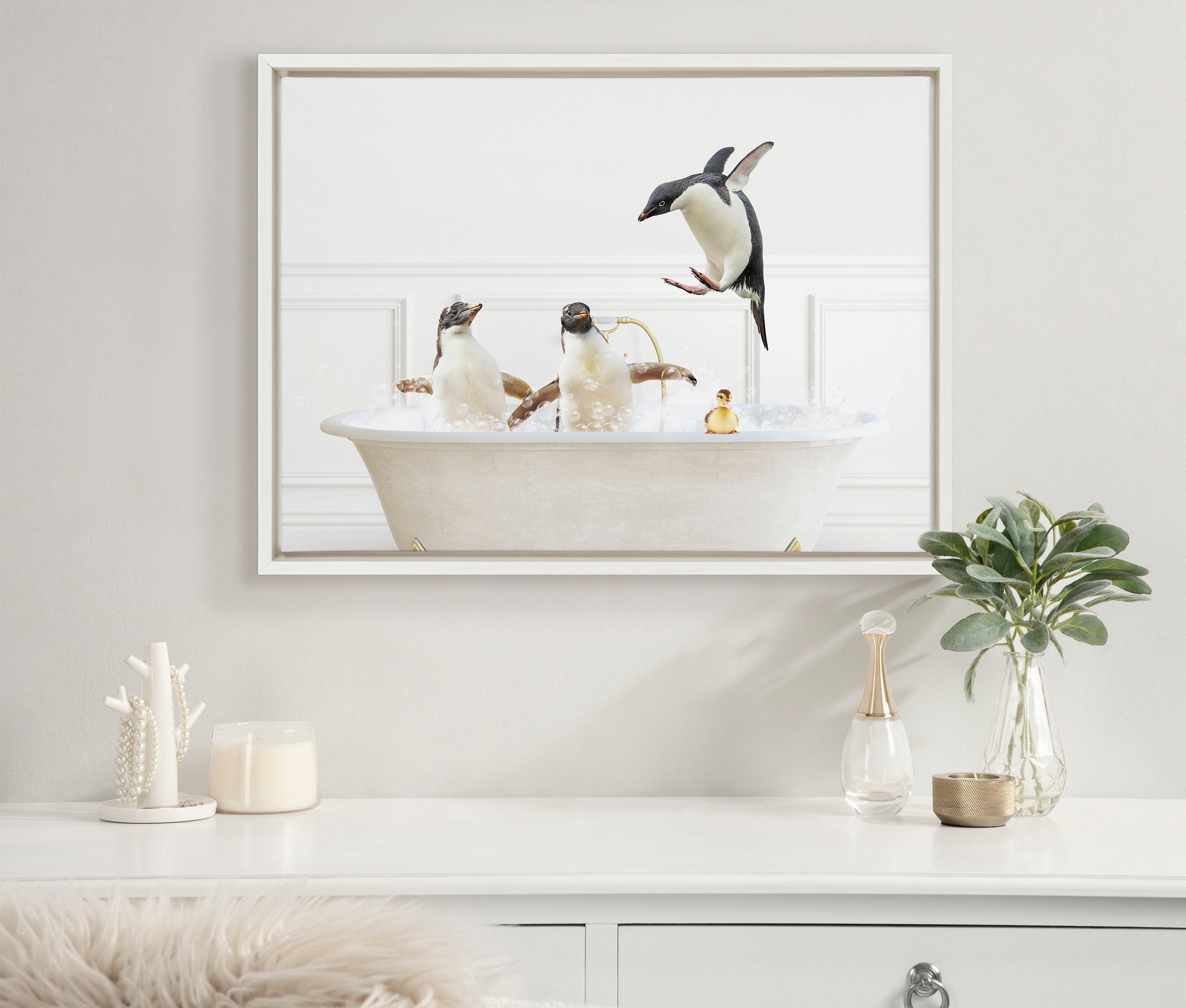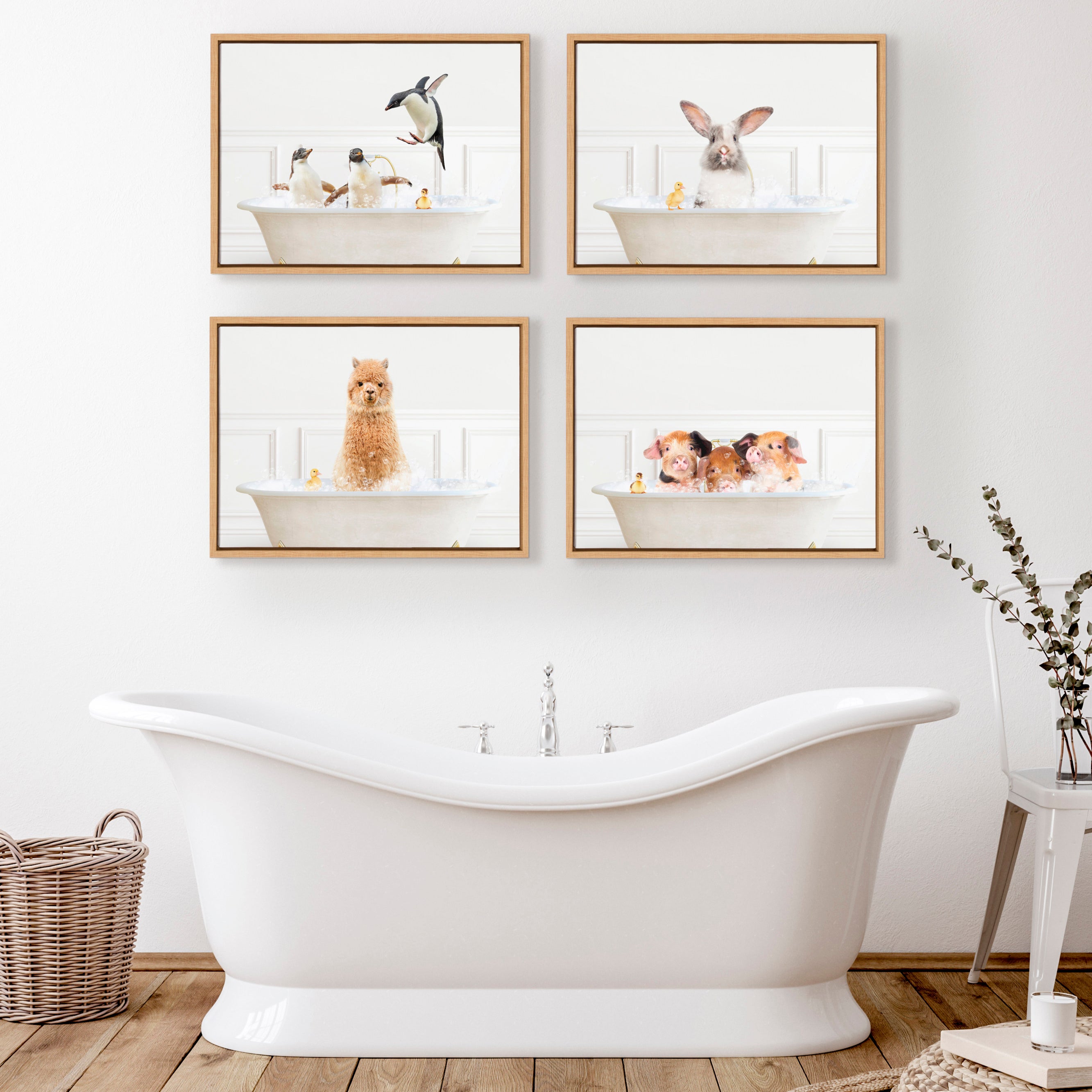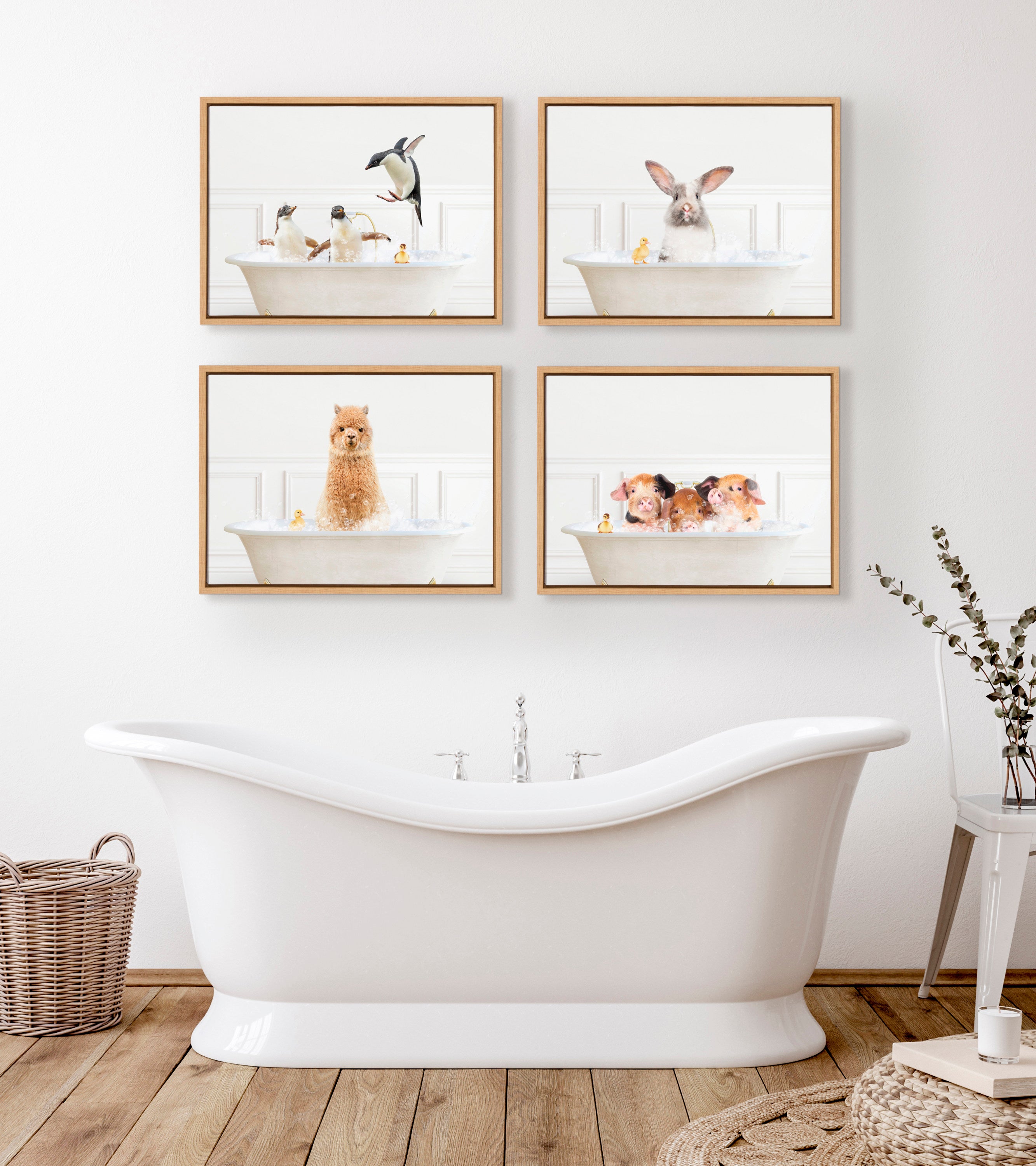Bring fun to bath time with this adorable animal print for your bathroom. Printed and framed in the USA in Waunakee, Wisconsin, this framed floating canvas art will be a pleasure to look at every day in your living room, bedroom, office, or any room in the home. This art print also makes an excellent gift for birthdays, holidays, or house-warming parties. Printed on gallery-wrapped canvas and framed with a lightweight polystyrene frame, this wall art is easy to display on the wall.