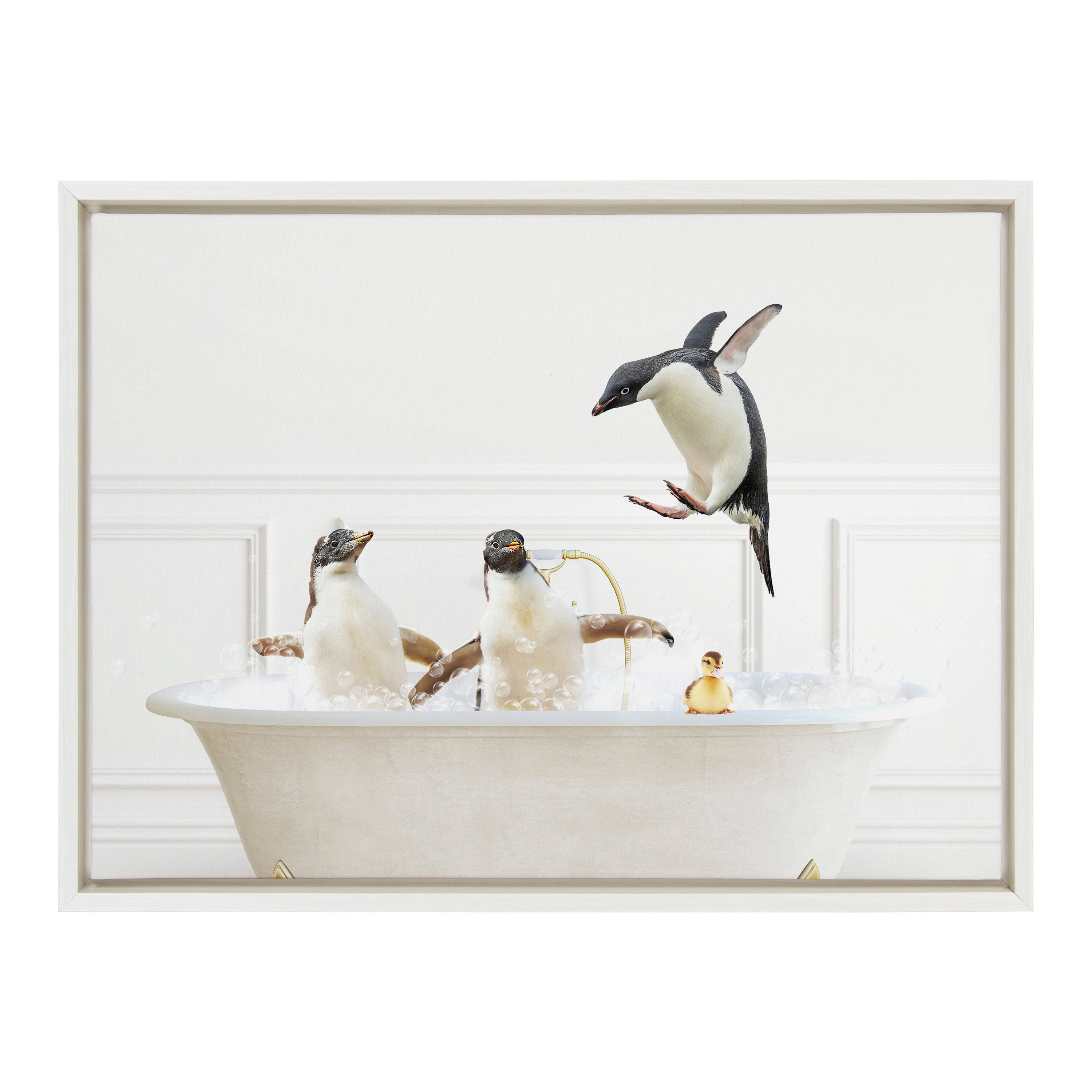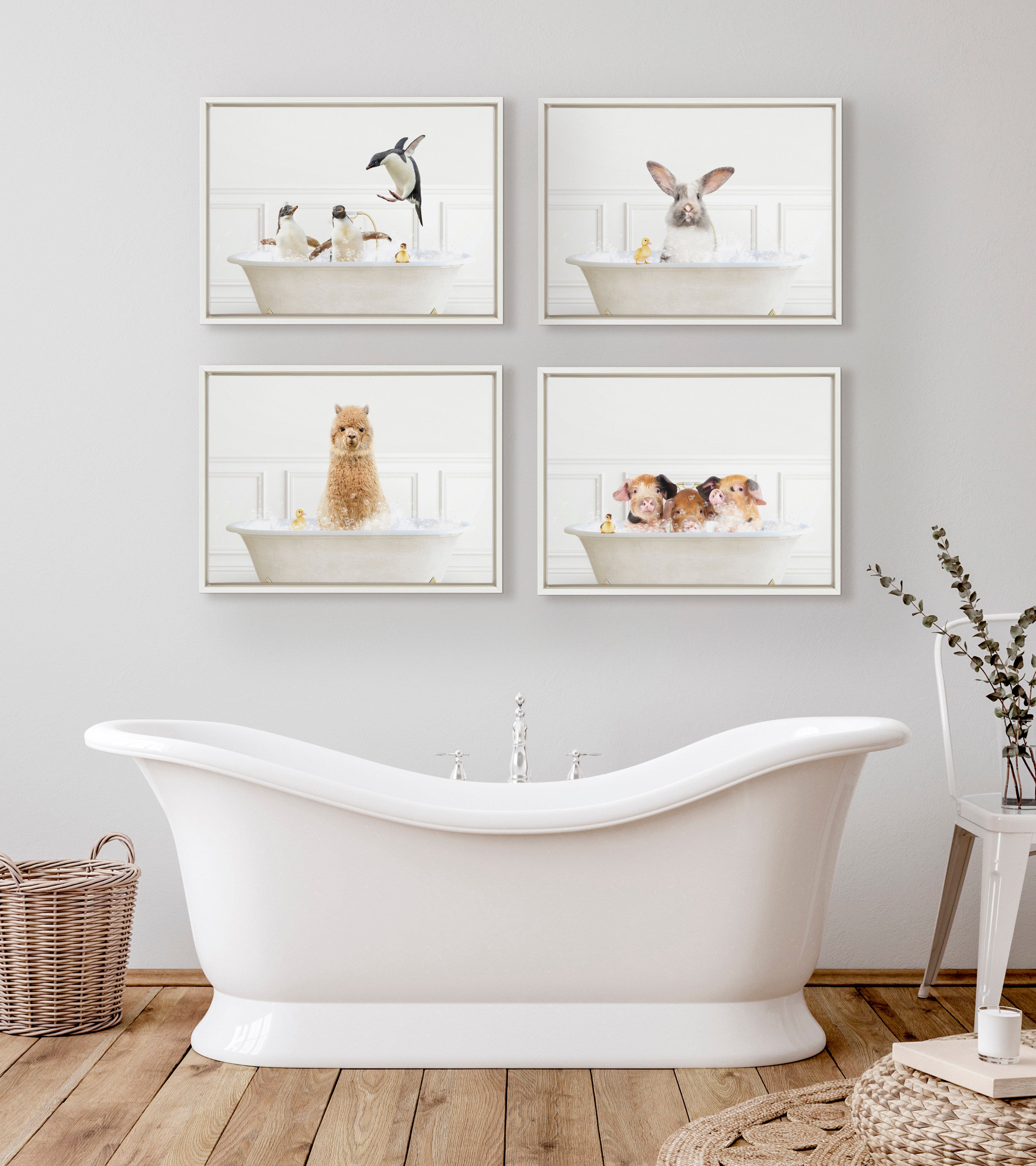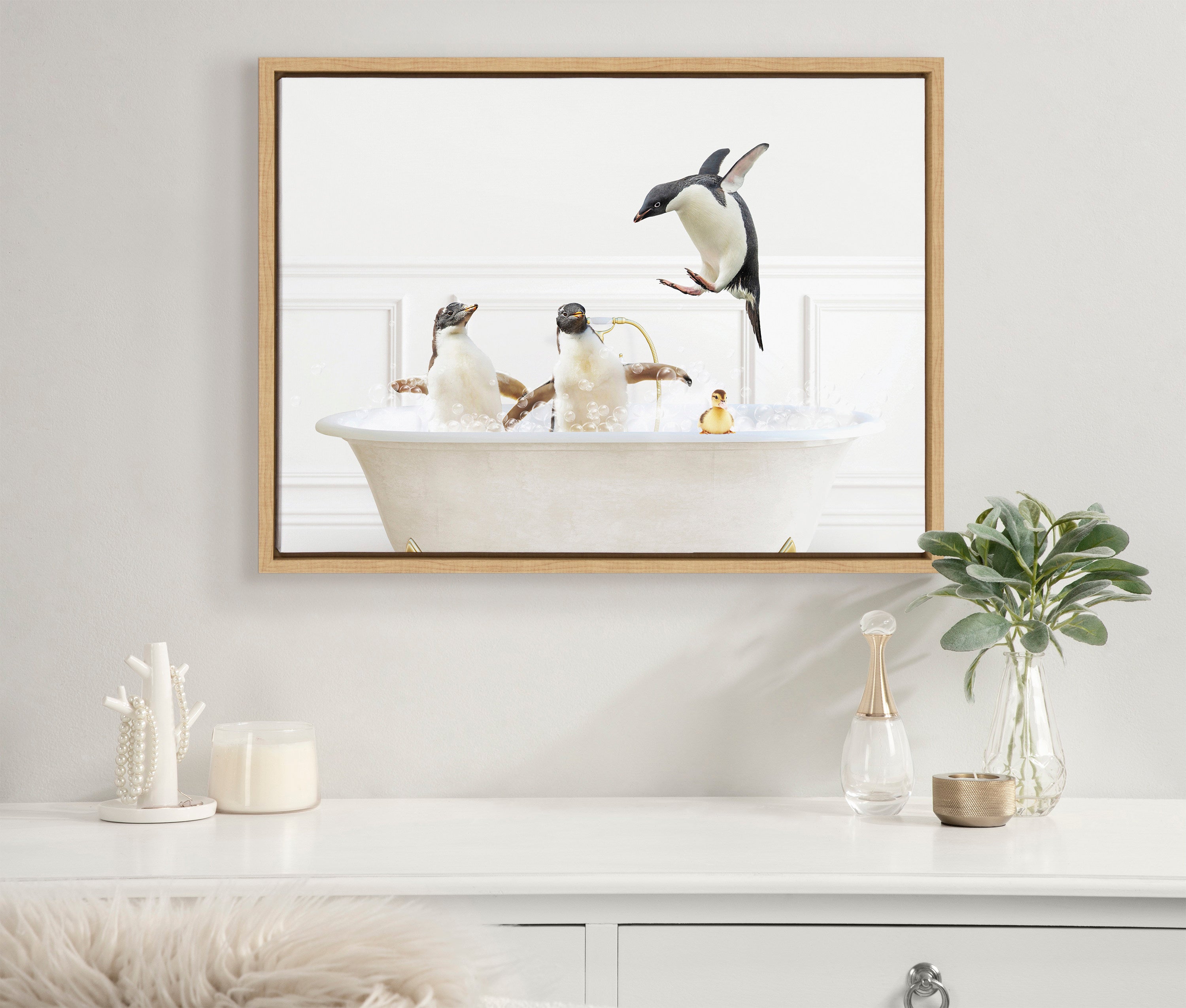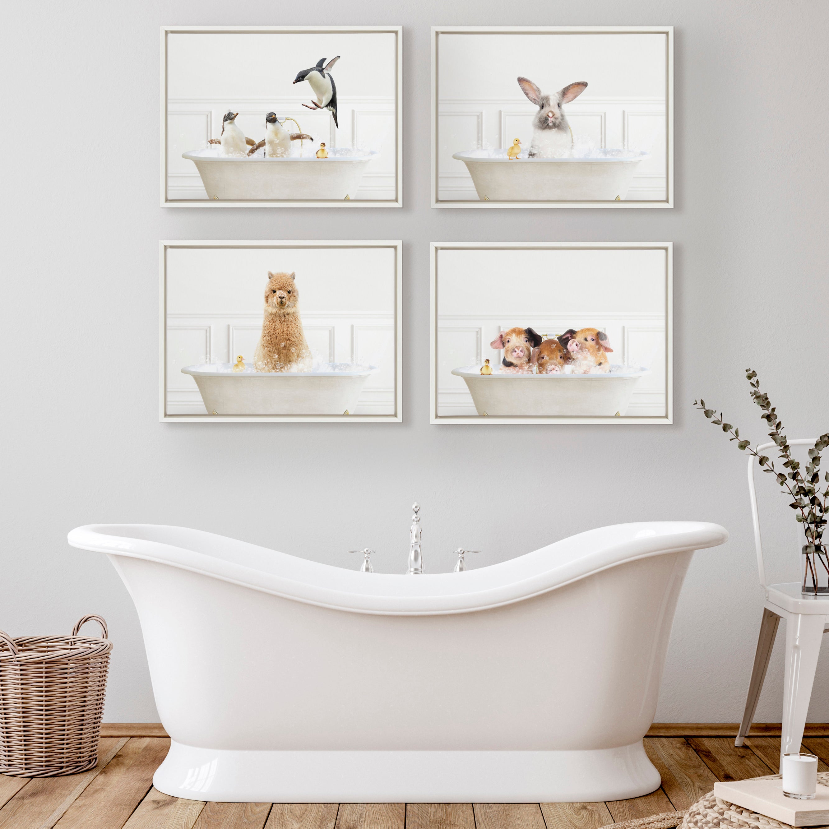 Bring fun to bath time with this adorable animal print for your bathroom. Printed and framed in the USA in Waunakee, Wisconsin, this framed floating canvas art will be a pleasure to look at every day in your living room, bedroom, office, or any room in the home. This art print also makes an excellent gift for birthdays, holidays, or house-warming parties. Printed on gallery-wrapped canvas and framed with a lightweight polystyrene frame, this wall art is easy to display on the wall.