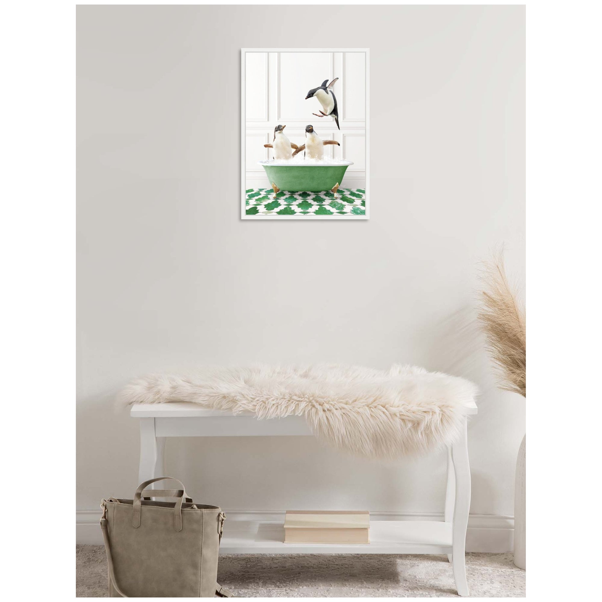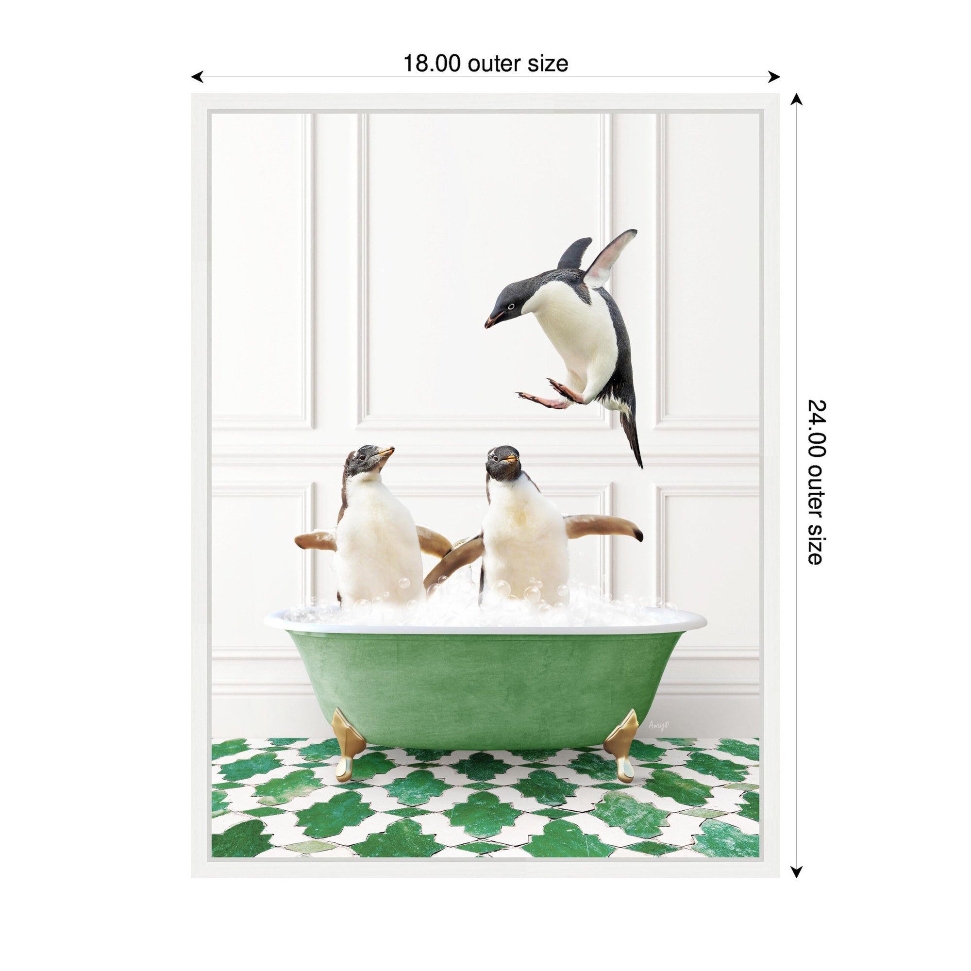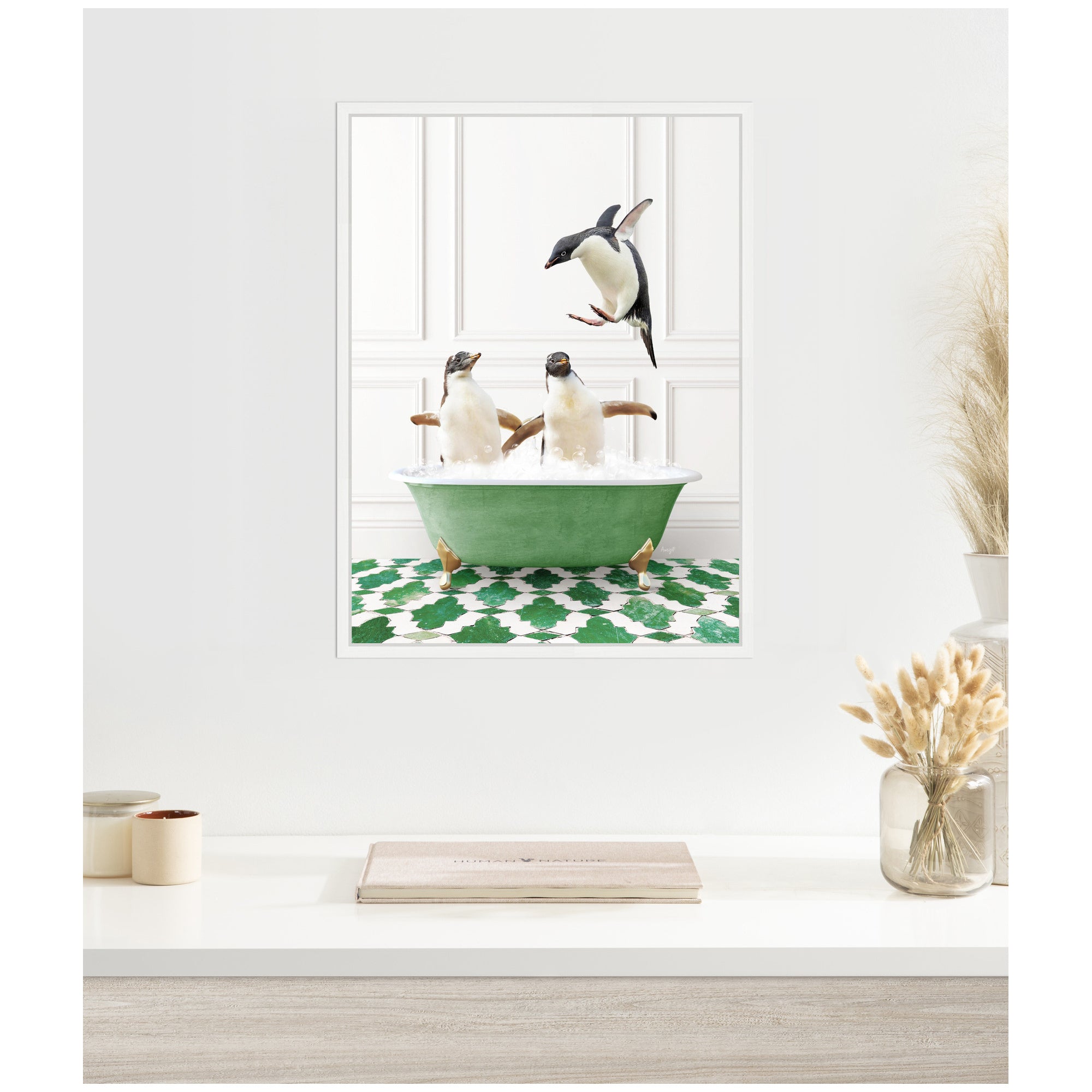Sylvie Penguins in Eclectic Green Panel Wall Bathtub Framed Canvas by Amy Peterson