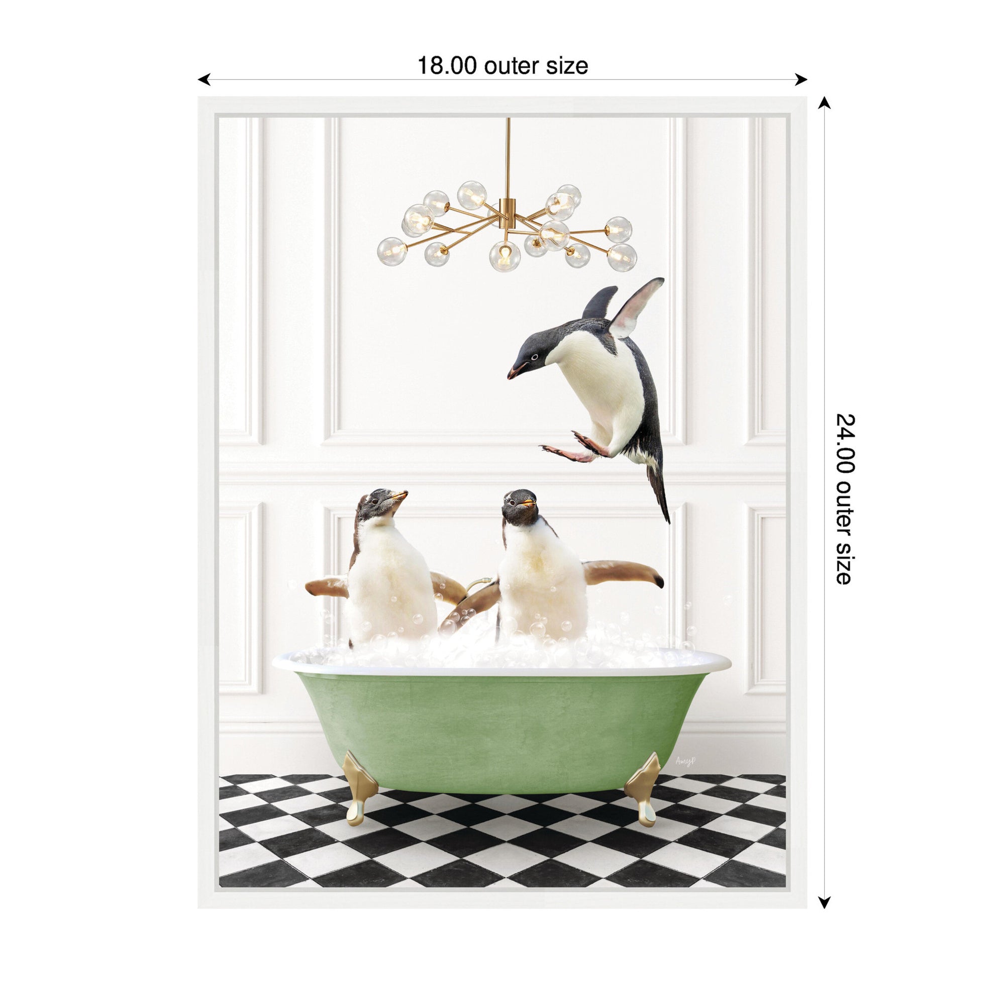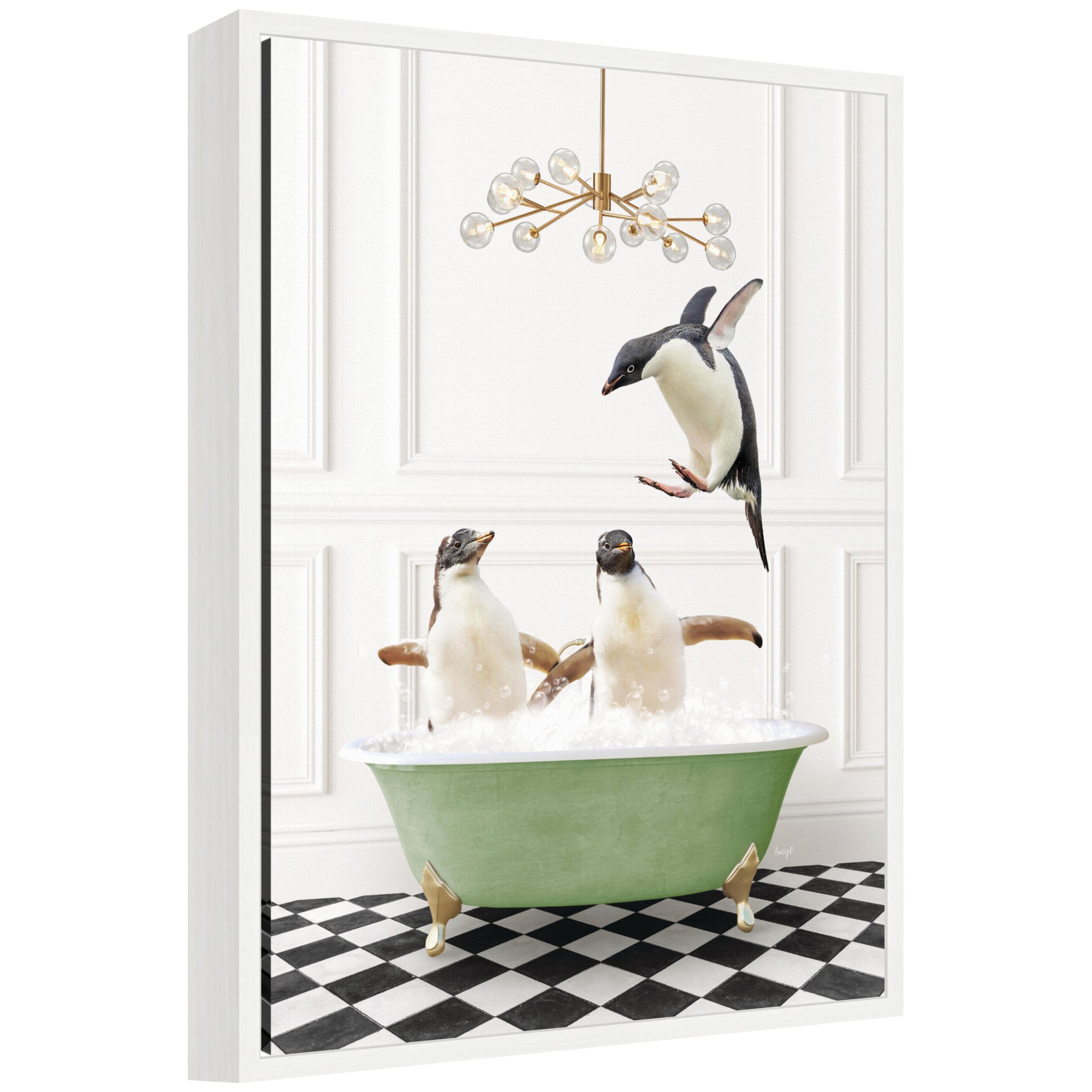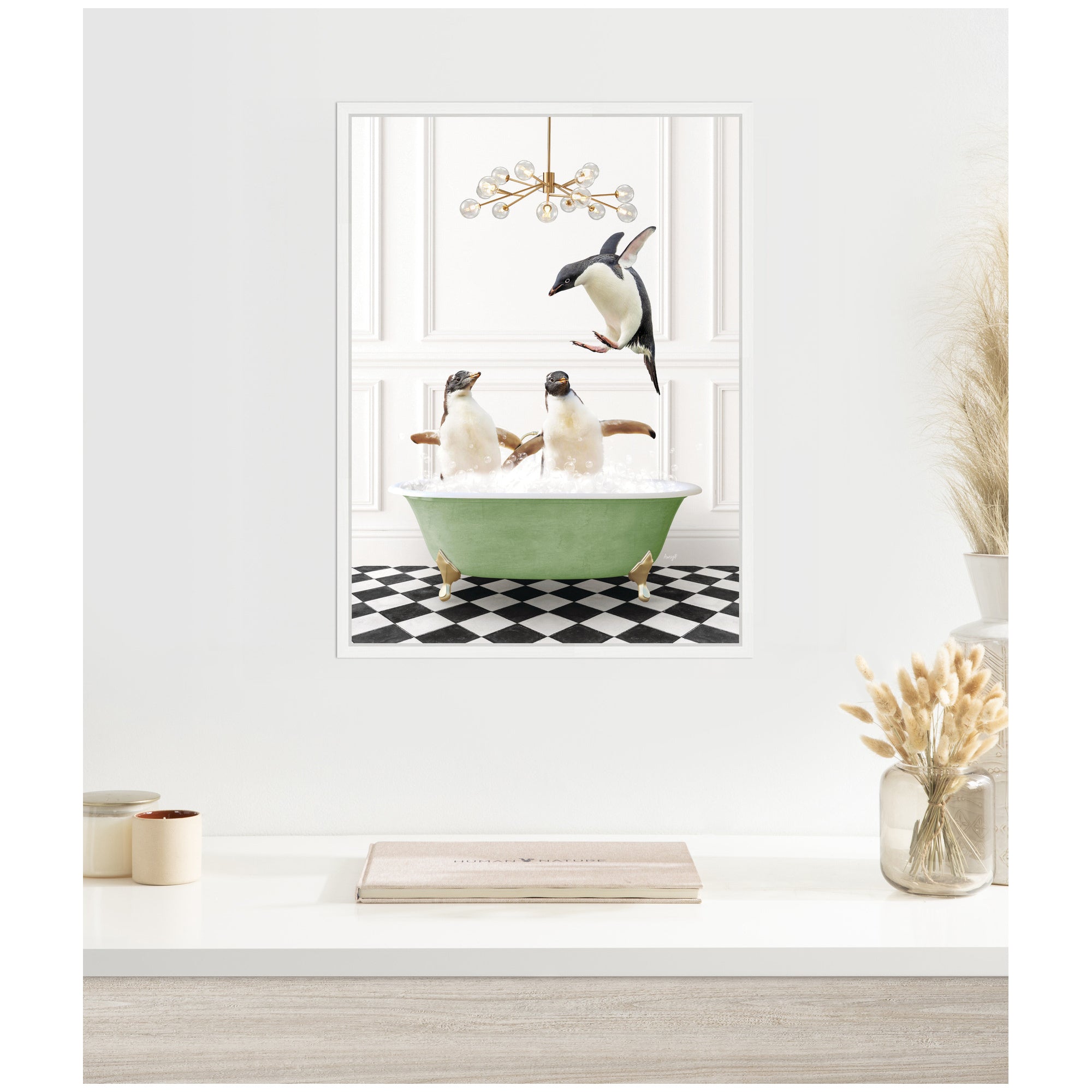 Sylvie Penguins in Green Bathtub Checker Floor Framed Canvas by Amy Peterson