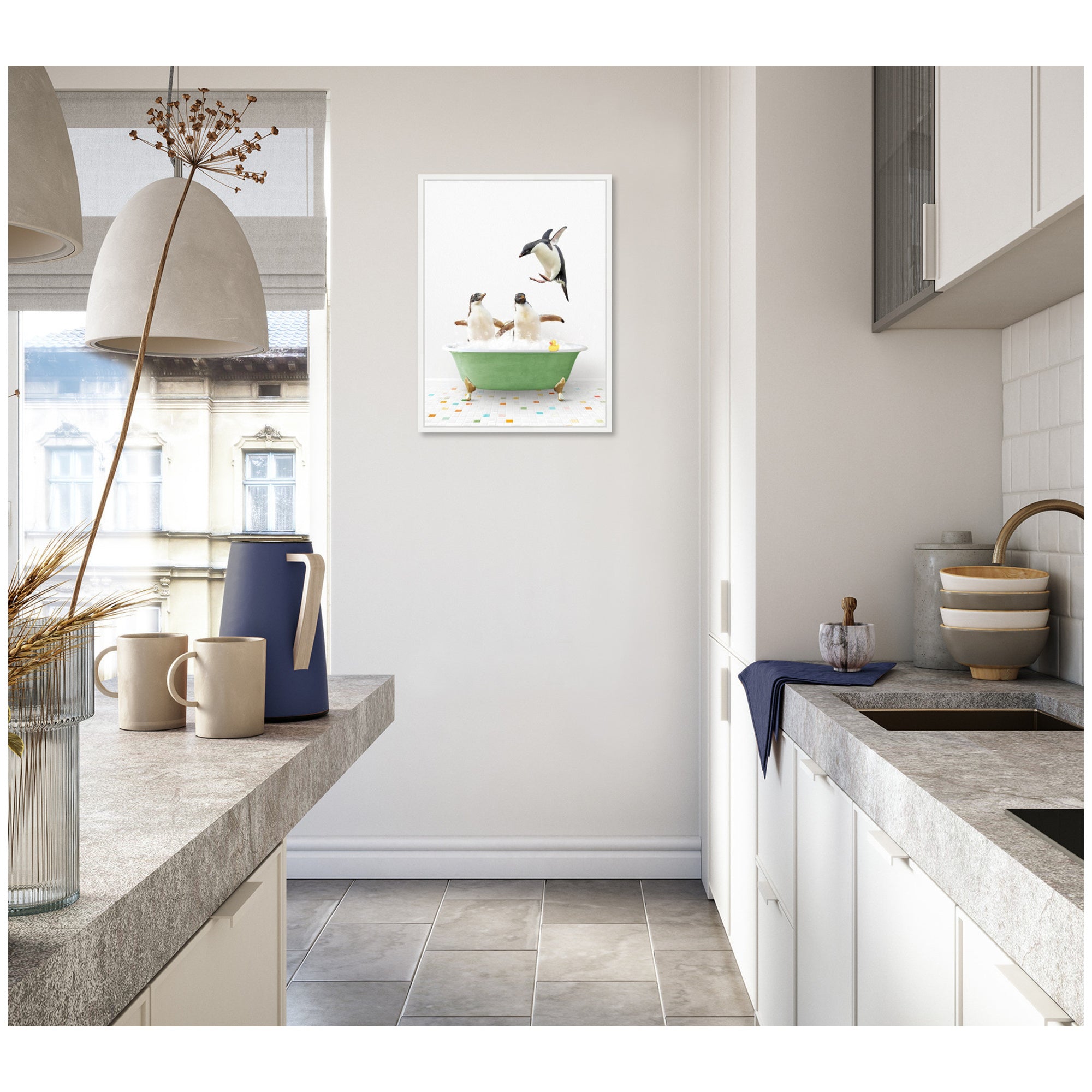 Sylvie Penguins in Green Bathtub on Colored Tile Framed Canvas by Amy Peterson
