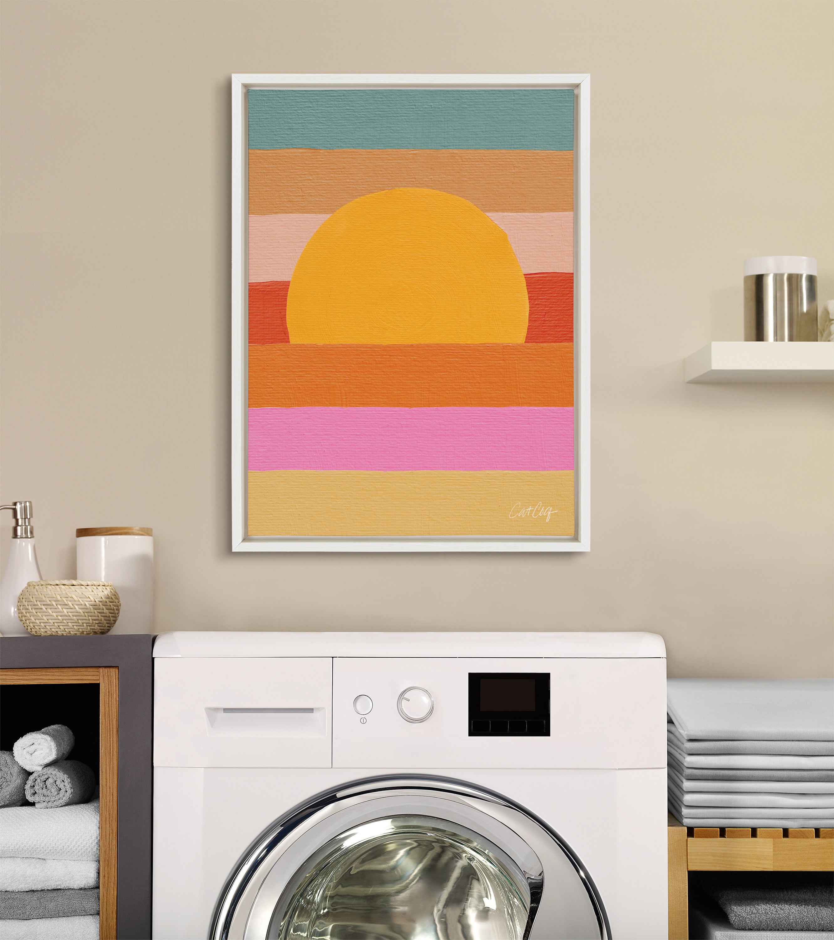 Bring warmth to your space with this boho abstract sun art! Printed and framed in the USA in Waunakee, Wisconsin, this framed floating canvas art will be a pleasure to look at every day in your living room, bedroom, office, or any room in the home. This art print also makes an excellent gift for birthdays, holidays, or house-warming parties. Printed on gallery-wrapped canvas and framed with a lightweight polystyrene frame, this wall art has two hangers already attached to the MDF back for easy wall display.
